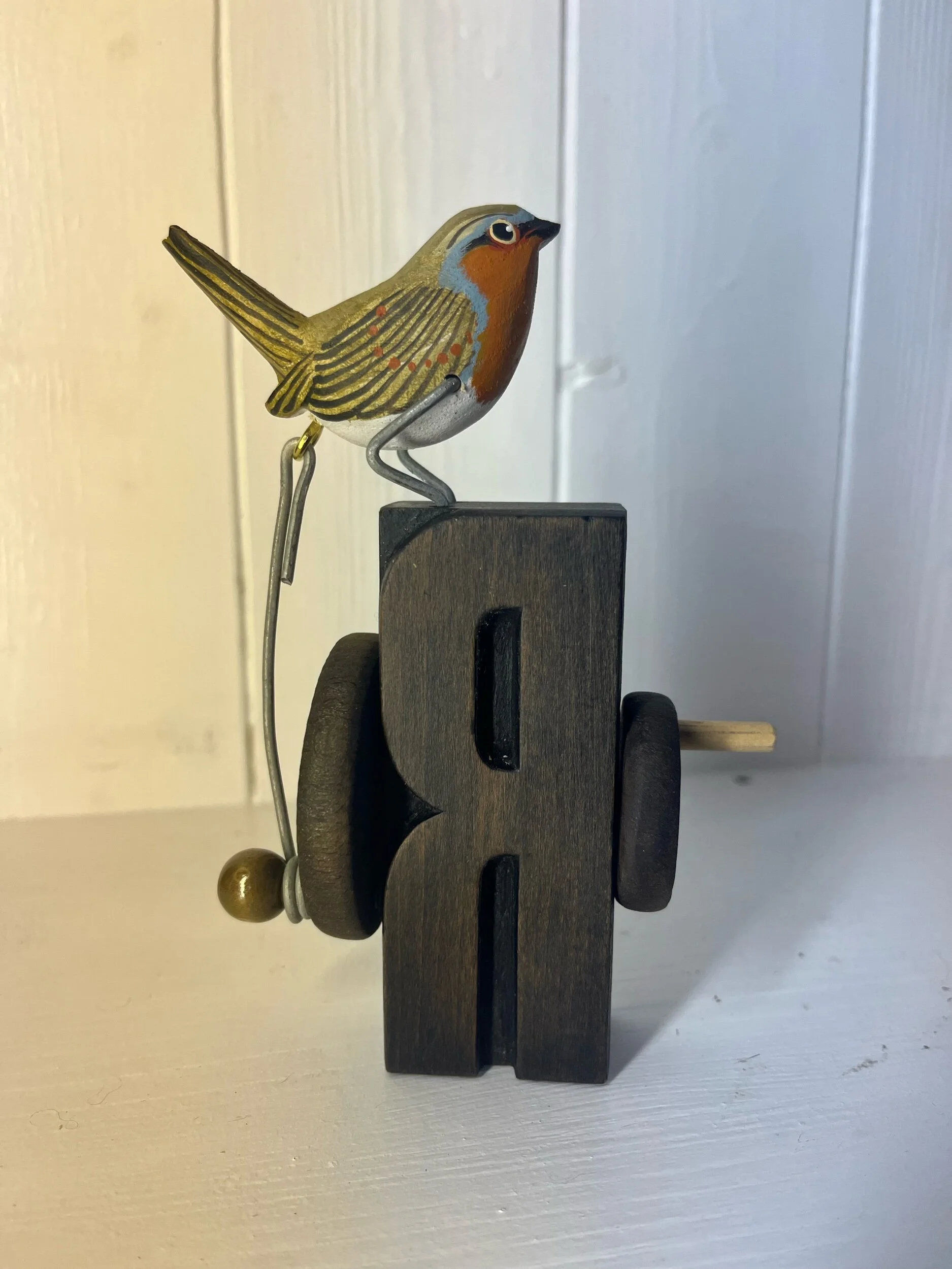 When the handle is turned, the tiny painted Robin makes a pecking movement on the base which is a vintage letterpress letter R. 13cm tall and made with love in West Cornwall.