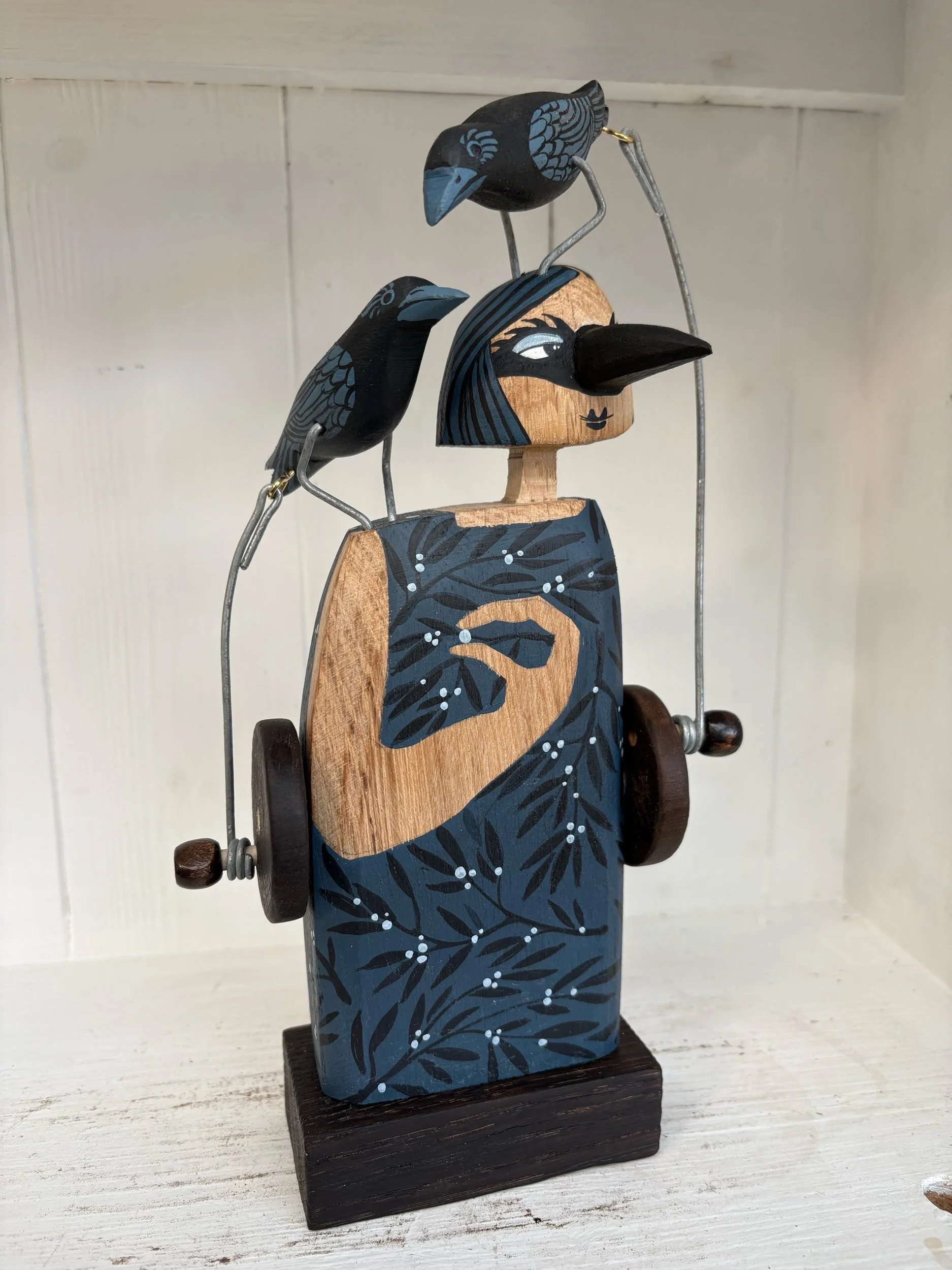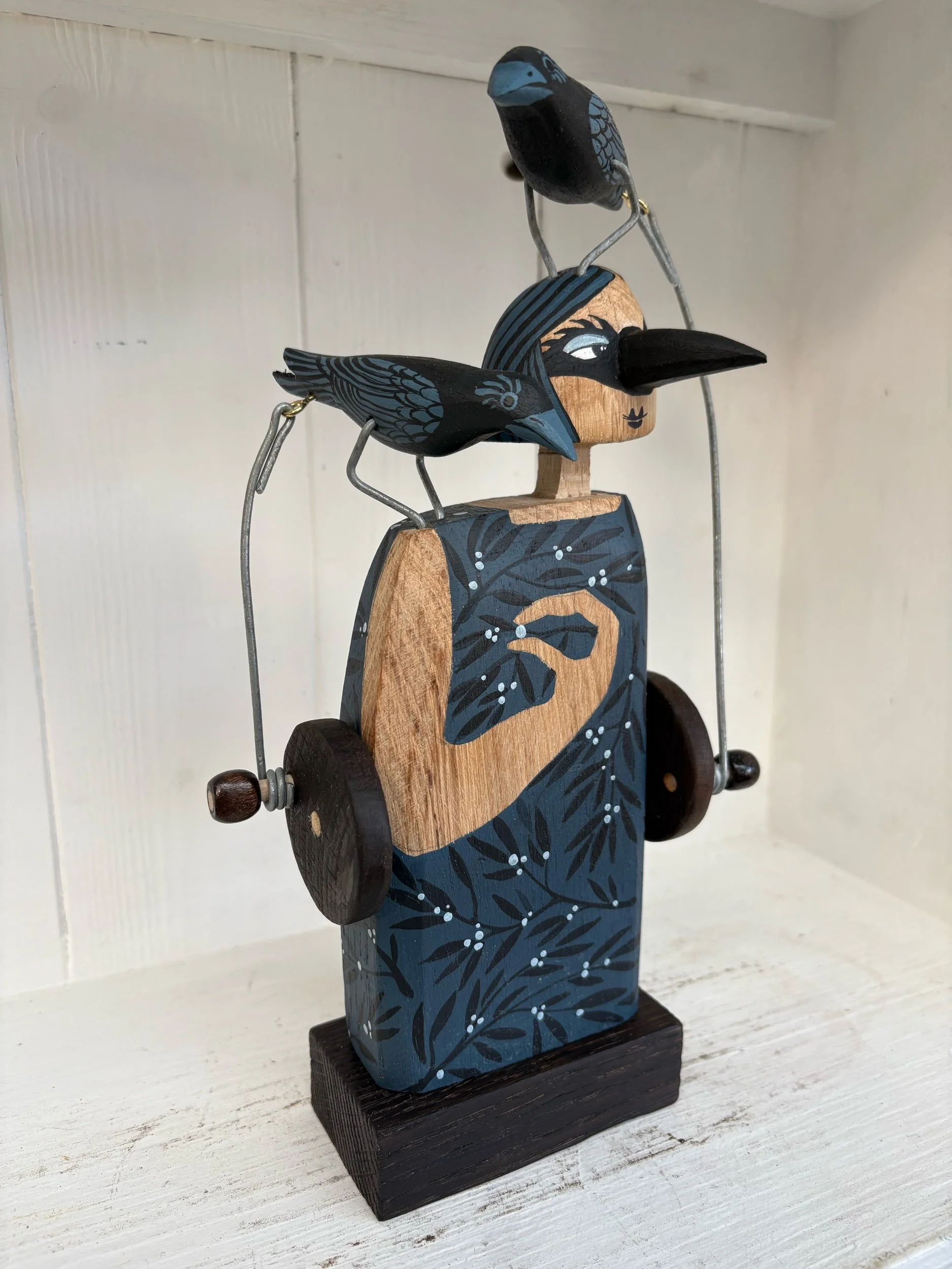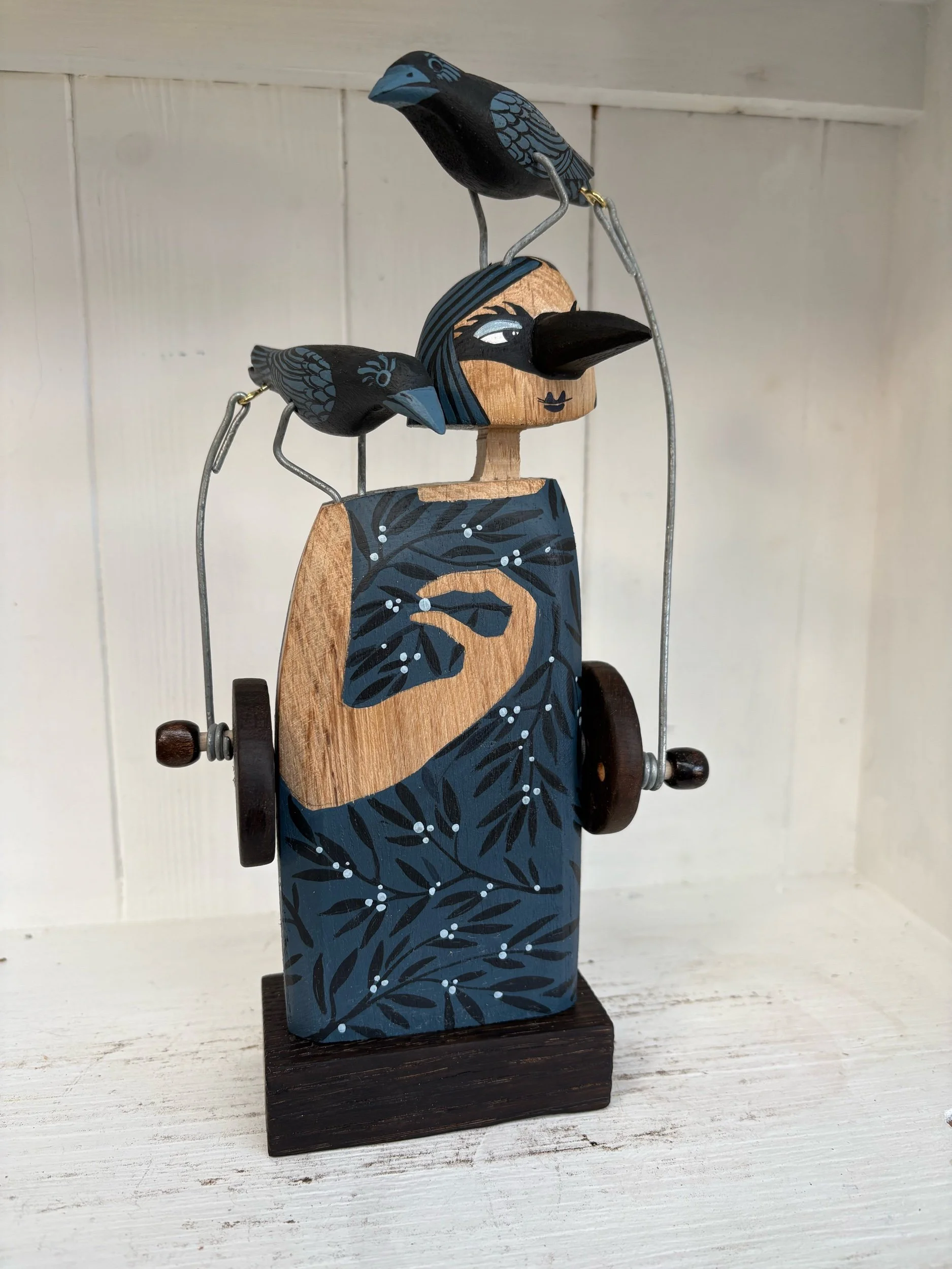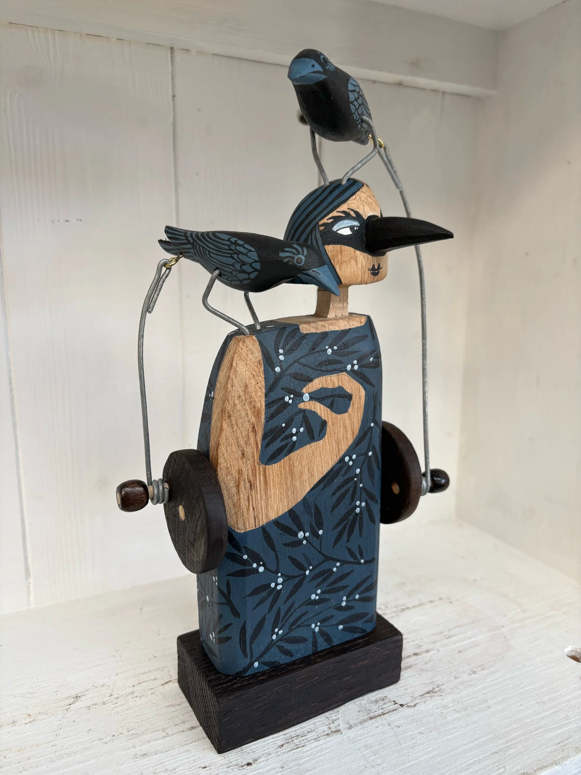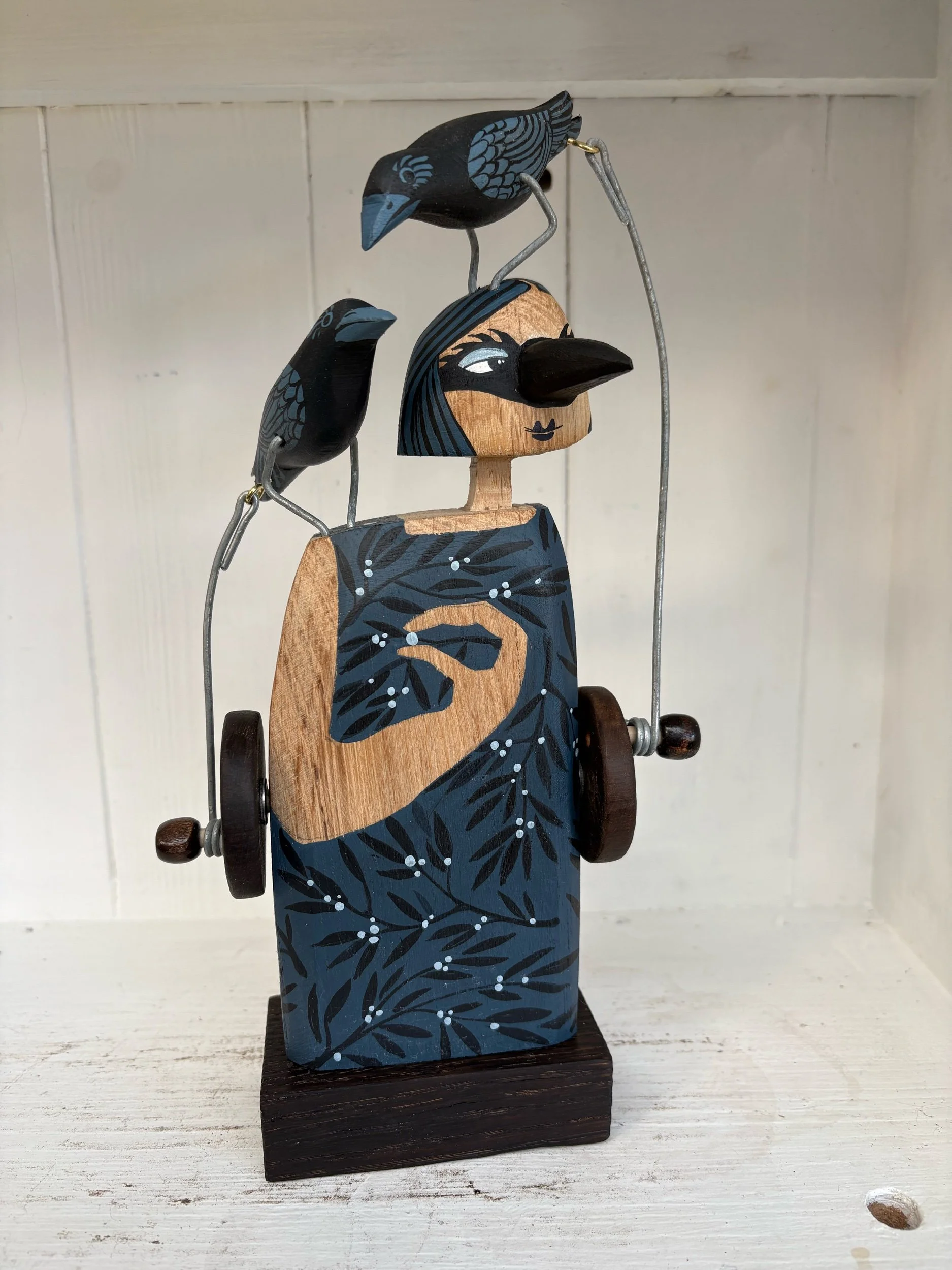 When the handle is turned the crows on the figures head and shoulder make a pecking movement. Hand made in Oak by Jane snd Ralph in far West Cornwall. 28cm tall