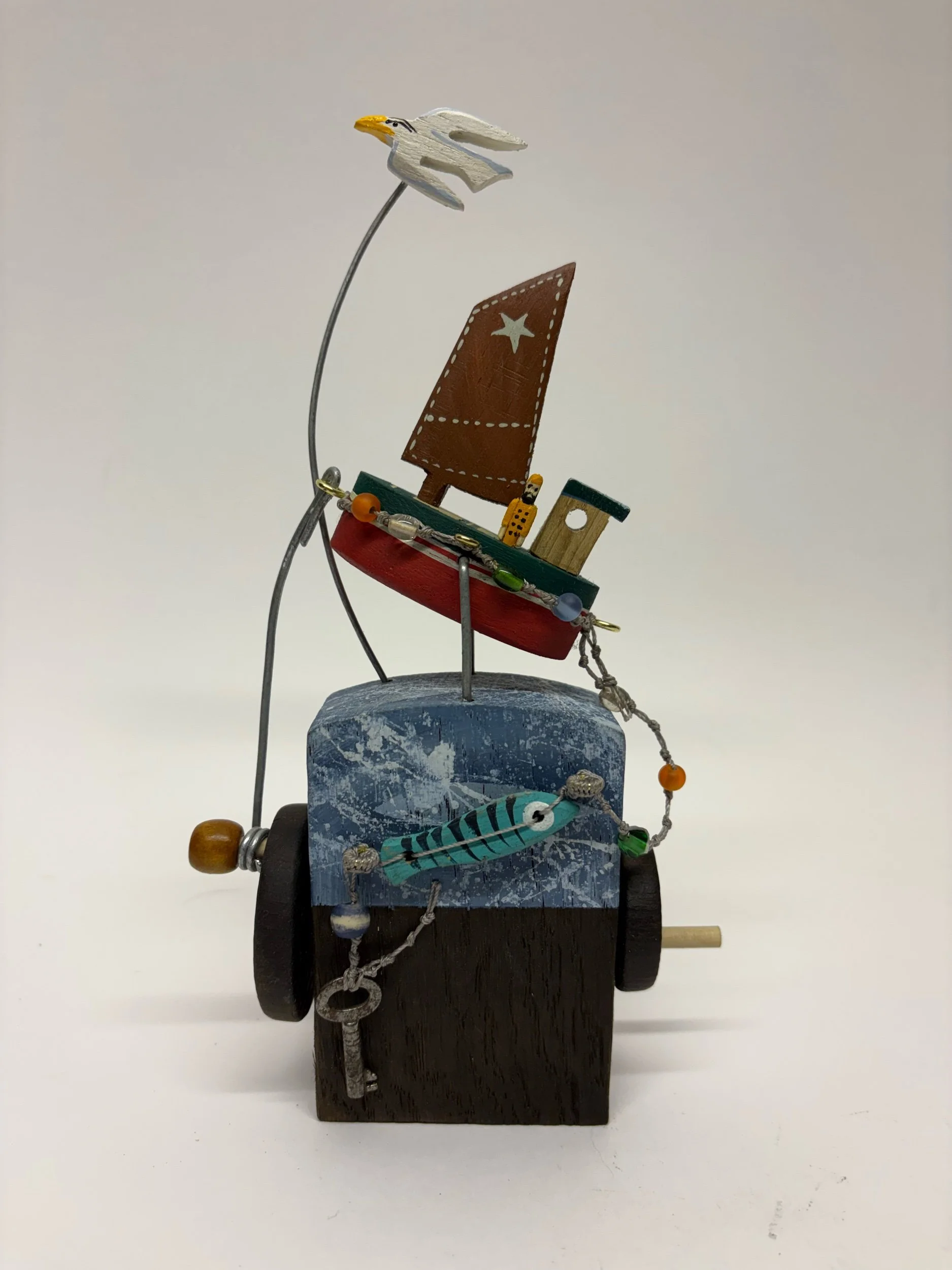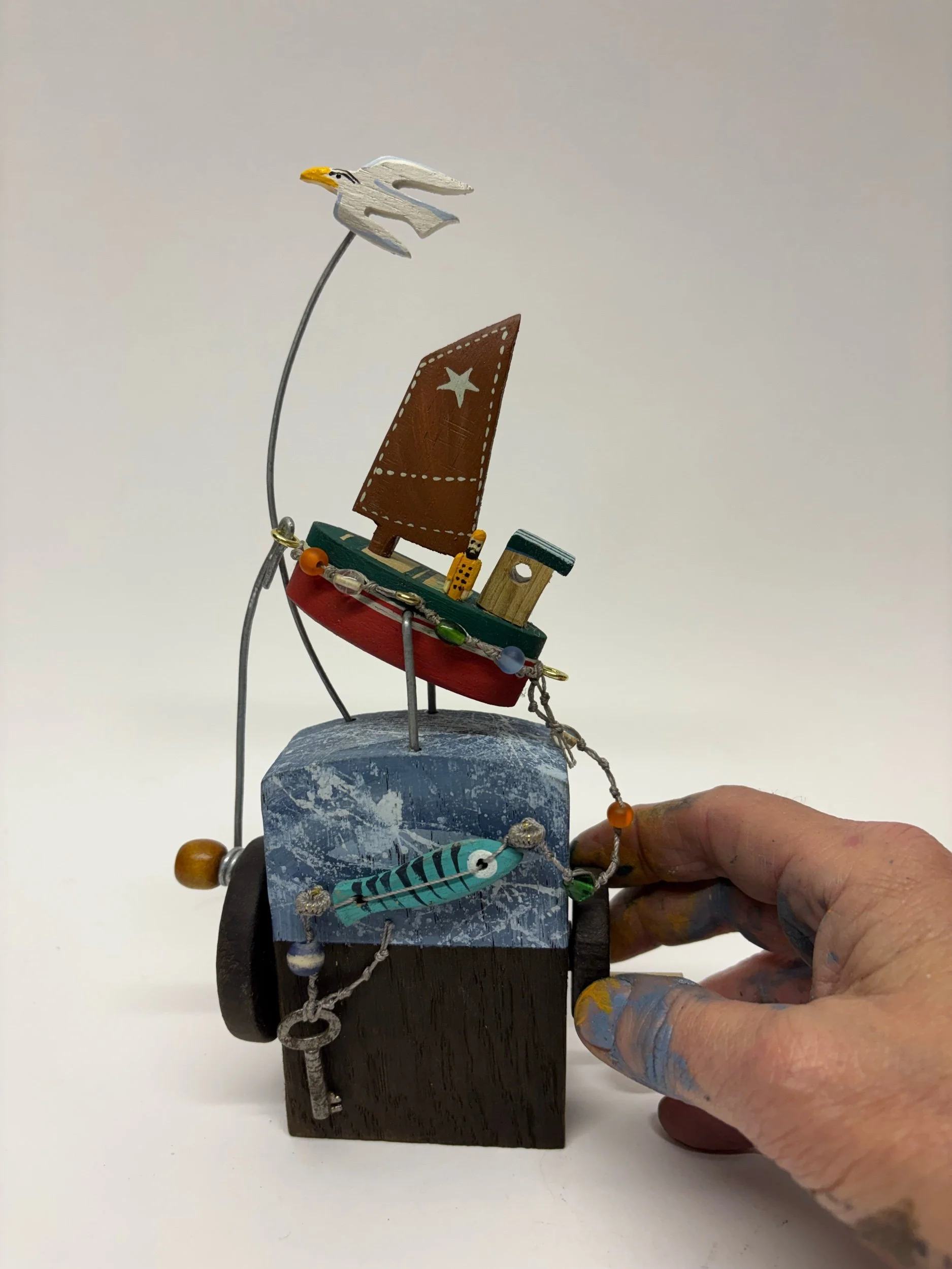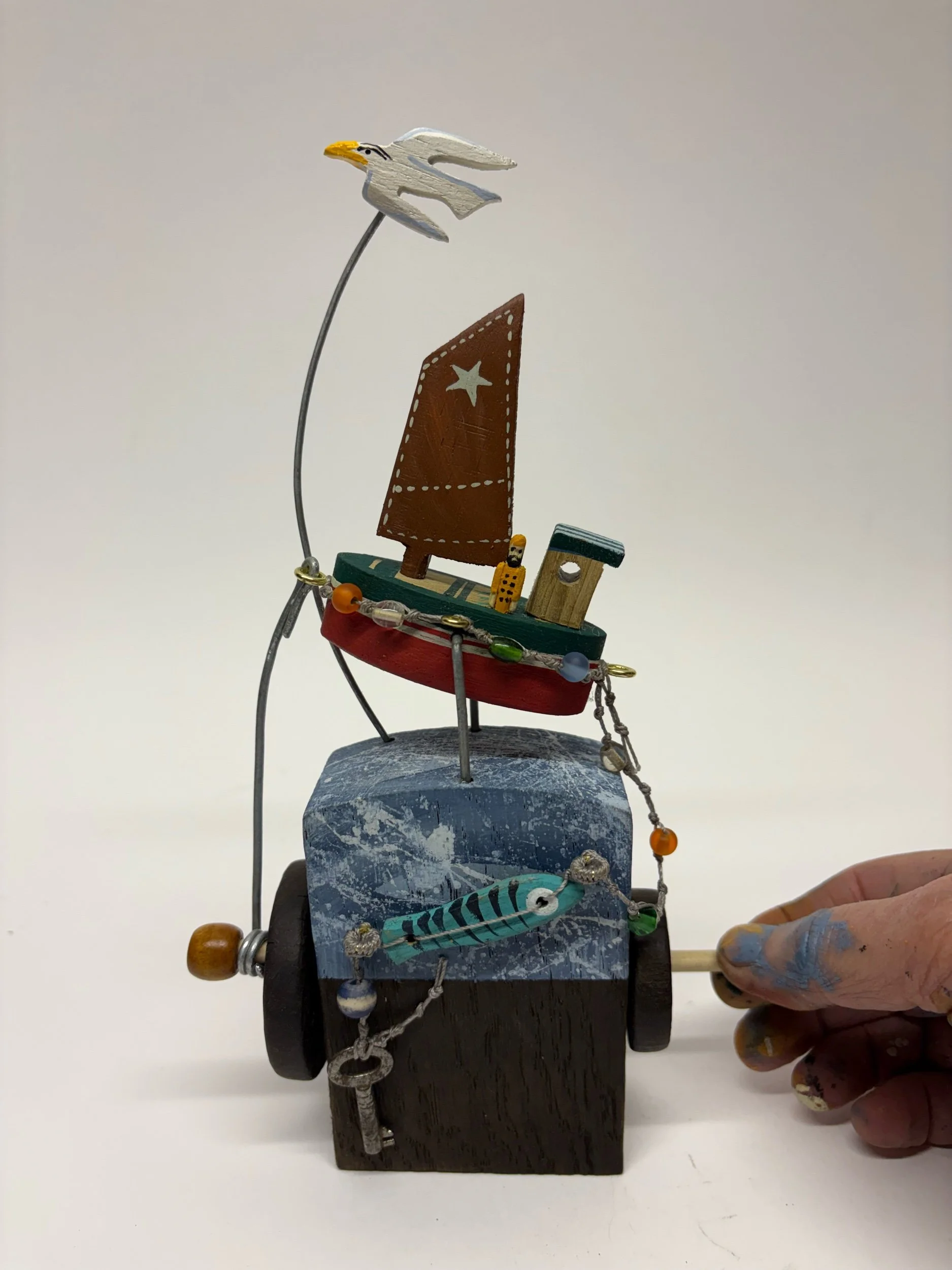 When the handle is turned the tiny painted wooden fishing boat rocks to and fro. Only 18cm tall and made by hand in far west Cornwall by Jane and Ralph.