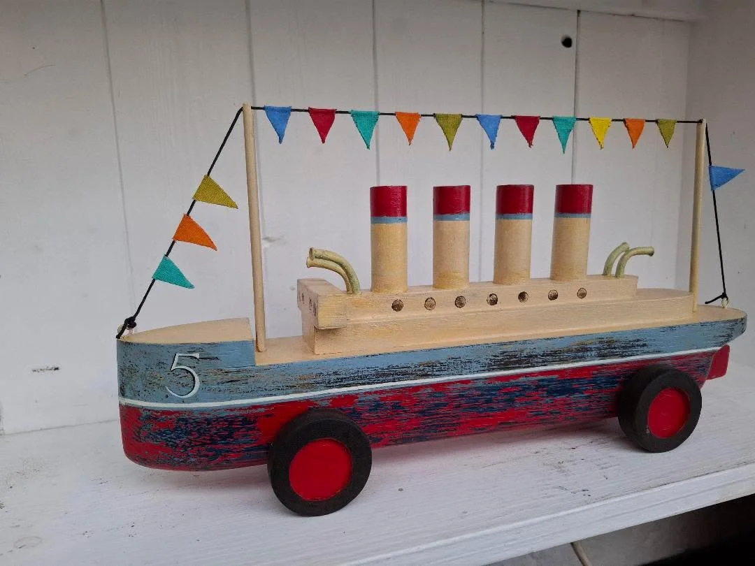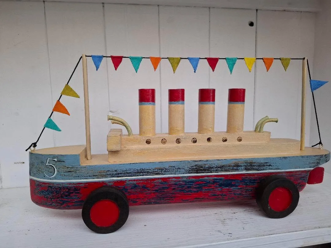 This is one of Ralphs beautiful primitive boats made in oak on wheels! Please note THIS IS NOT A CHILDRENS TOY!!! It is a piece of folk art and not suitable to be given to a child. 38cm long and pleasingly heavy.