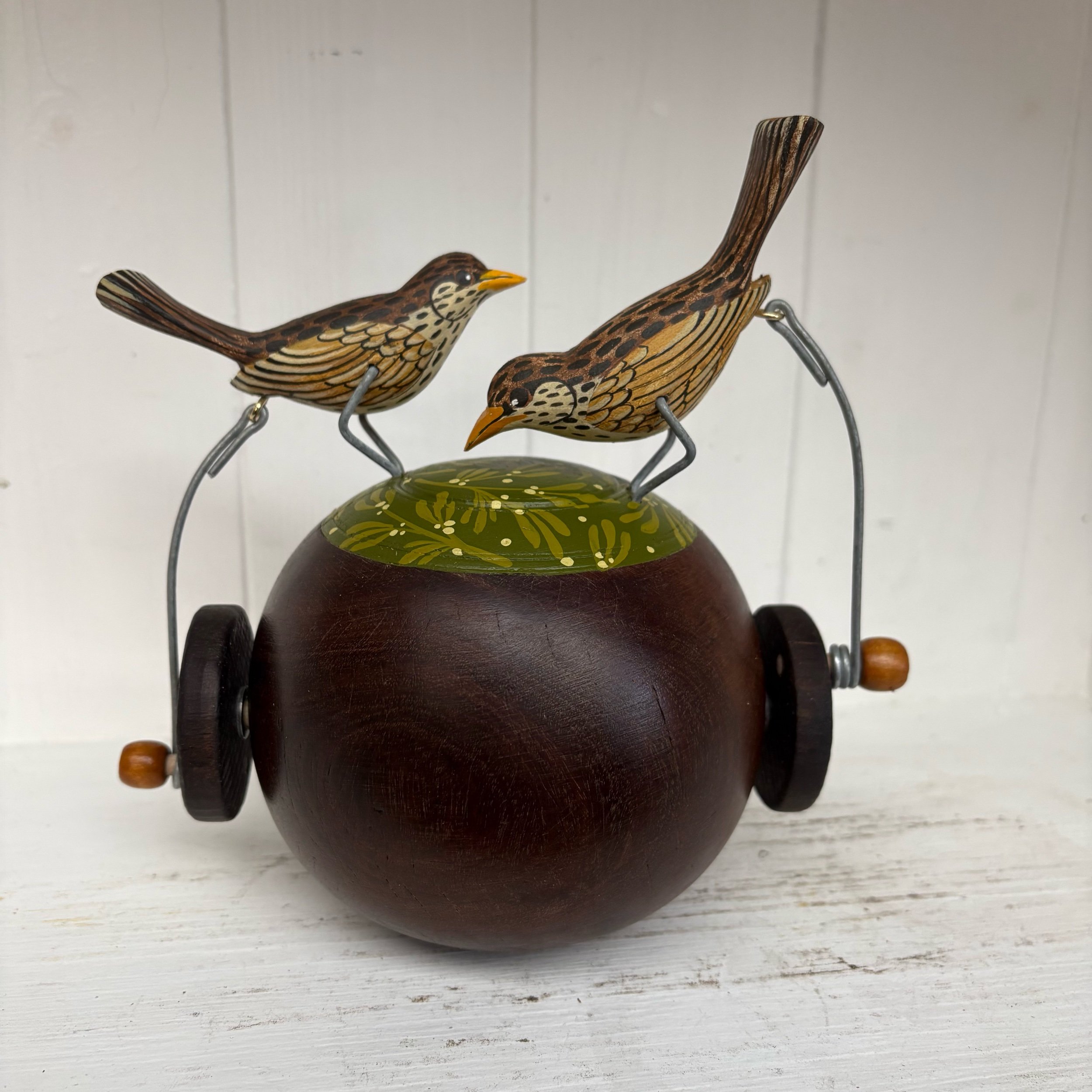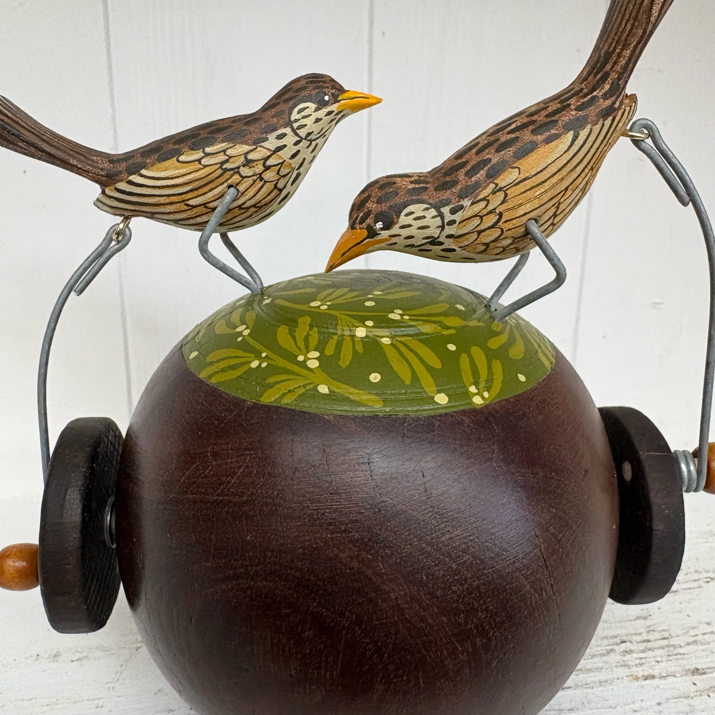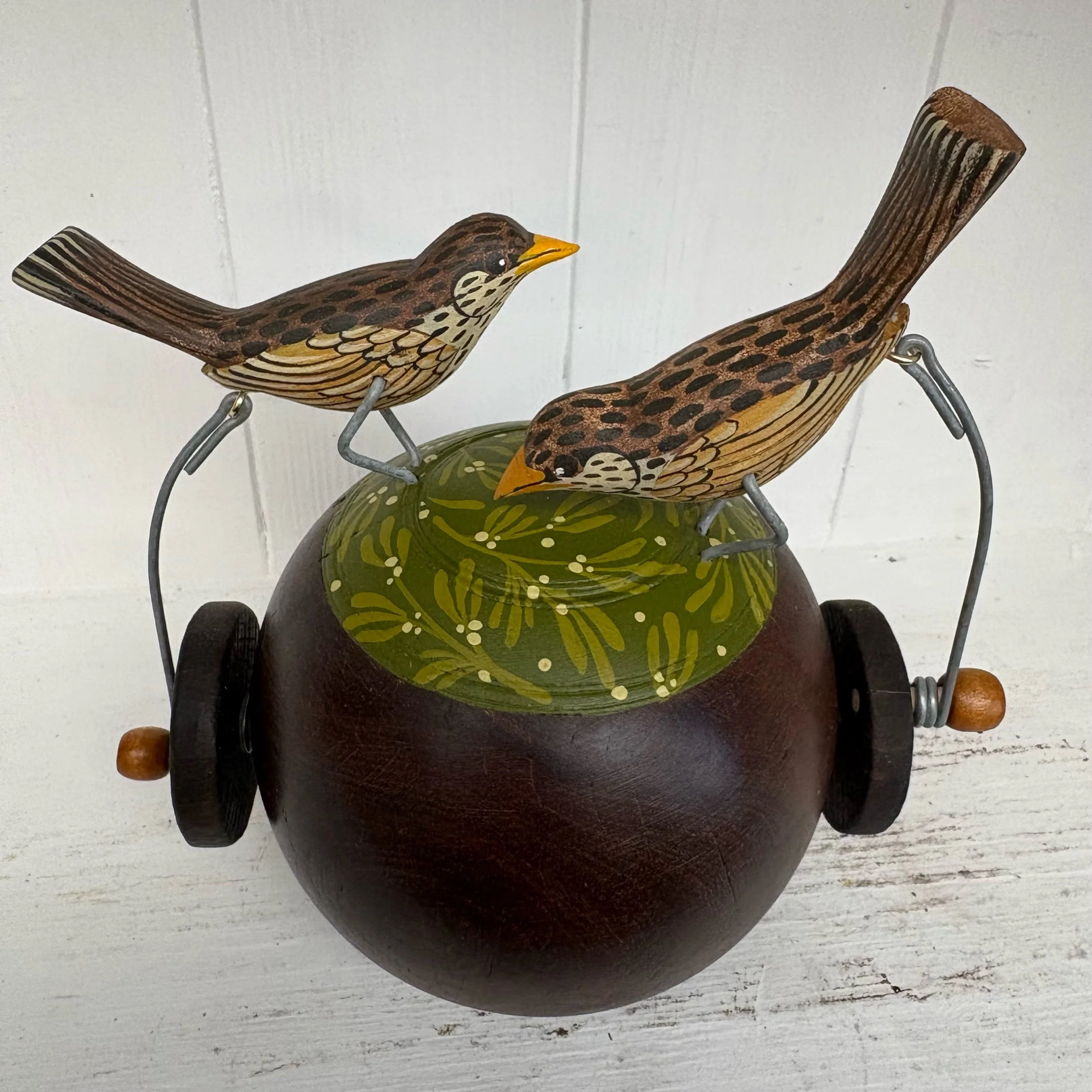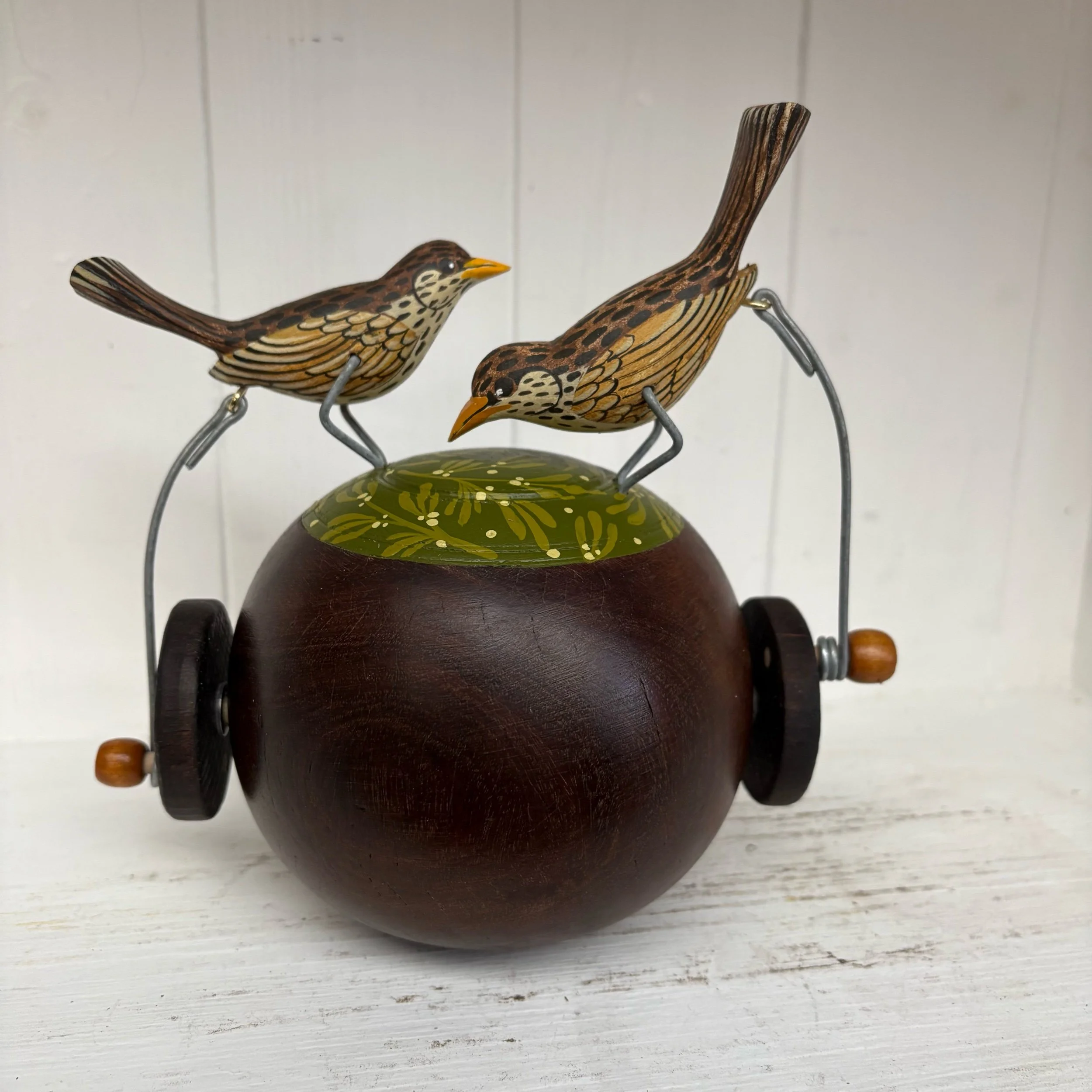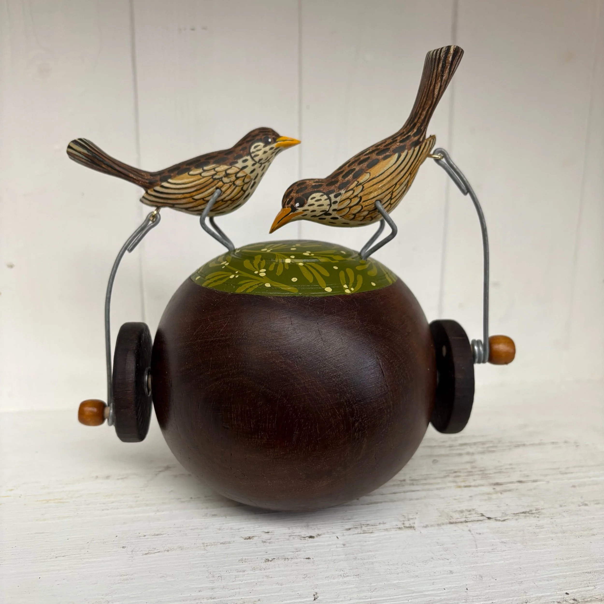 When the handle is turned the pair of painted wooden Thrushes make a pecking movement on the painted and polished vintage Lignum Bowling Ball. 16cm x 16cm and heavy