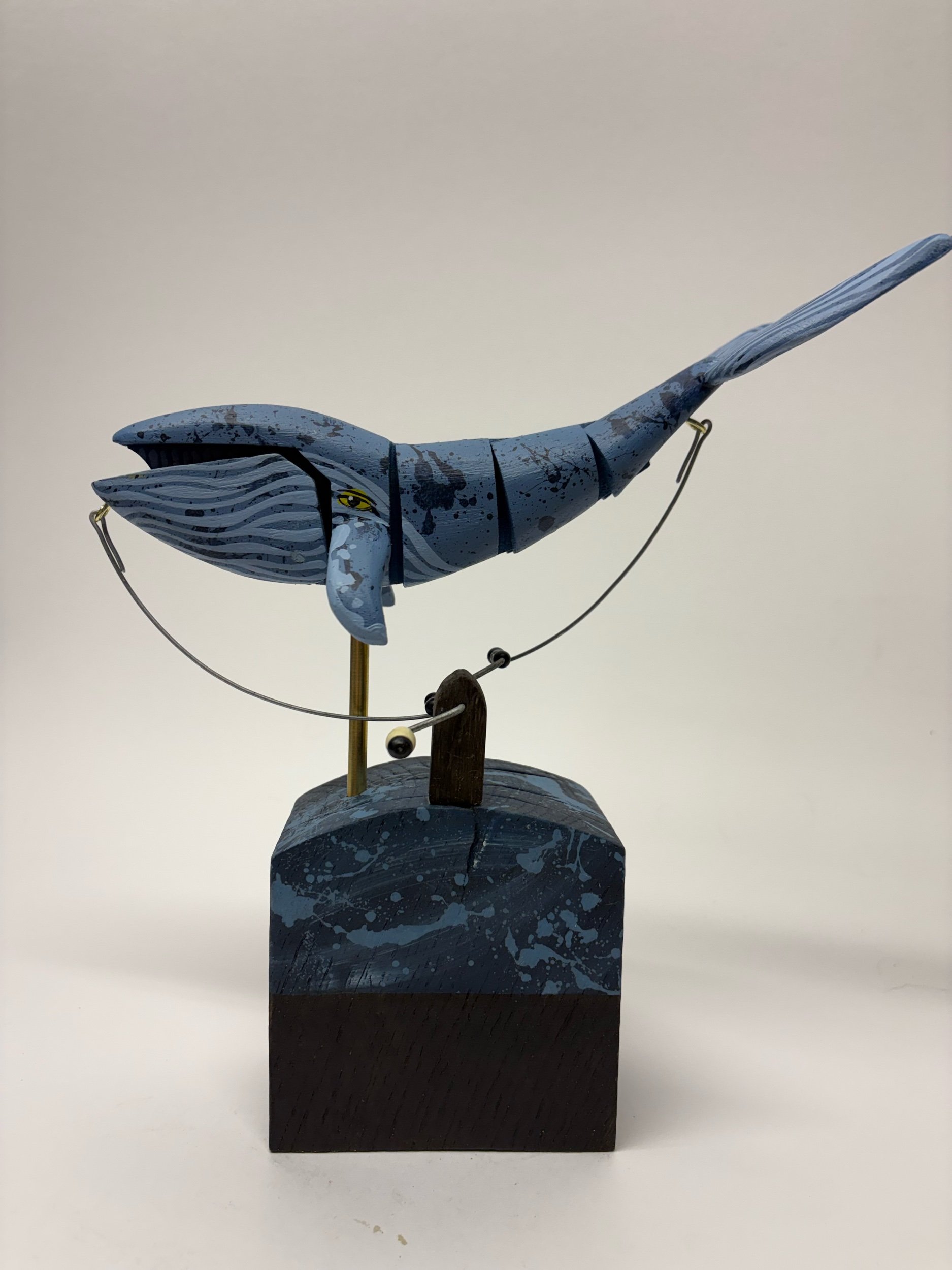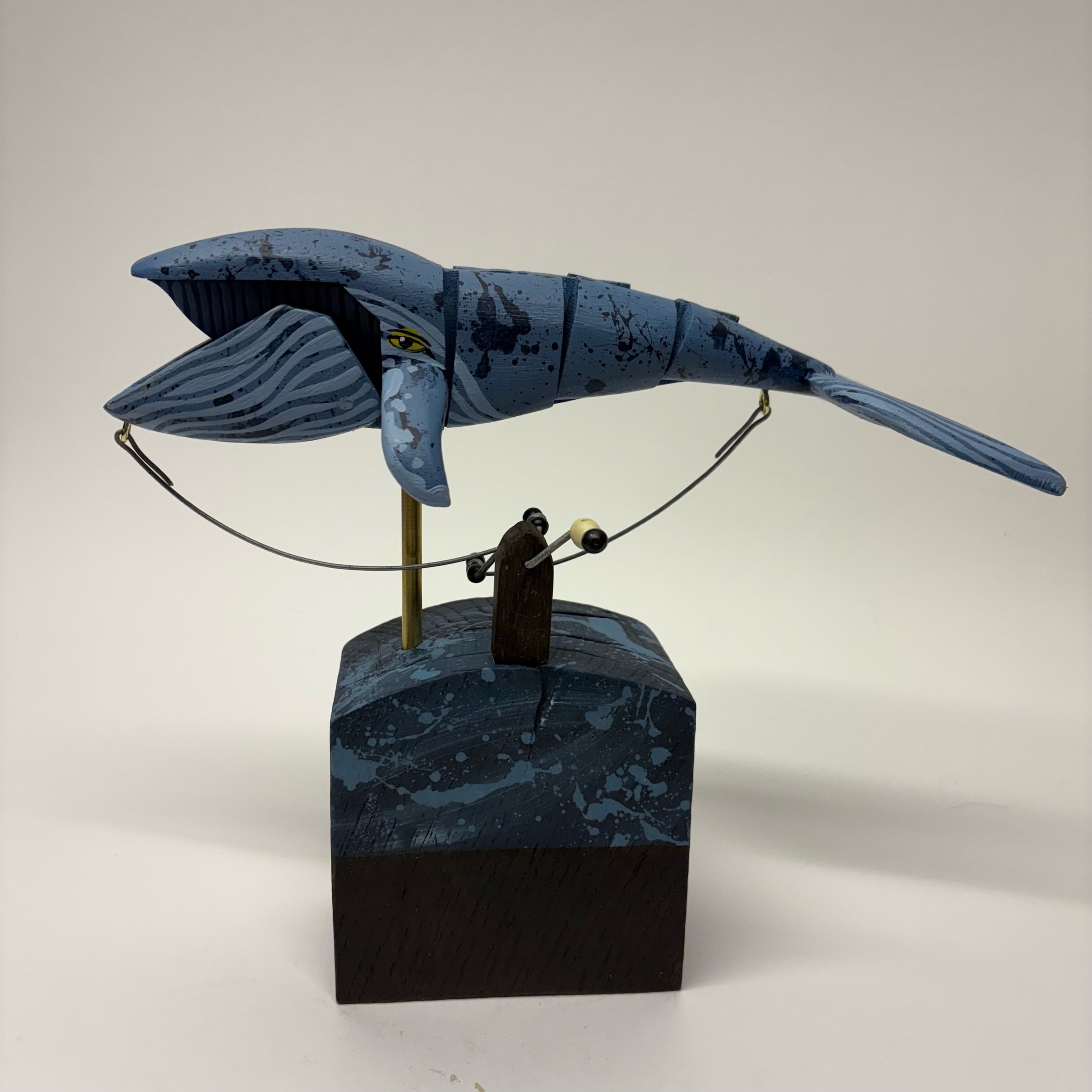 When the handle is turned the jointed wooden whsle makes a swimming movement flipping its tail and opening its mouth. Hand made in oak by Jane and Ralph in far West Cornwall. 24cm tall x 25cm
