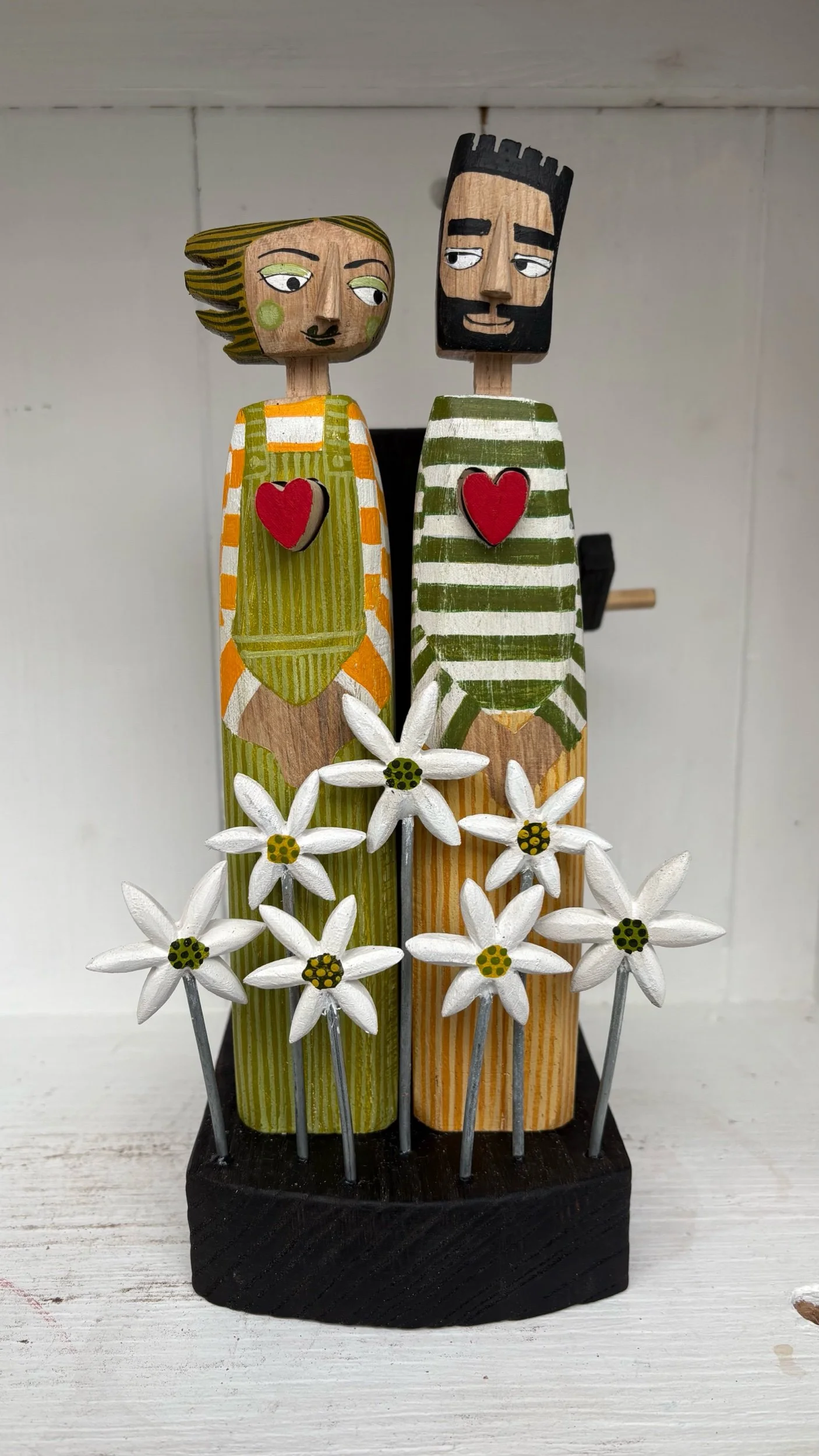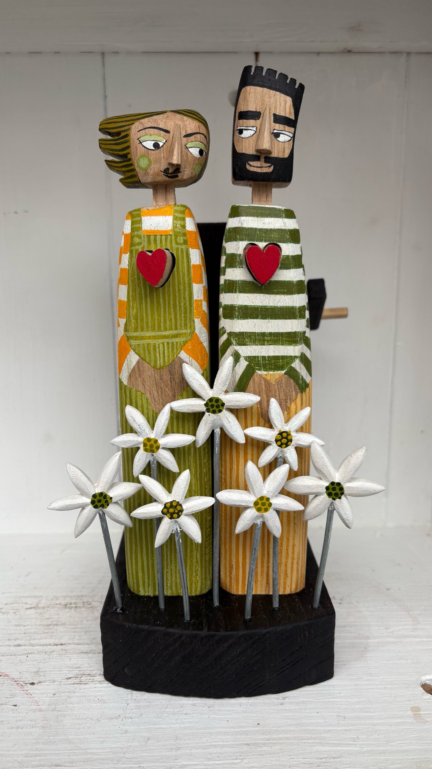 When the handle is turned the hearts in the carved snd painted figures beat in and out. Hand made by Jane and Ralph in oak in far West Cornwall. 26cm tall