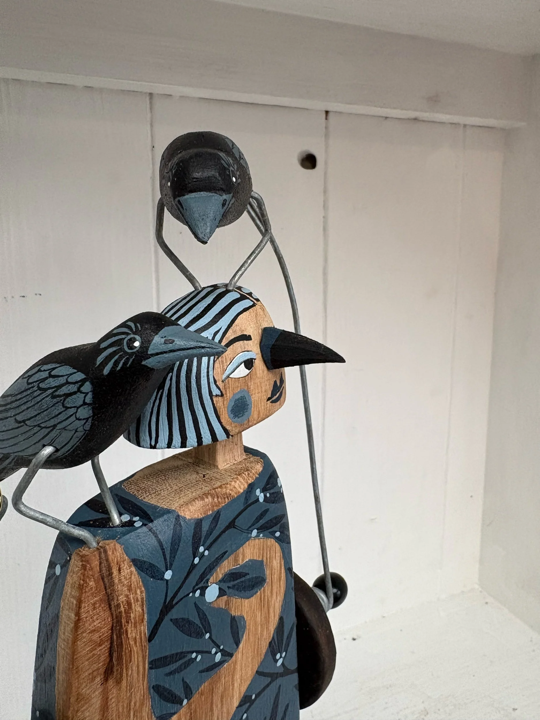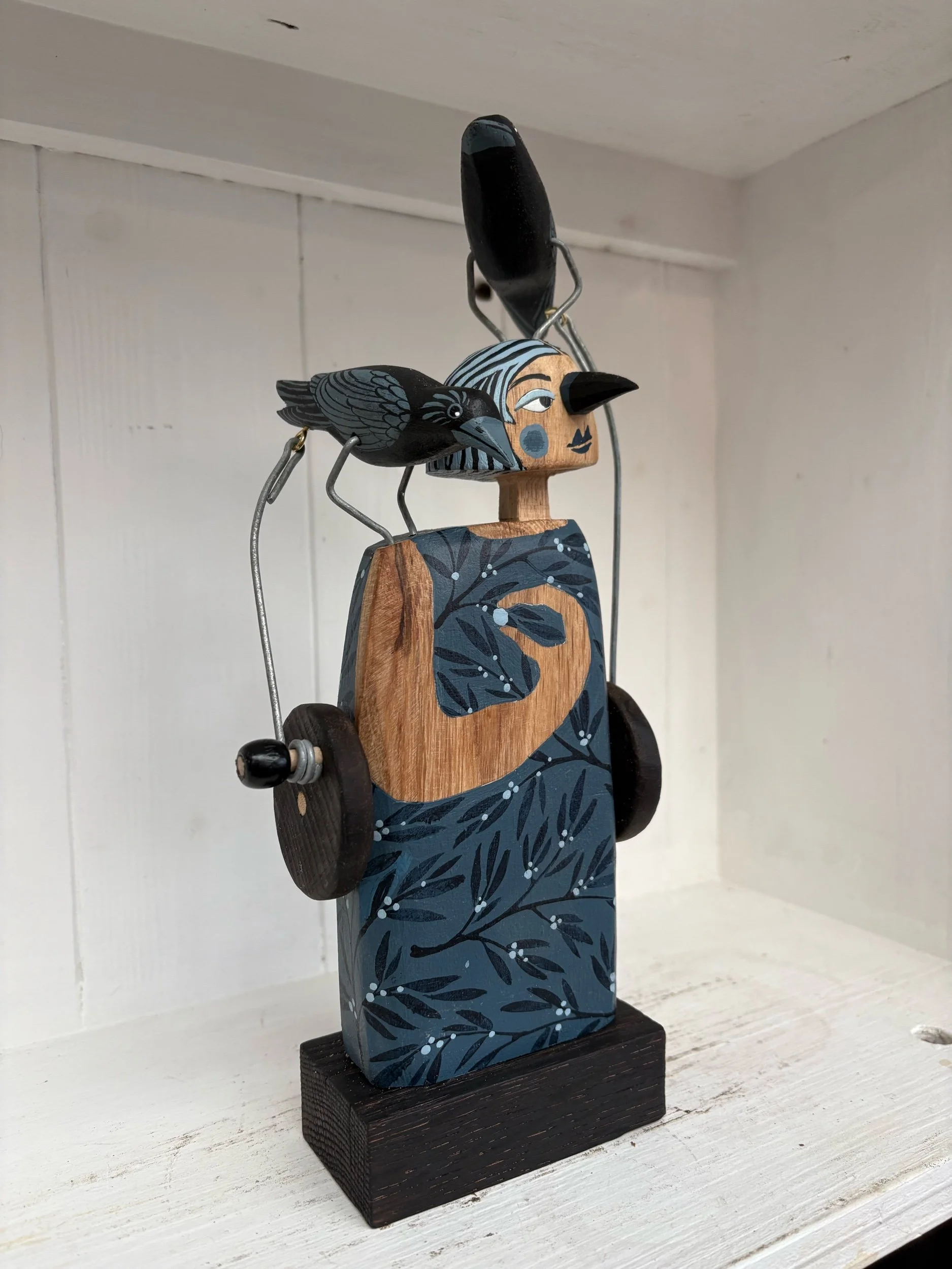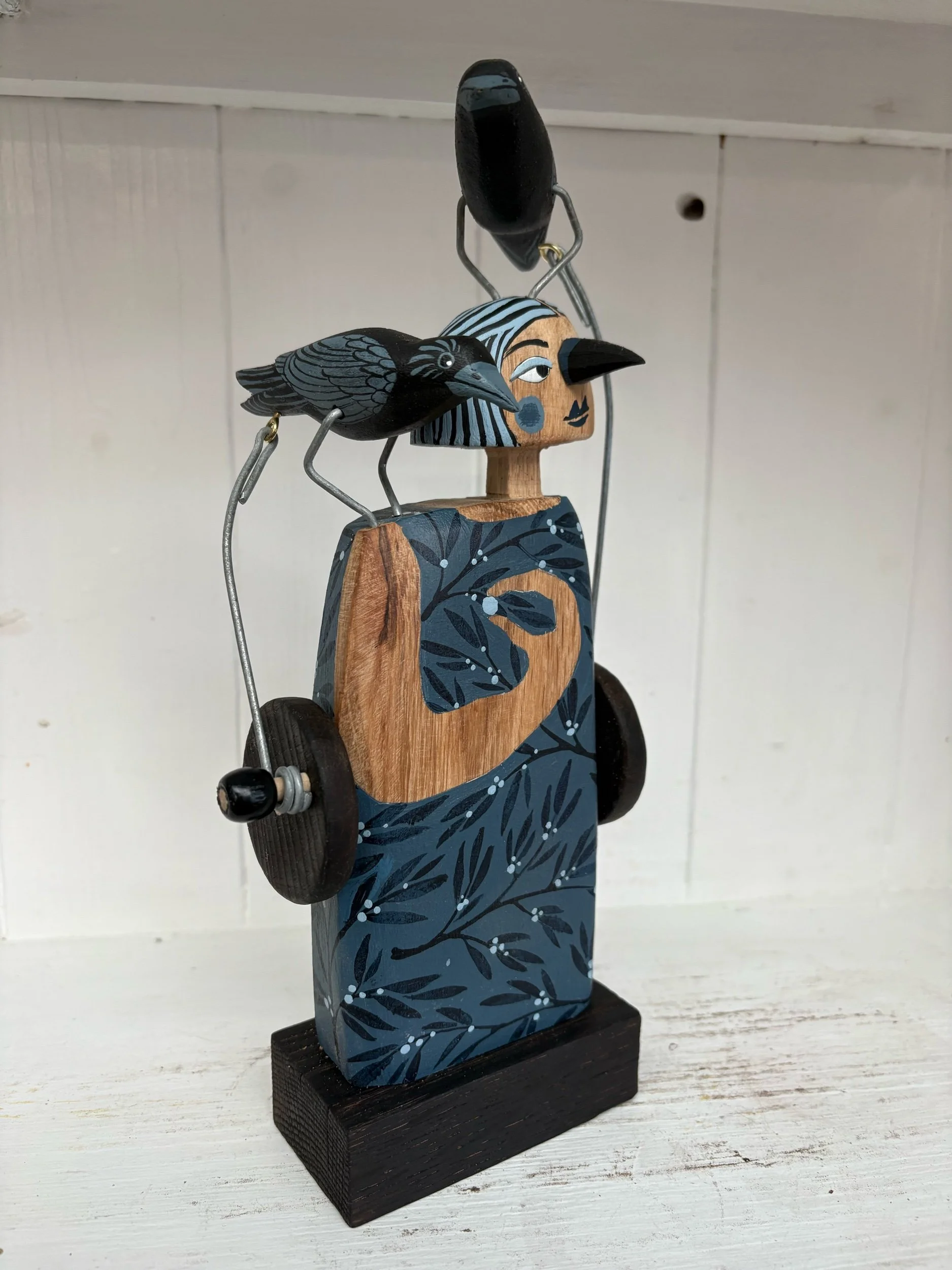 When the handle is turned the crows on the shoulder and head of the figure nake pecking movements. Hand made by Jane and Ralph from Oak in far west Cornwall. 28cm tall