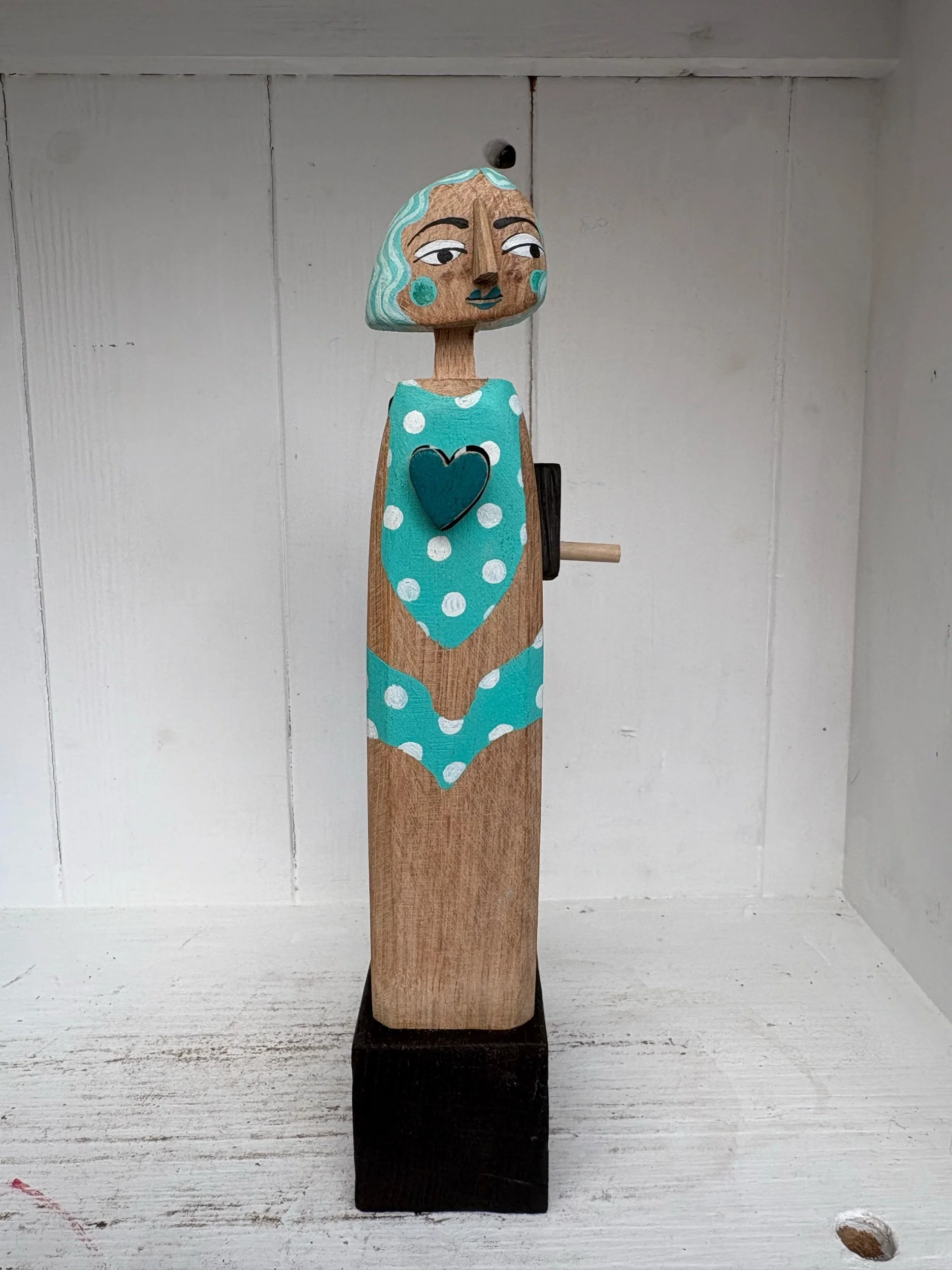 When the handle is turned the heart in the carved and painted figure beats in and out. Hand made in oak by Jane and Ralph in far West Cornwall. 23cm tall