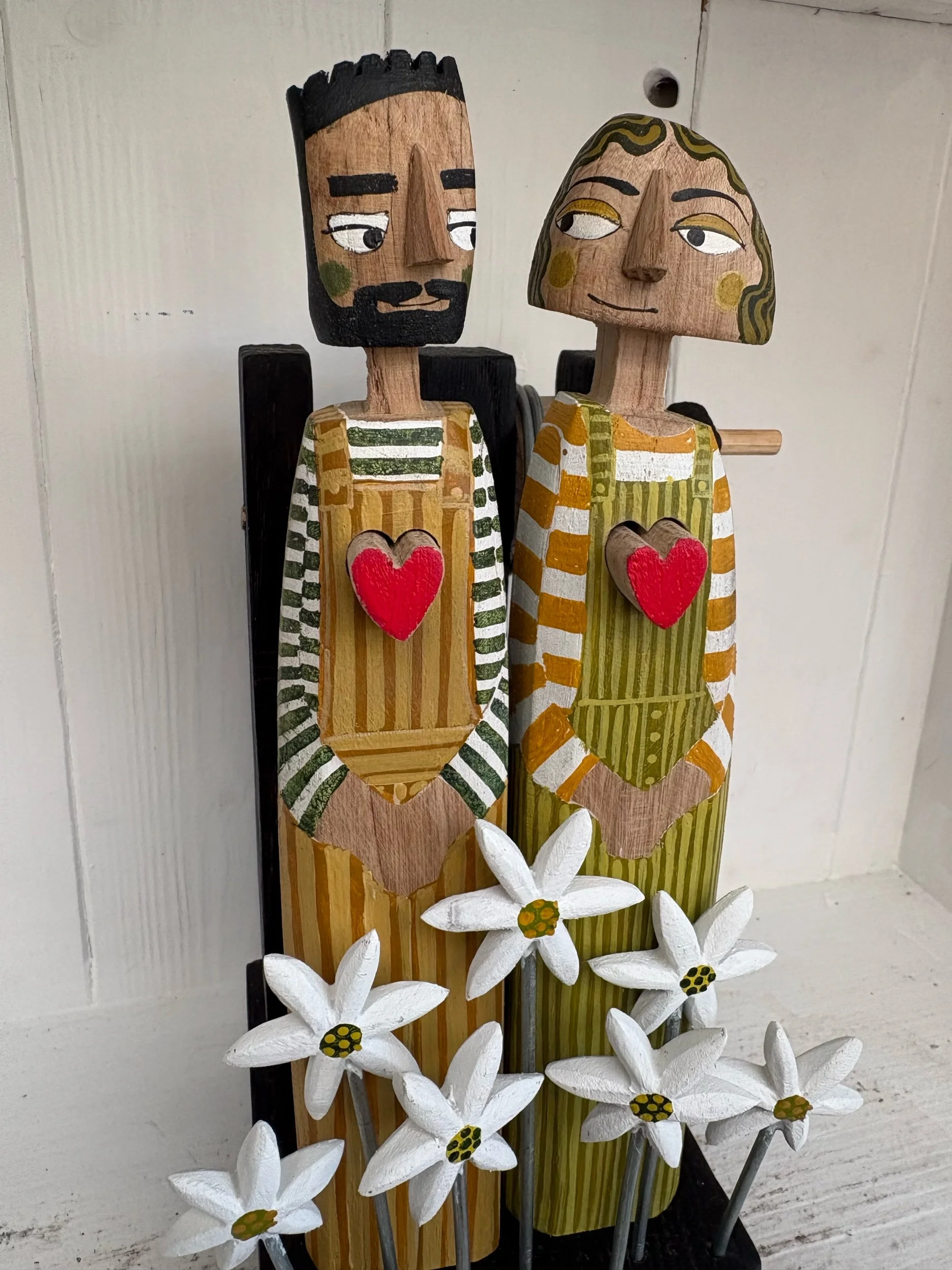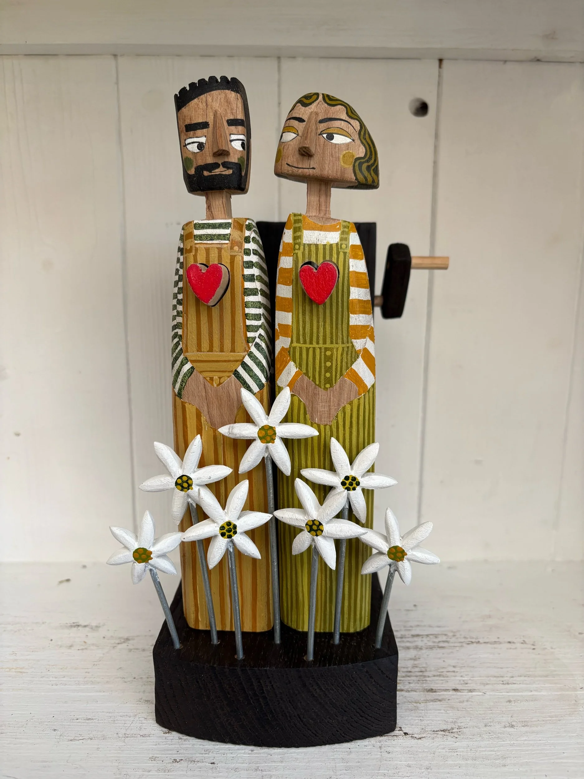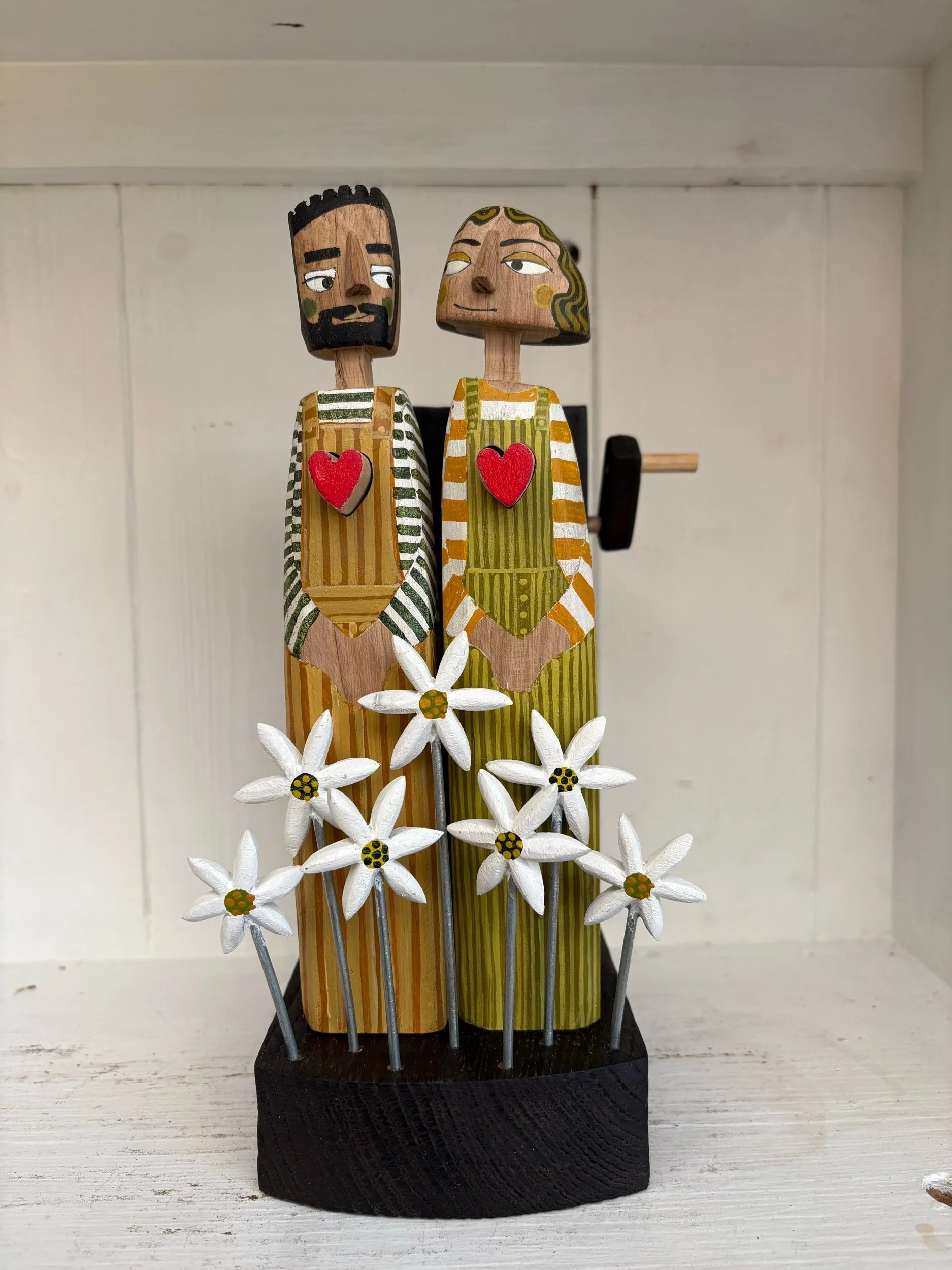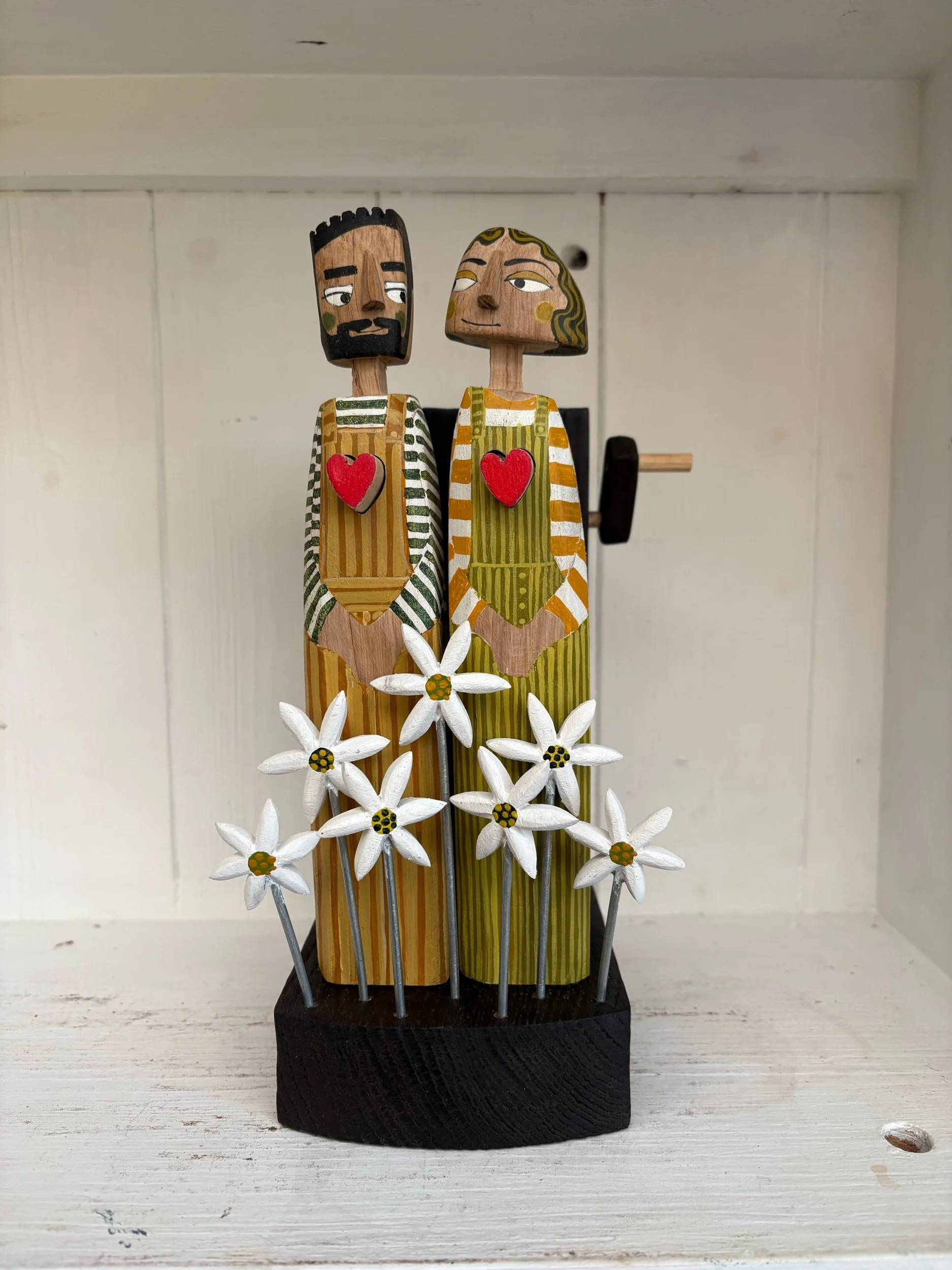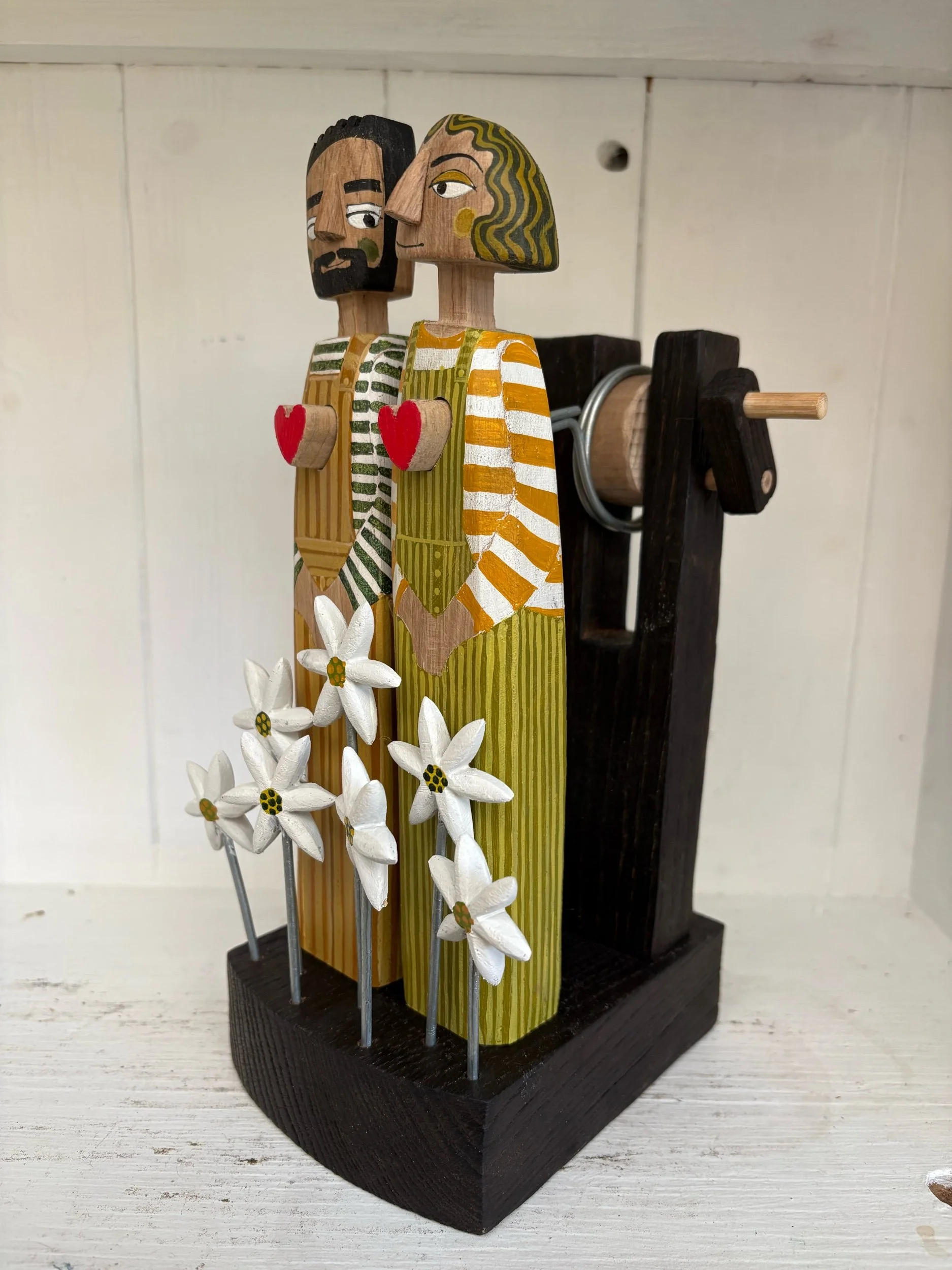 When the hsndle is turned the hearts in the carved and painted figures beat in and out. Hand made in oak by Jane and Ralph in Far West Cornwall. 26cm tall.