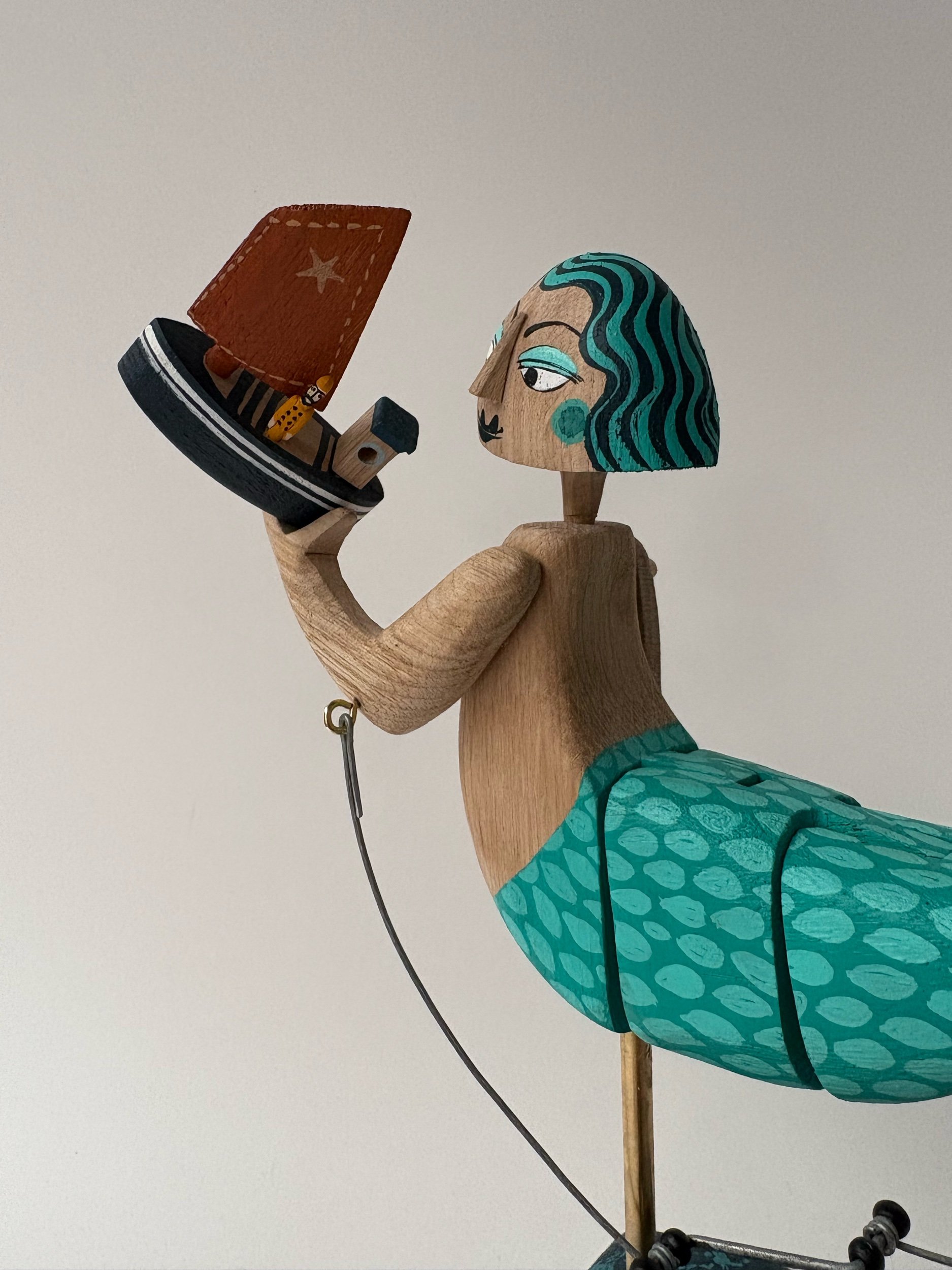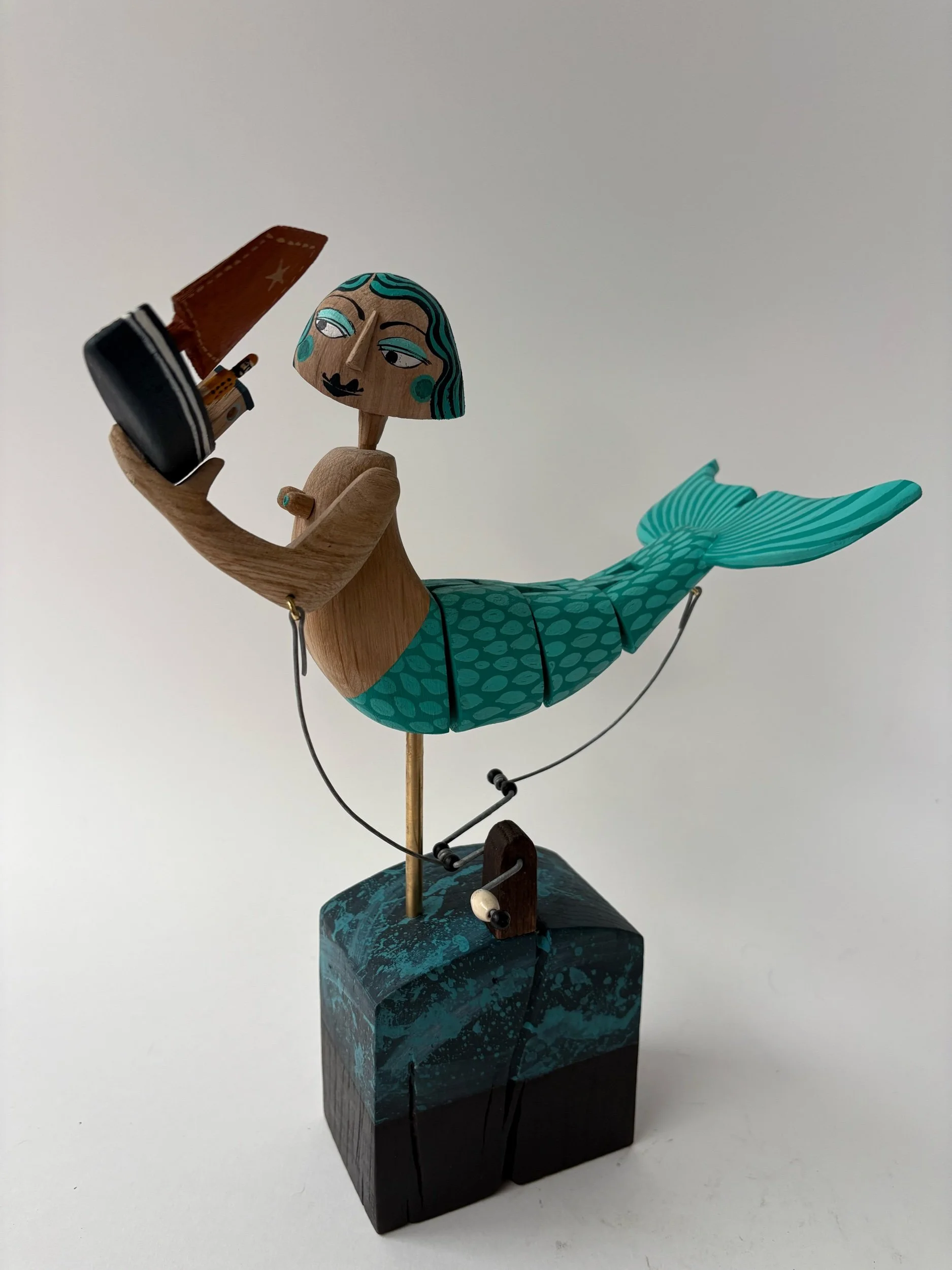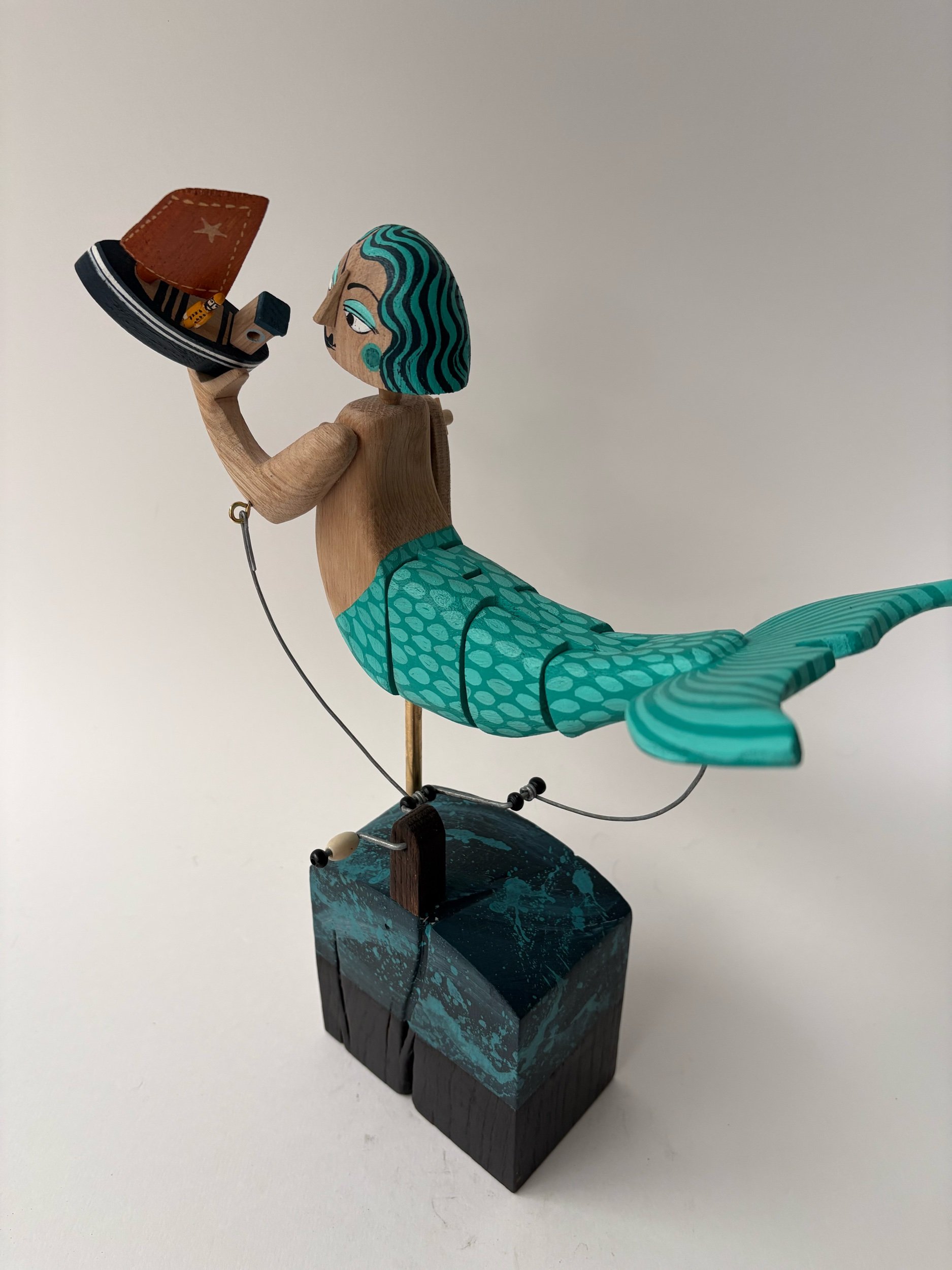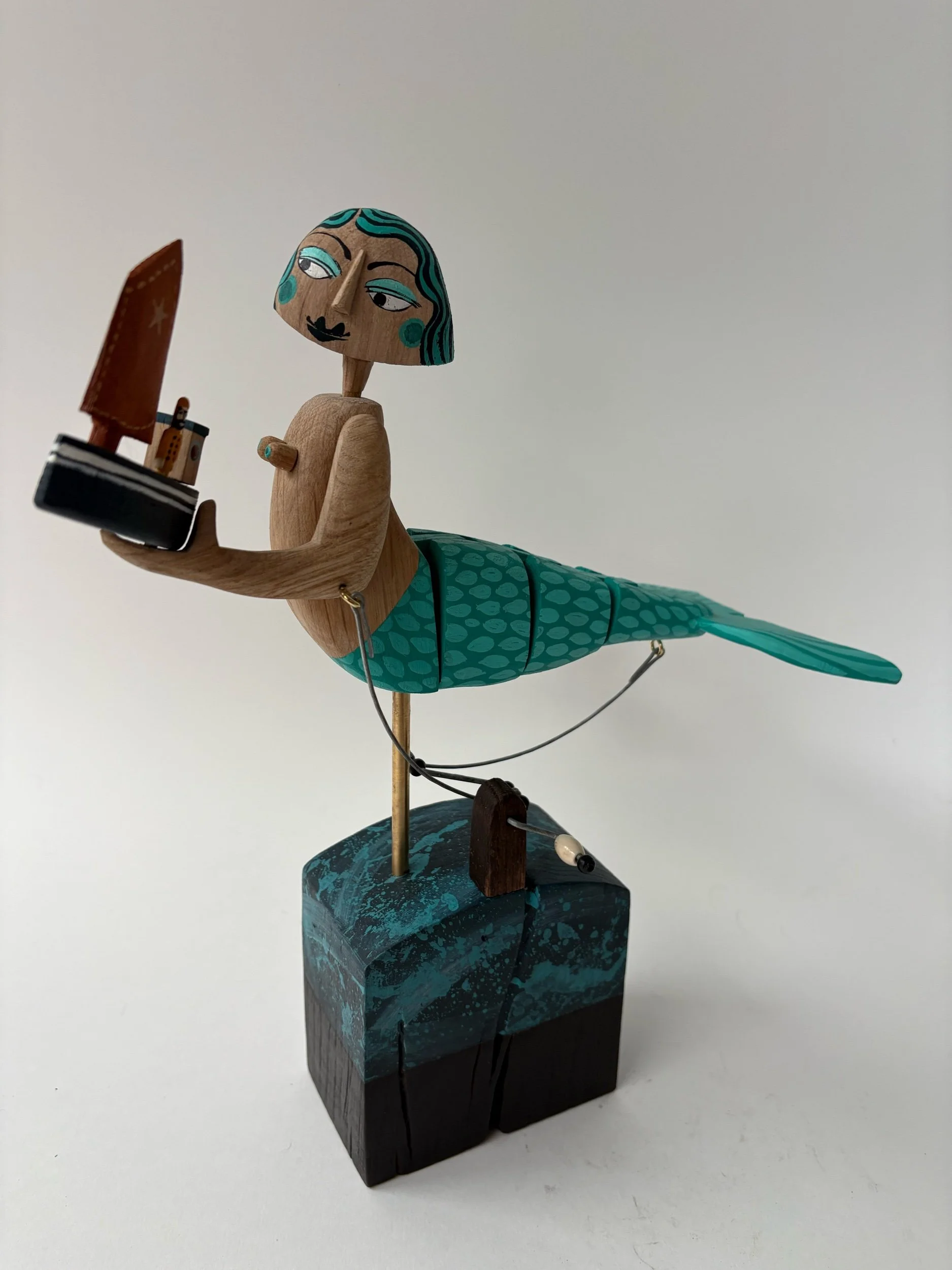 This jointed swimming mermaid flips her tail and raises the fishing boat like a plaything when the handle is turned. Hand made in oak by Jane and Ralph in far west Cornwall. 31 cm x 24cm