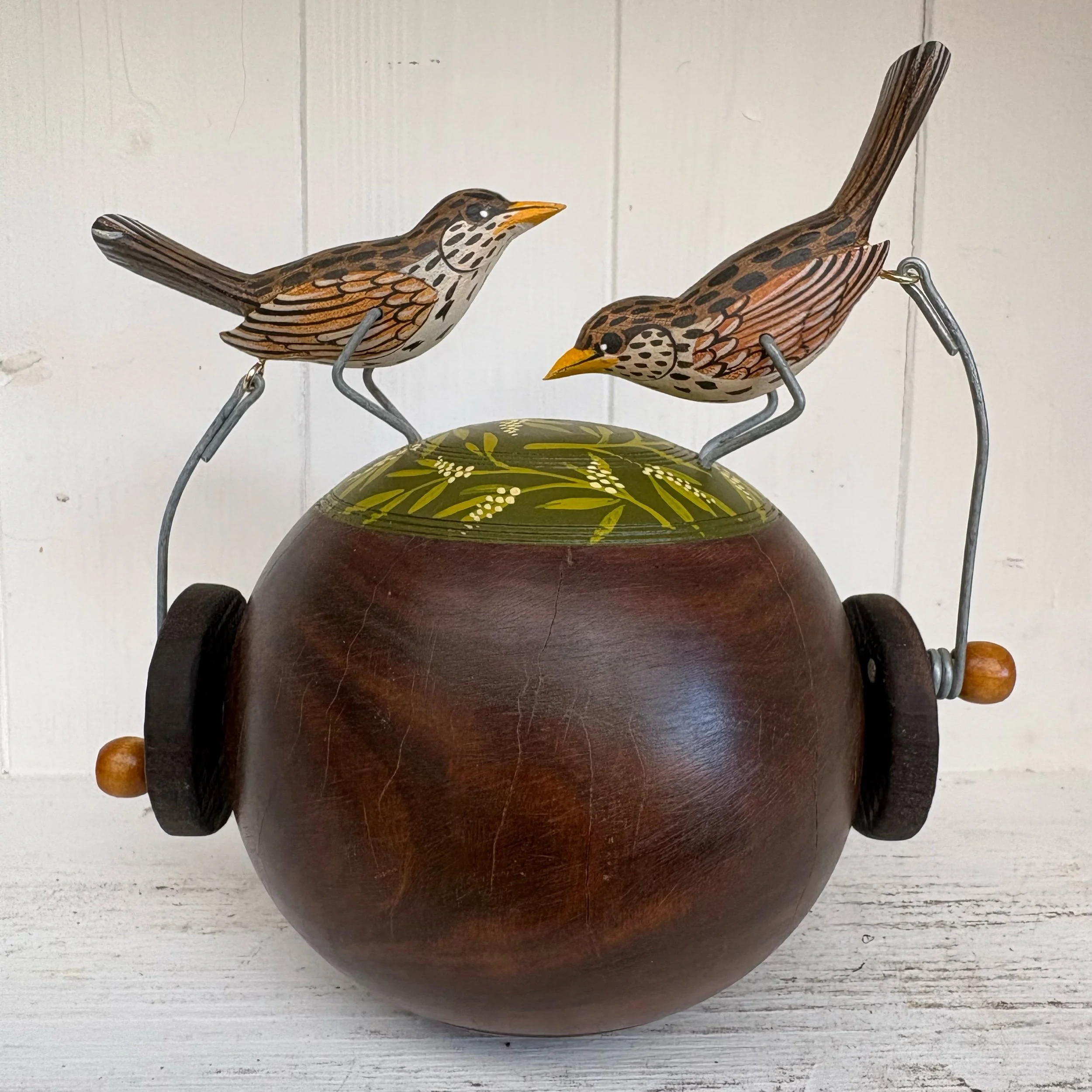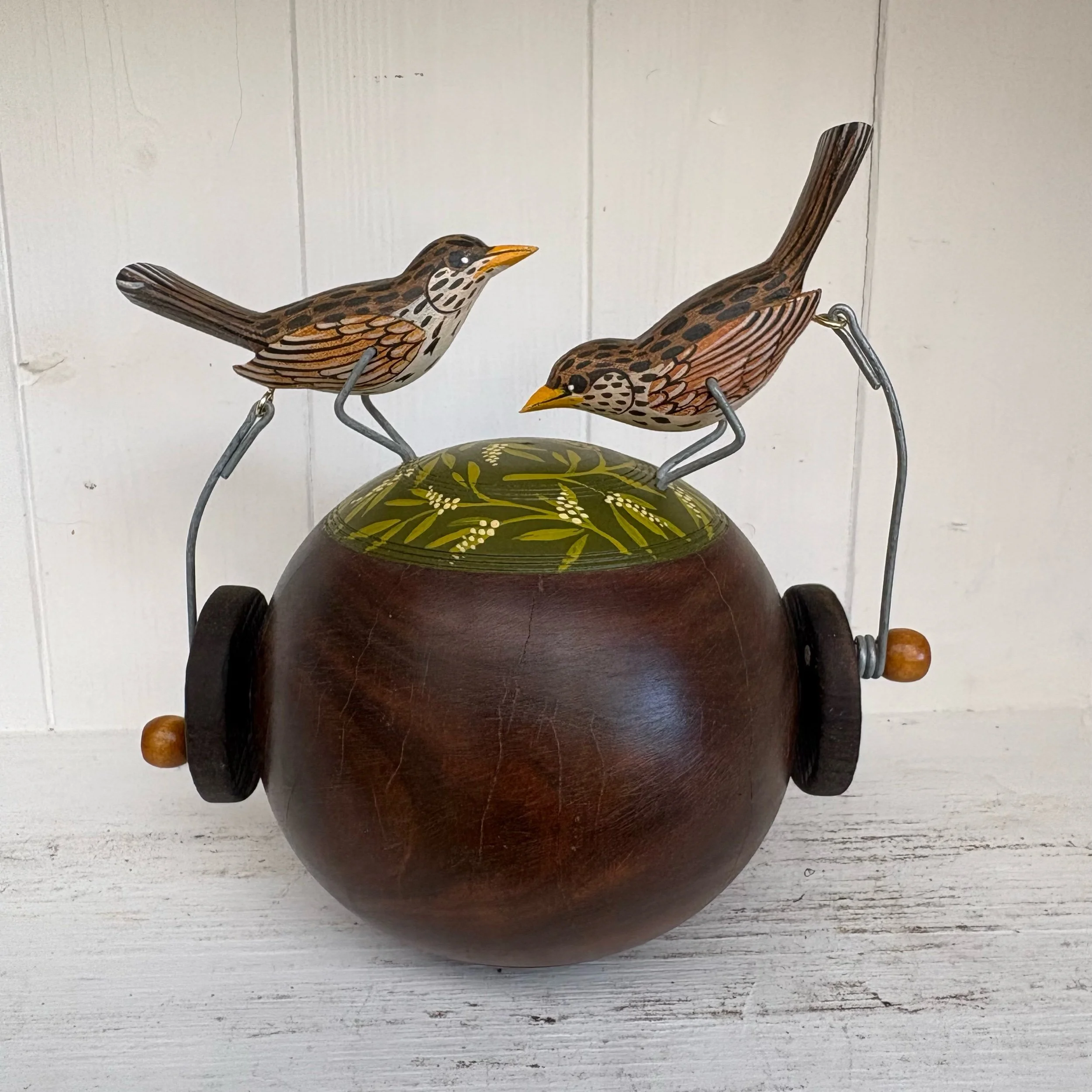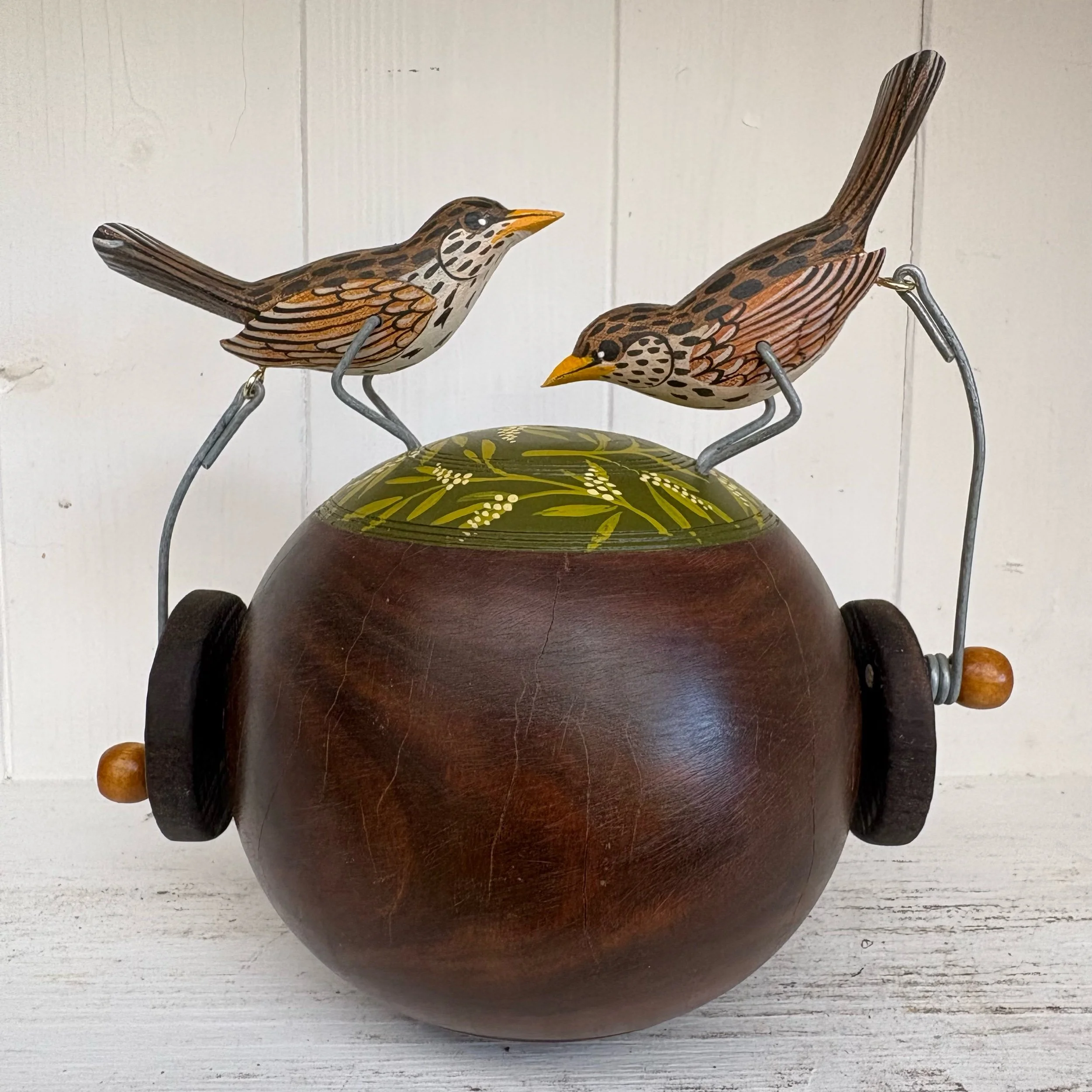 When the handle is turned the painted wooden Thrushes make a pecking movement on the vintsge Lignum Bowling Ball. Hand made by Jane snd Ralph in far West Cornwall. 16cm x 18cm abd very heavy