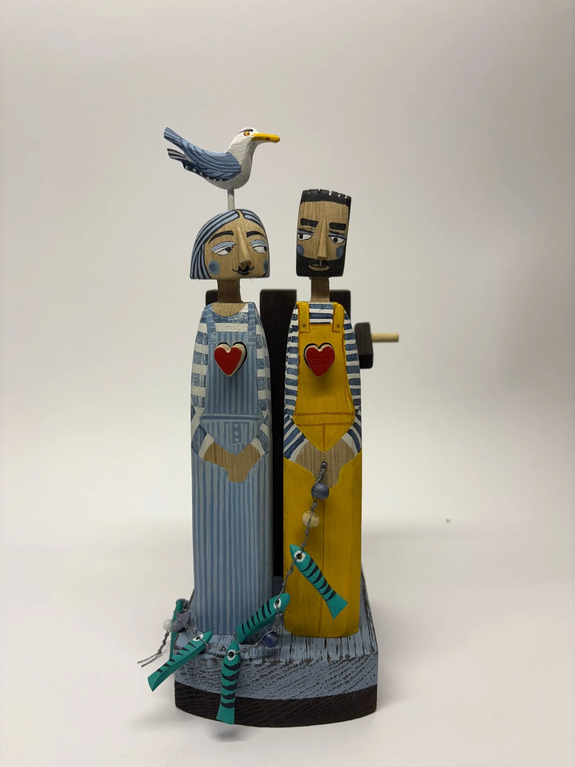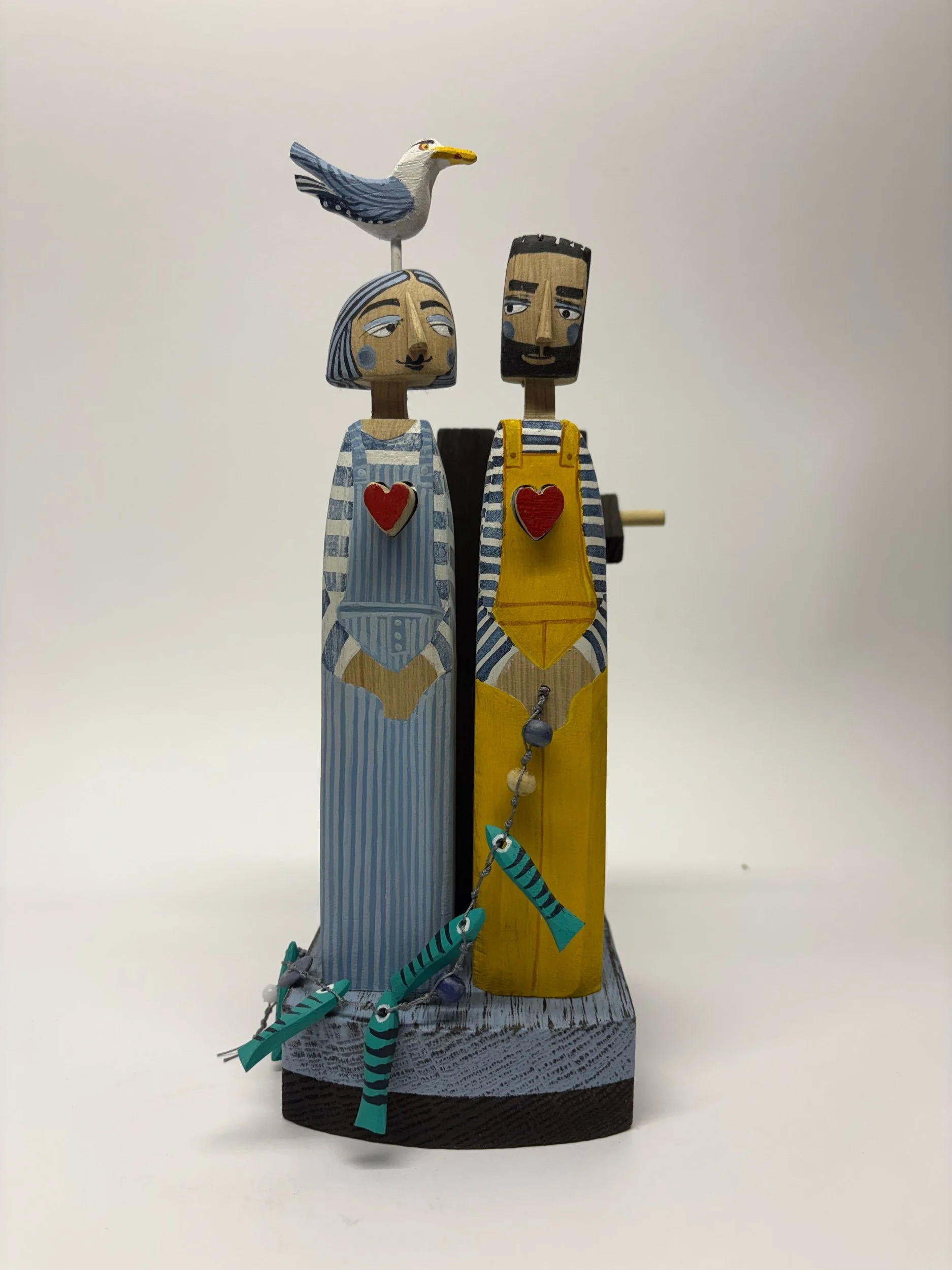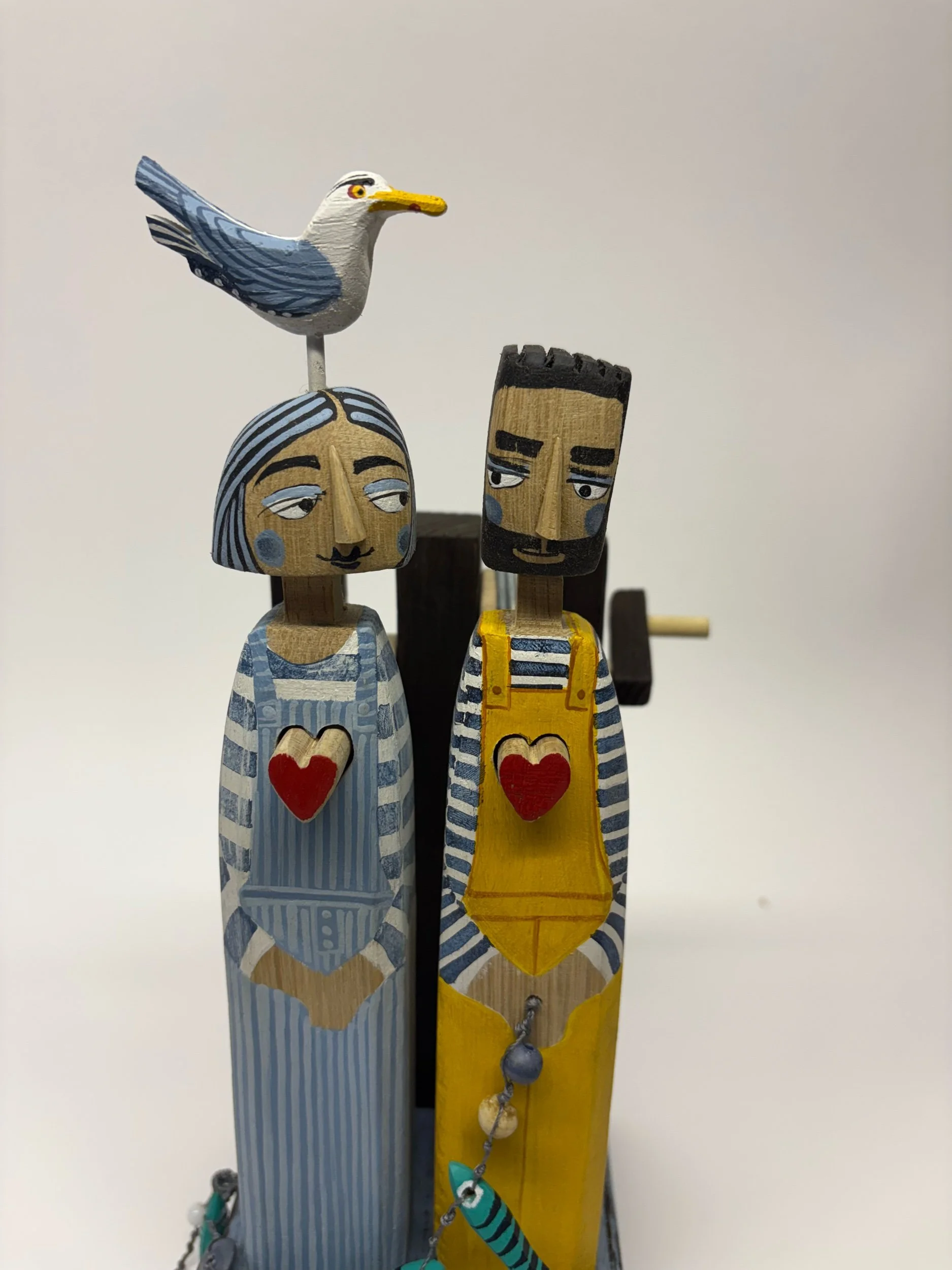 When the handle is turned the hearts in the carved and painted figures beats in and out. Made in oak by Jane and Ralph in far West Cornwall. 29cm tall