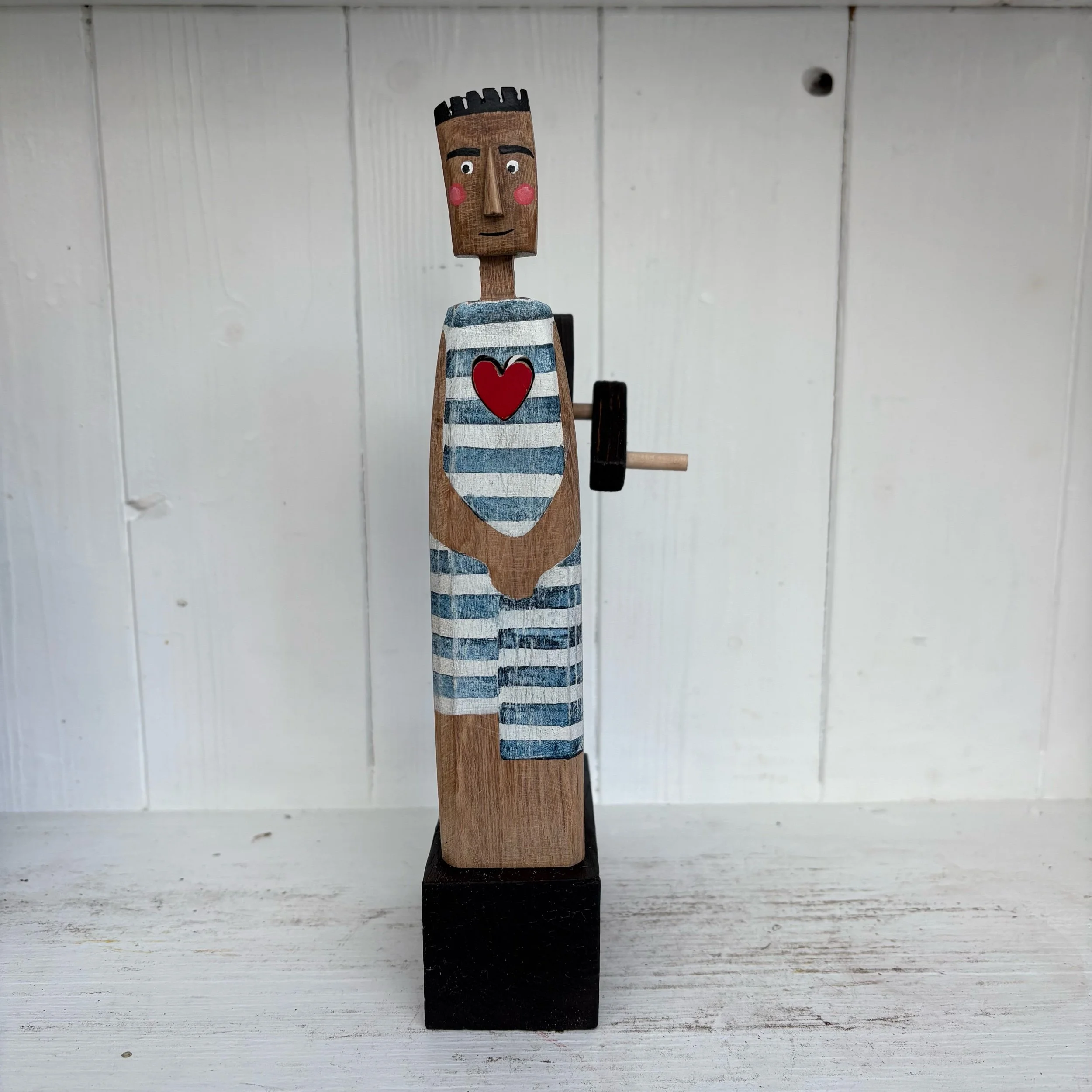 When the handle is turned the heart in the painted figure beats in and out. Made by hand in oak by Jane and Ralph in far West Cornwall. 24cm tall