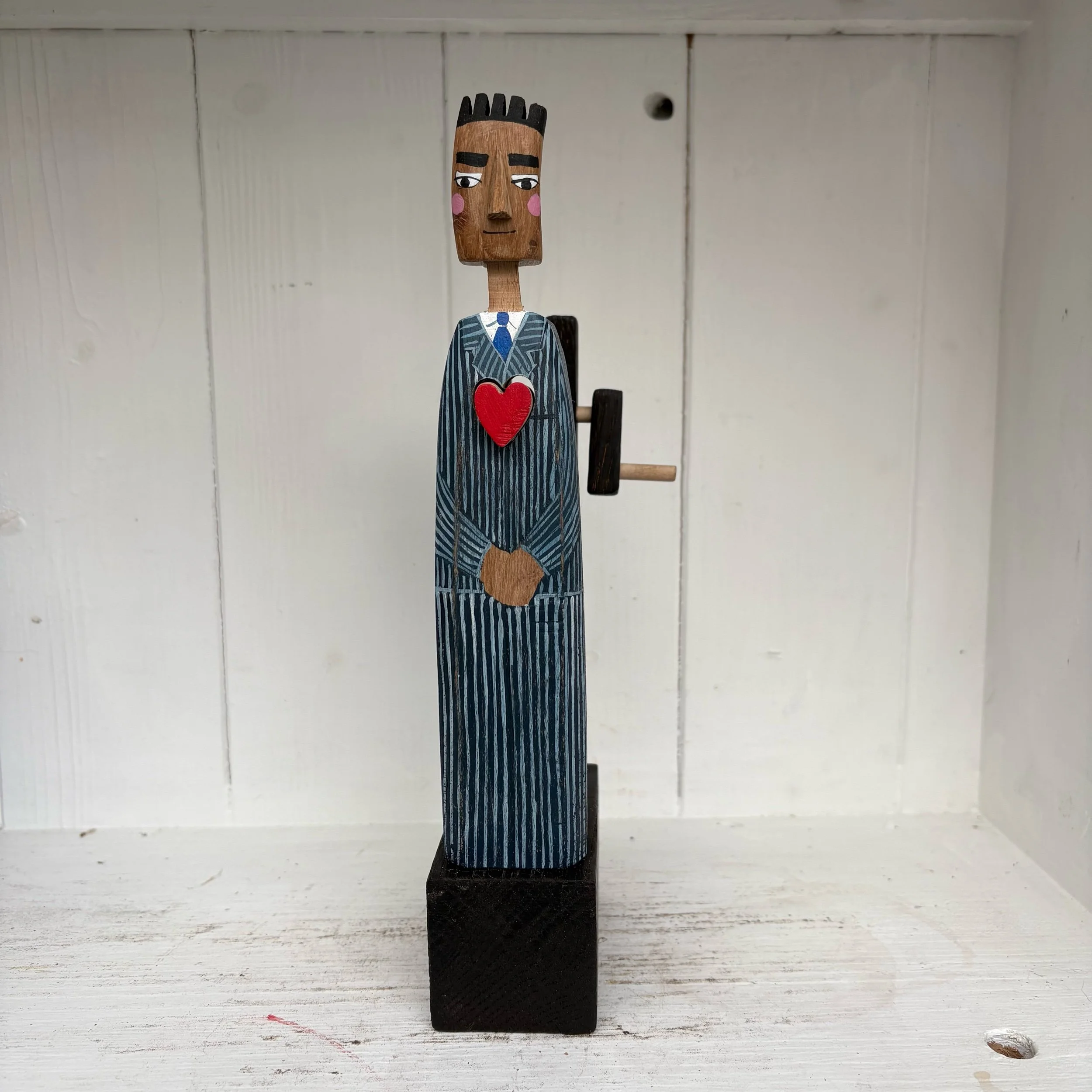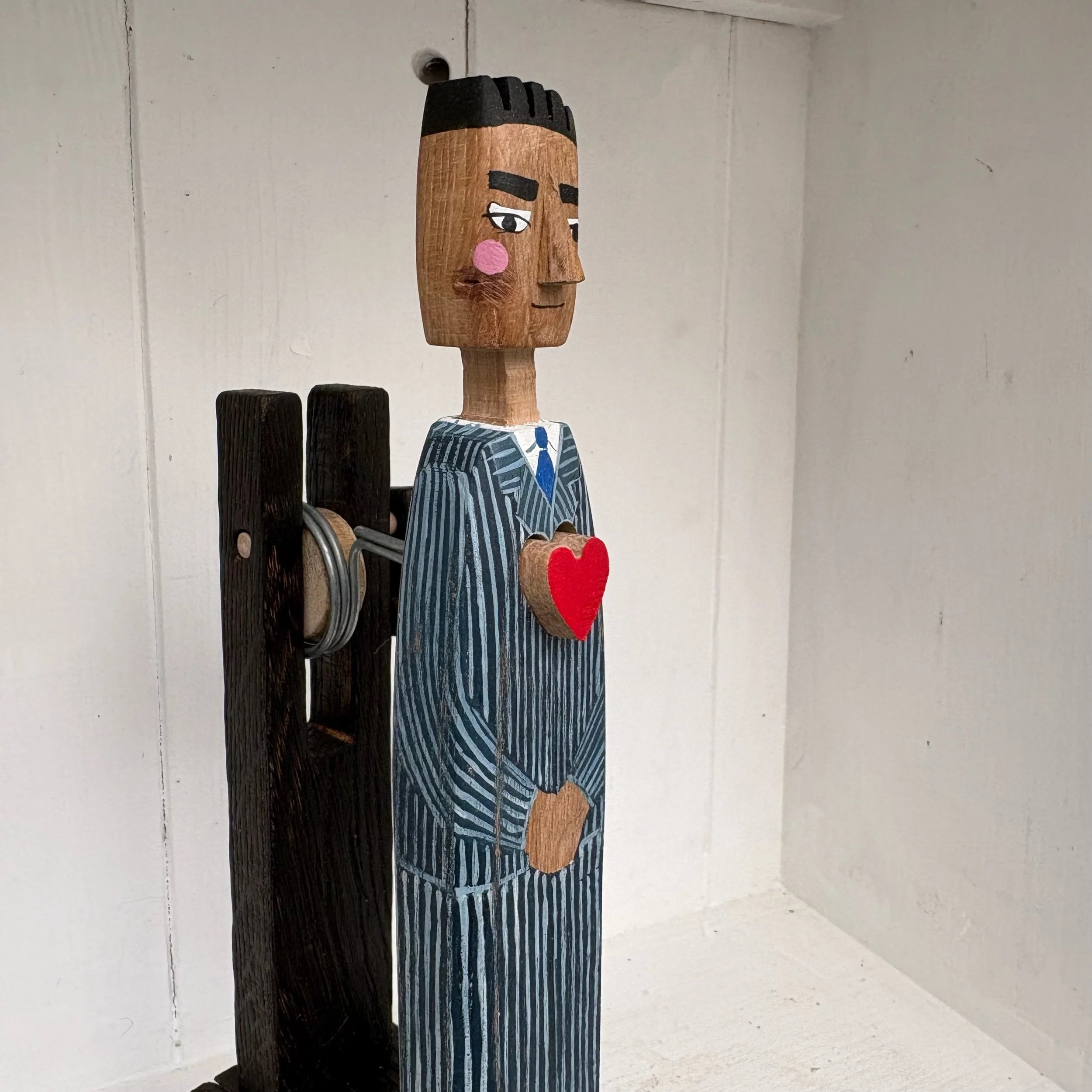 When the handle is turned the hearts in the carved and painted figures beat beats in and out. Made in oak by Jane and Ralph in far West Cornwall. 23cm tall