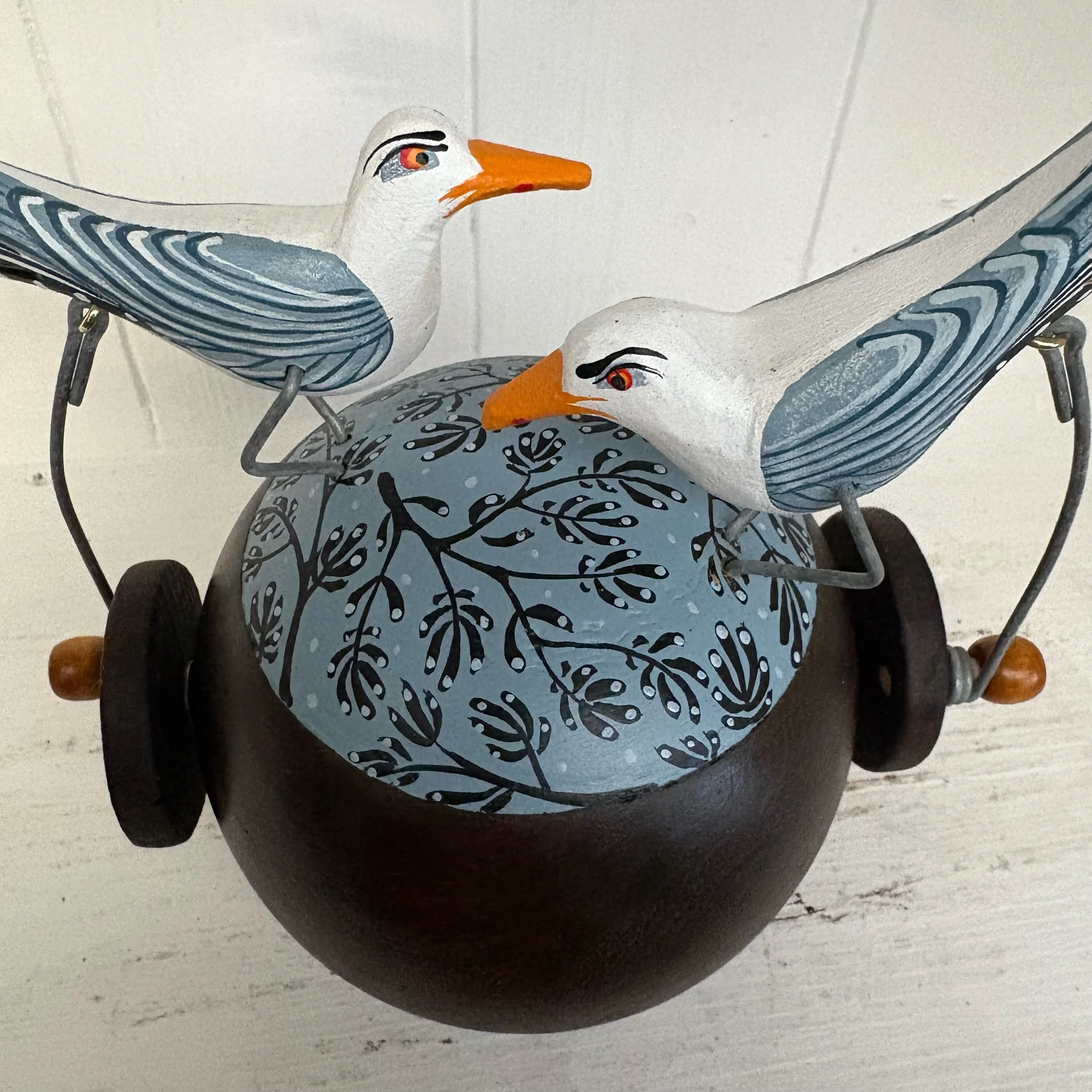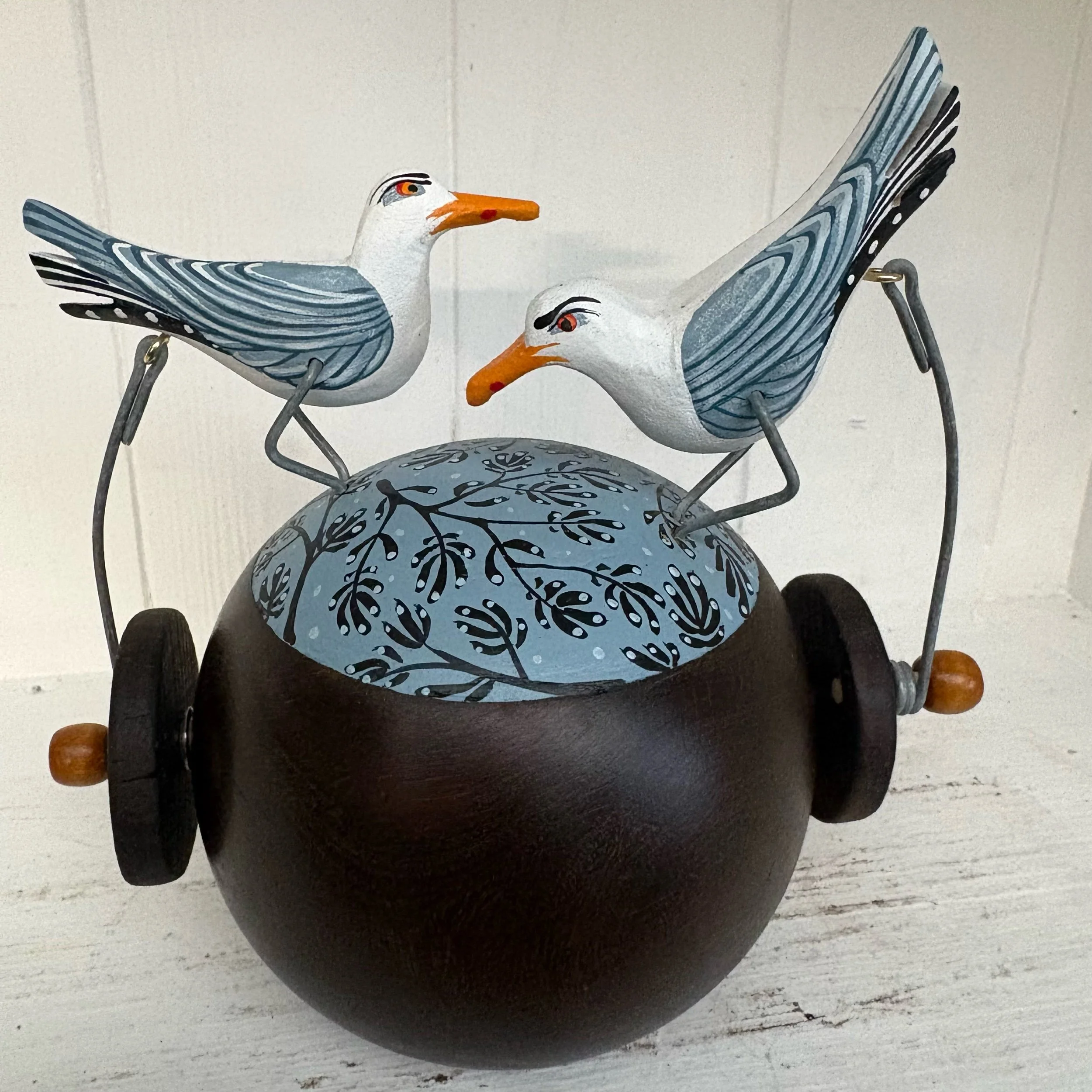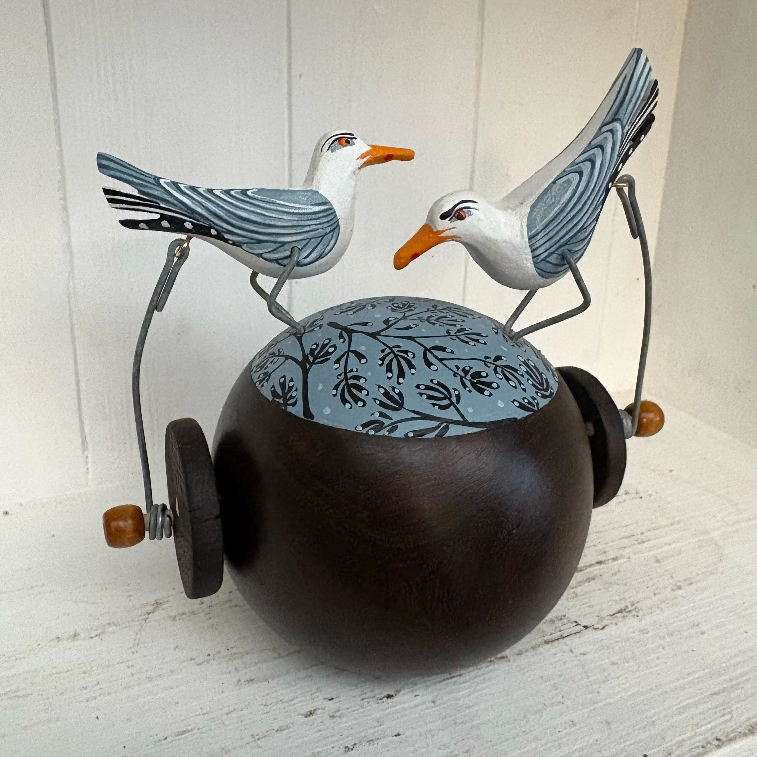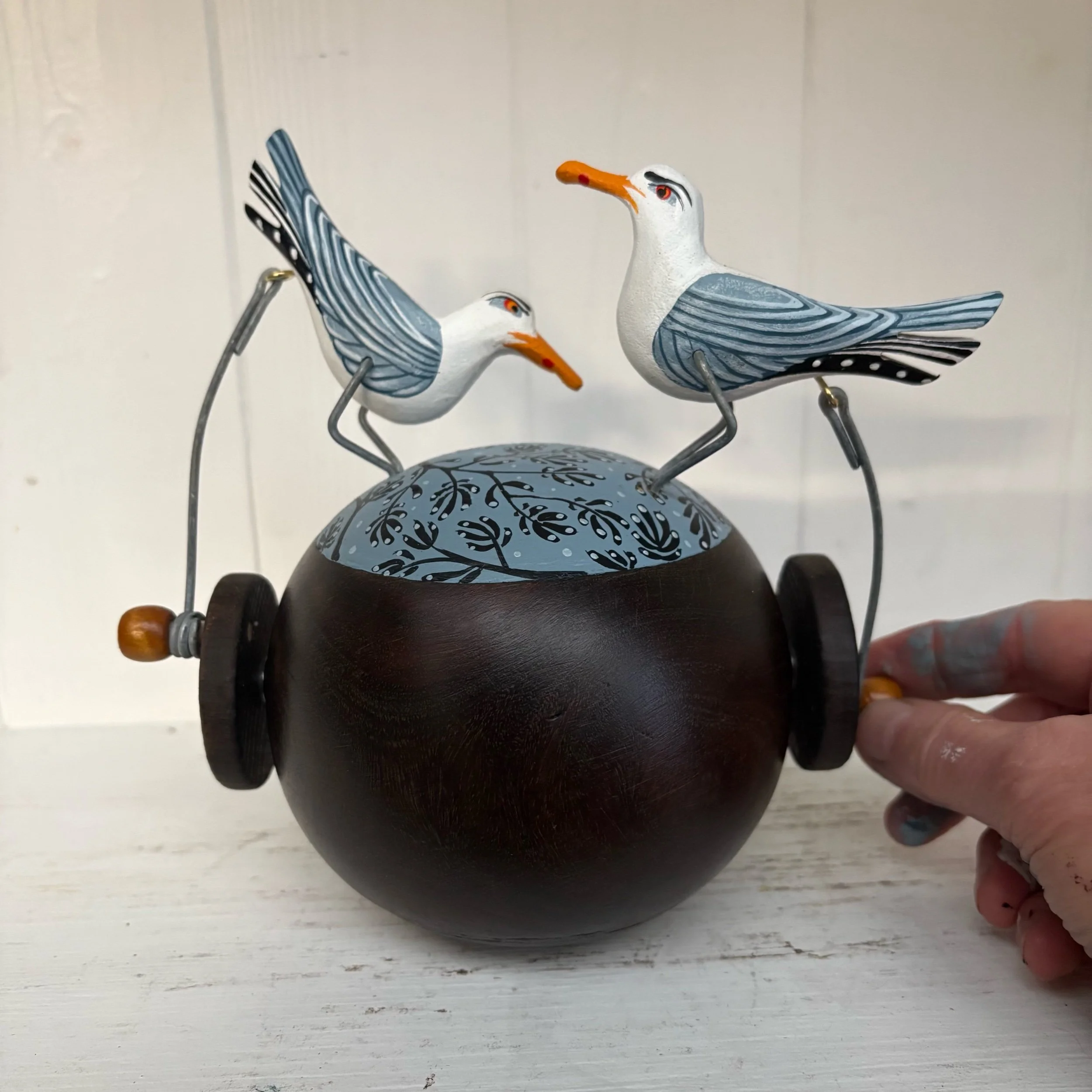 When the handle is turned the gulls on tge vintage lignum vitae Bowling Ball make a pecking movements onnthe oainted. Hand made by Jane and Ralph in far West Cornwall. 16 cm tall and heavy