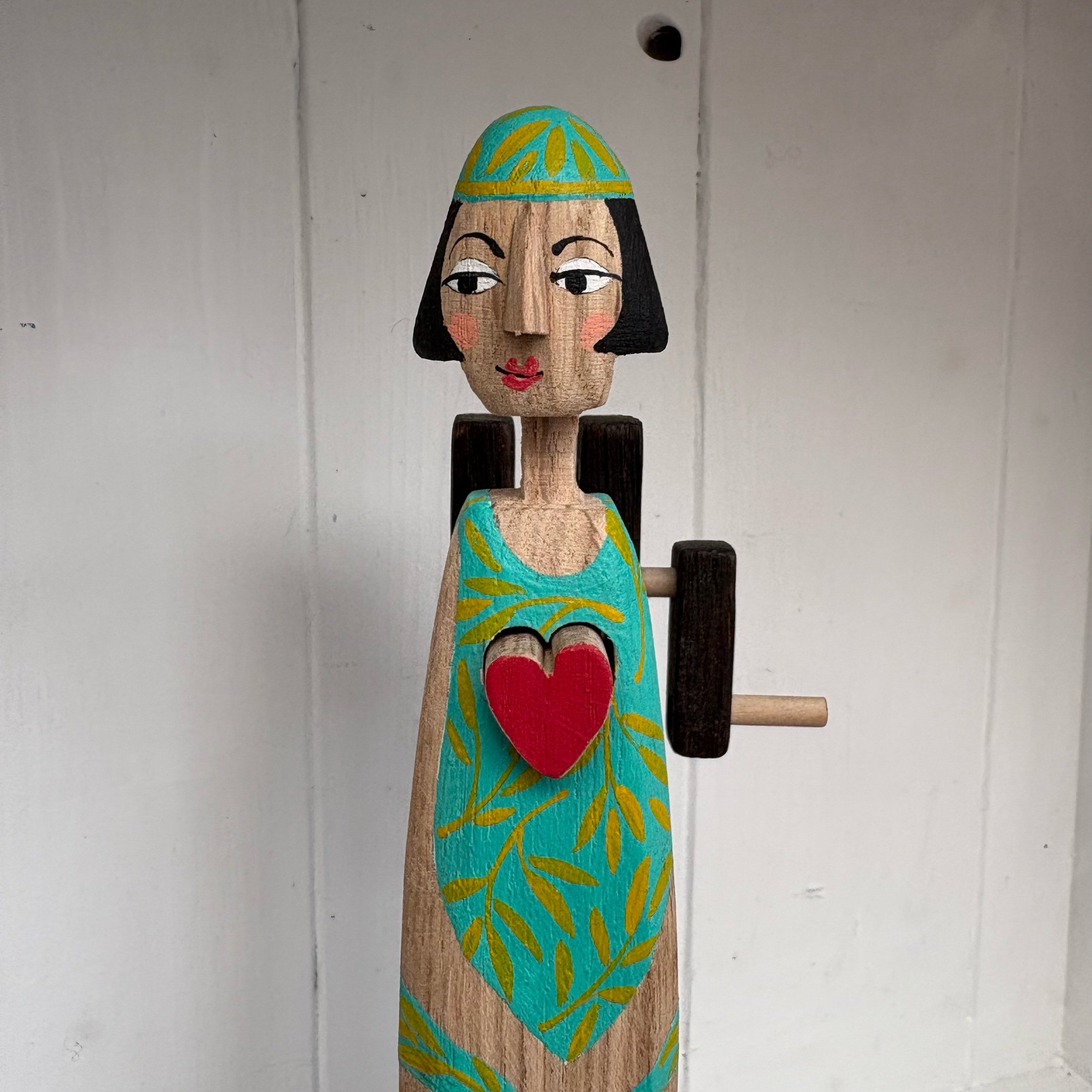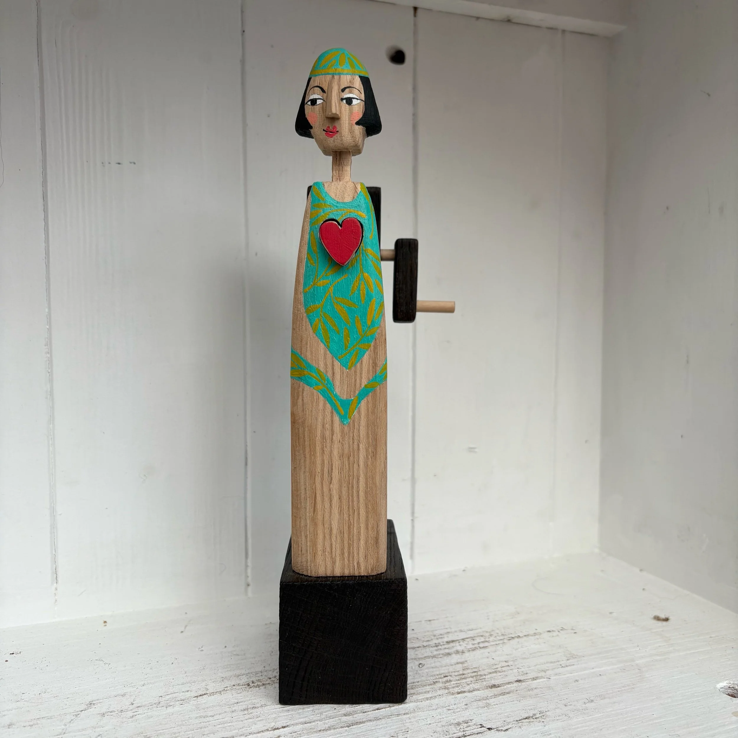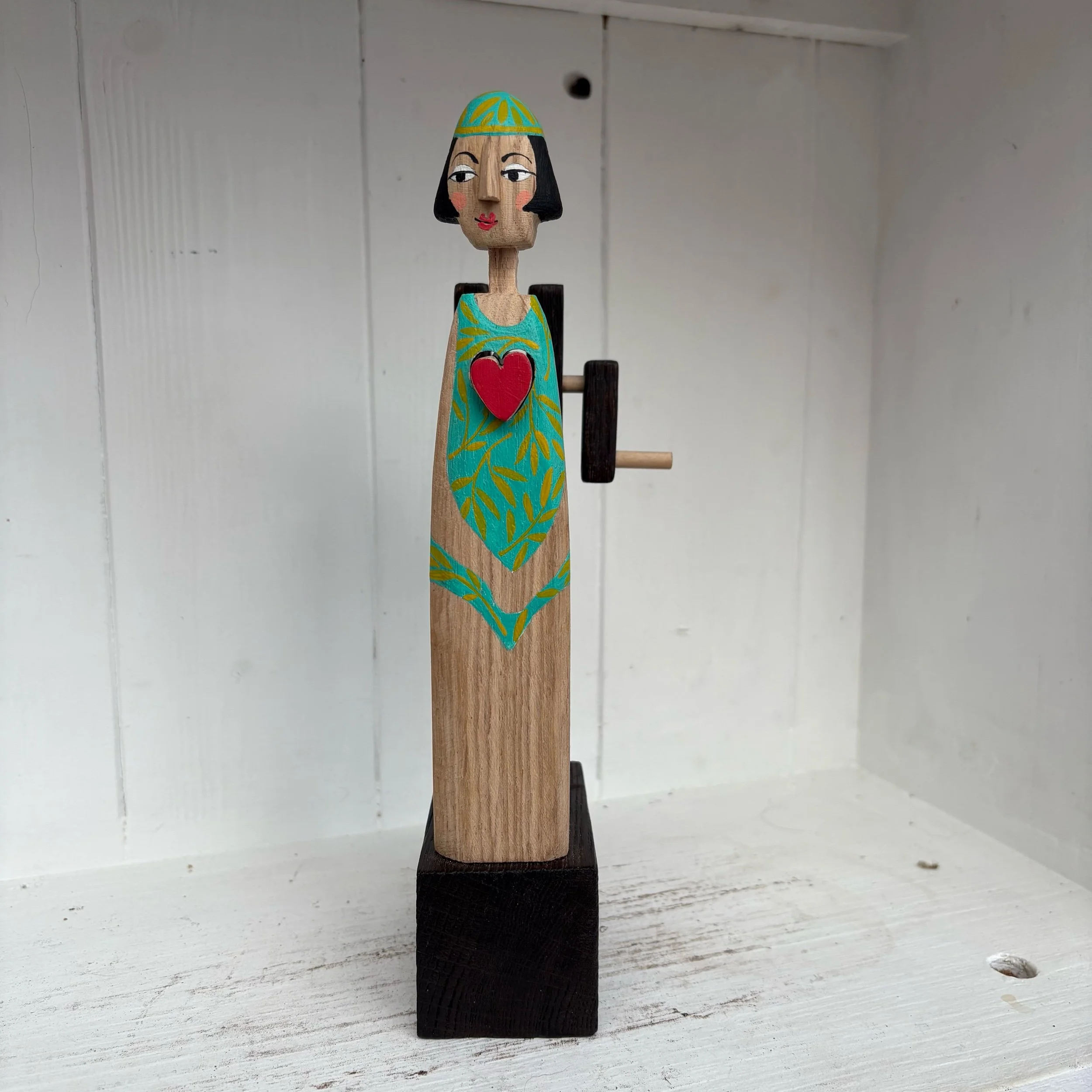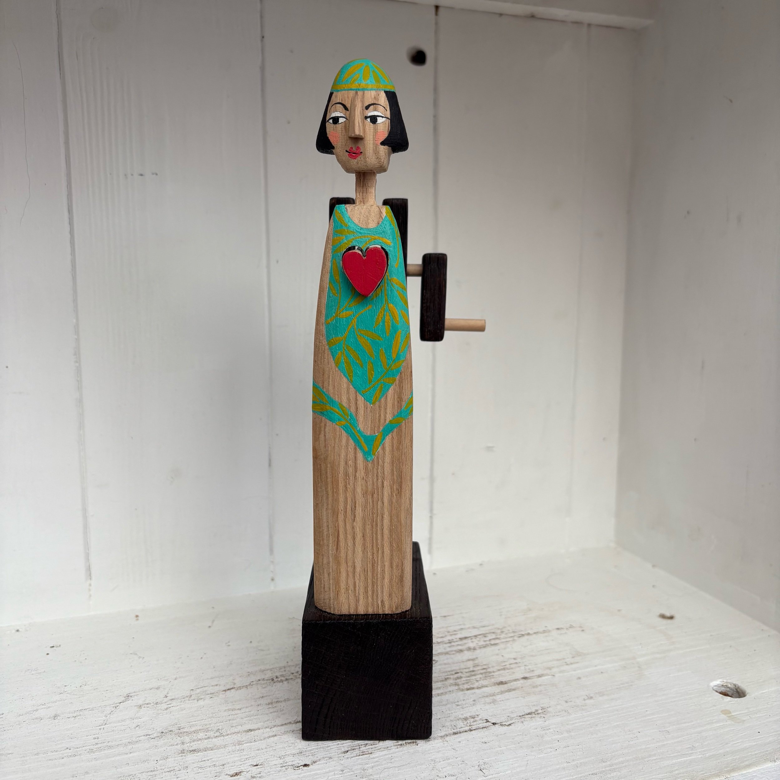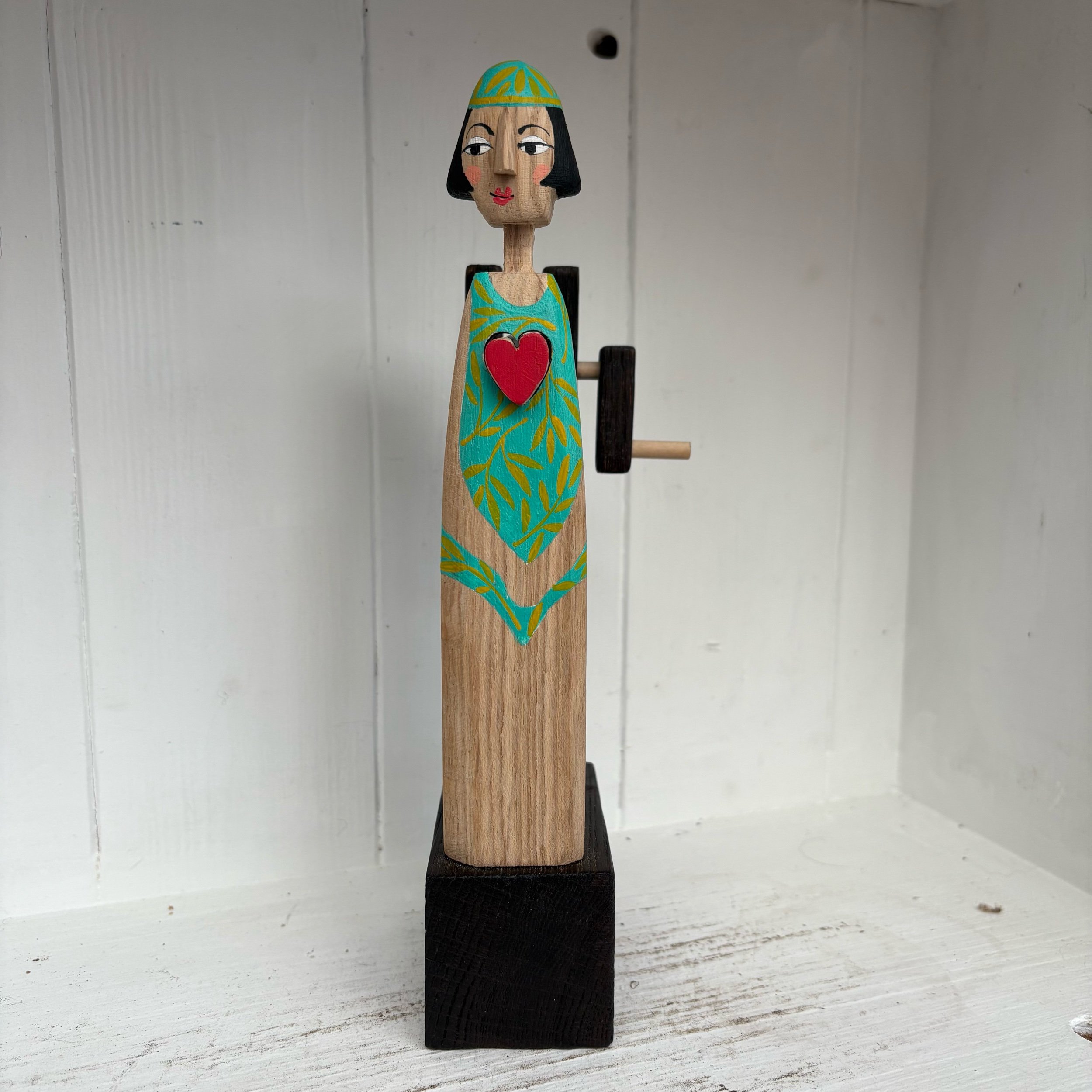 When the handle is turned the heart in the lady swimmer beats in snd out. Hand made in oak by Jane and Ralph in far West Cornwall. 21cm tall