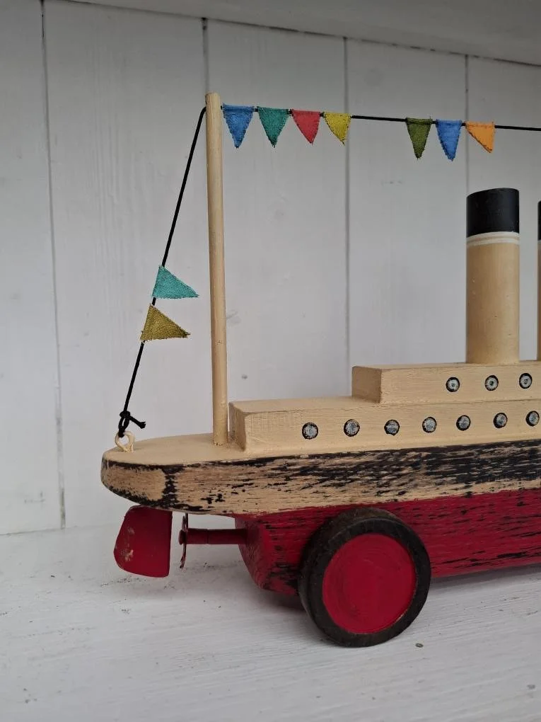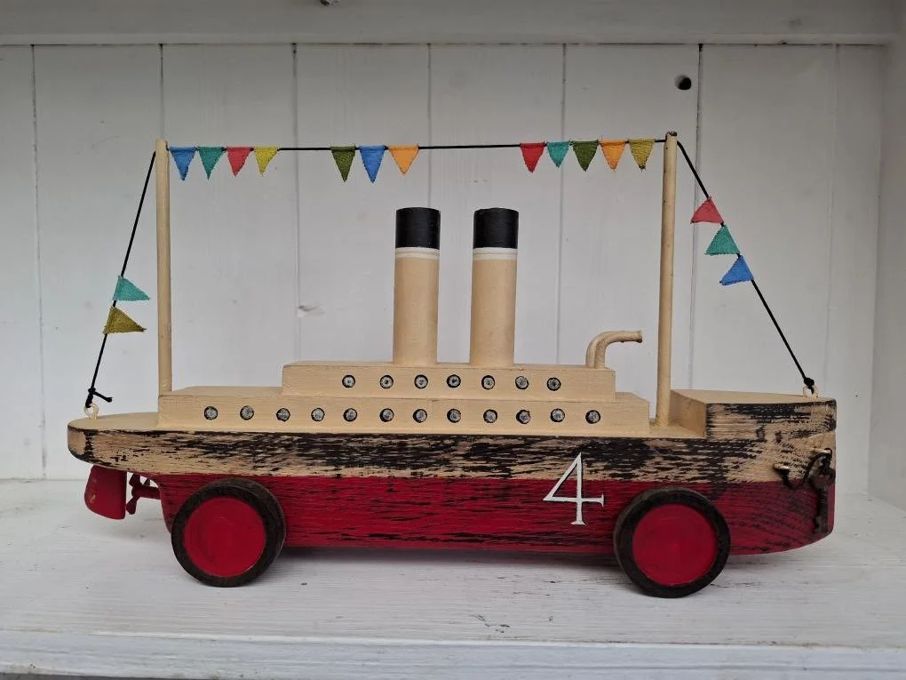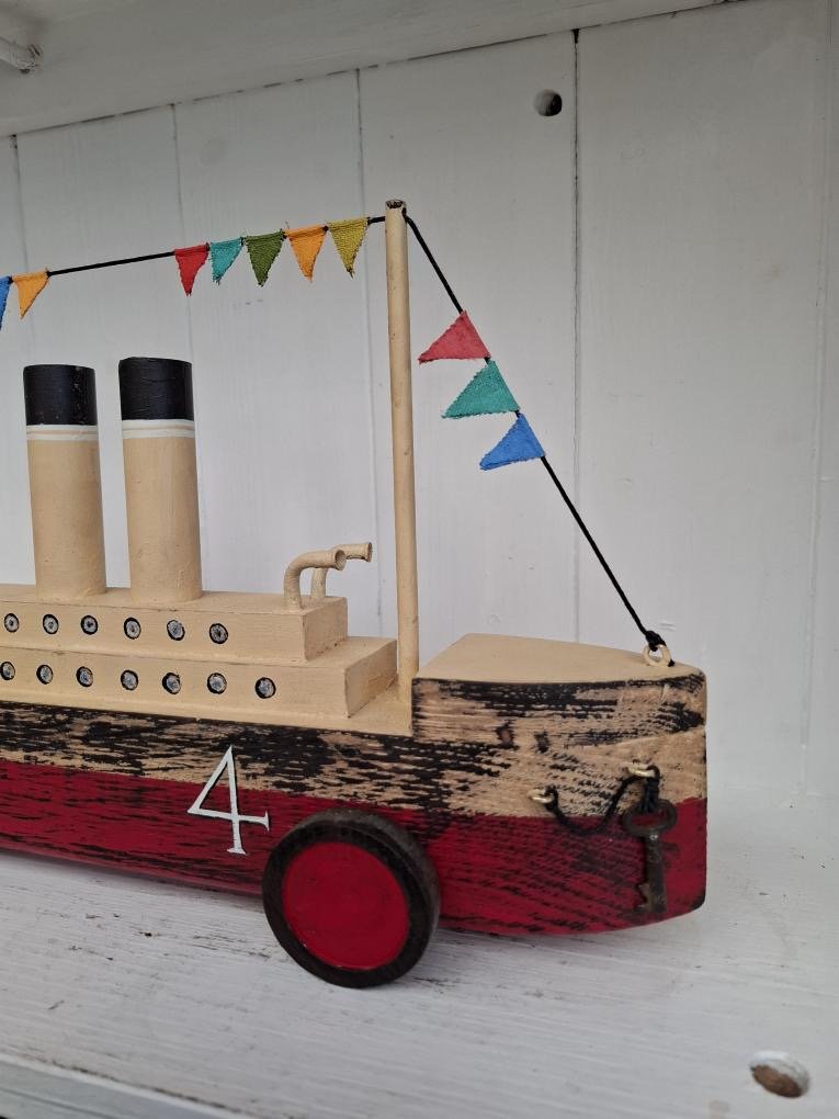 Hand made by Ralph from Oak. The Liner gently rises and falls on excentric wheels when pushed along. 38cm long.