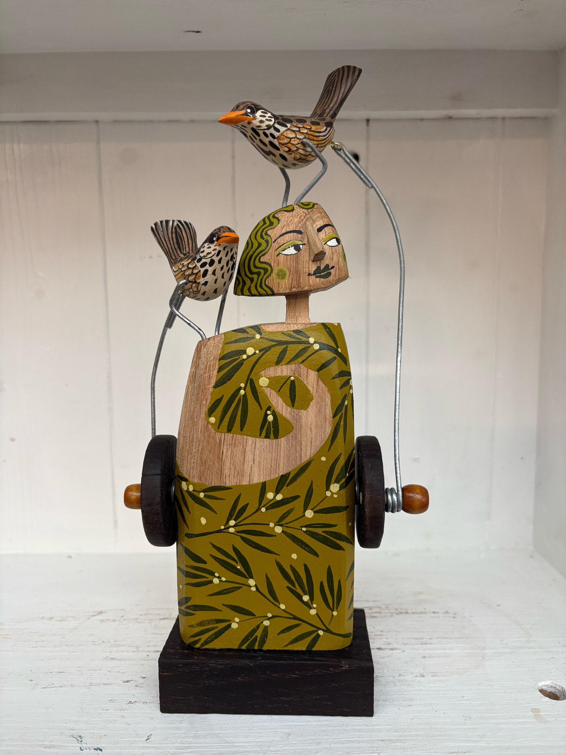 When the handle is turned the painted wooden birds on the shoulder and head of the figure make a pecking movement. Hand made in oak by Jane and Ralph in far West Cornwall. 28cm tall
