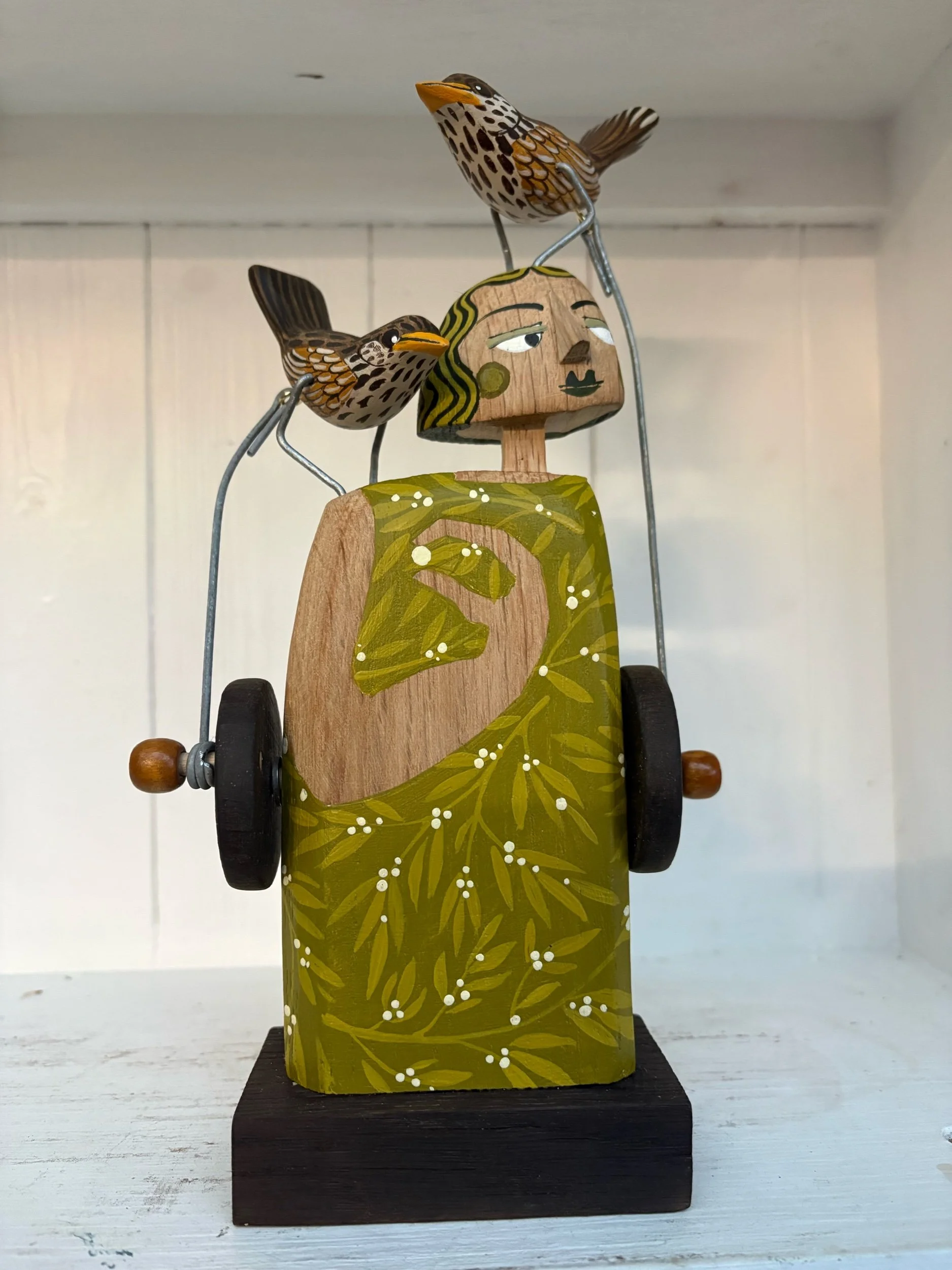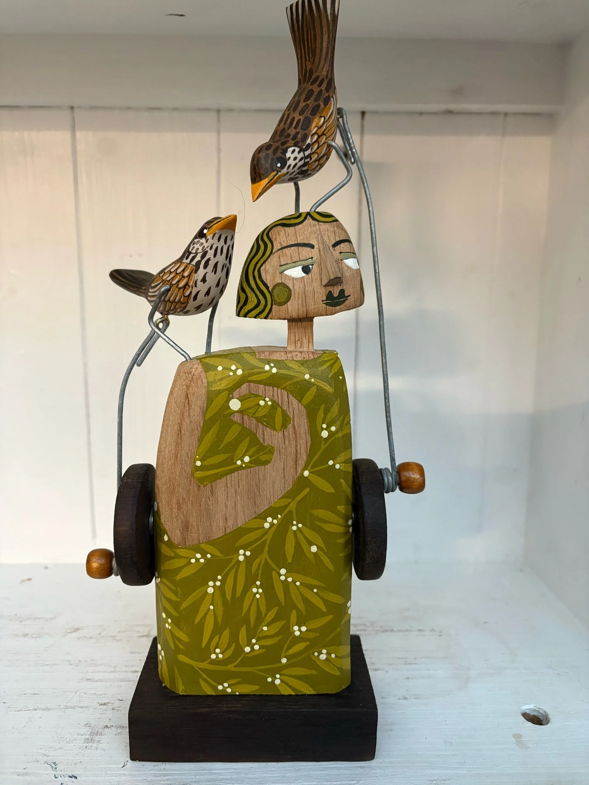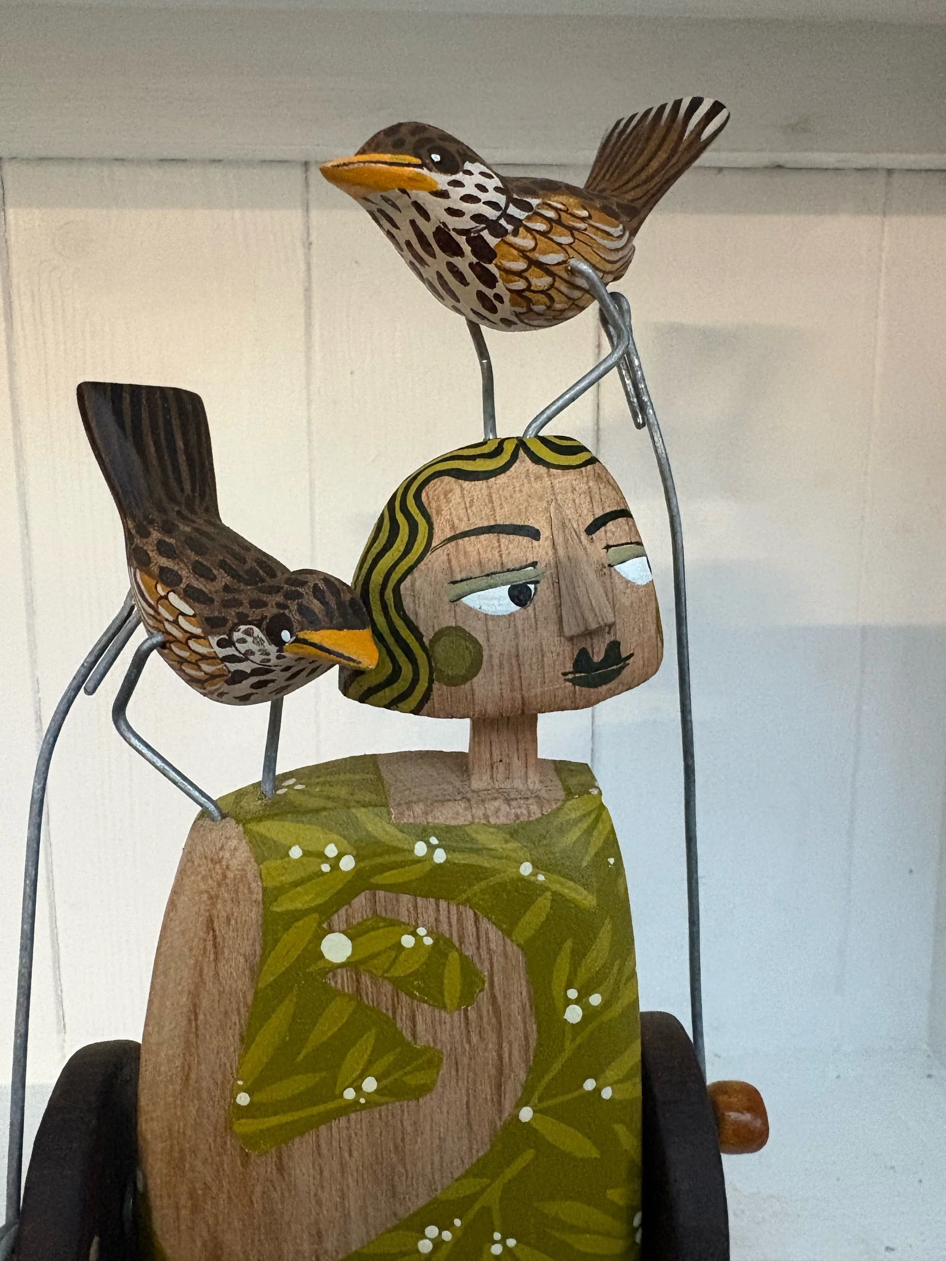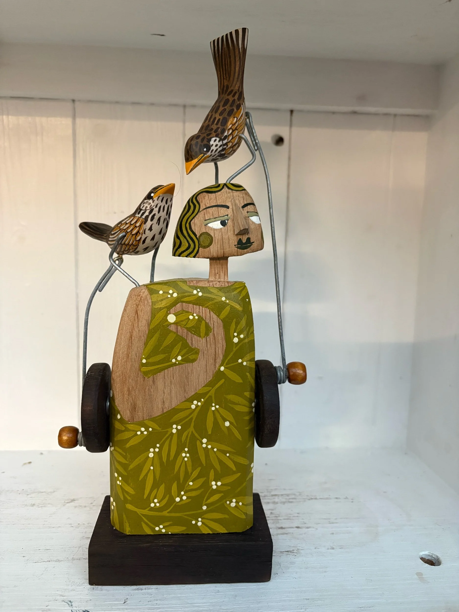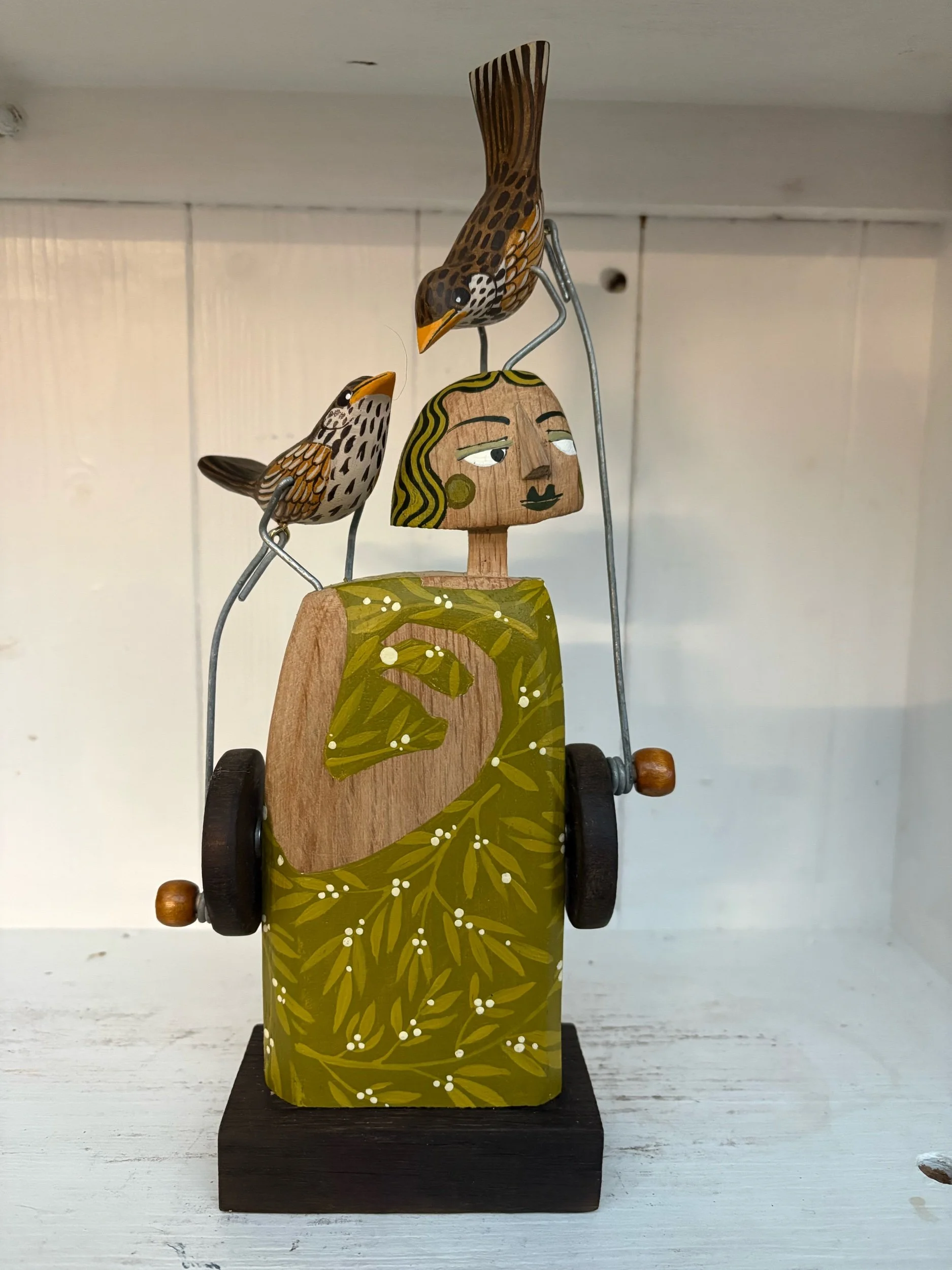 When the handle is turned the birds on the shoulder and head of the carved and painted figure make a pecking movement. Hand made in oak by Jane and Ralph in far West Cornwall. 27cm tall