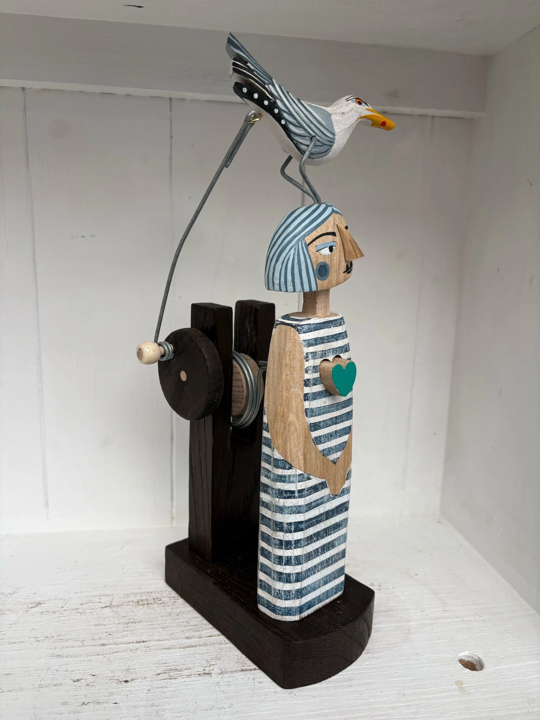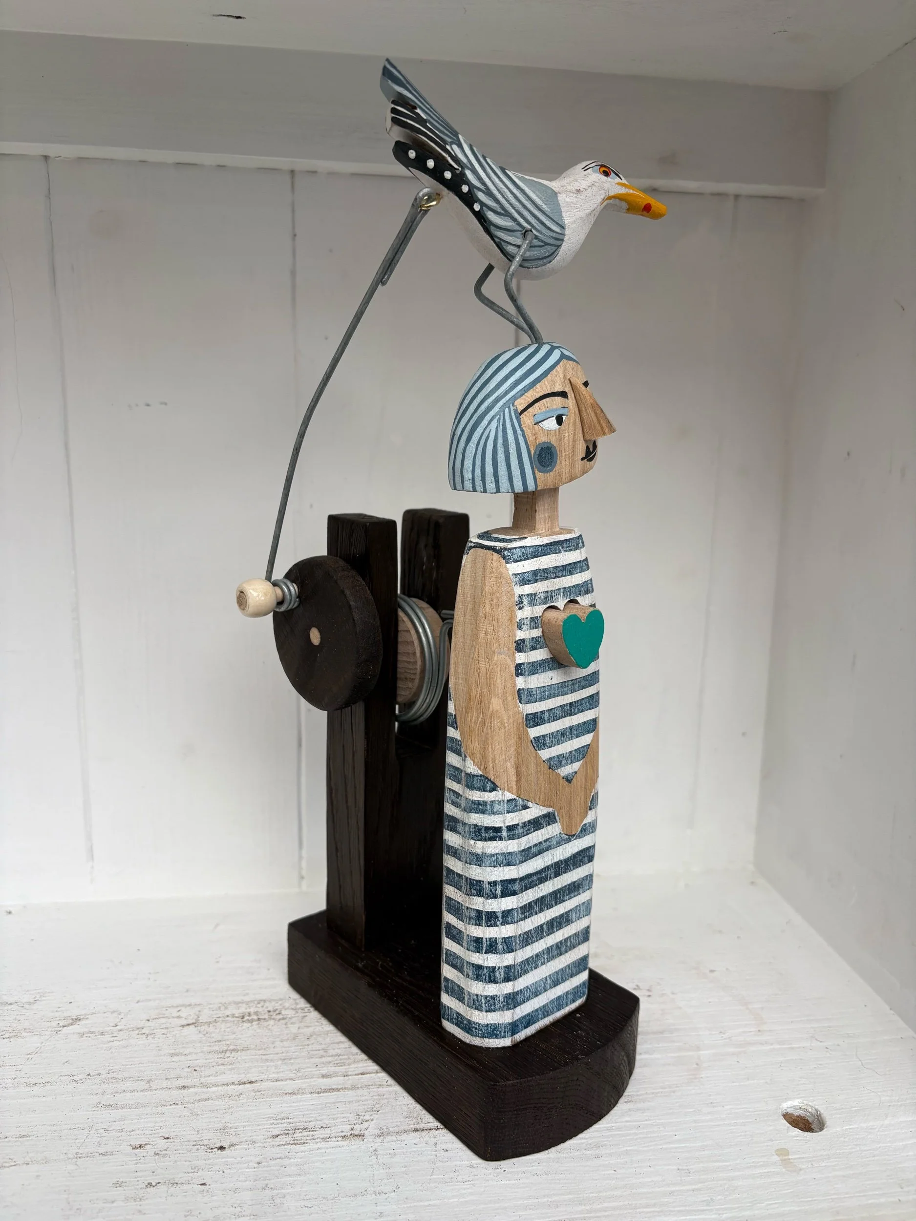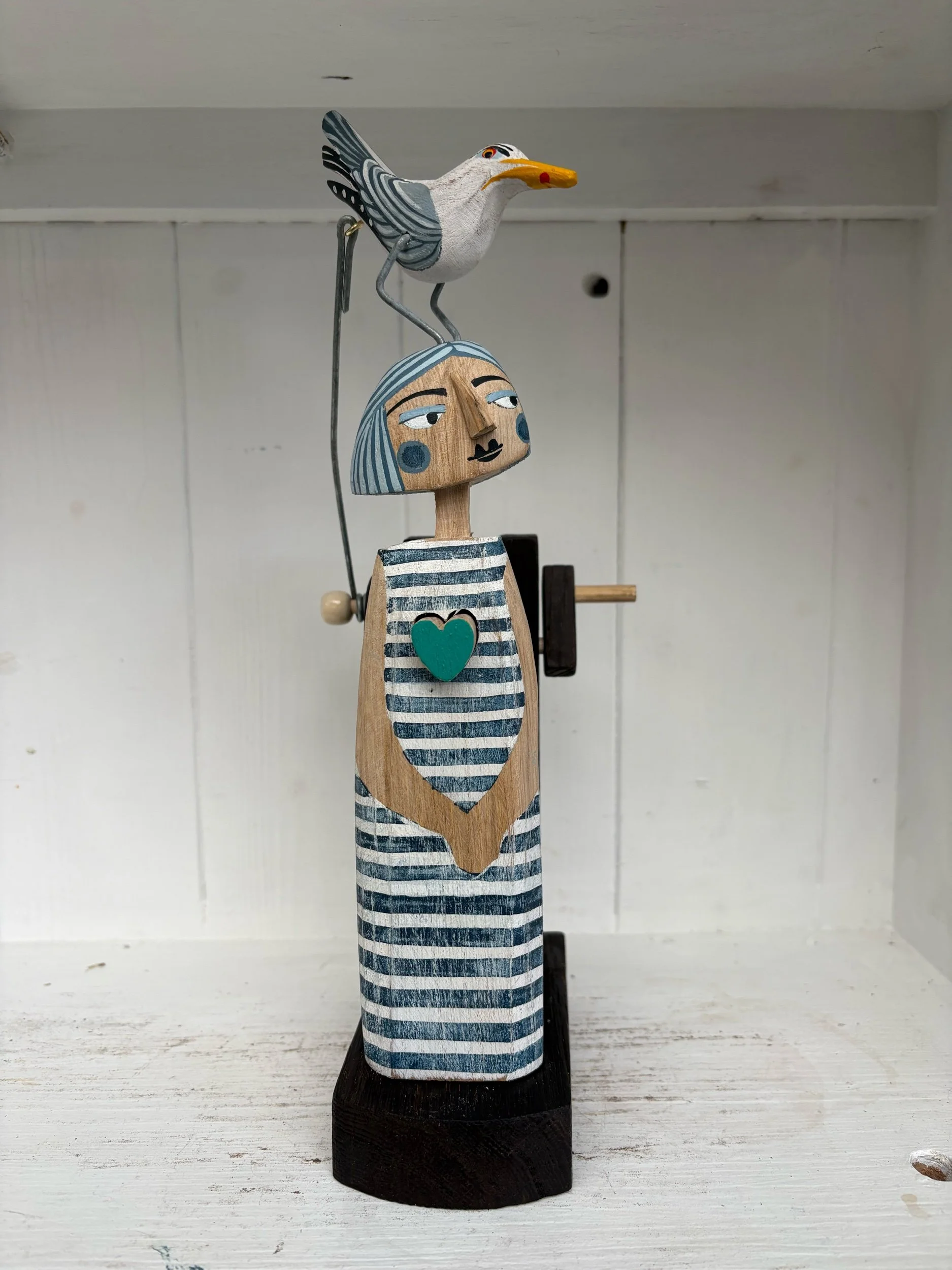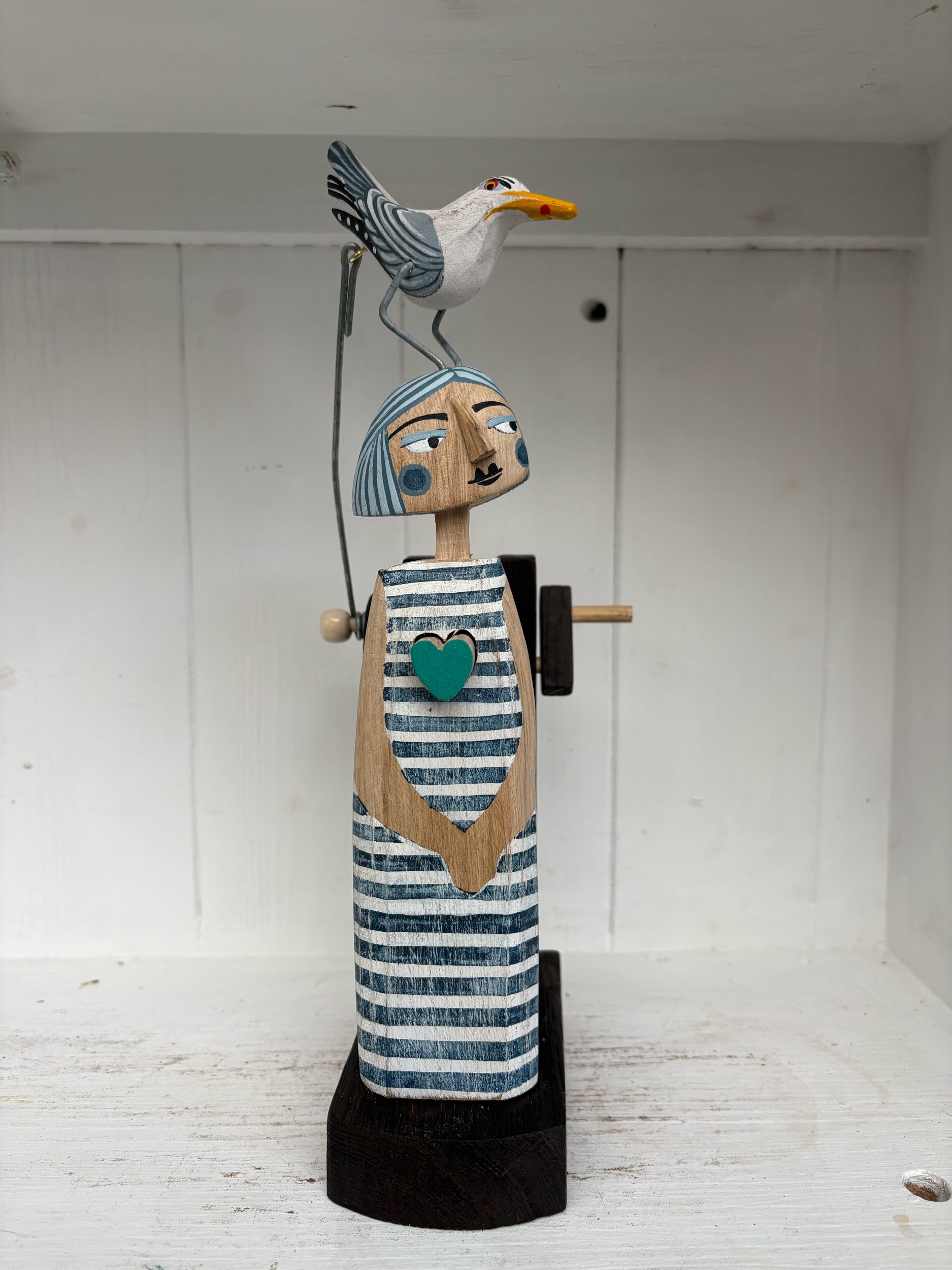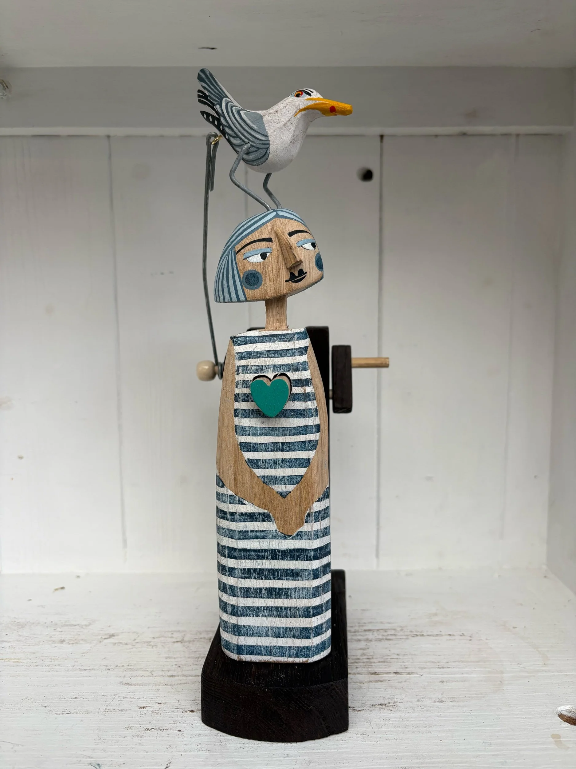 When the handle is turned theheart in the figure beats in and out and tge gull makes a pecking movements on the figures head. Hand made in oak by Jane and Ralph in far West Cornwall. 26cm tall