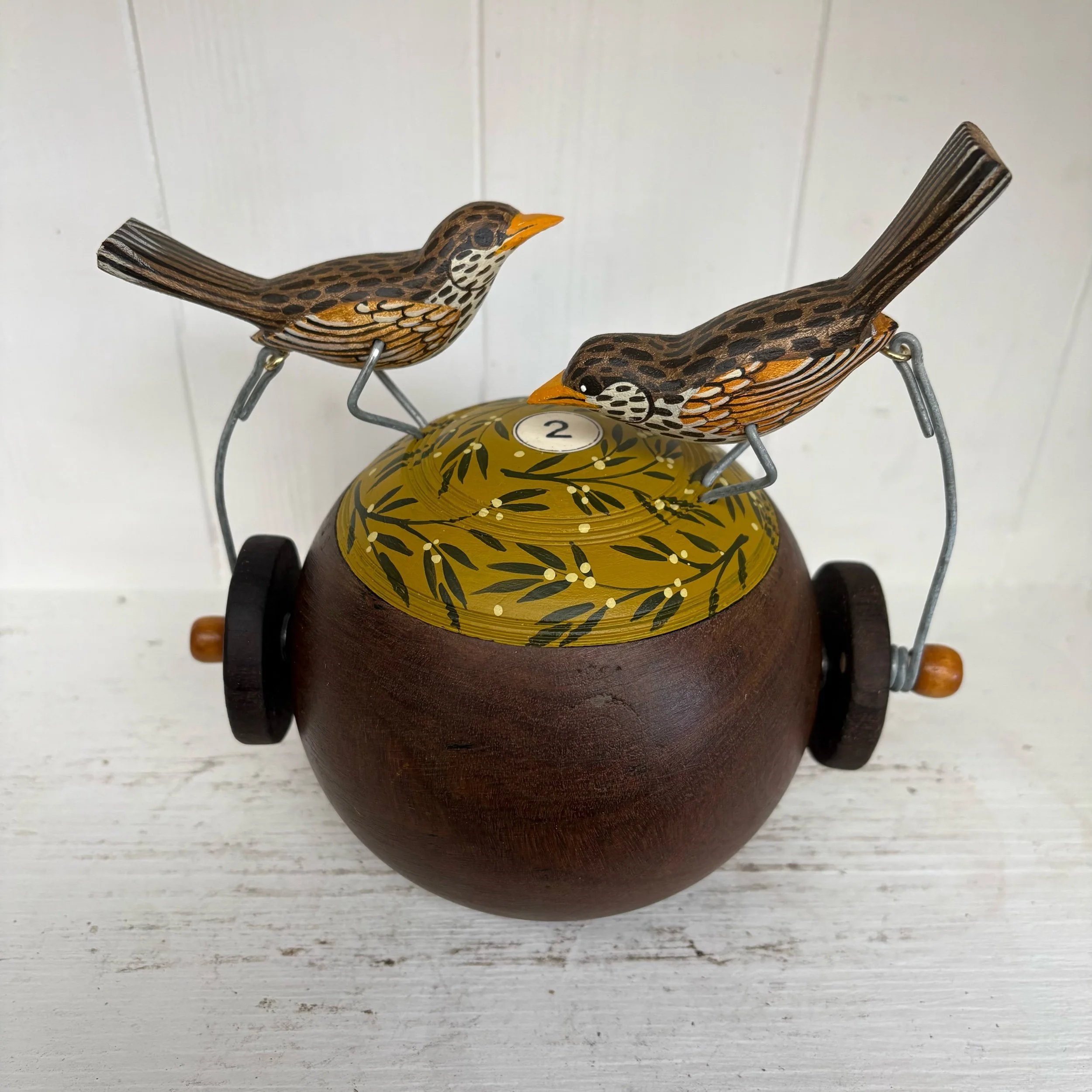 When the handle is turned the pair of carved snd painted wooden Thrushes make a pecking movement on the vintage painted lignum wood Bowling ball. 16cm tall and very heavy! Hand made by Jane and Ralph in far West Cornwall. X