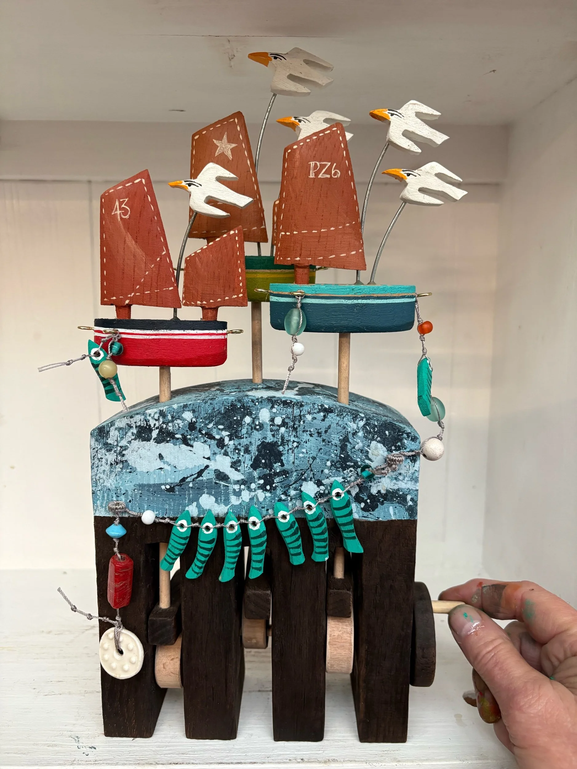 When the handle is turned the three boats rise and fall in sequence driven by the cams in the base. Hand made in oak by Jane and Ralph in far West Cornwall. 33cm tall.