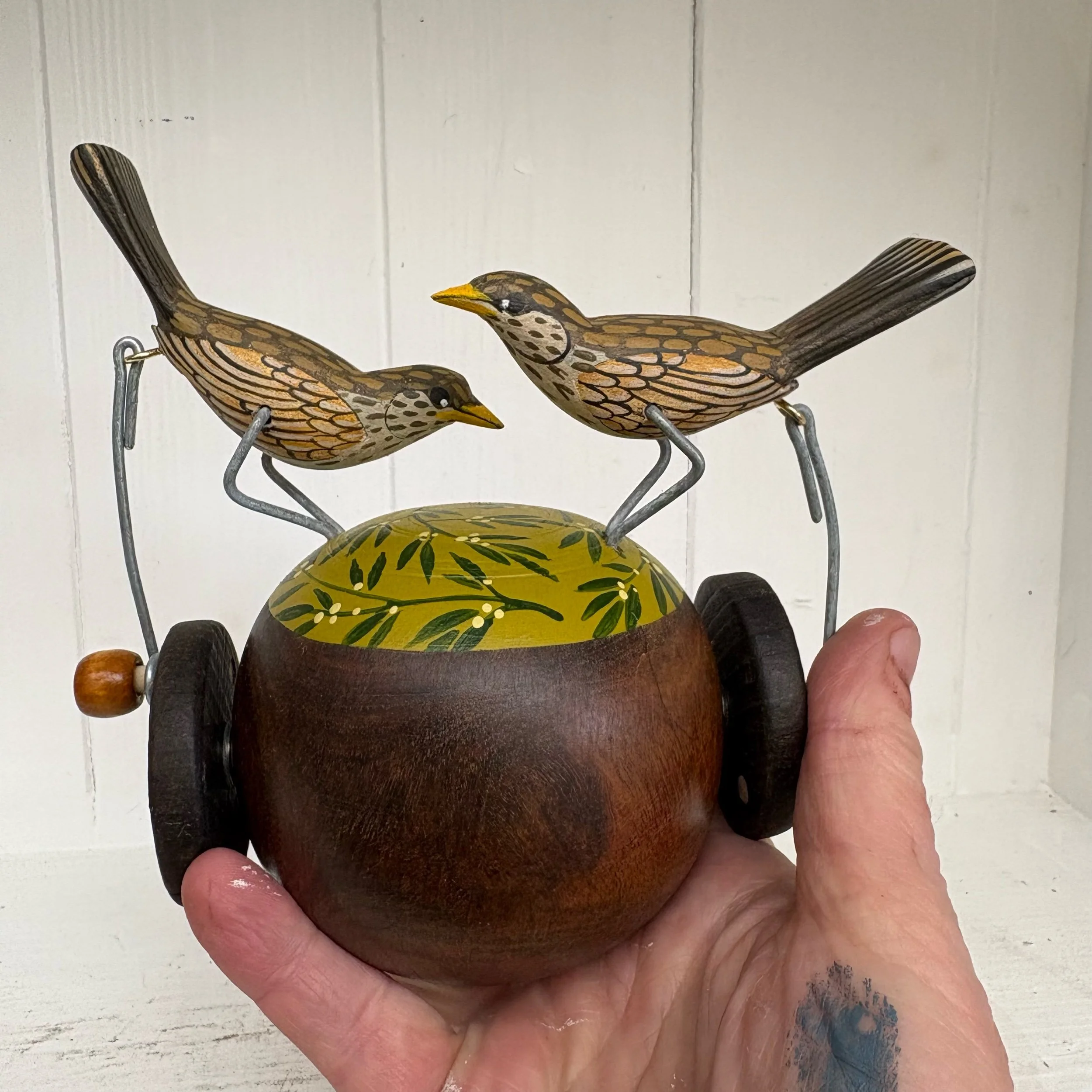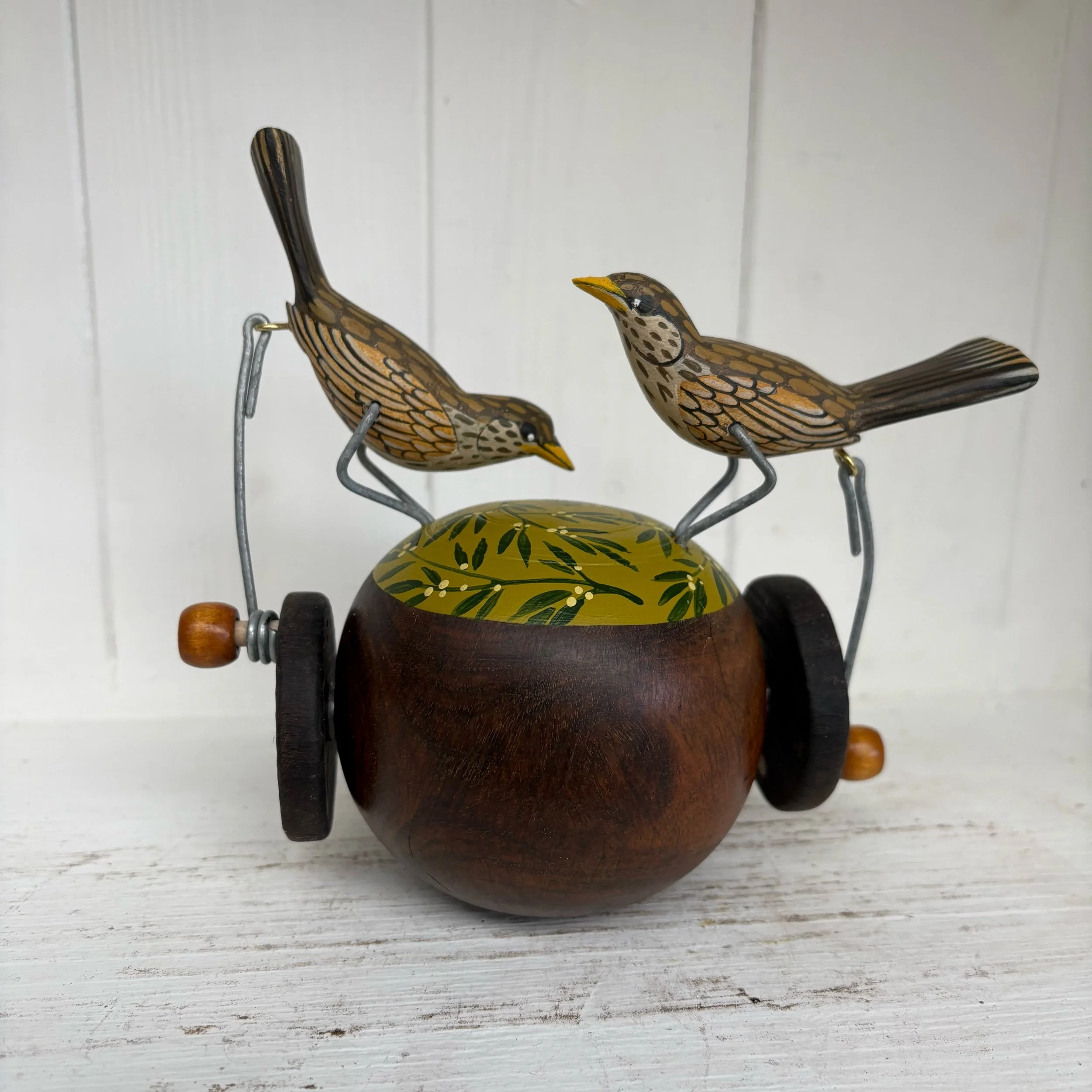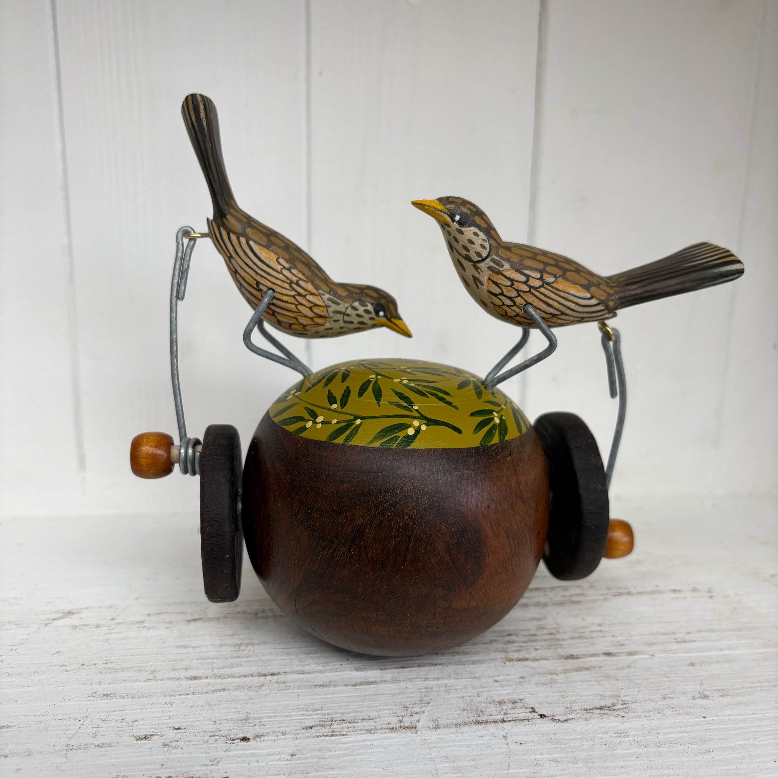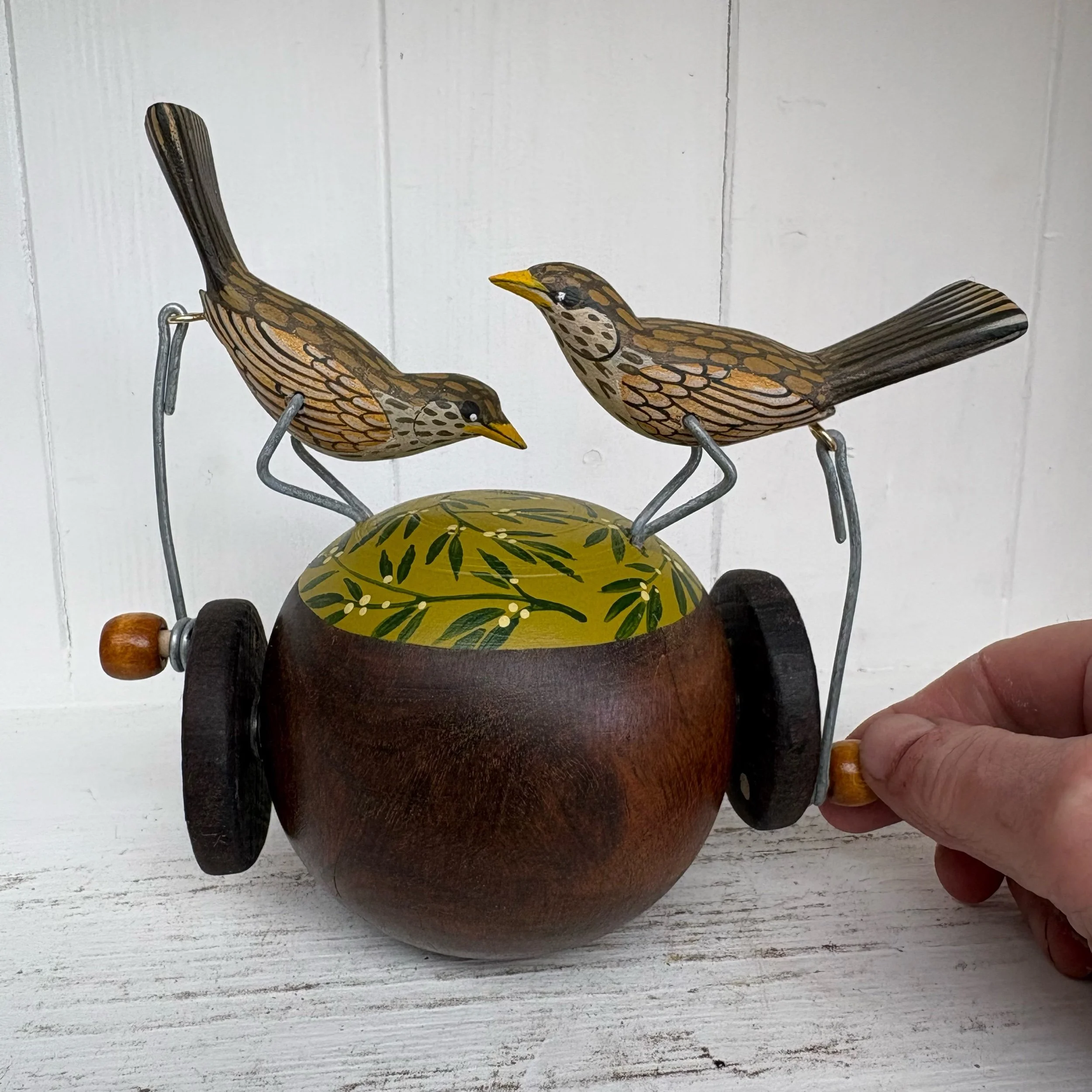 When the handle is turned the two painted wooden Thrushes on the small vintage Jack Bowling Ball make s pecking movement. Hand made by Jane and Ralph in far West Cornwall. 12cm x13cm