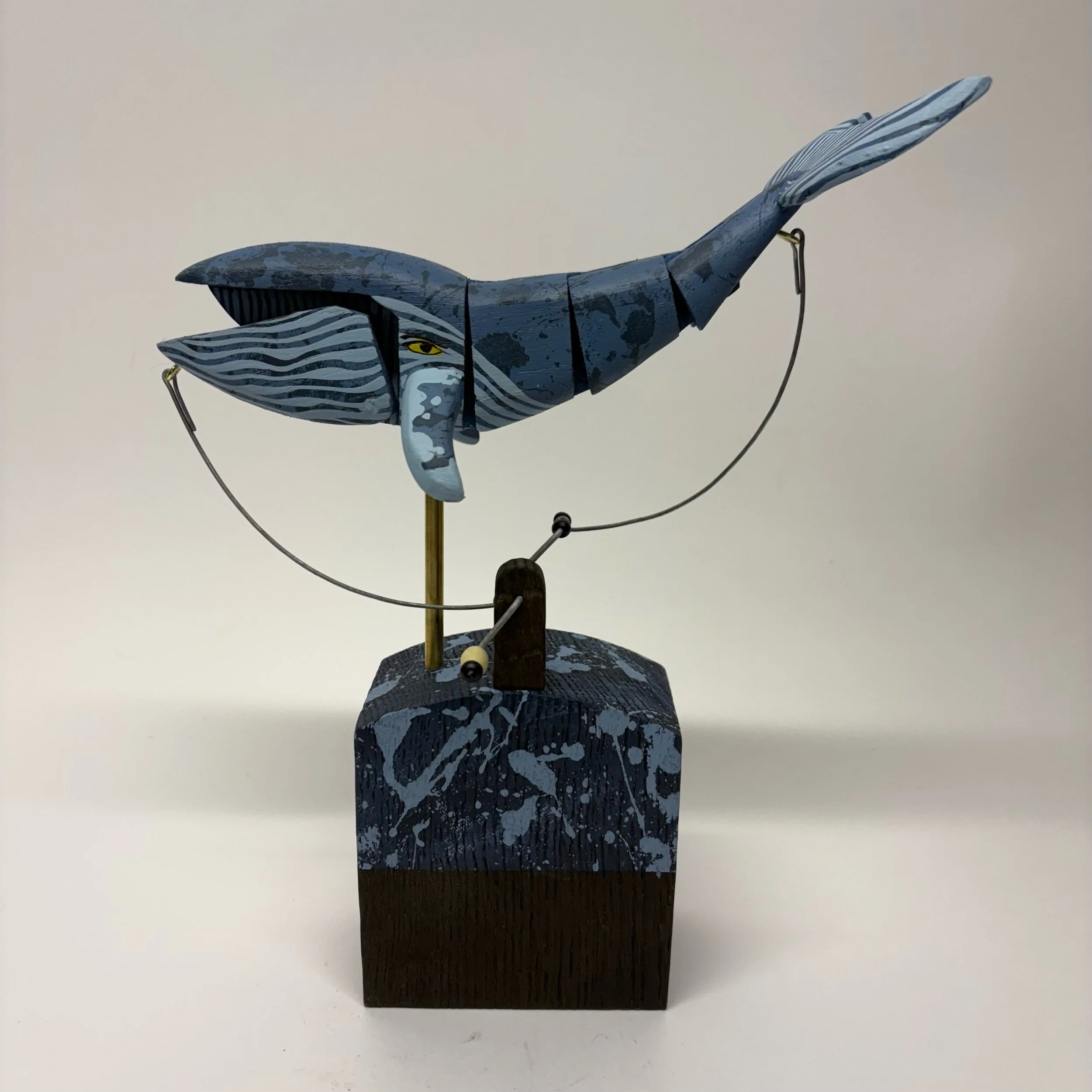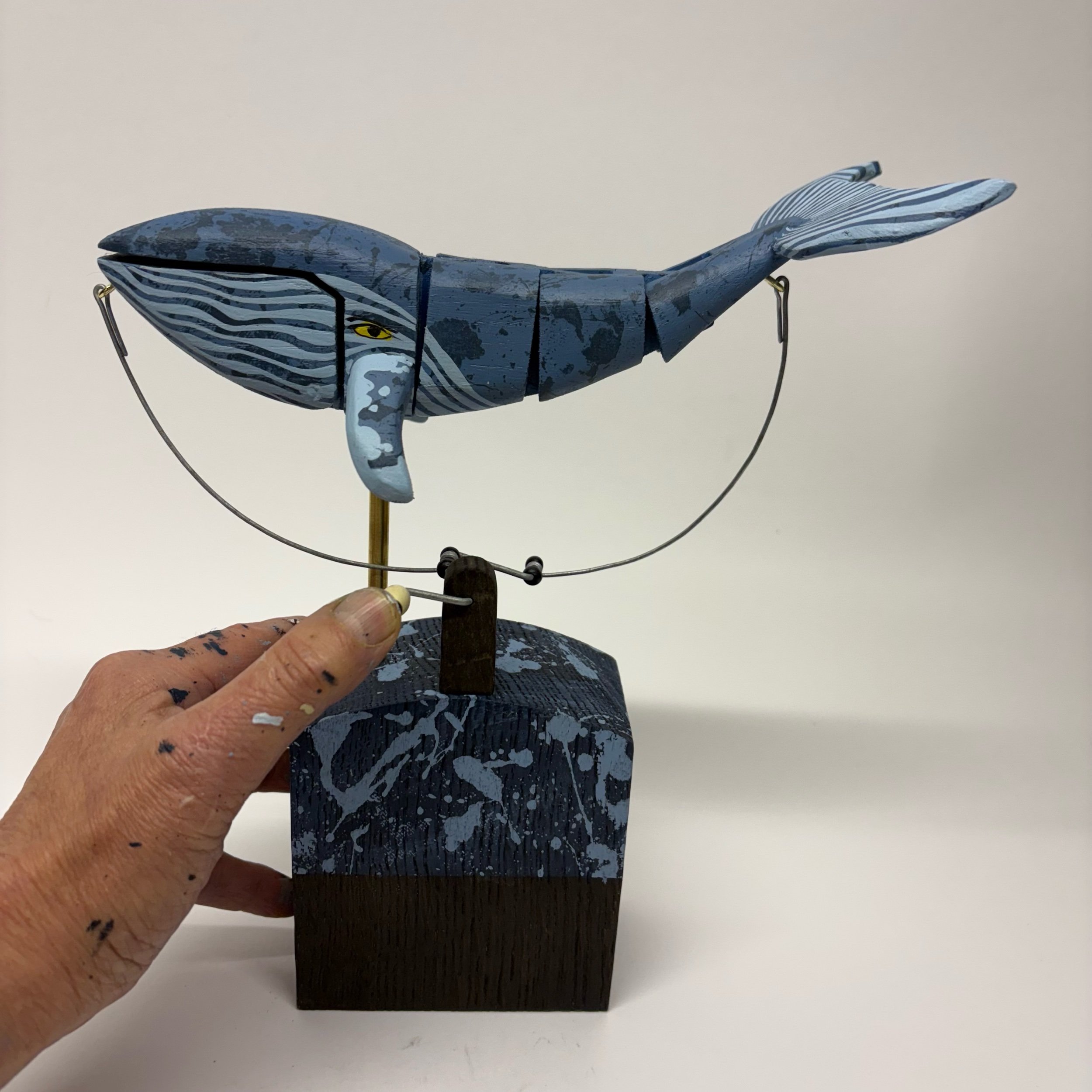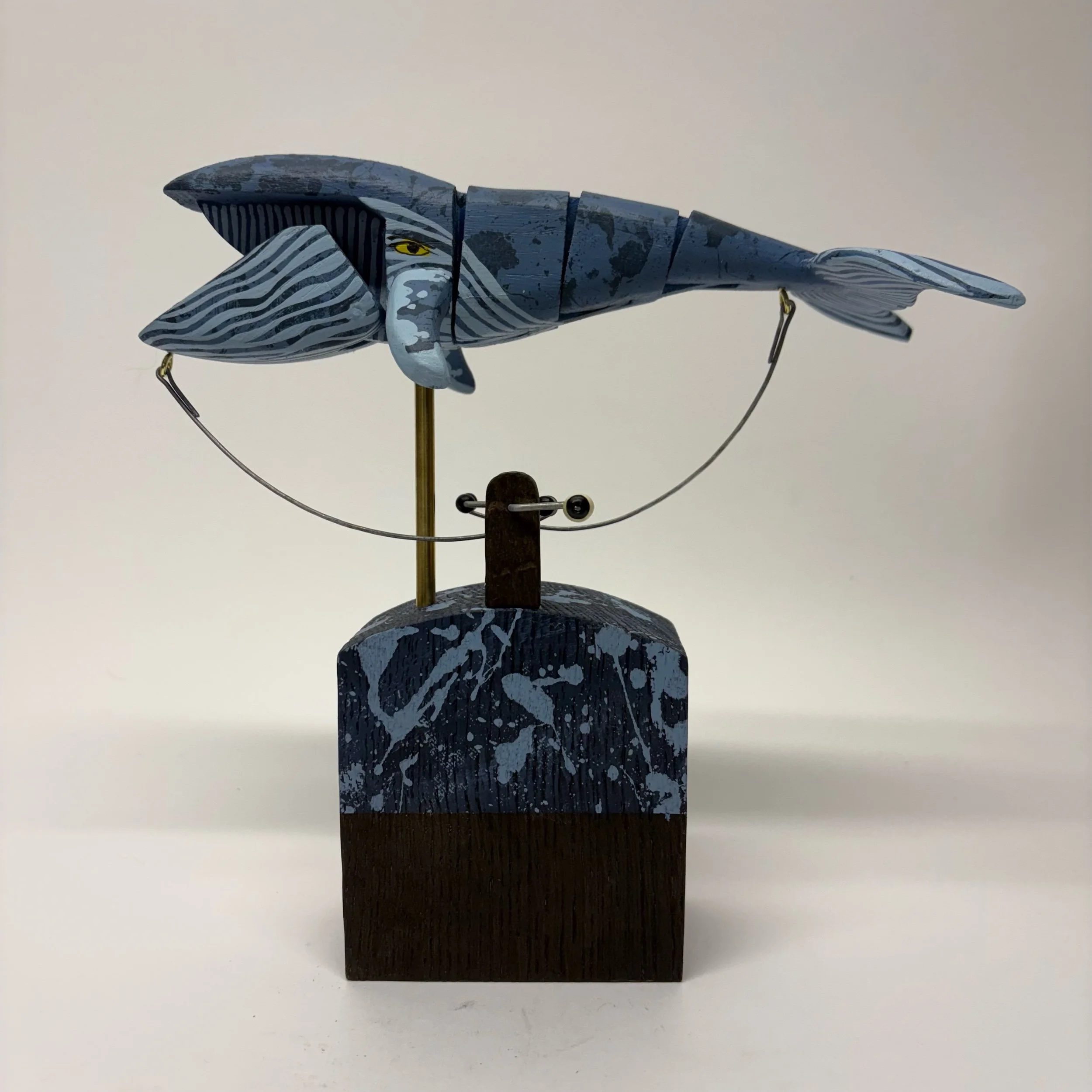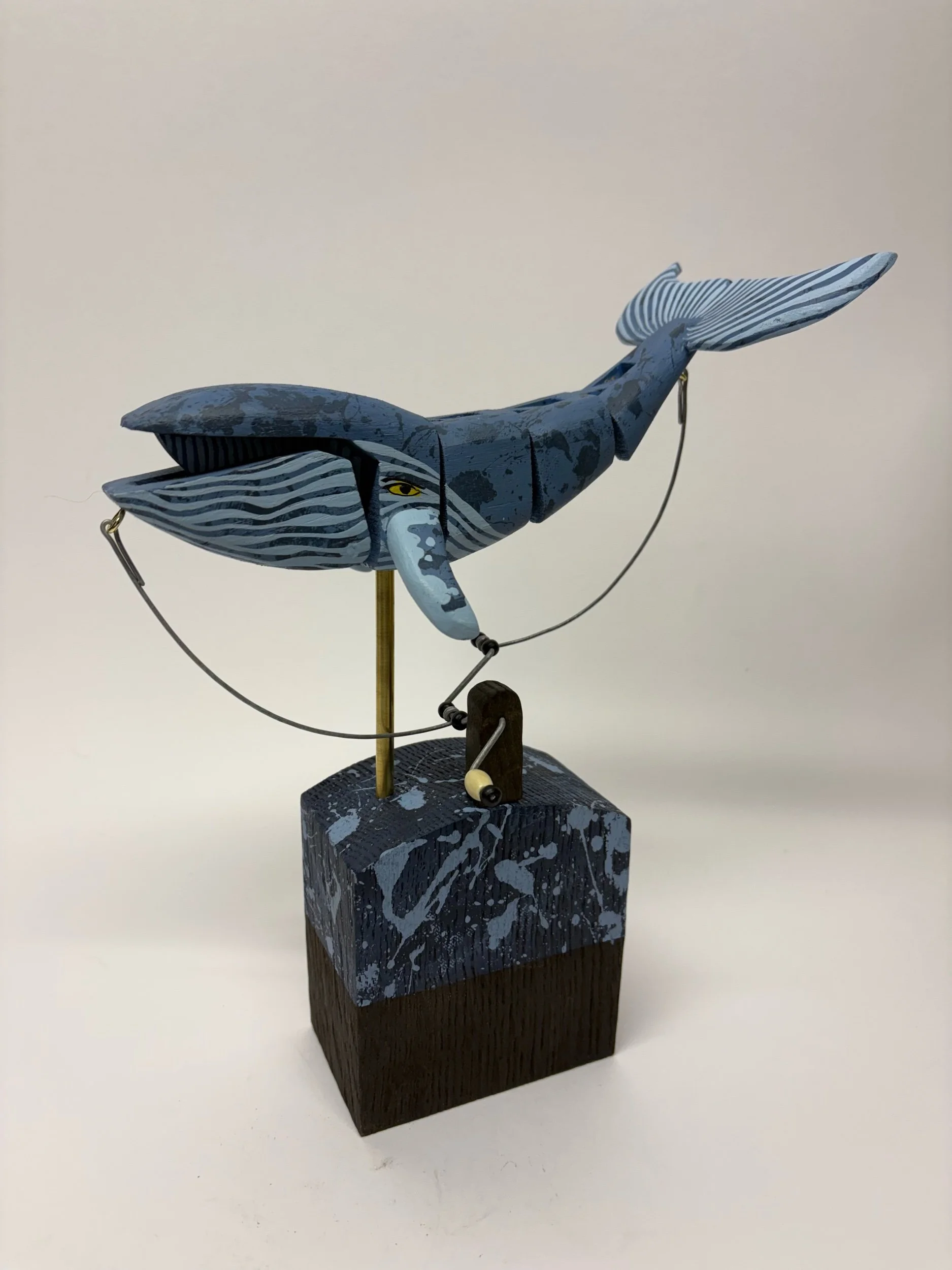 When the handle is turned the whale makes a swimming movement flipping its tail and opening its mouth. Hsnd made in oak by Jane and Ralph in far west Cornwall. 24cm x 26cm