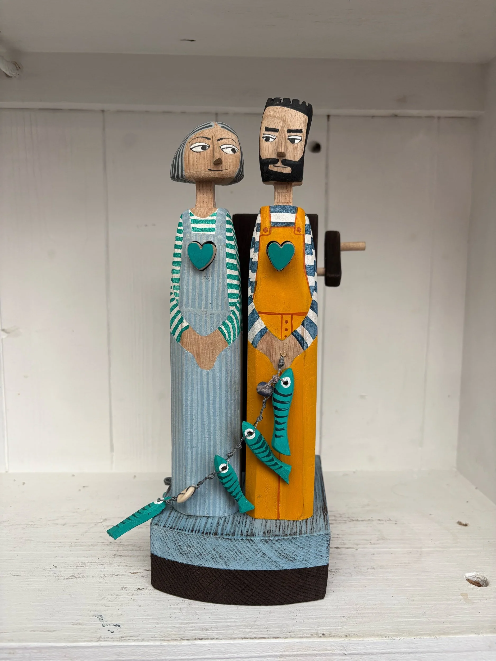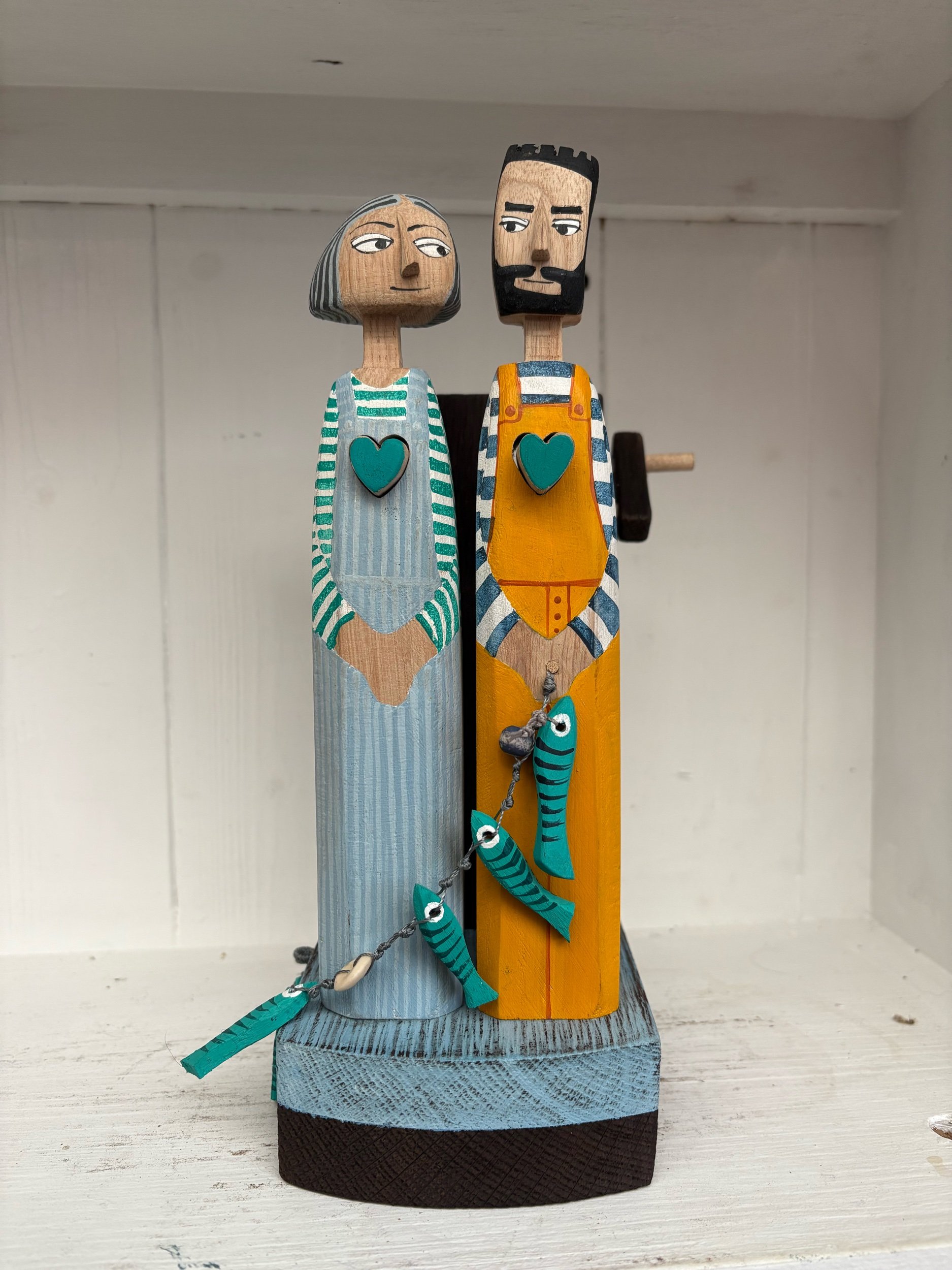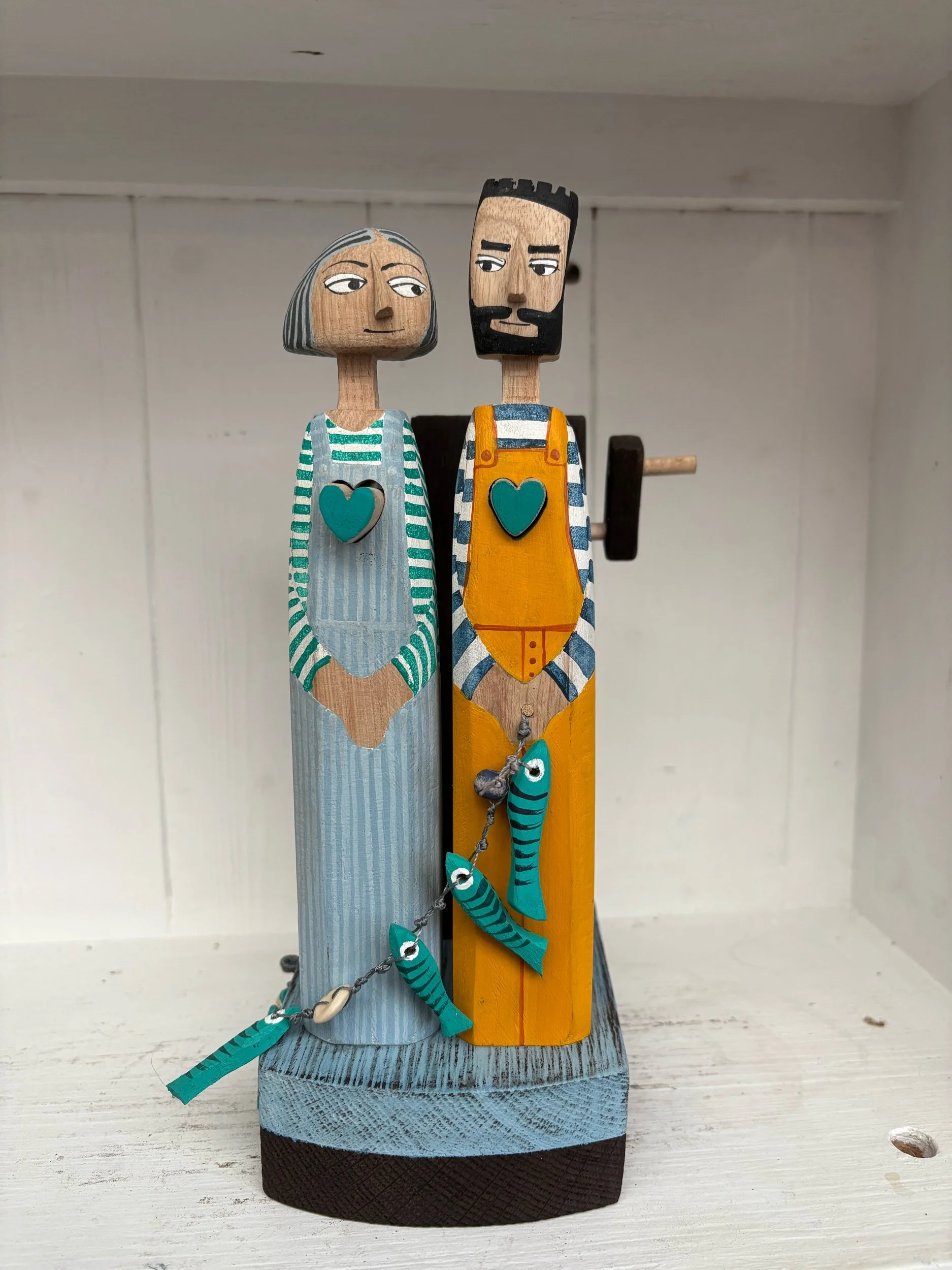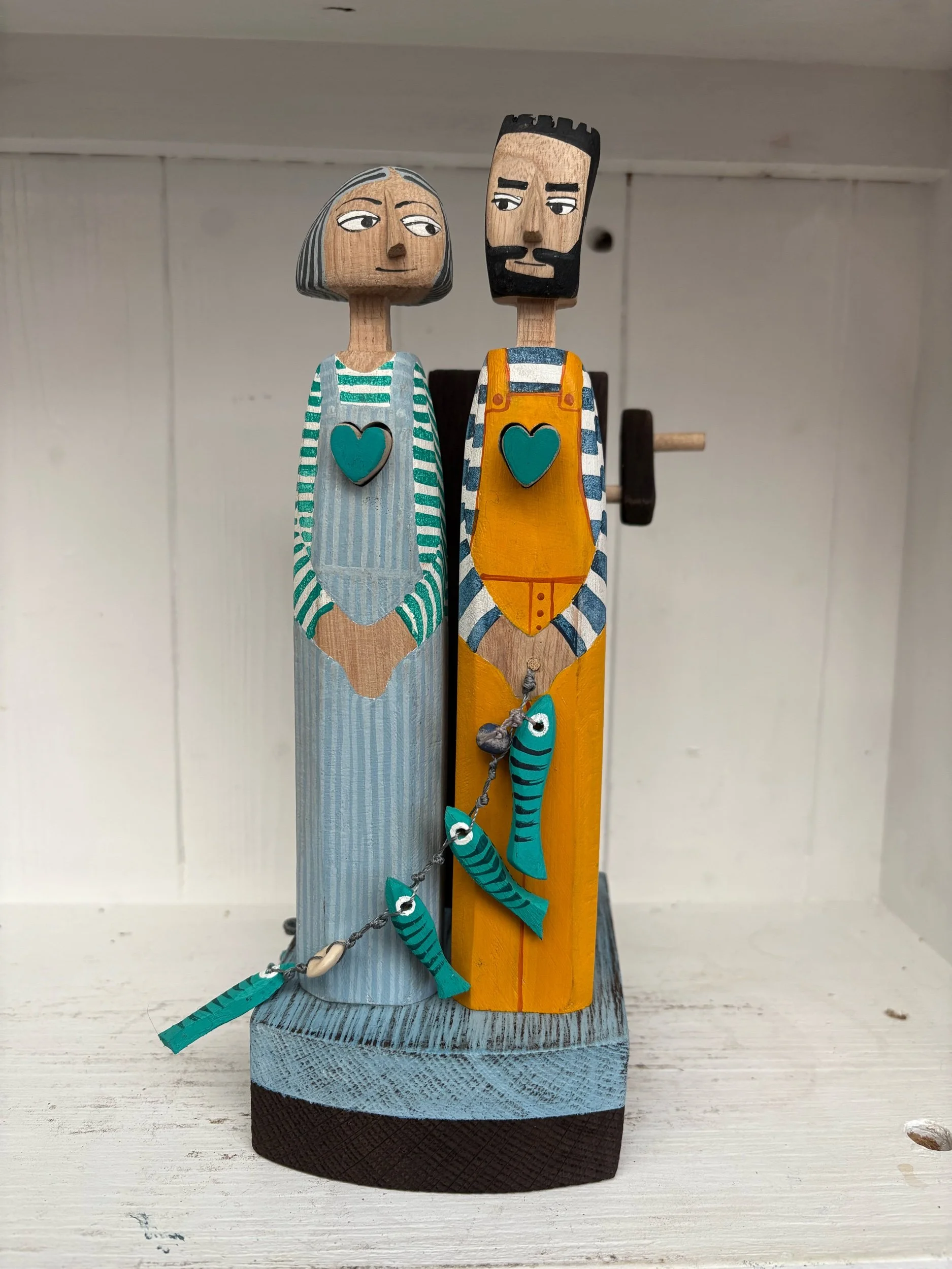 When the handle is turned the hearts in the carved and painted figures beat in and. Out. Hand made in oak by Jane and Ralph in far West Cornwall. 26cm tall