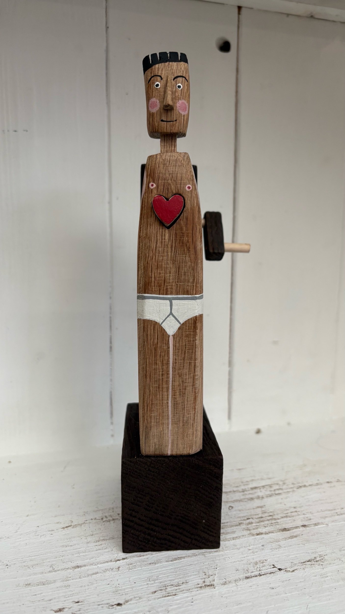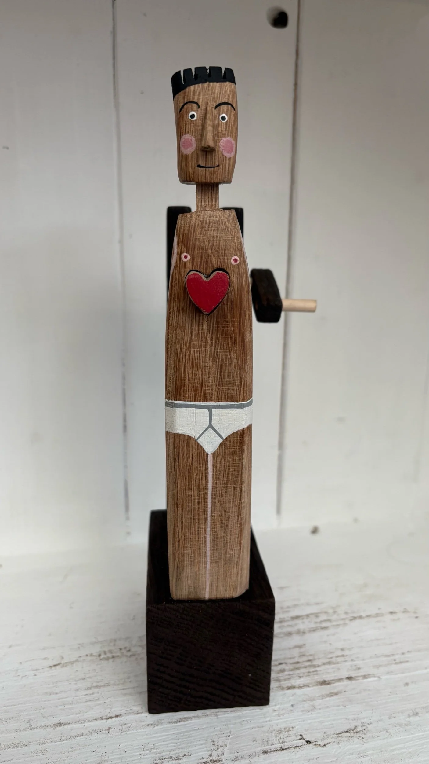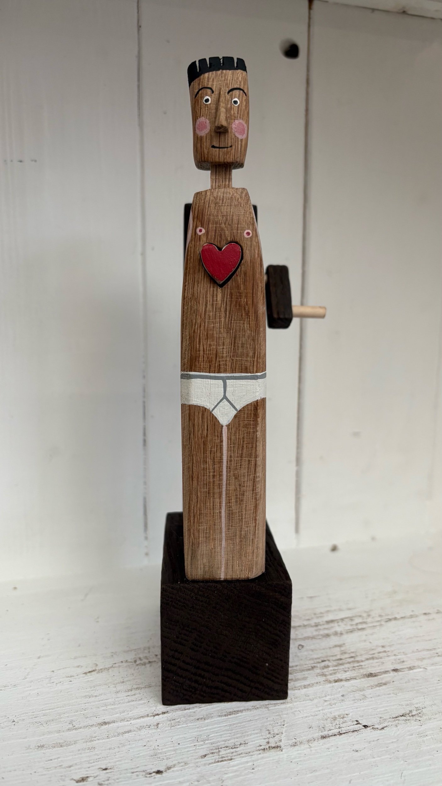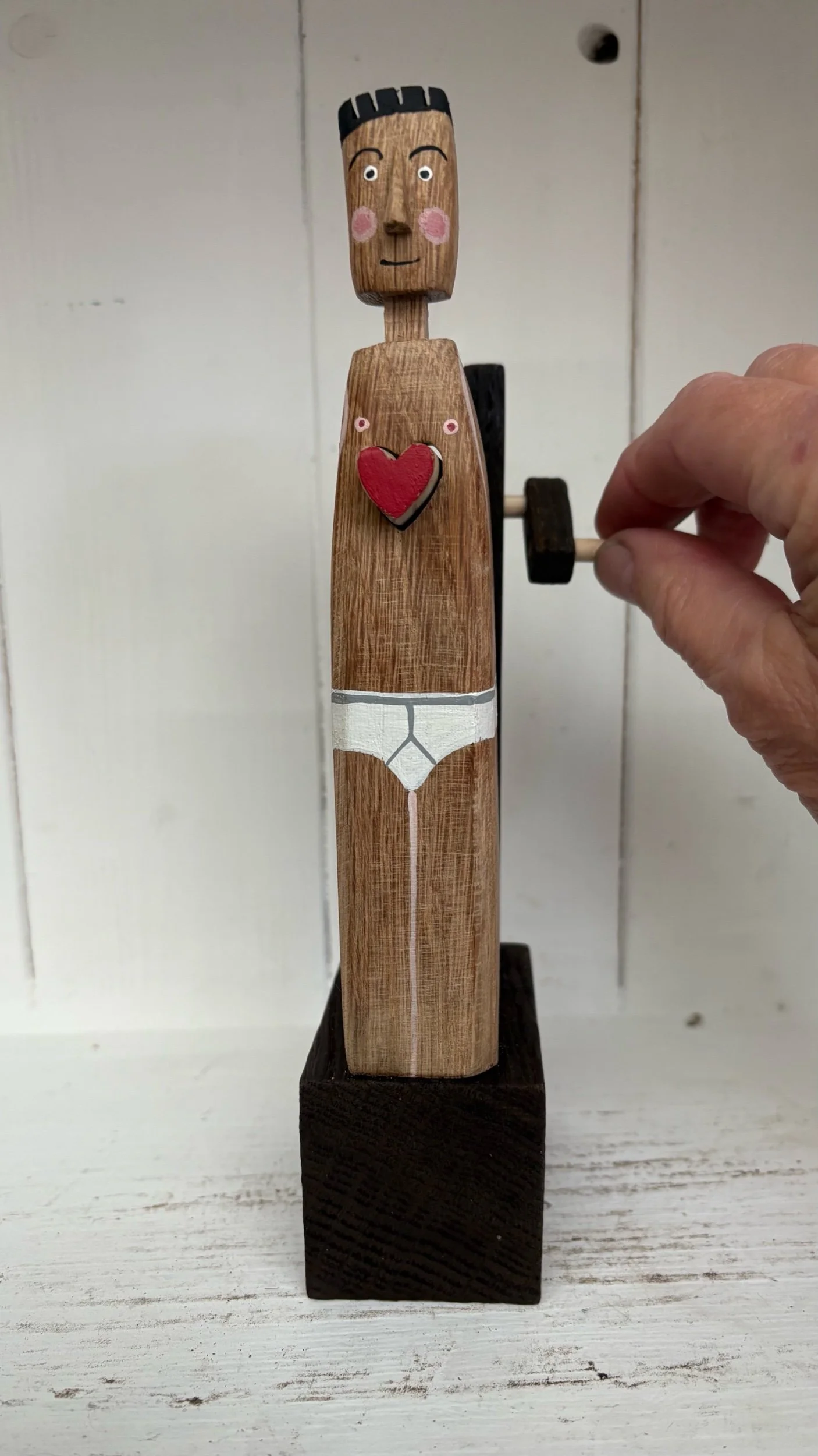 When the gandle is turned tge heart in tge carved and painted figure beats in and out. Hand mDe in oak by Jane and Ralph. 22cm tall