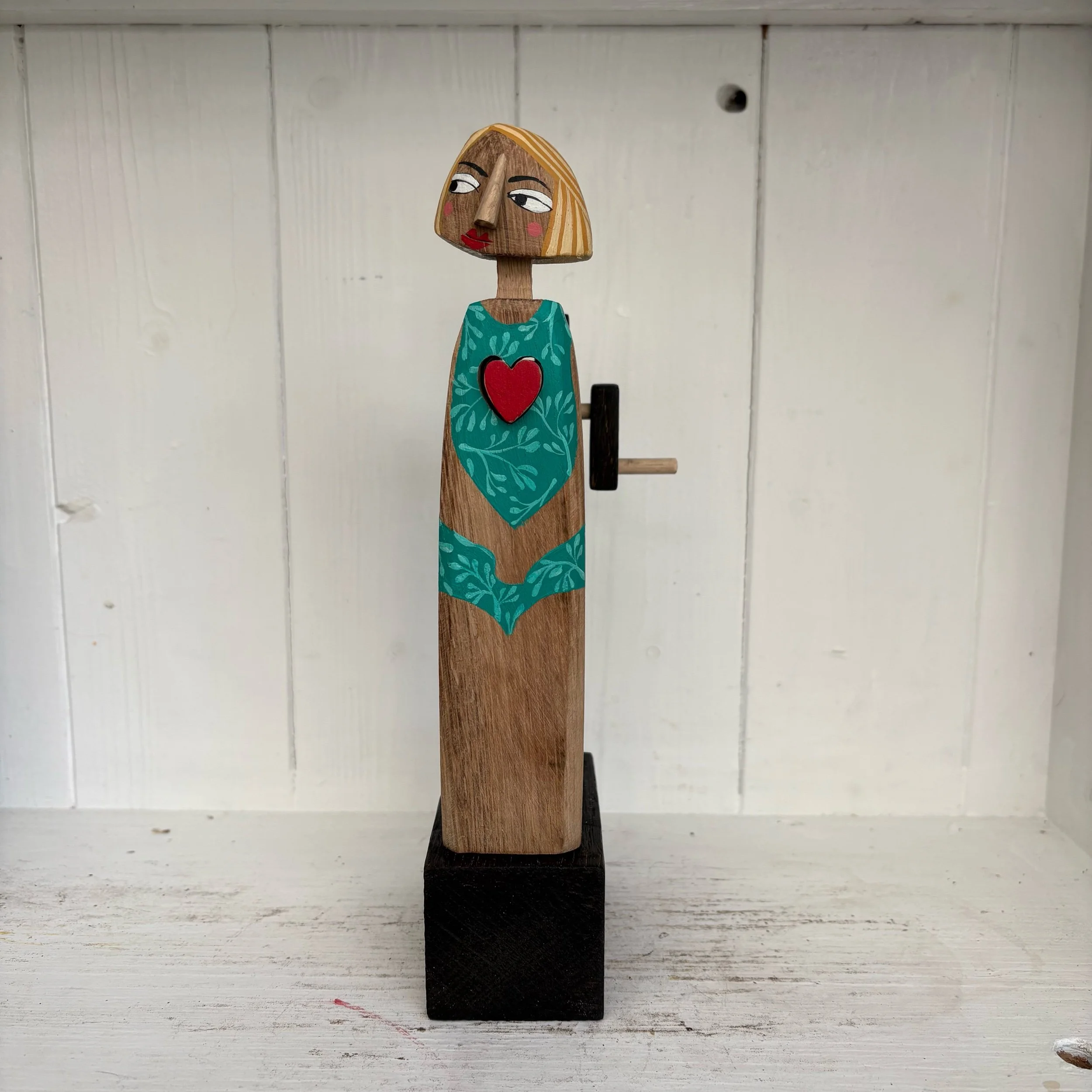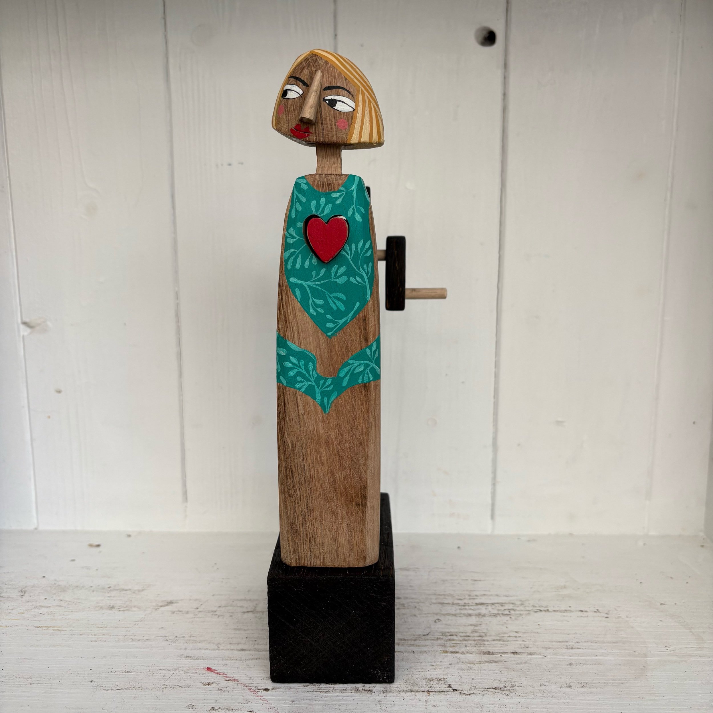 When the handle is turned the heart in the painted wooden figure beats in and out. Hand made in oak by Jane and Ralph in far West Cornwall. 24cm tall