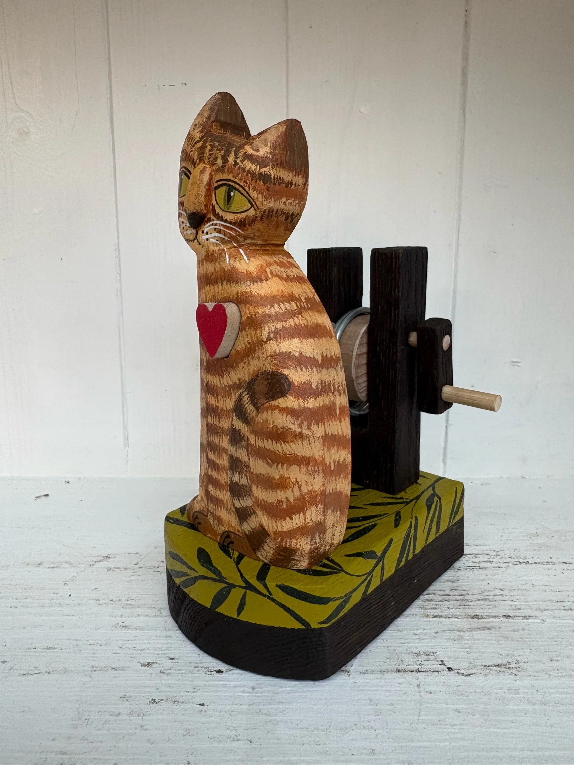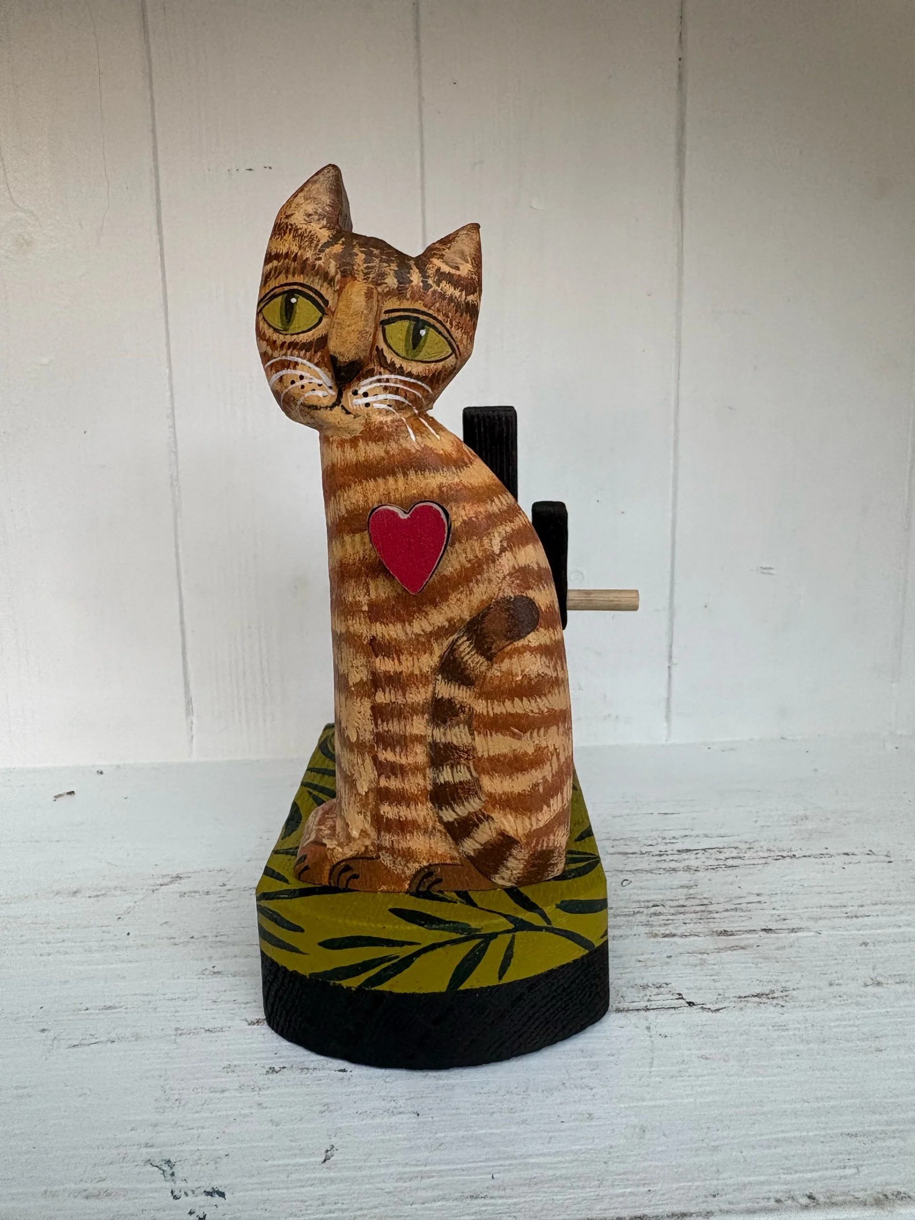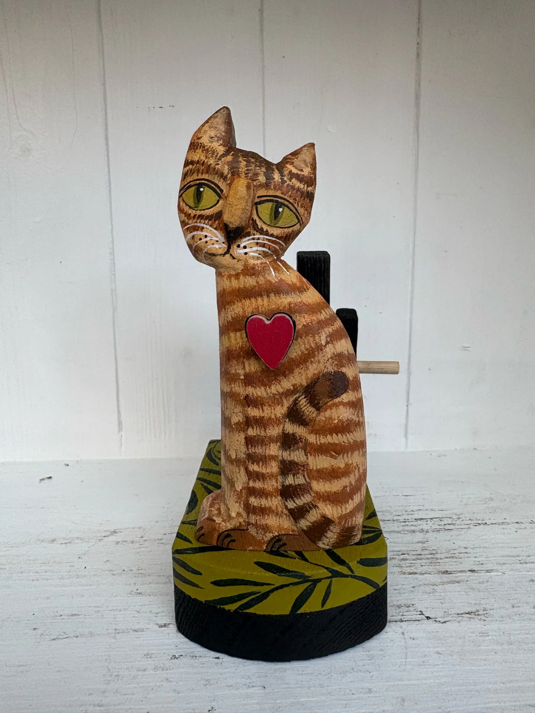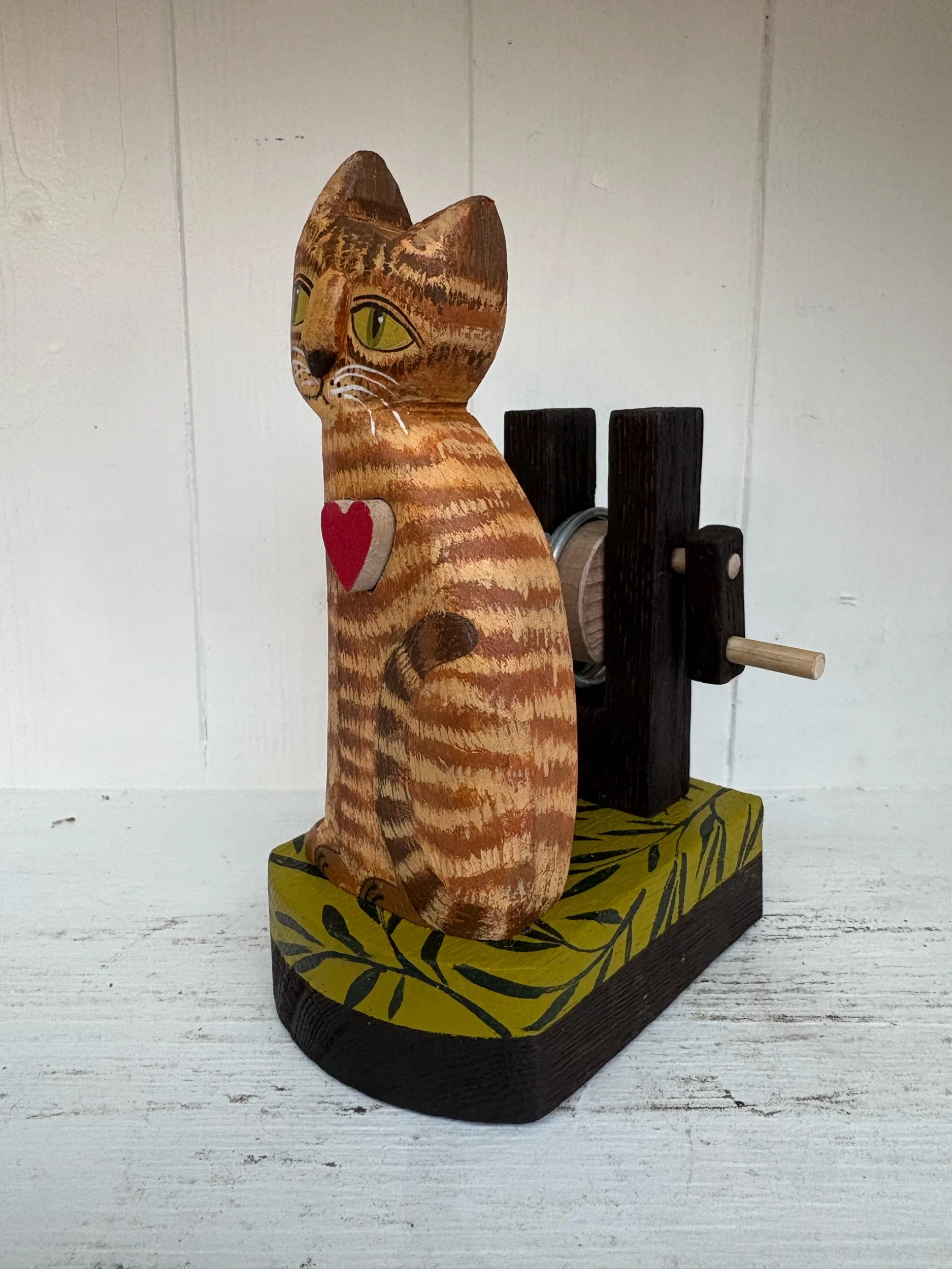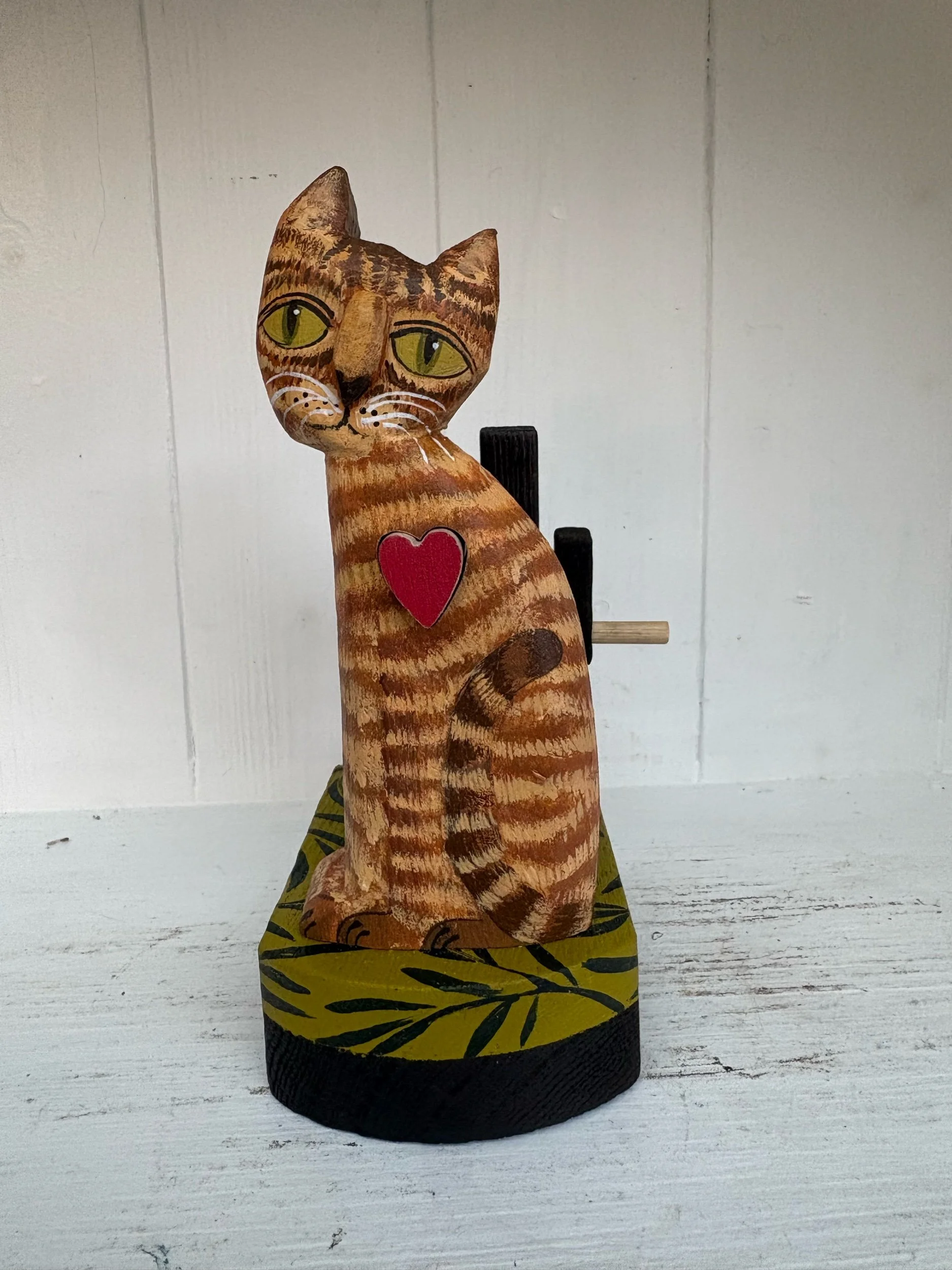 When the handle is turned the heart in the painted wooden cat beats in and out. Hand made in oak by Jane and Ralph in far West Cornwall. 18cm x 18cm
