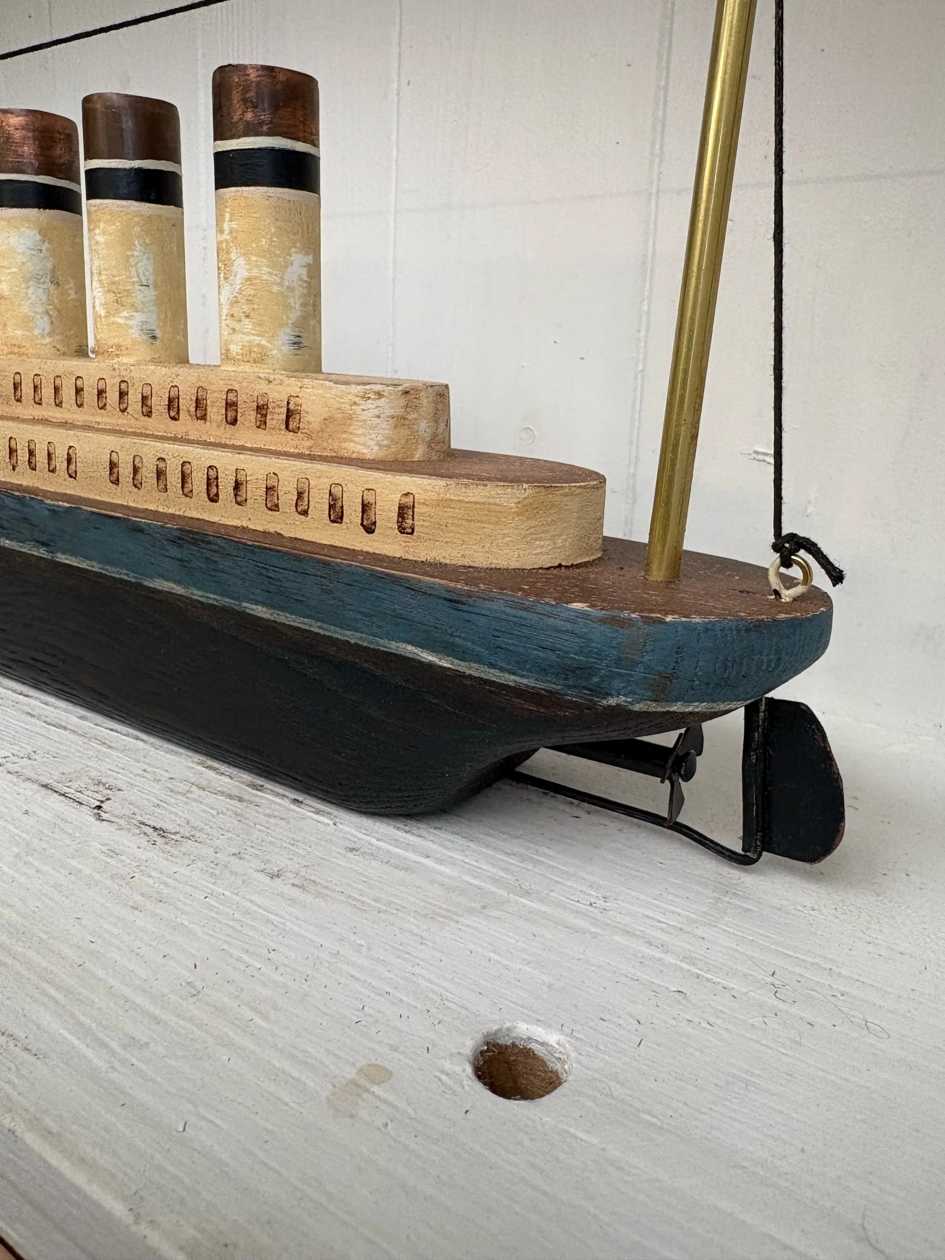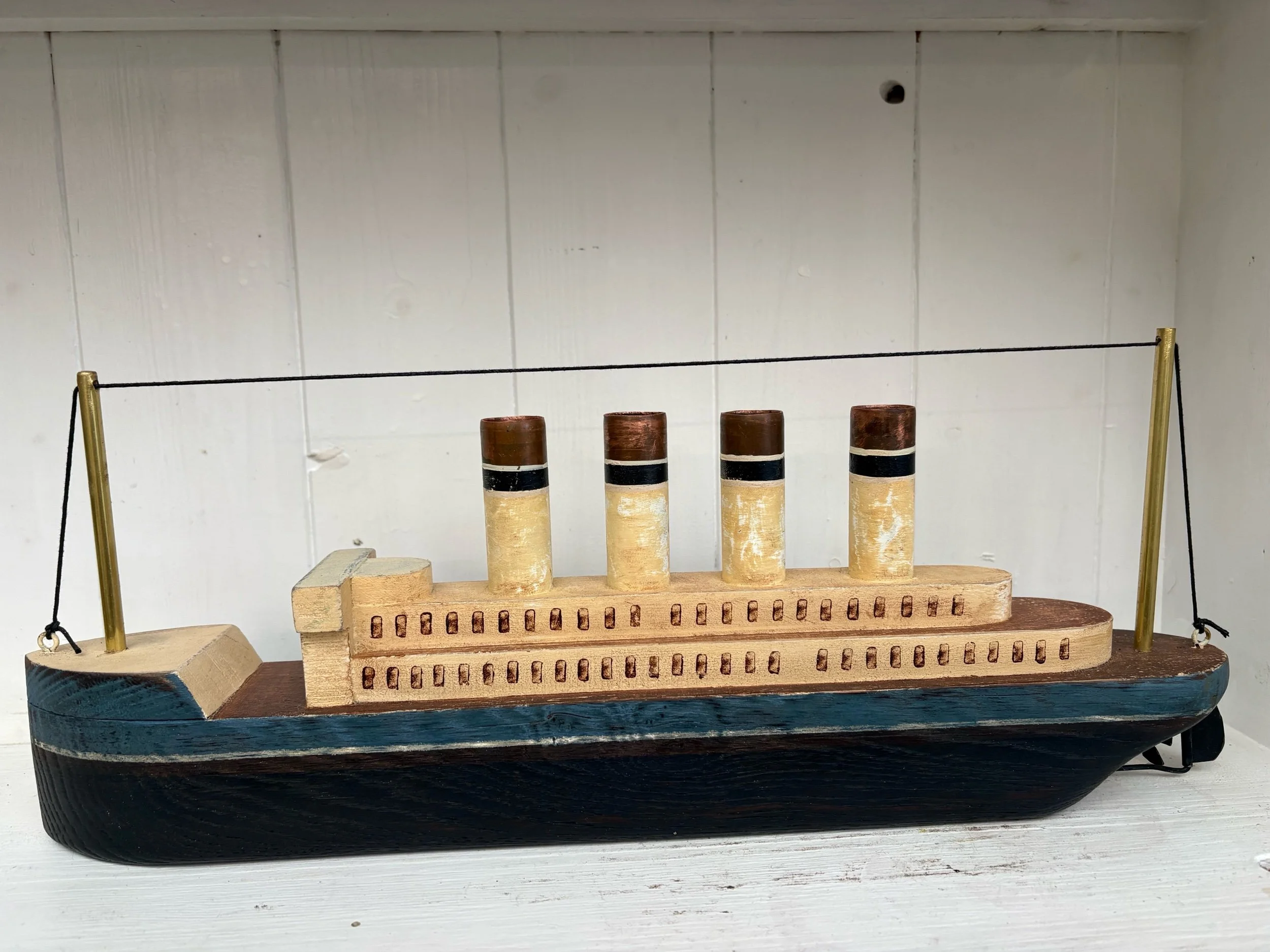 This naive liner is hand made by Ralph from oak with painted copper propeller and rudder. Lovely on a mantle or shelf. 42 cm long.