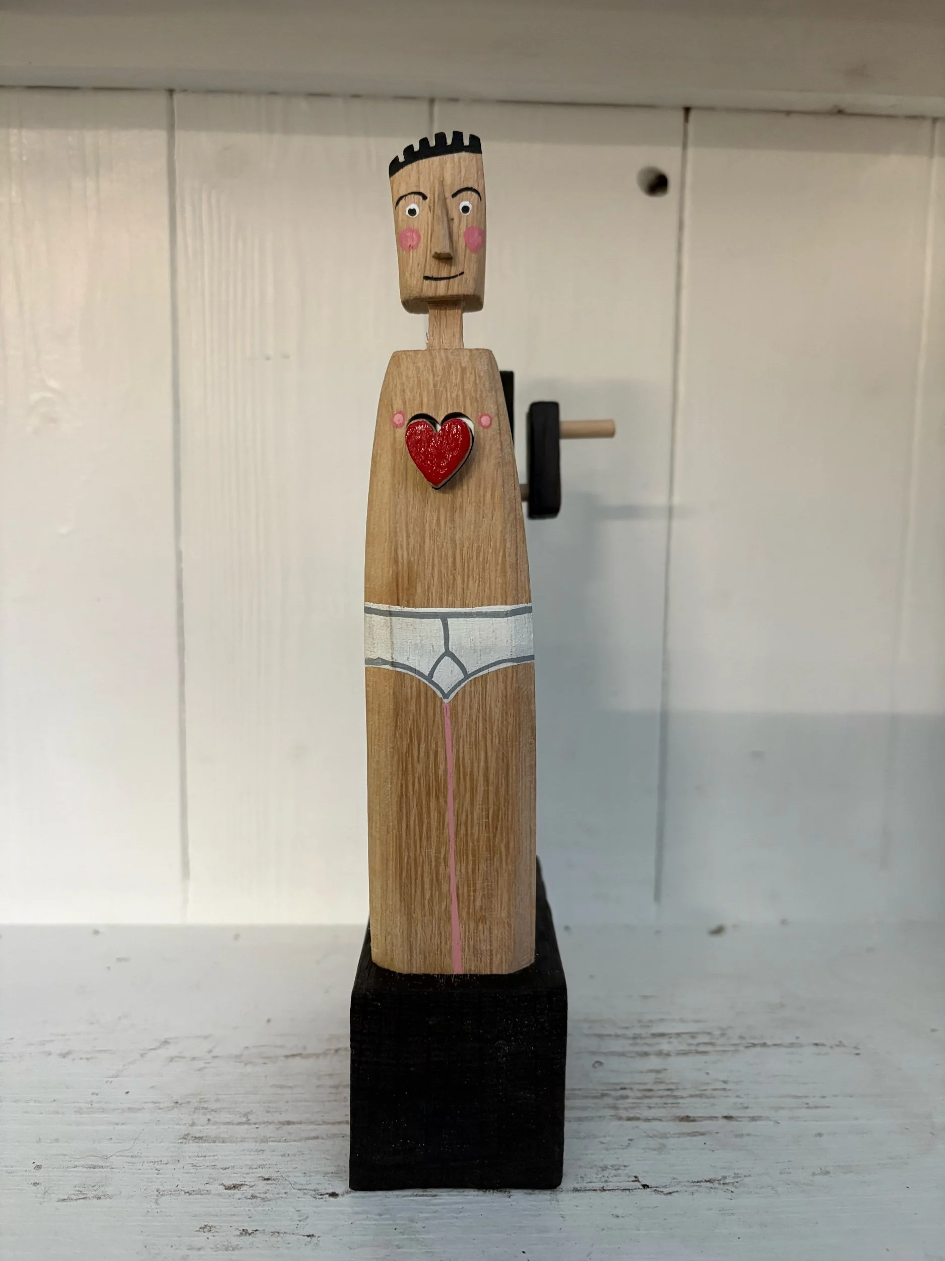 When the handle is turned gge heart innthd painted swimmer the wooden figure beats in and out. Hand made in oak by Jane and Ralph in far West Cornwall. 24cm tall