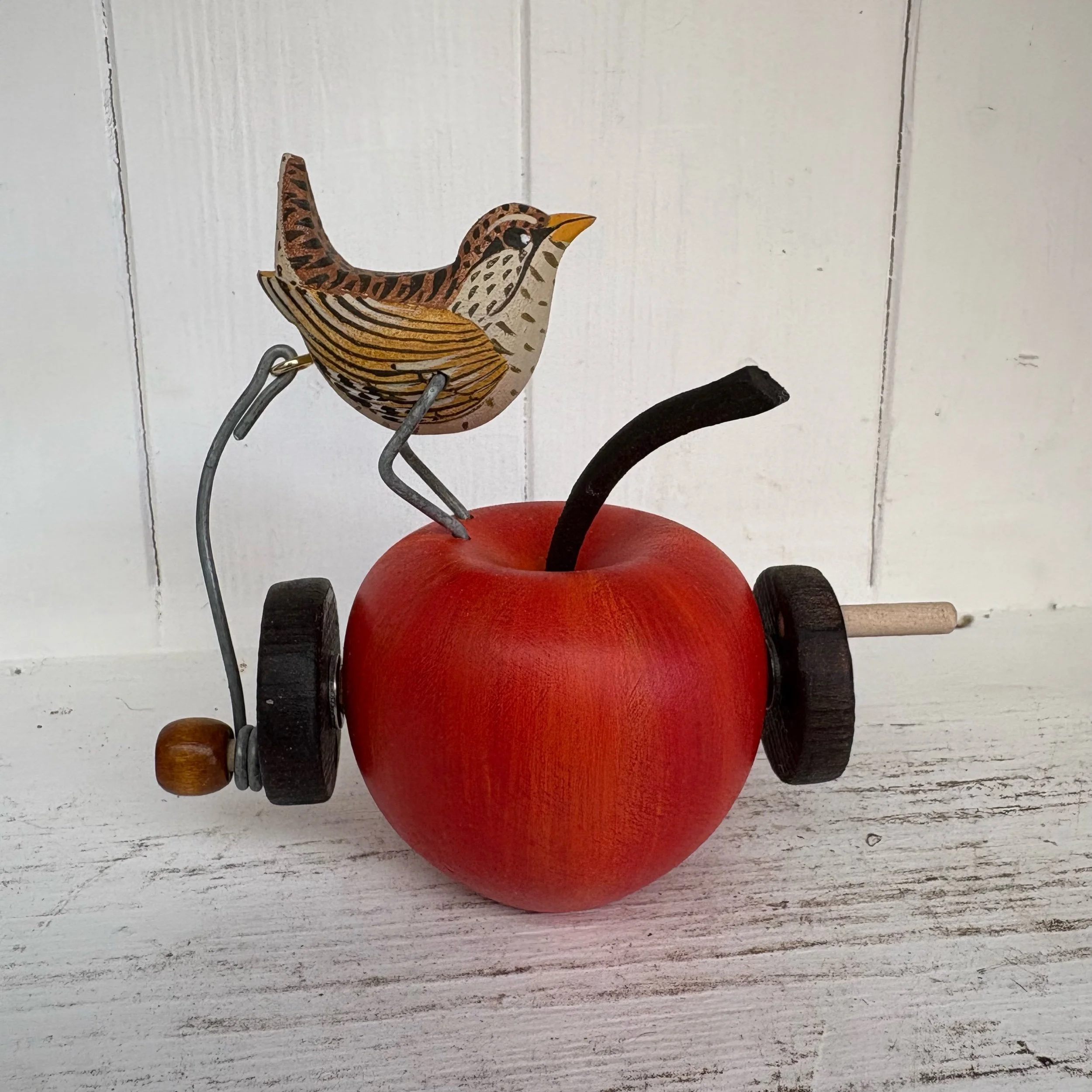 When the handle is turned tge tiny wooden Wren makes a pecking movement on the painted wooden apple. Hand made by Jane and Ralph in far West Cornwall. This is s small piece only 11cm tall.