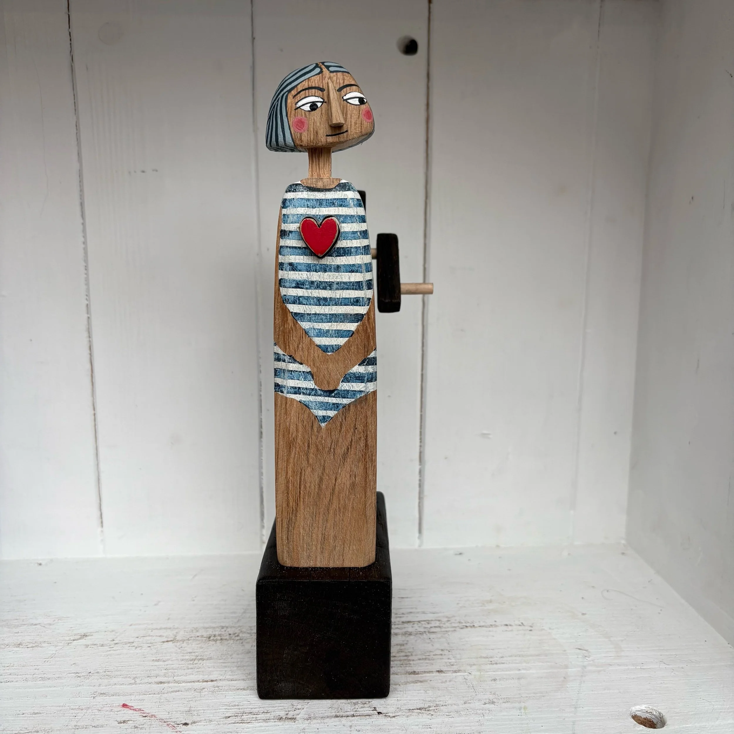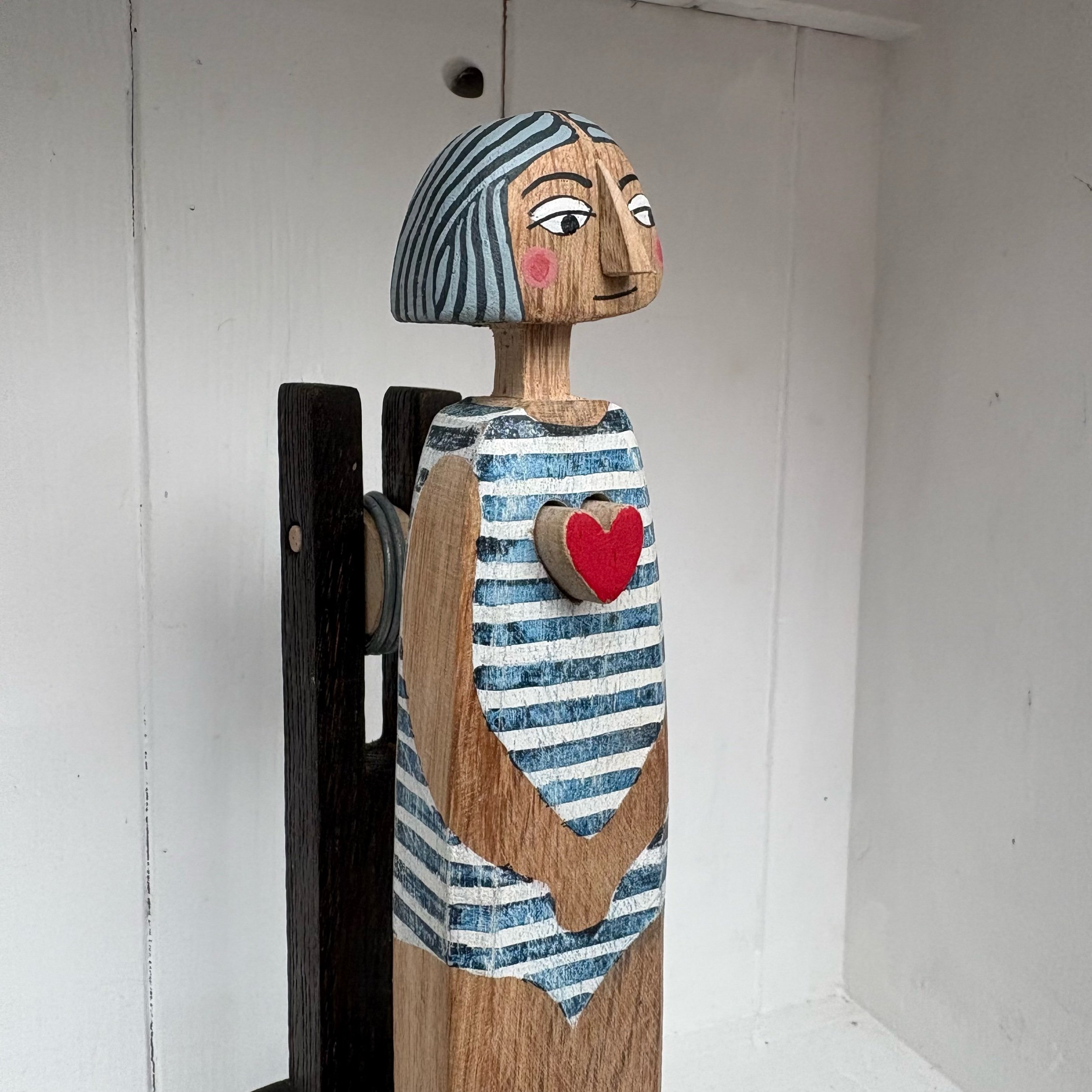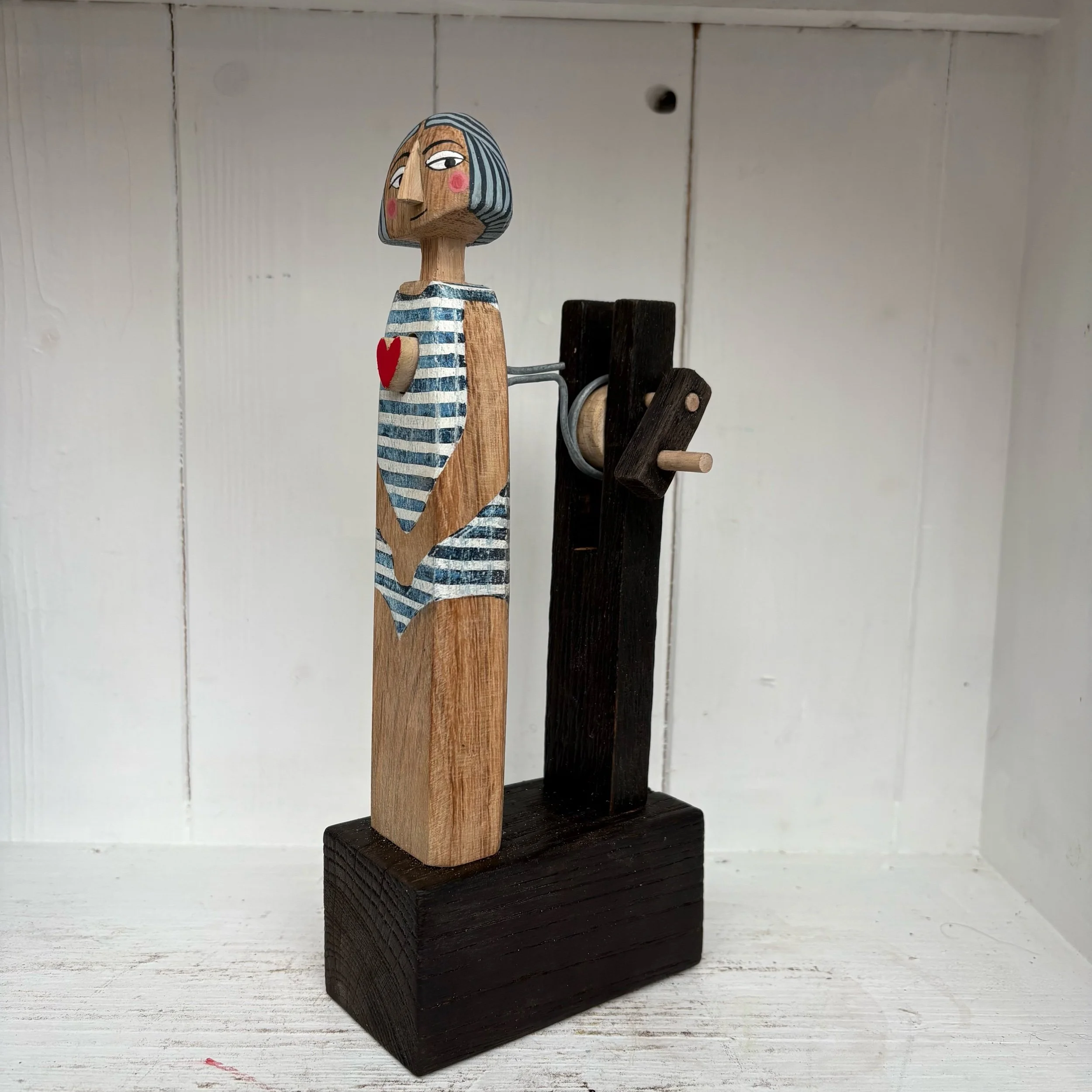 When the handle is turned the heart in the carved and painted figure beats in and out. Hand made in oak by Jane and Ralph in far West Cornwall. 23cm tall
