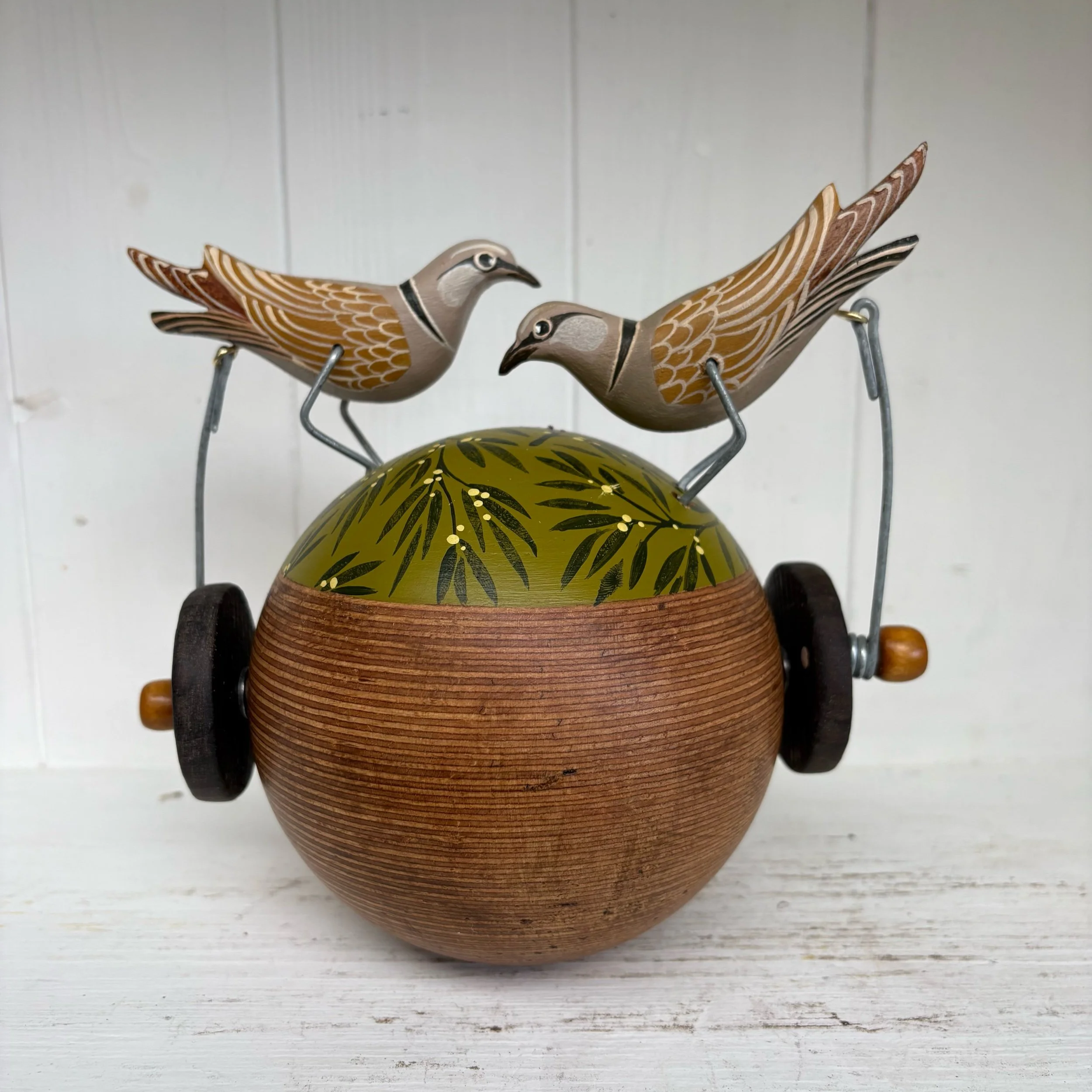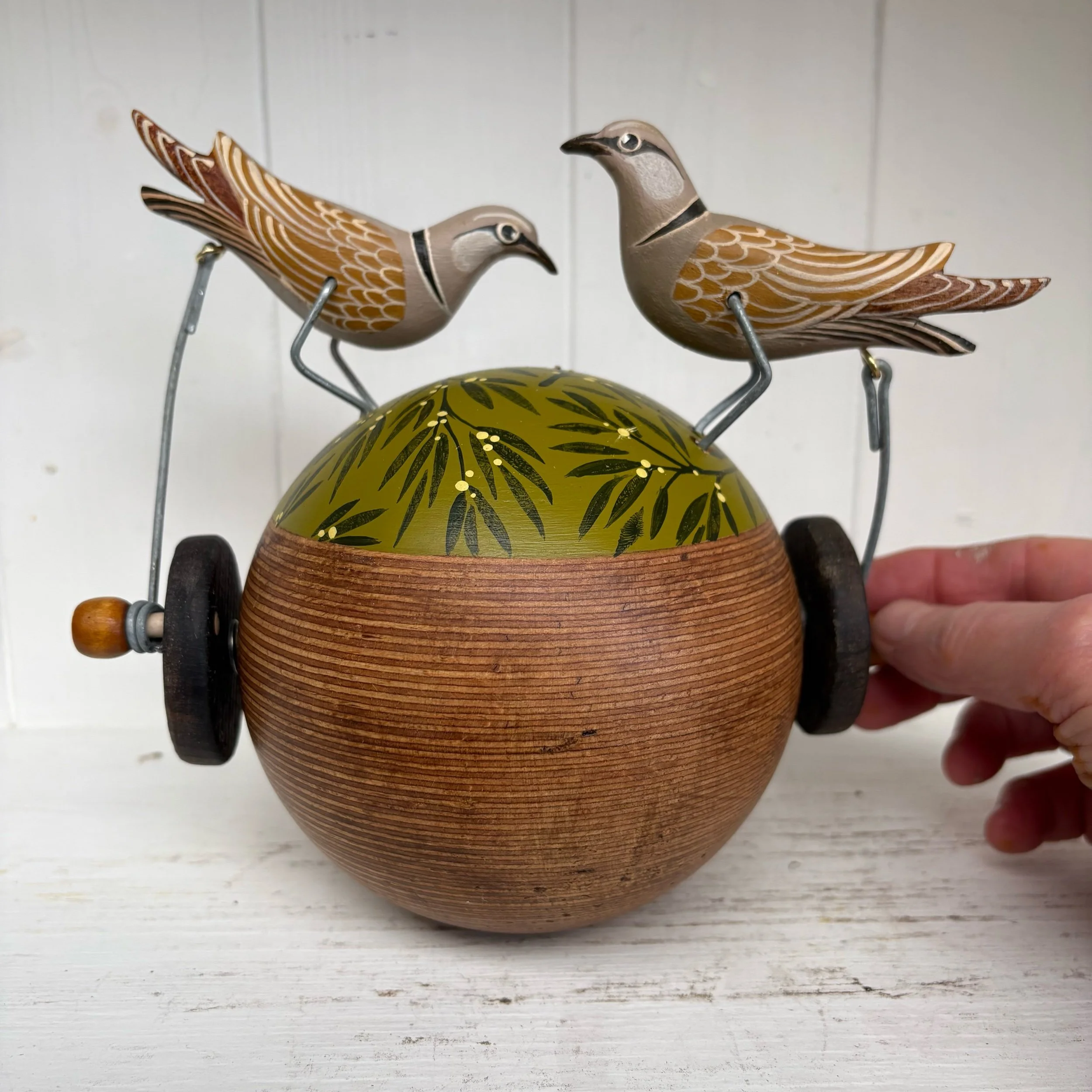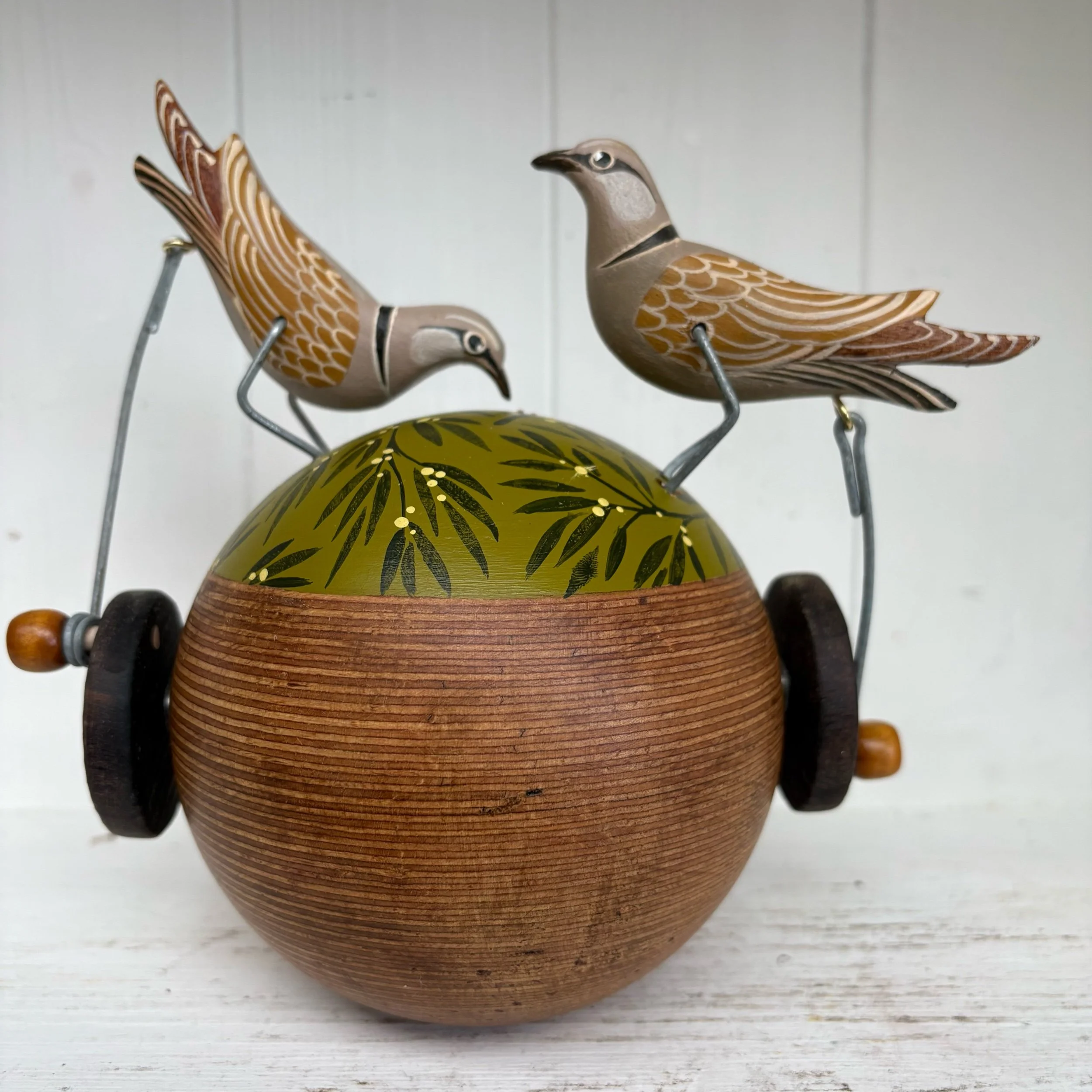 When the handle is turned the pair of painted wooden Doves make a pecking movement on the laminated wooden Ball. Made by hand by Jsne snd Ralph in far West Cornwall. 18cm x 18cm and heavy