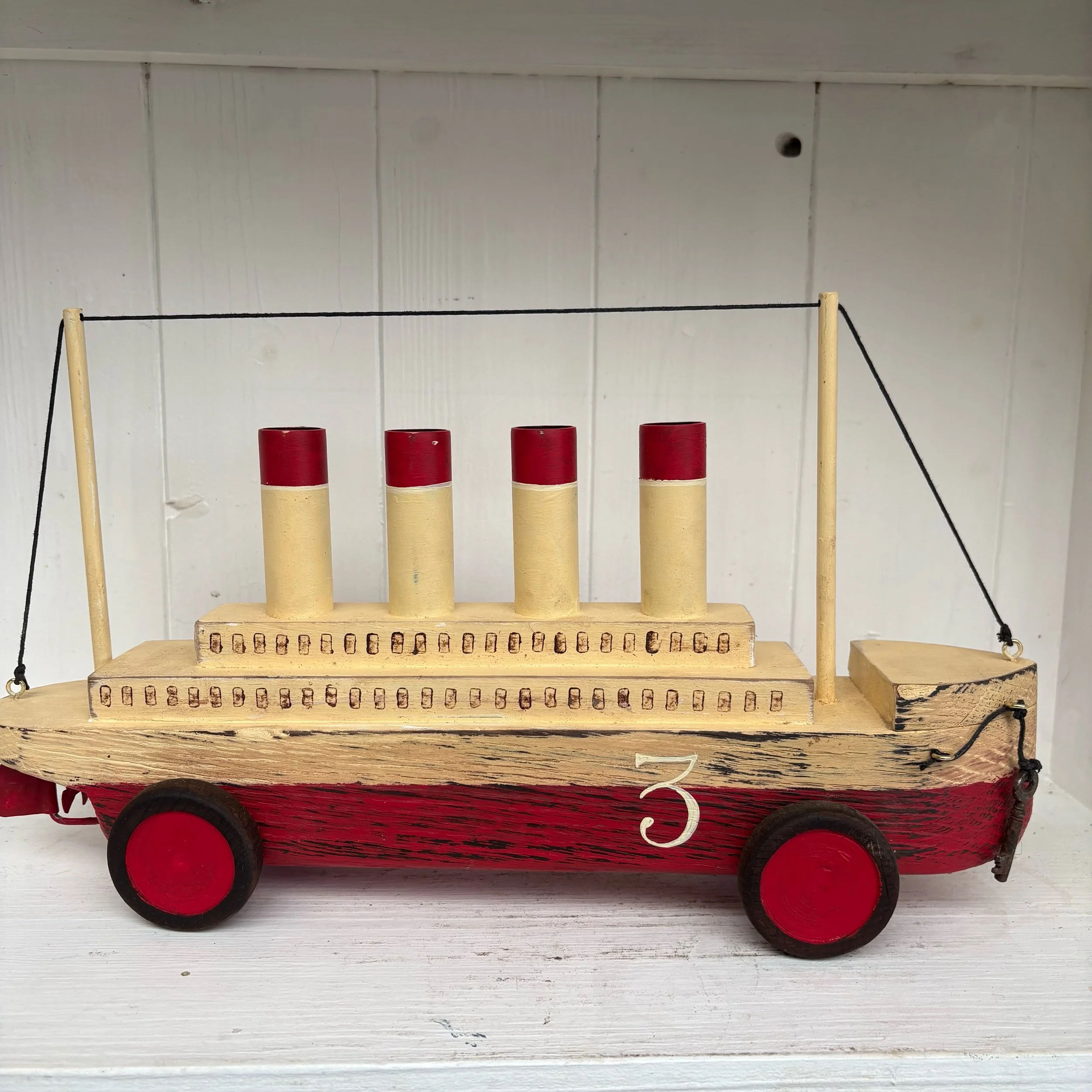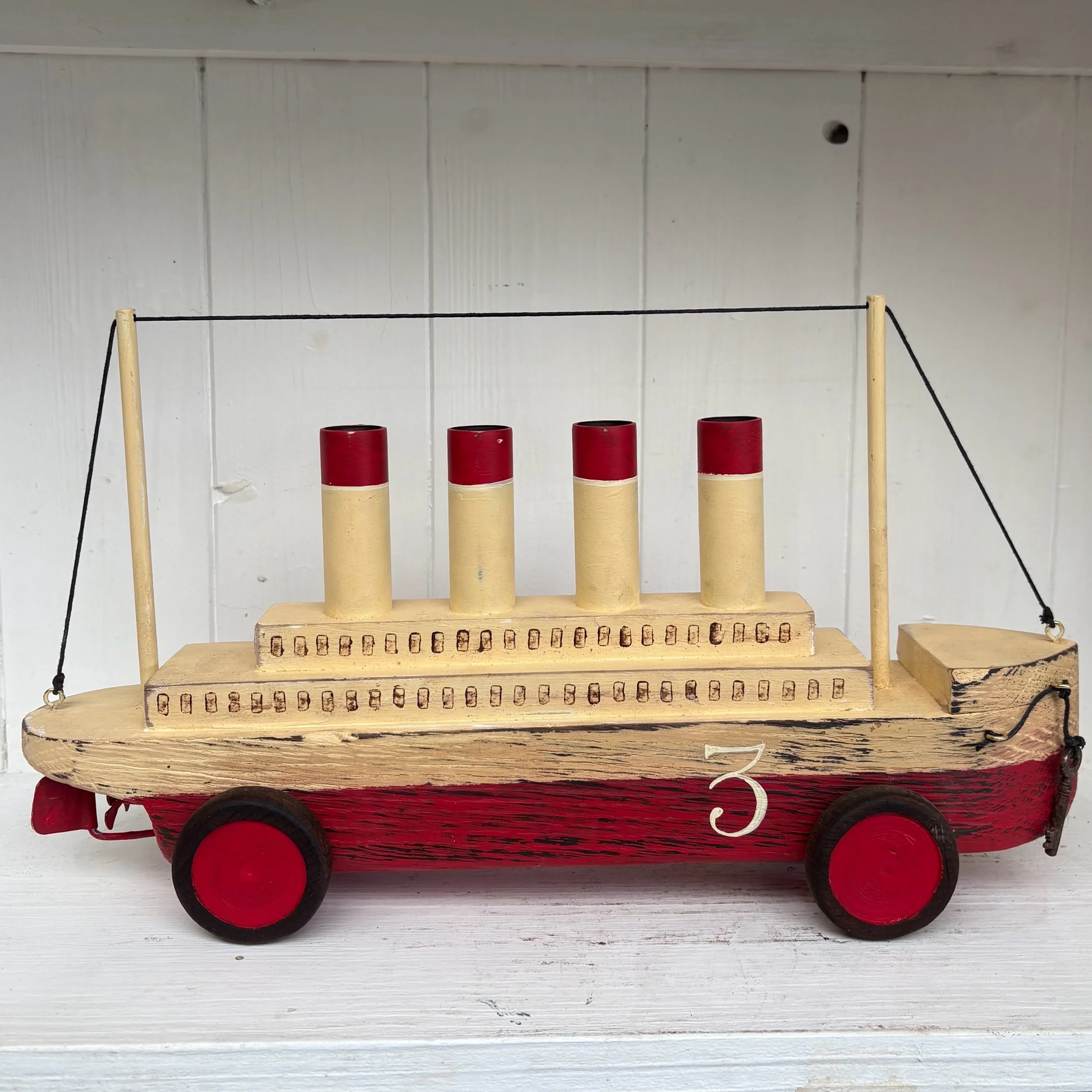 When the boat is pushed the bow gently rises and falls on the wheels.Hand made in oak and copper by Ralph. This is NOT a childs toy! It is a piece of folk art designed as a moving decorative object. Approx 37 cm long