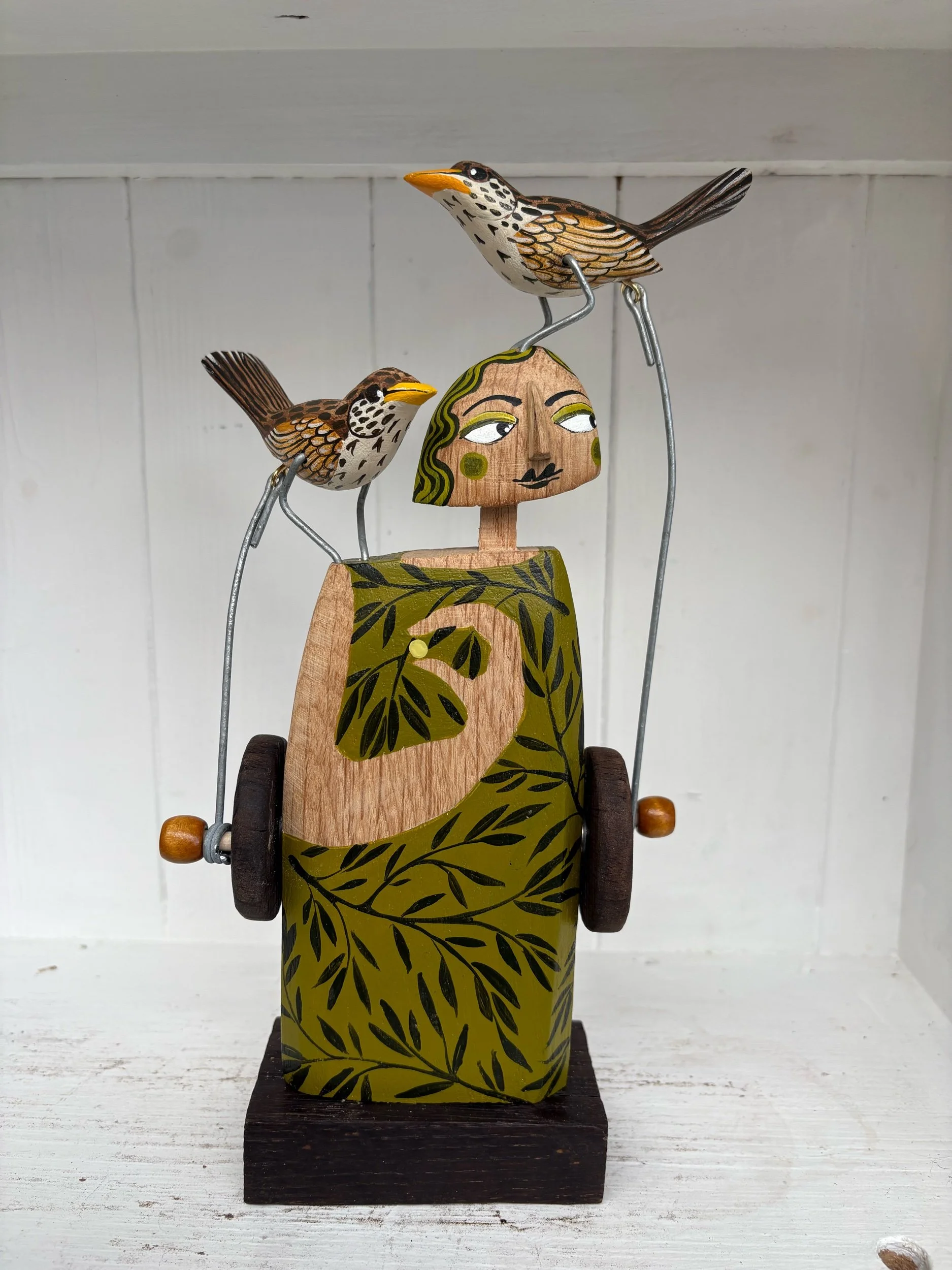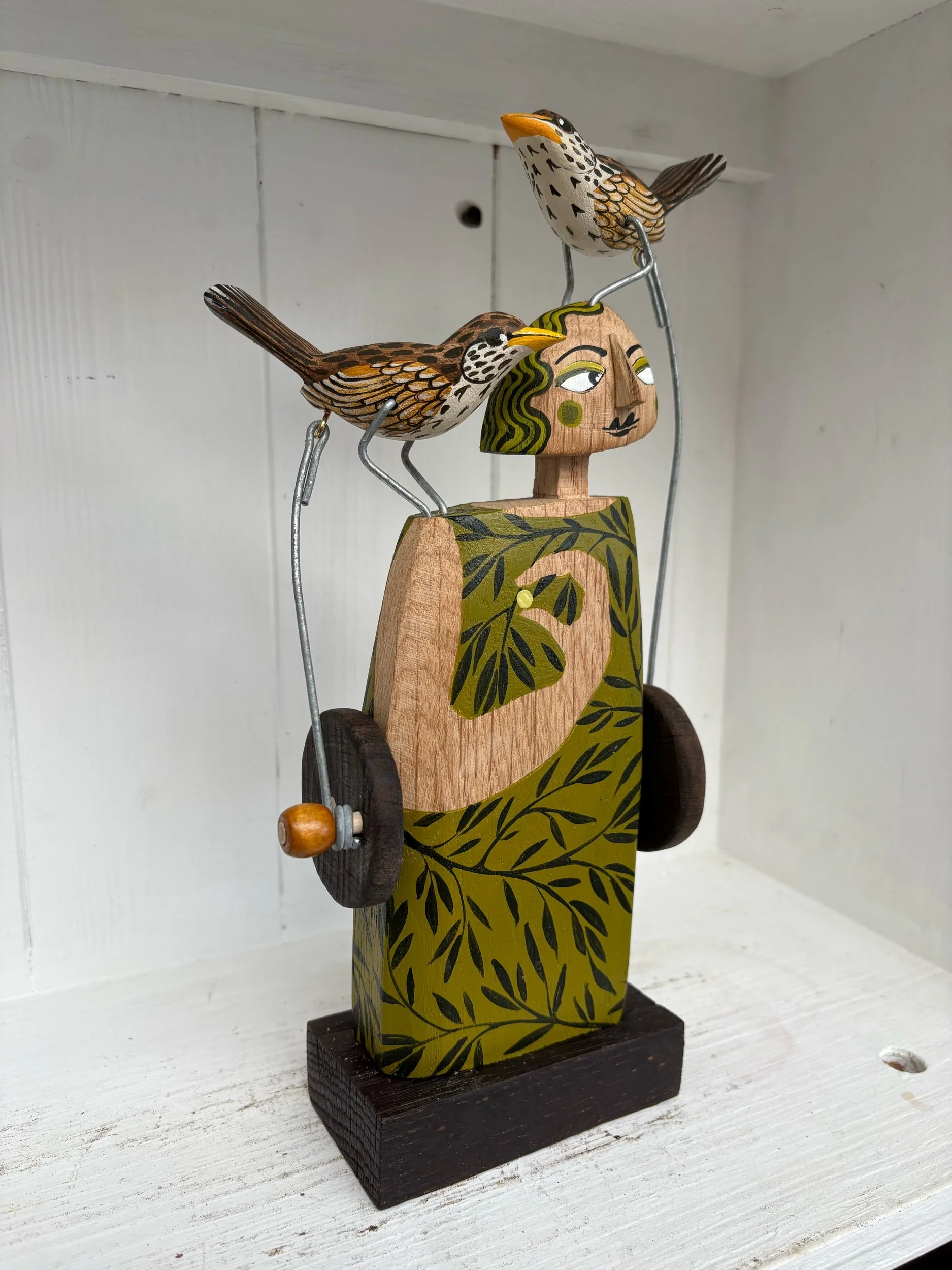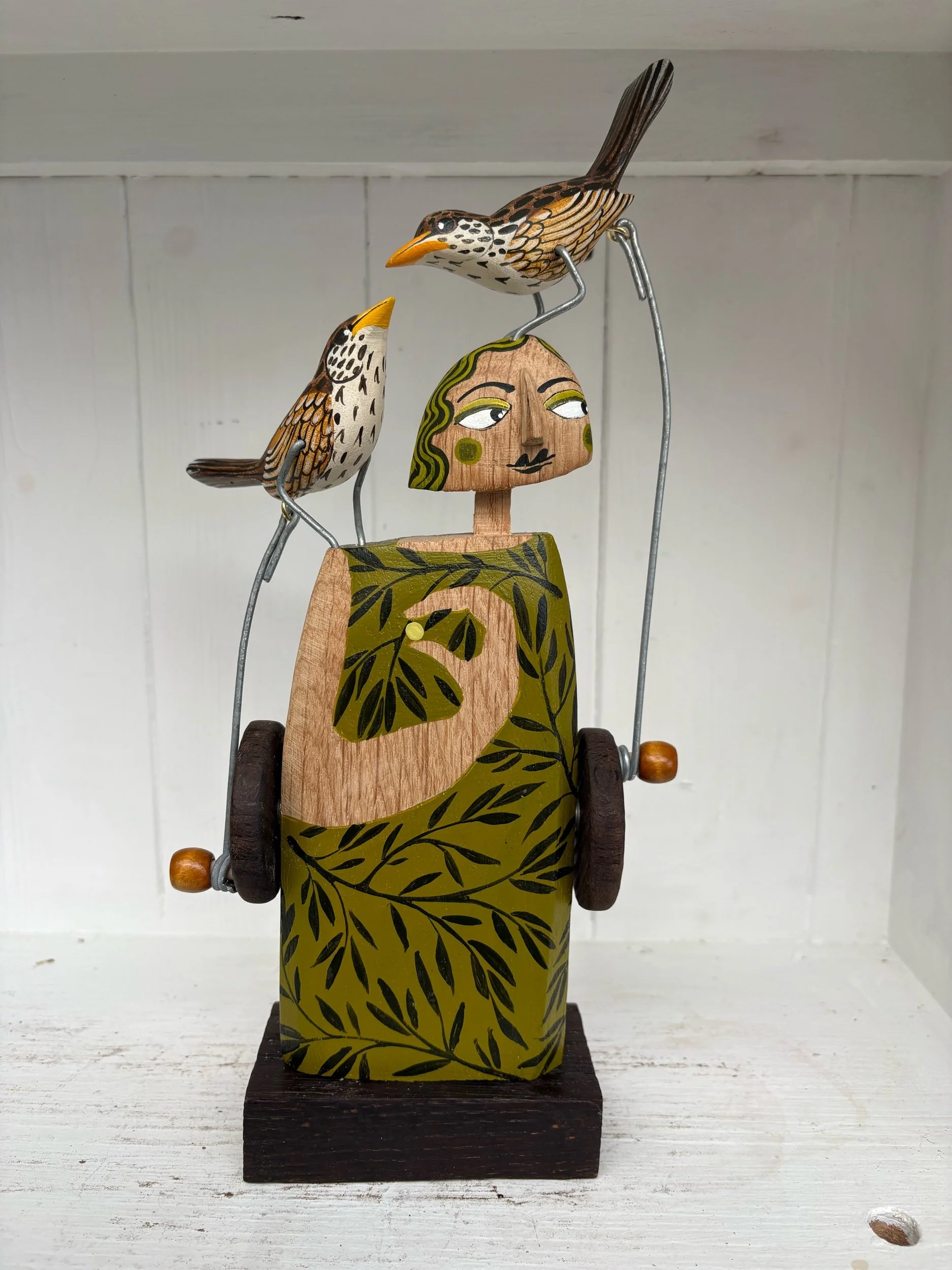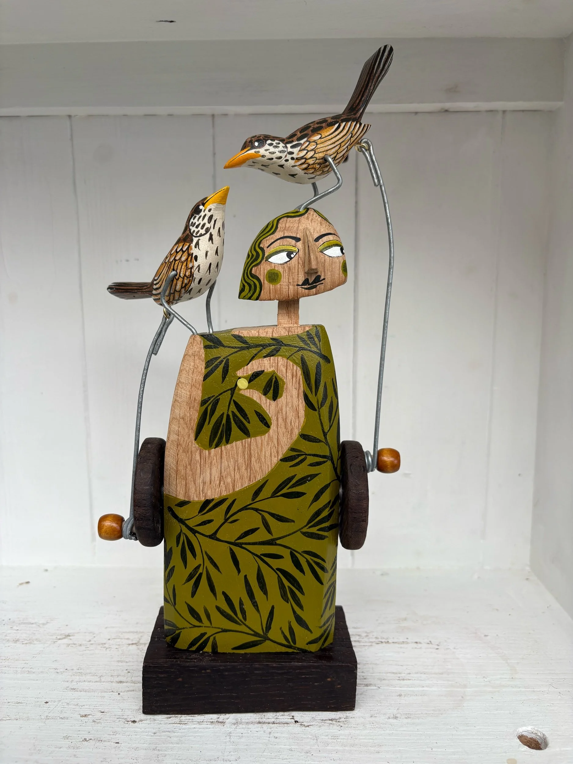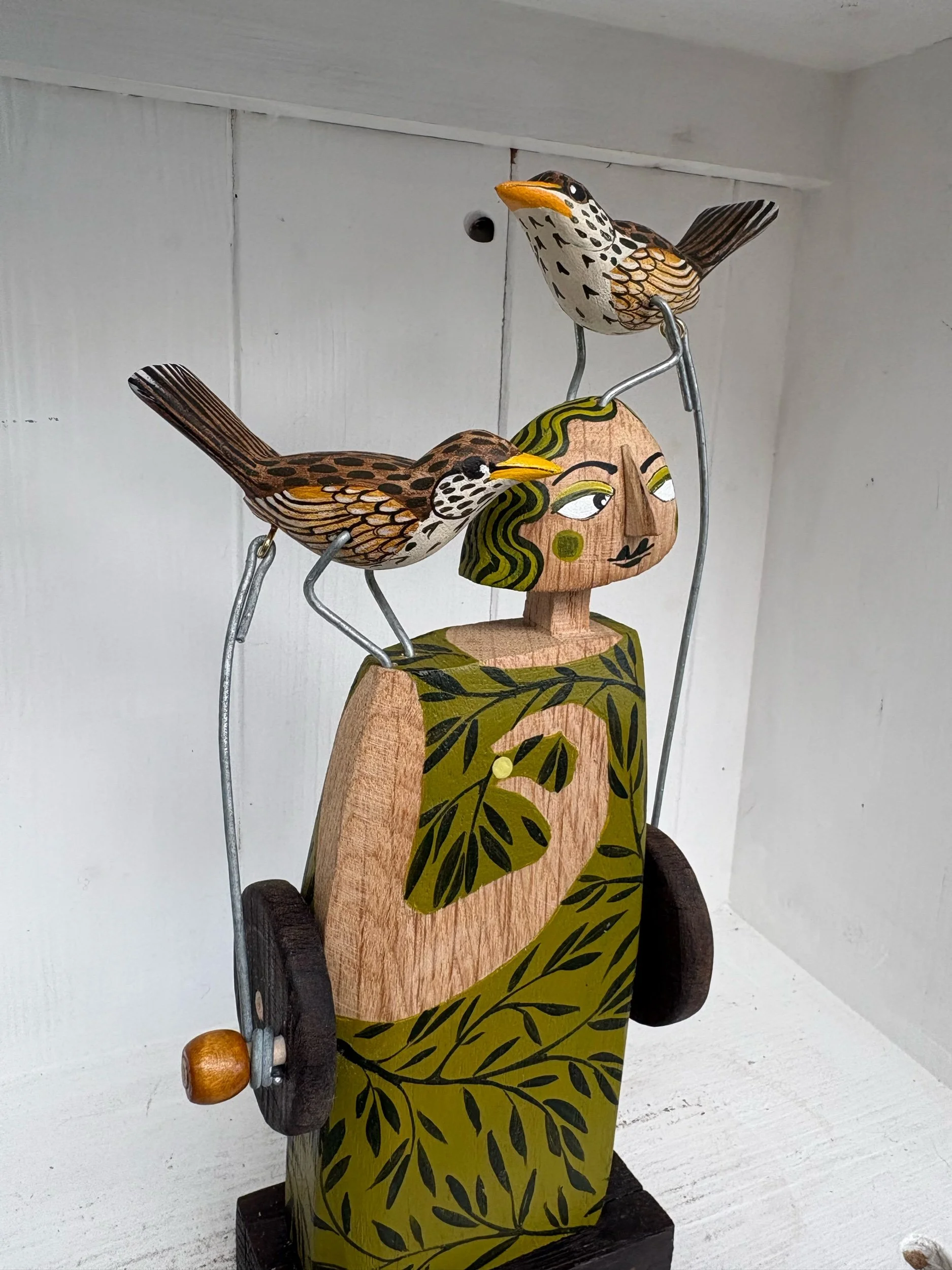 When the handle is turned the Painted Thrushes on the head and shoulder of the figure make a pecking movement. Hand made in oak by Jane and Ralph in far West Cornwall. 26cm tall