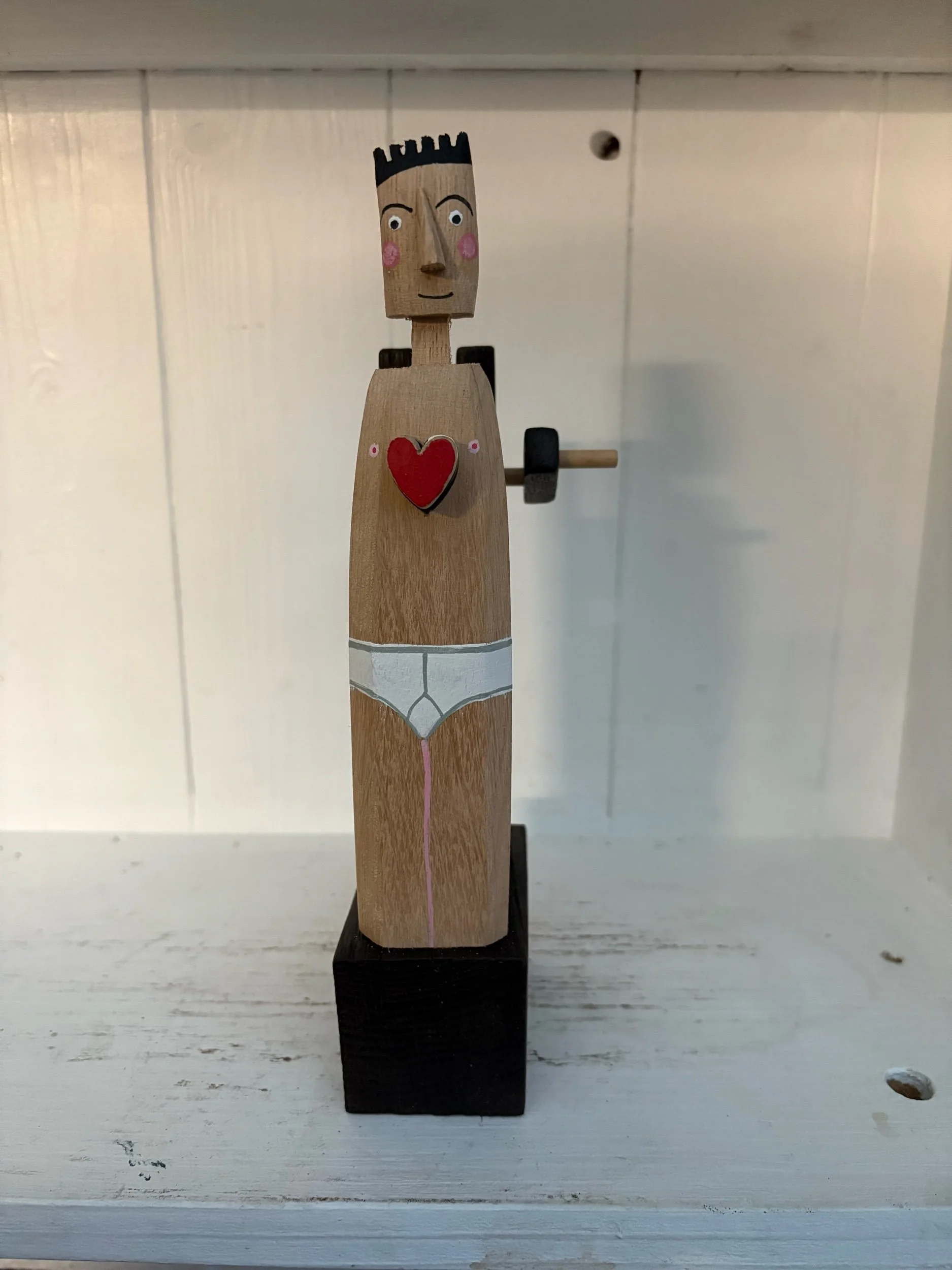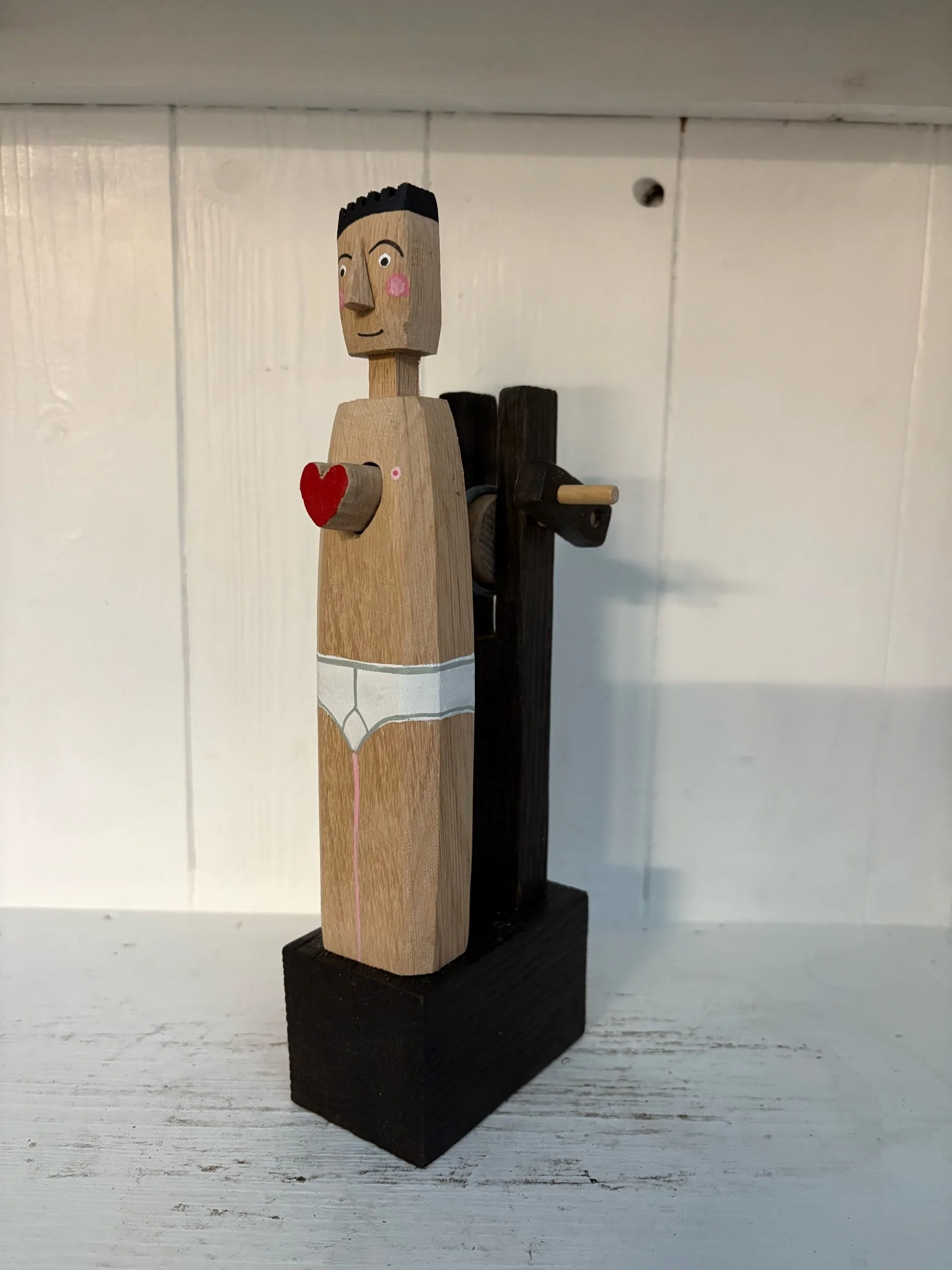 When the handle is turned the heart in the painted figure beats in and out. Hand made in oak by Jane and Ralph in far west Cornwall. 24cm tall