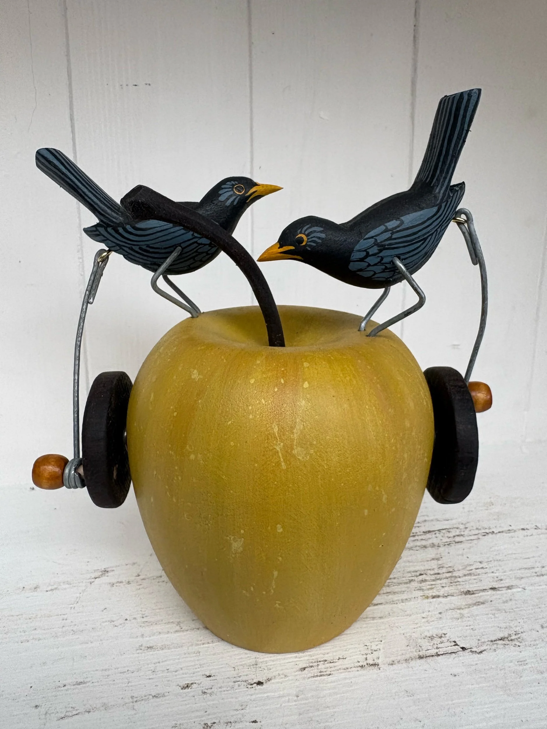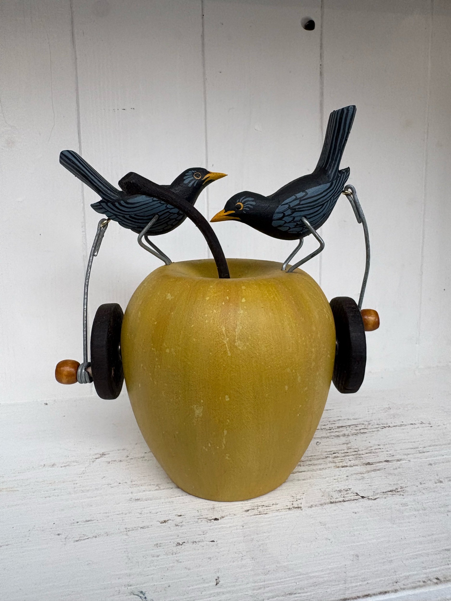 When the handle is turned the carved and painted Blackbirds make a pecking movement on the large green Apple. Hand made by Jane and Ralph in far West Cornwall. 18cm tall