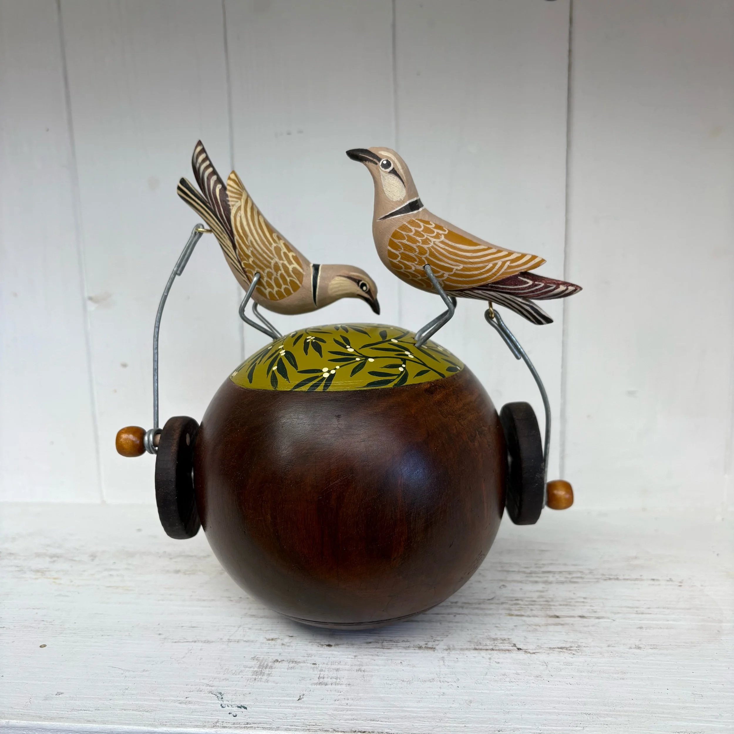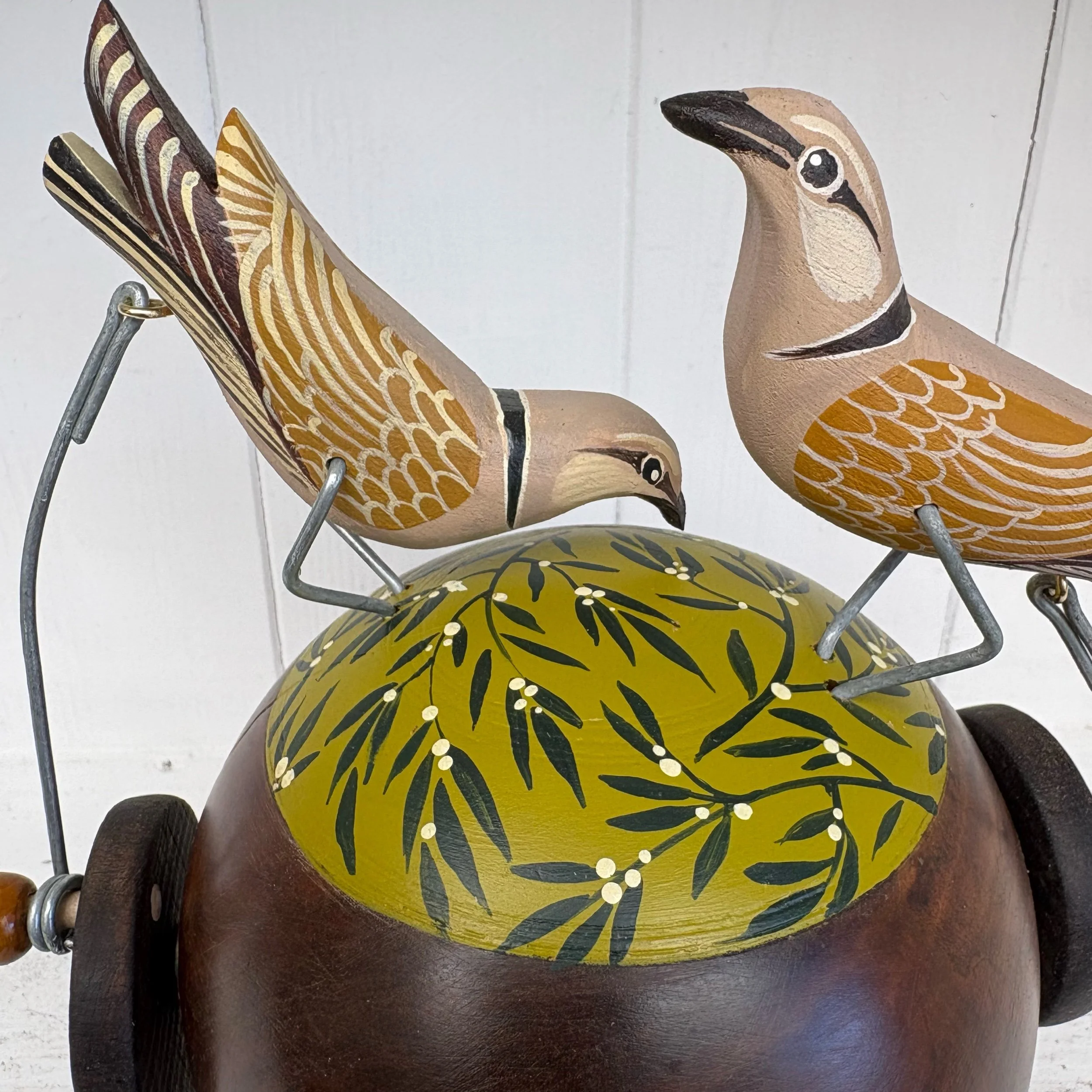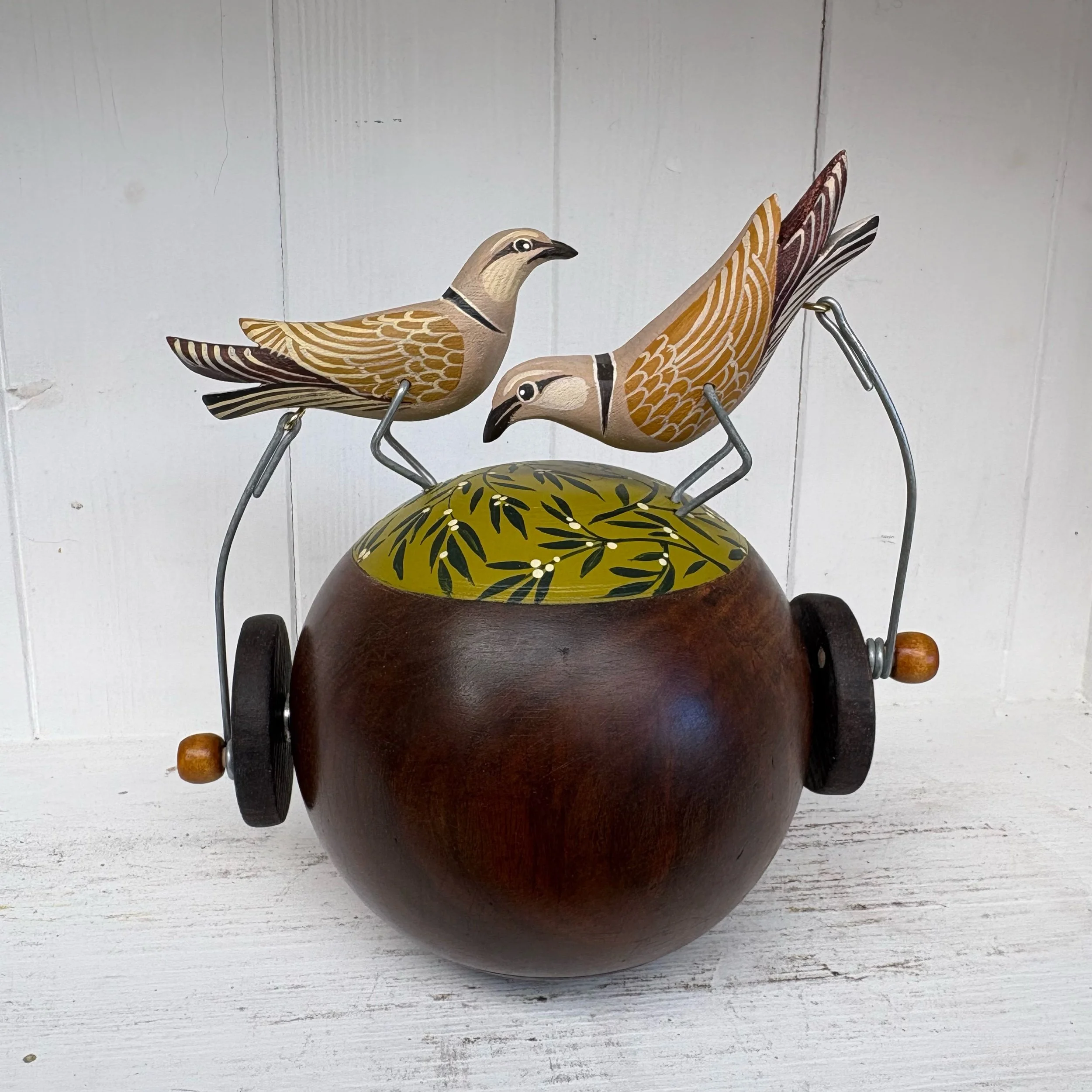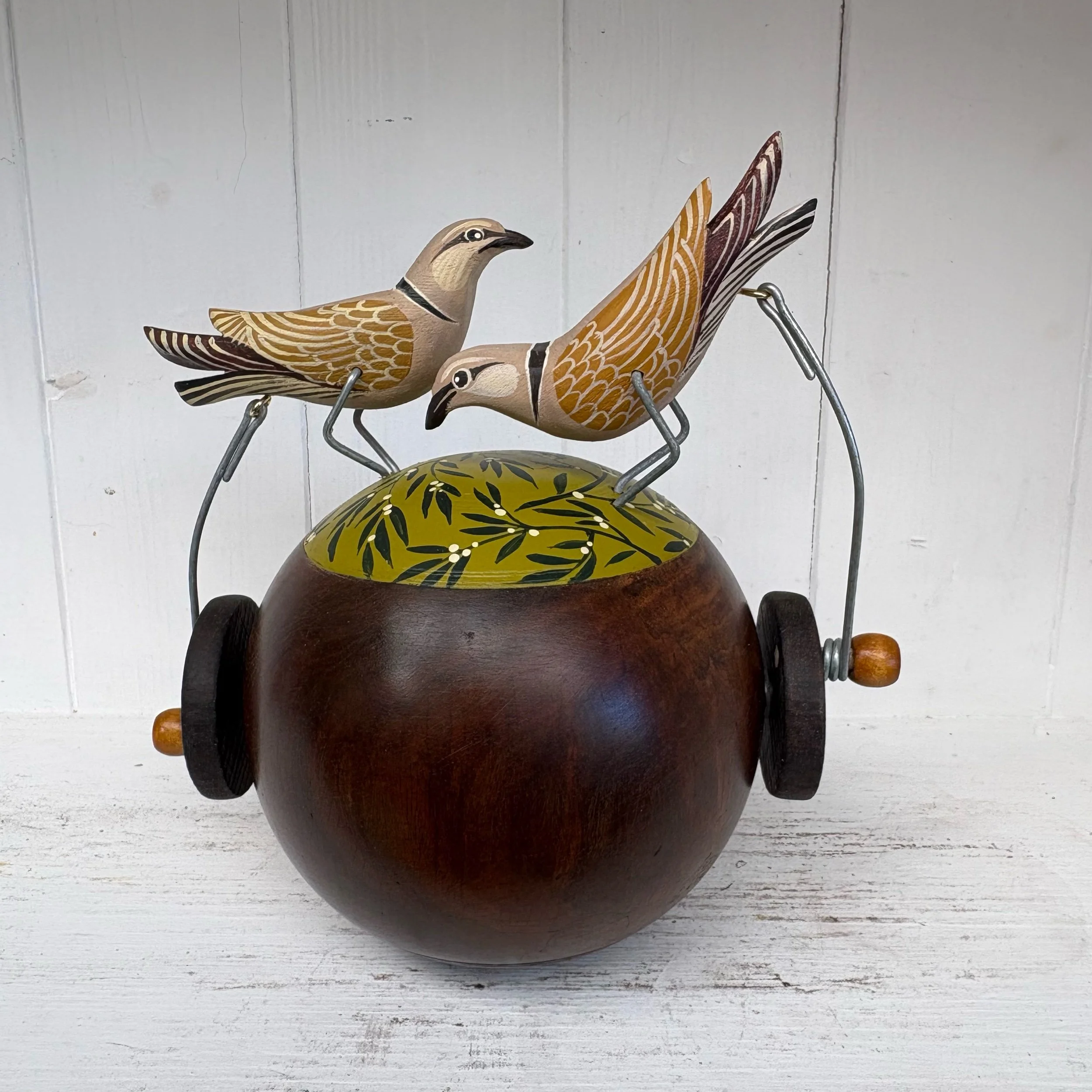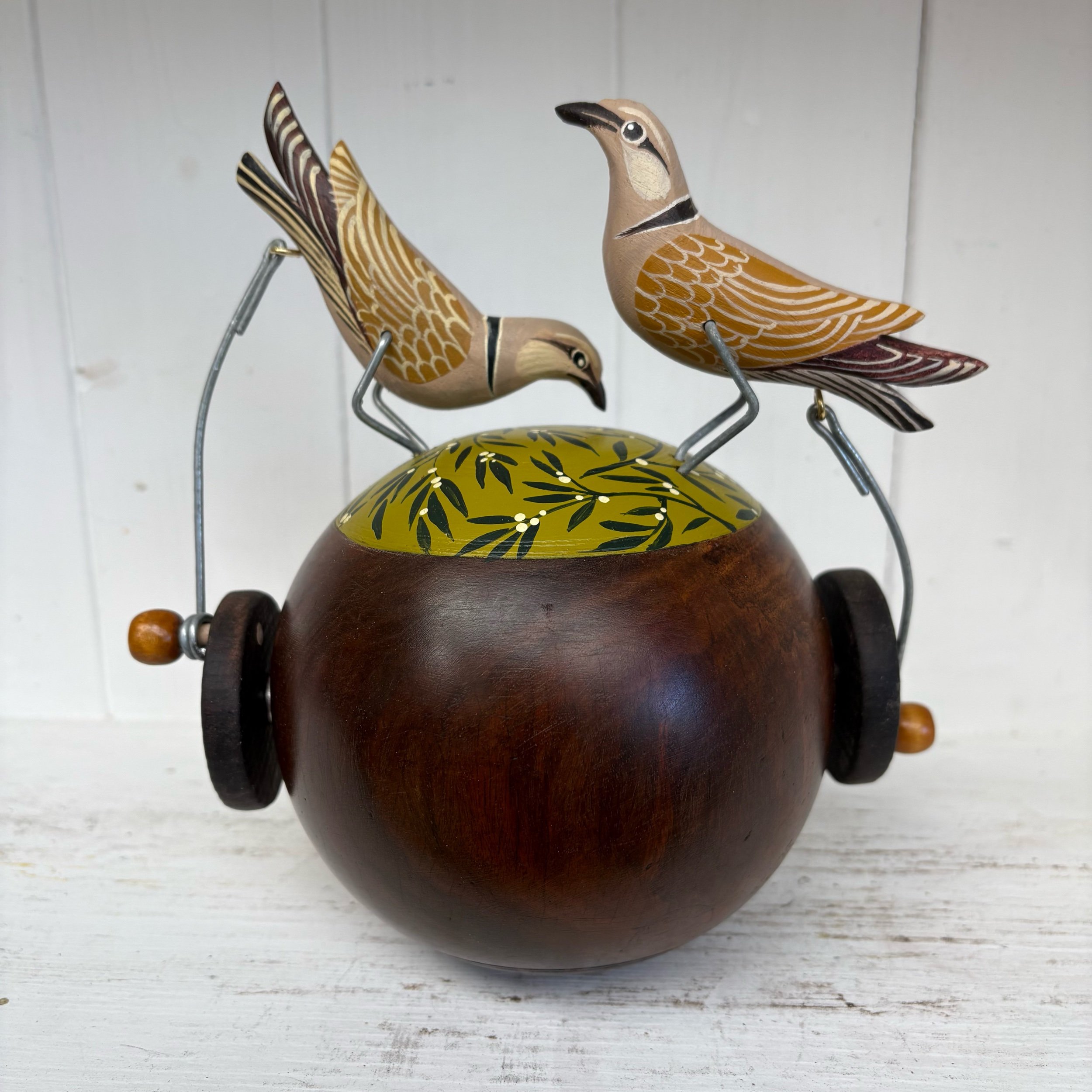When the handle is turned the painted wooden Doves make a pecking movement on the vintage painted and polished Lignum vitae wooden Biwling Ball. Hand made by Jane and Ralph in far West Cornwall.