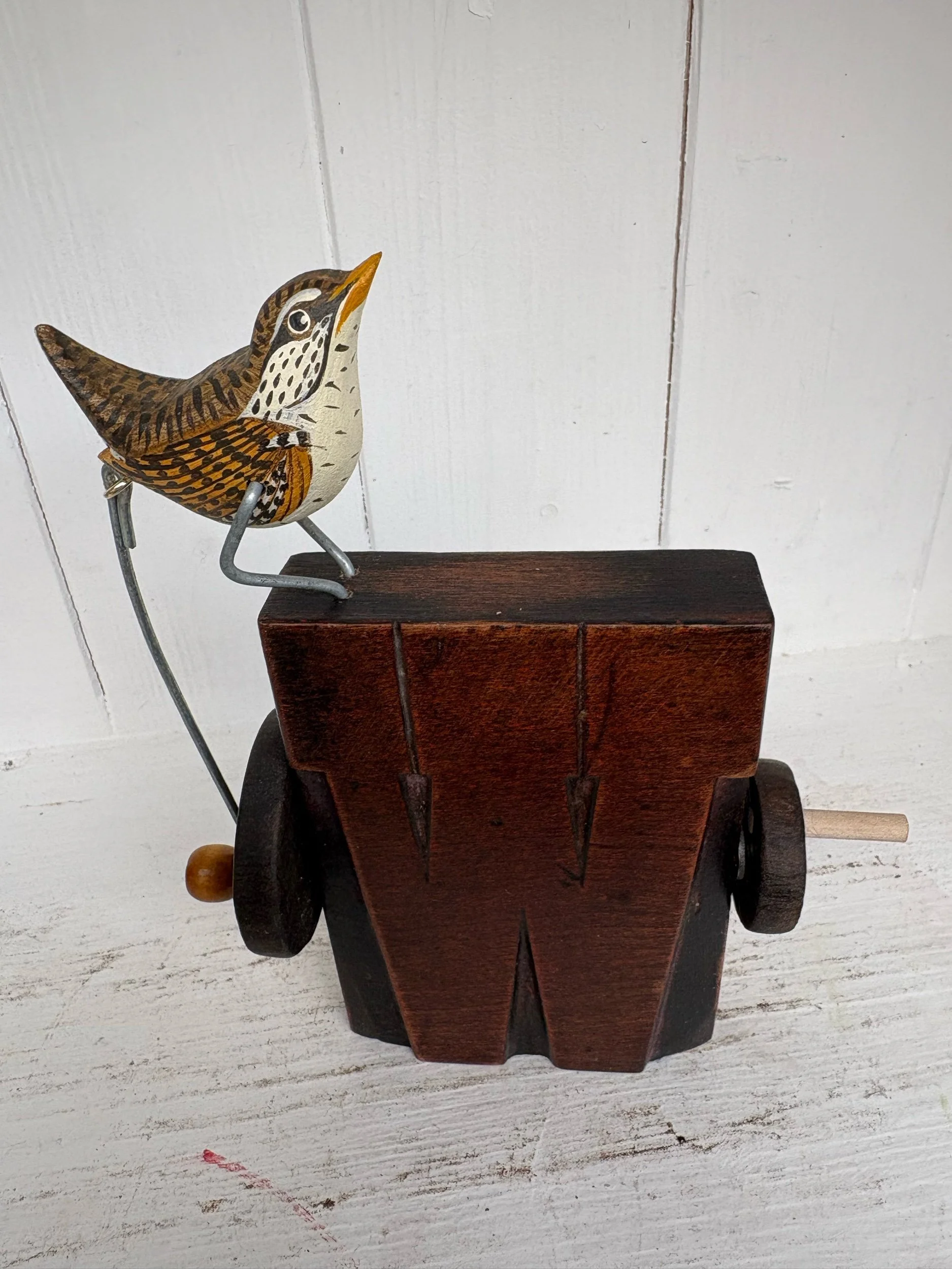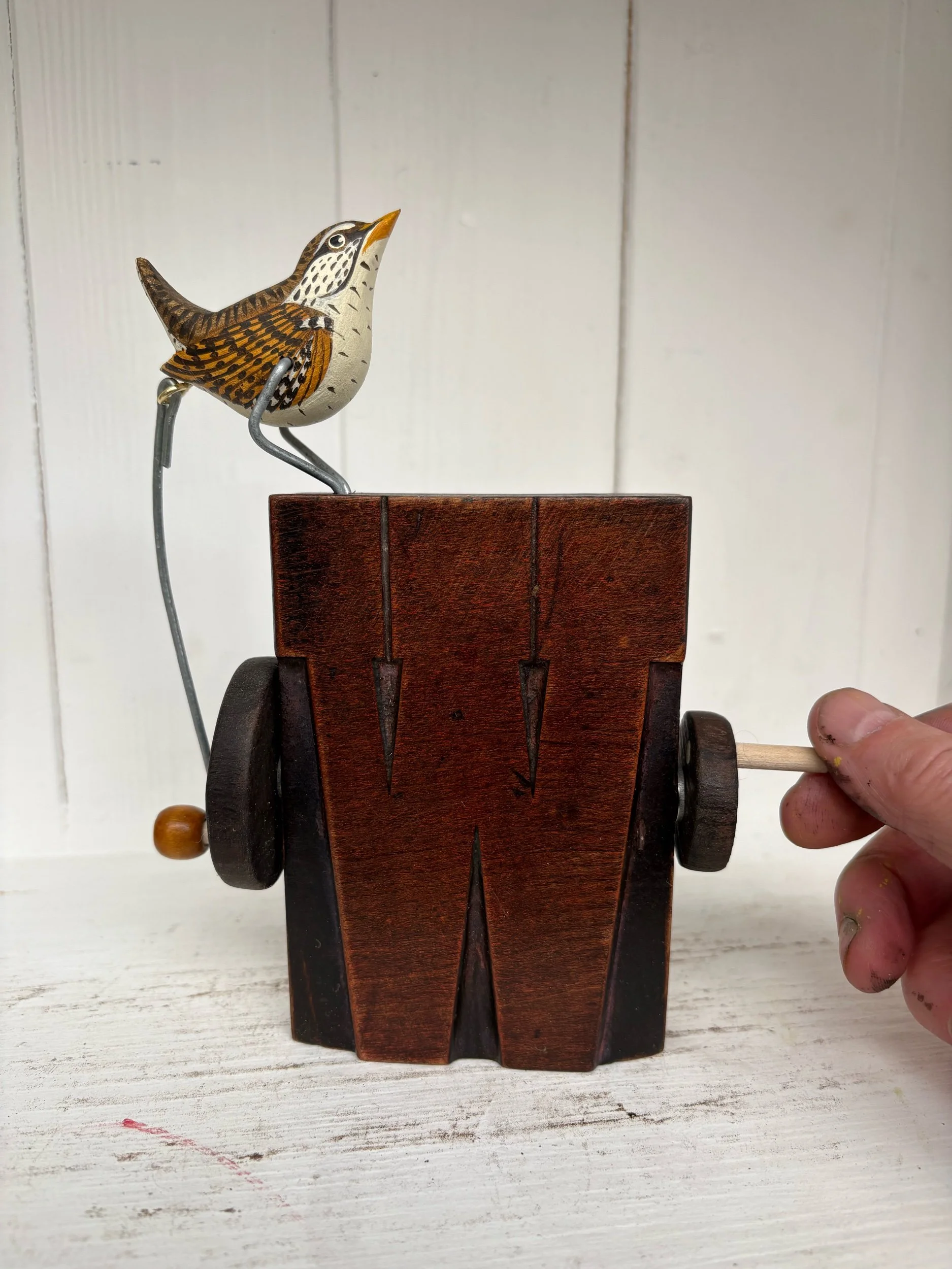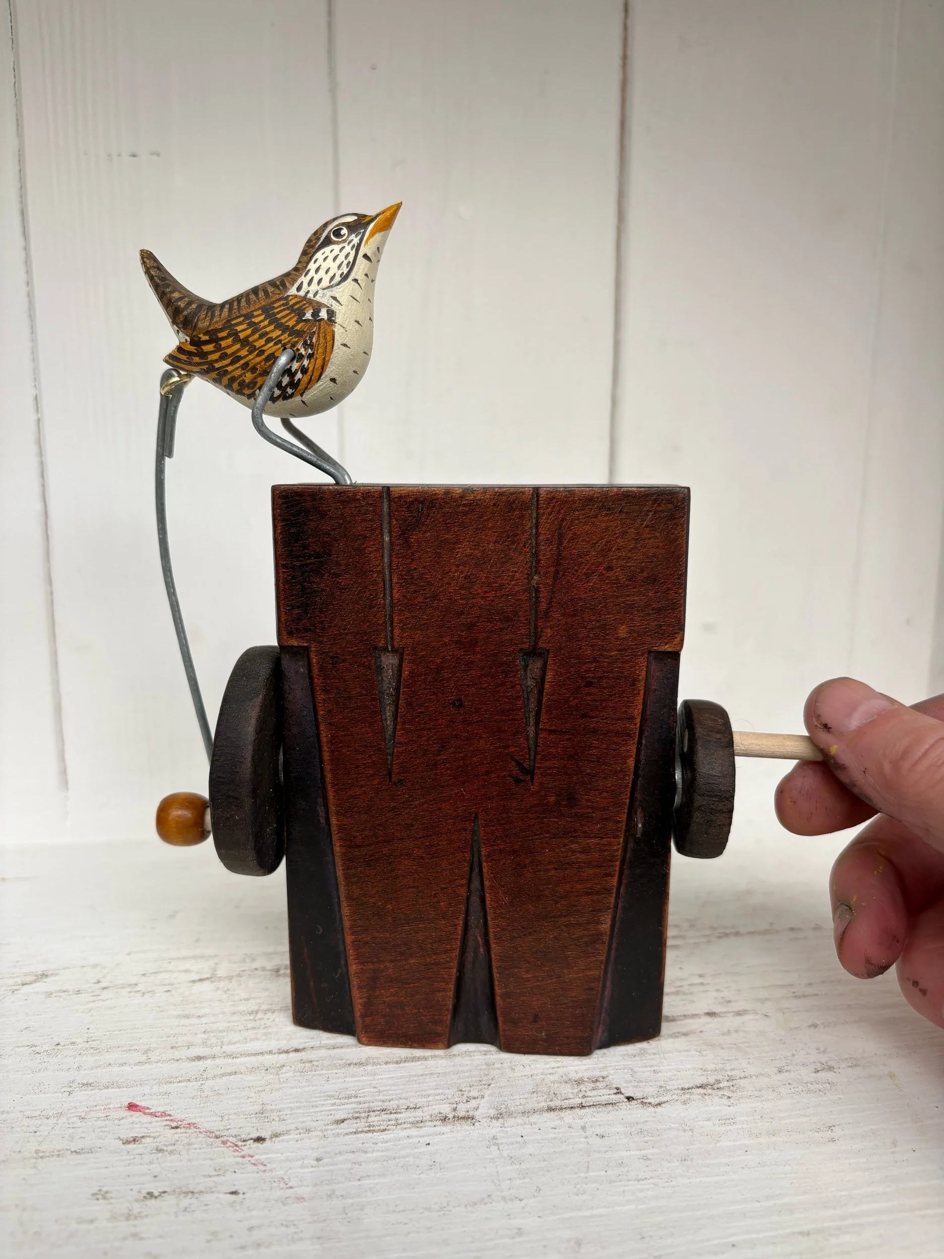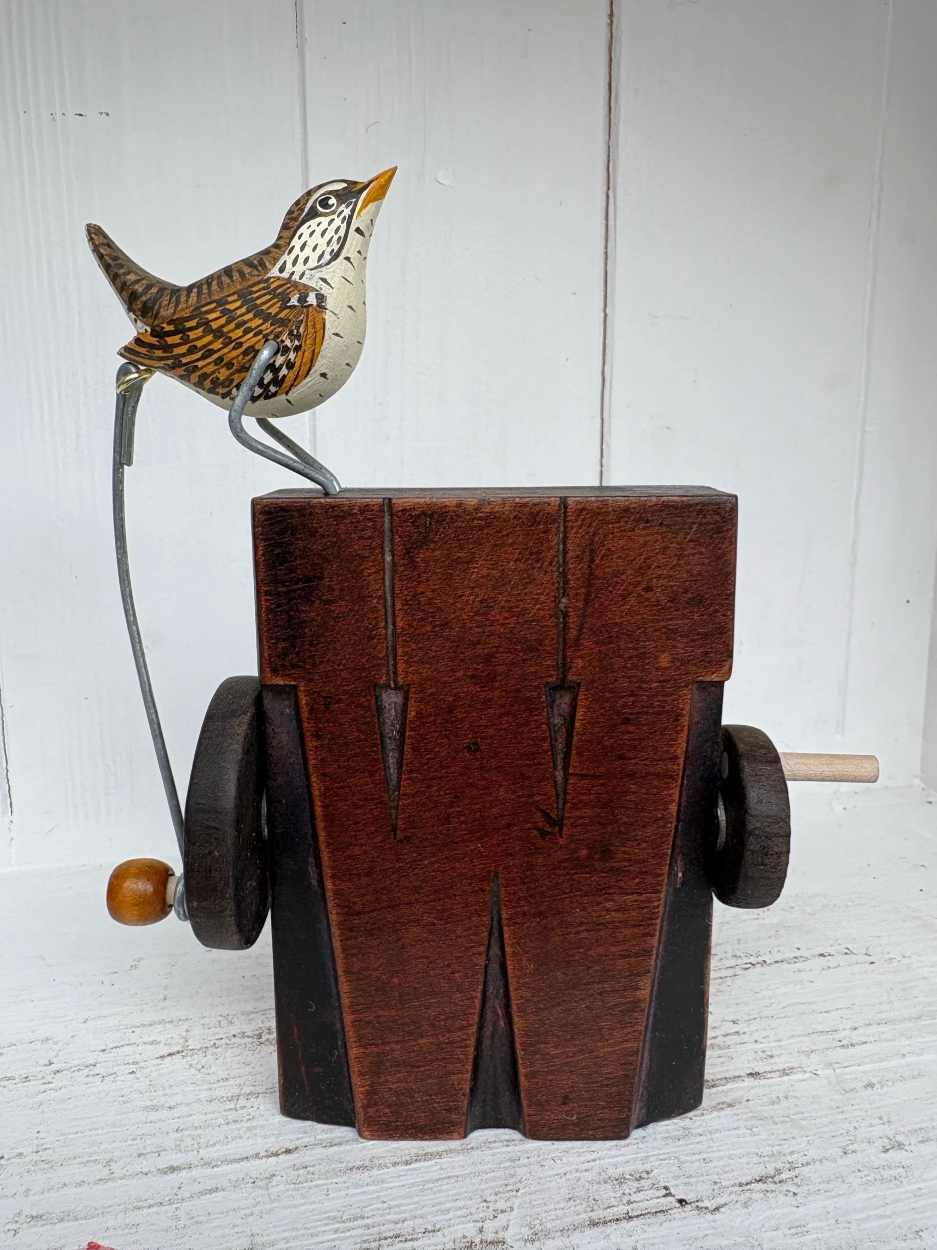 When the handke is turned the carved and painted wooden wren makes a oecking movement on the vintage letterpress printing block letter W. Hand made by Jane and Ralph in far West Cornwall 17cm tall