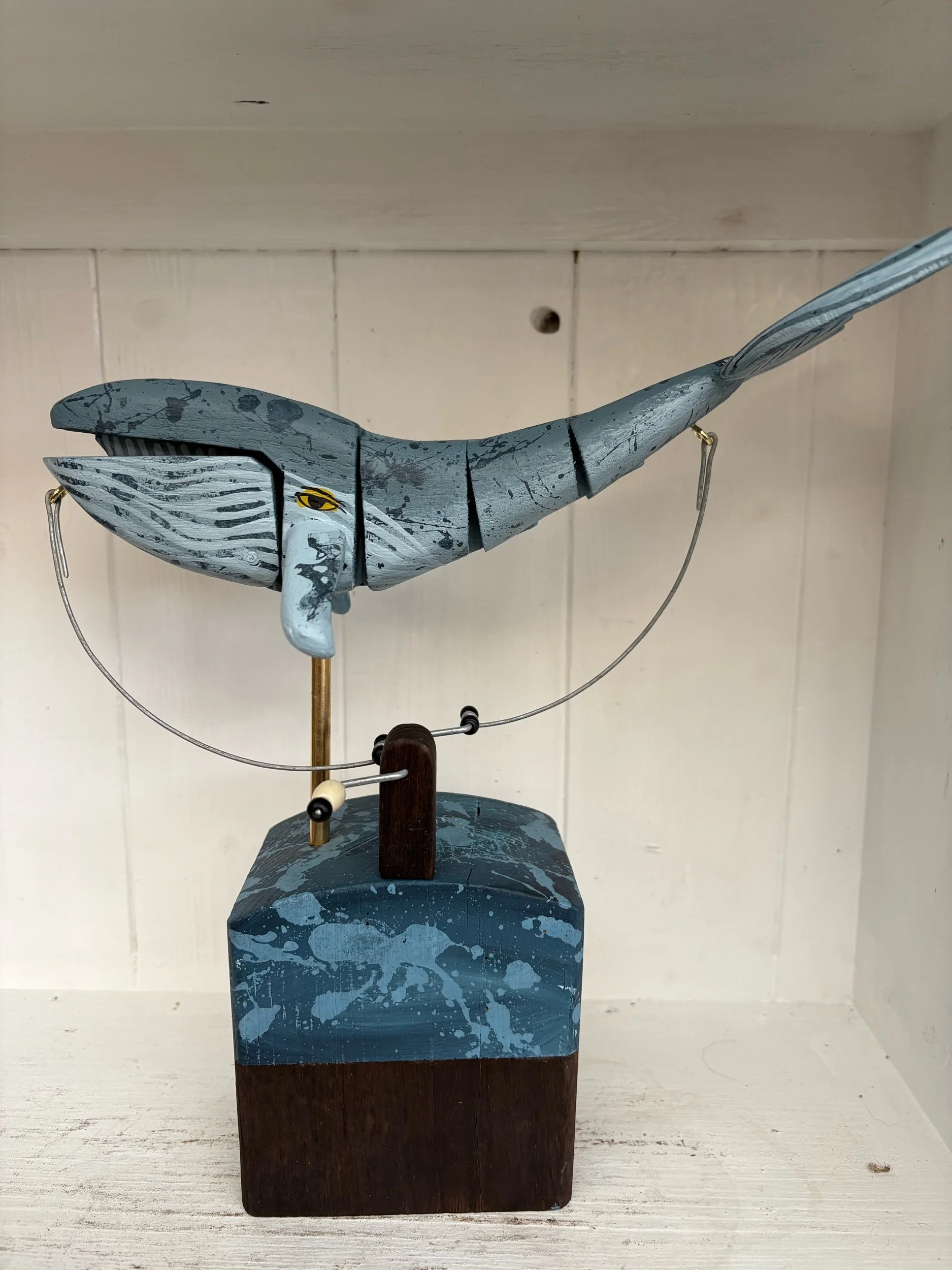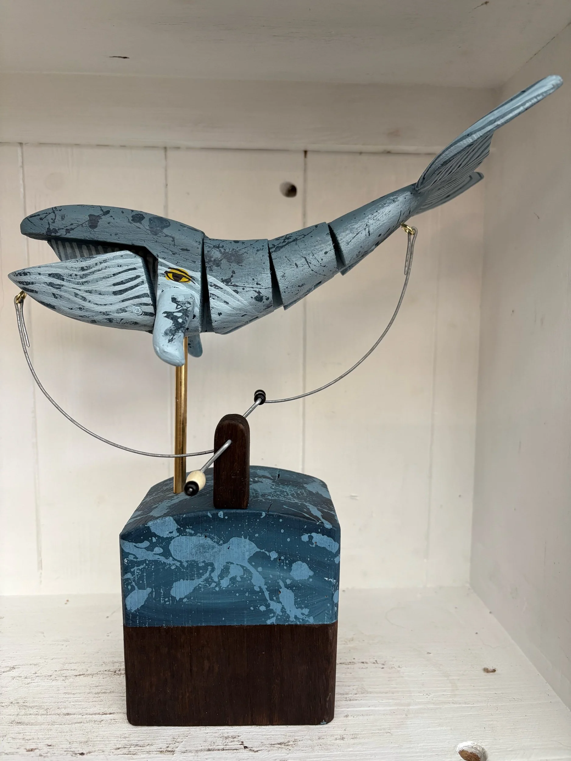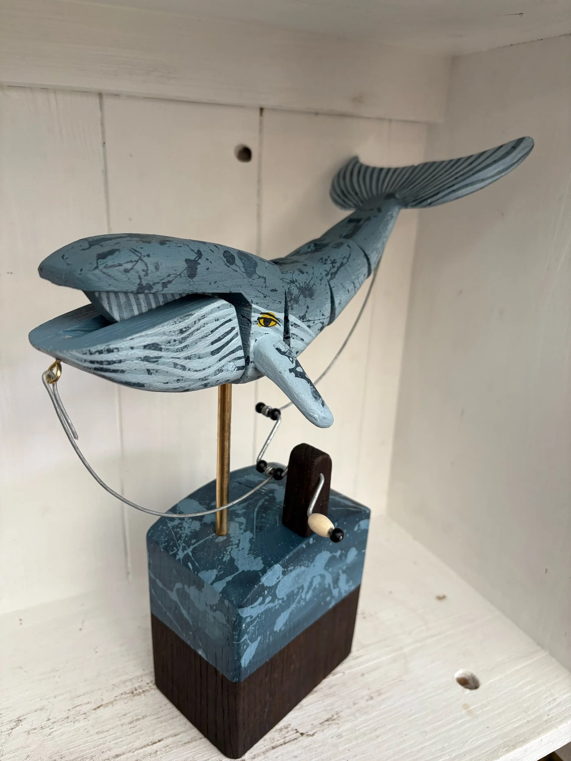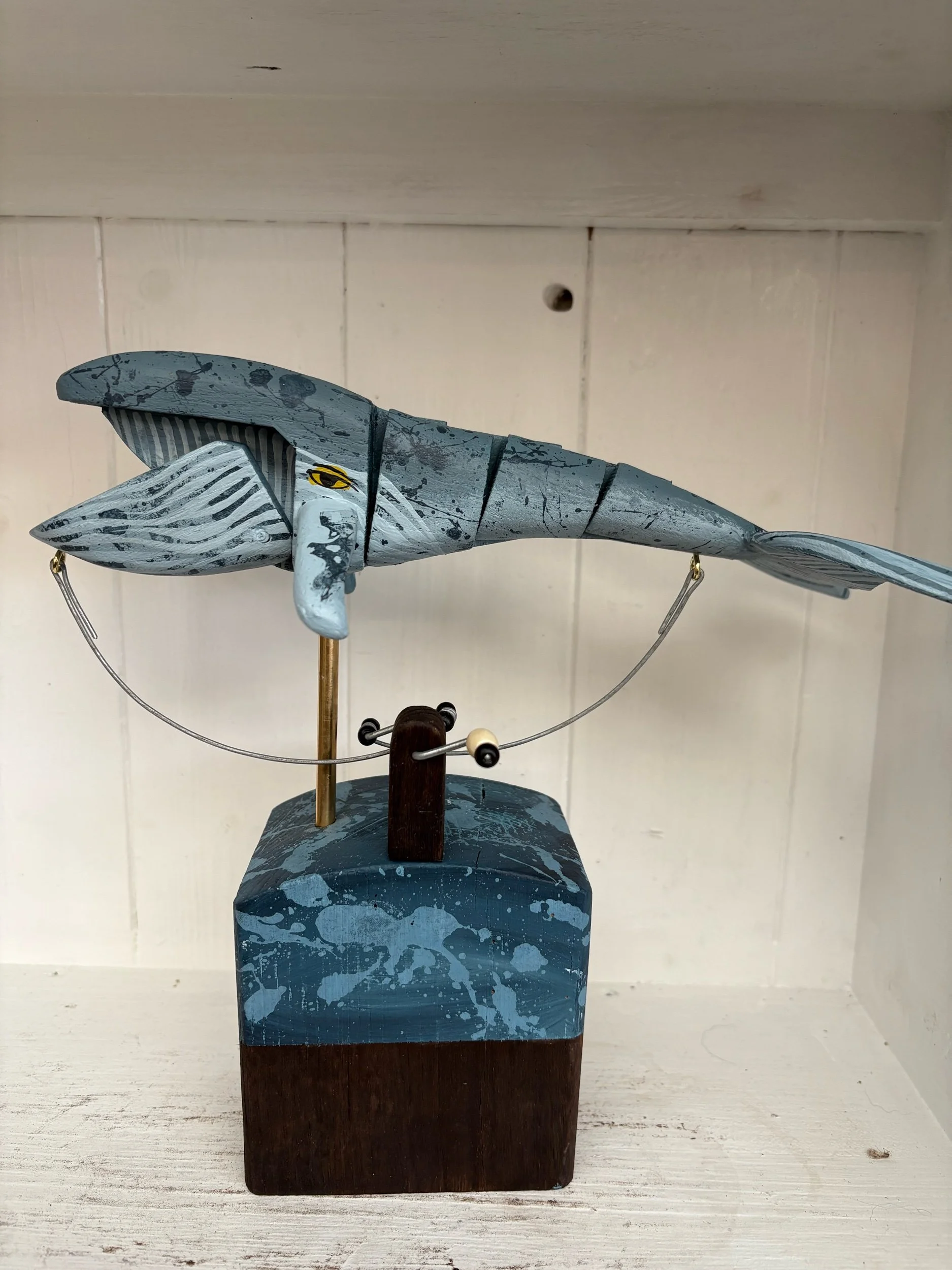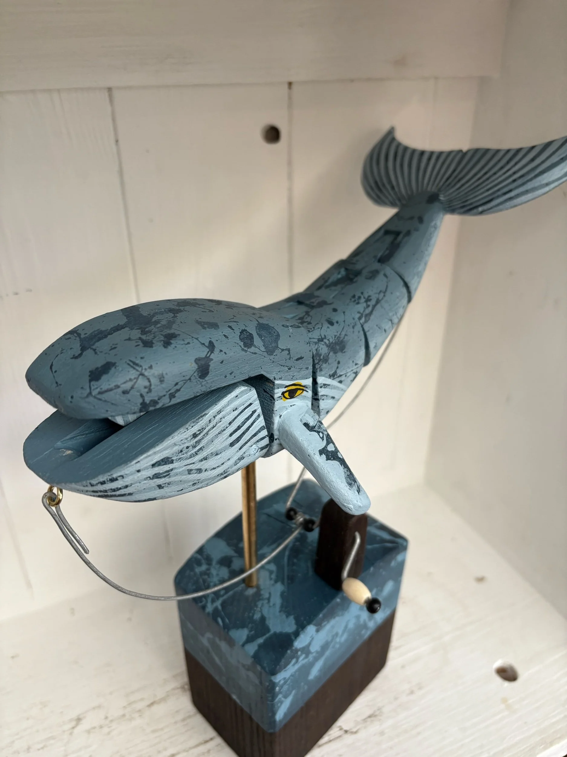 When the handle is turned the jointed wooden Blue Whale makes a swimming movement flipping its tail and opening its mouth. Hand made in oak by Jane and Ralph in far west Cornwall. 24cm tall x 25cm