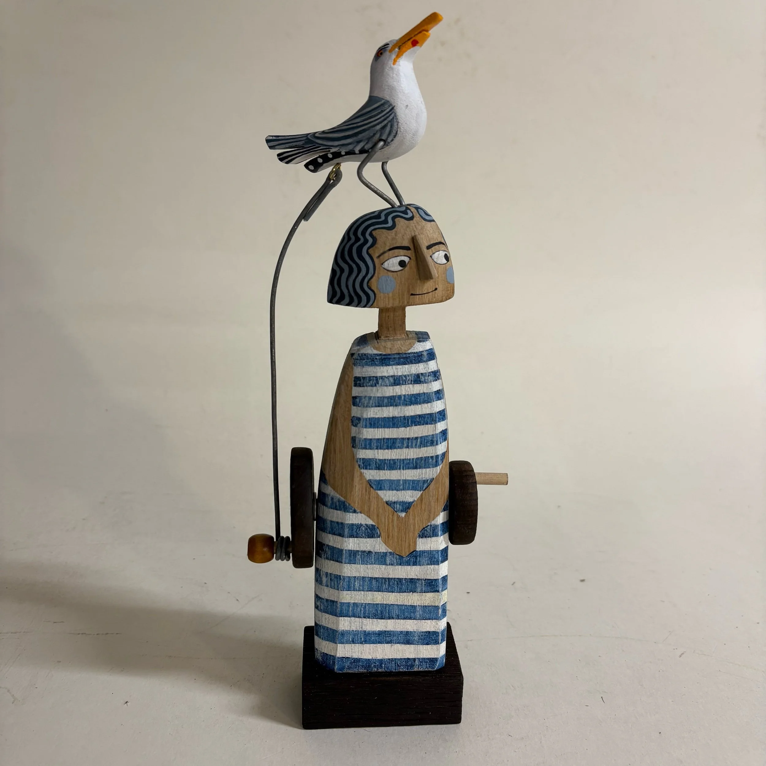 When the handle is turned the seagull makes a pecking movement on the figures head. Hand made in oak by Jane and Ralph in far west Cornwall. 28cm tall