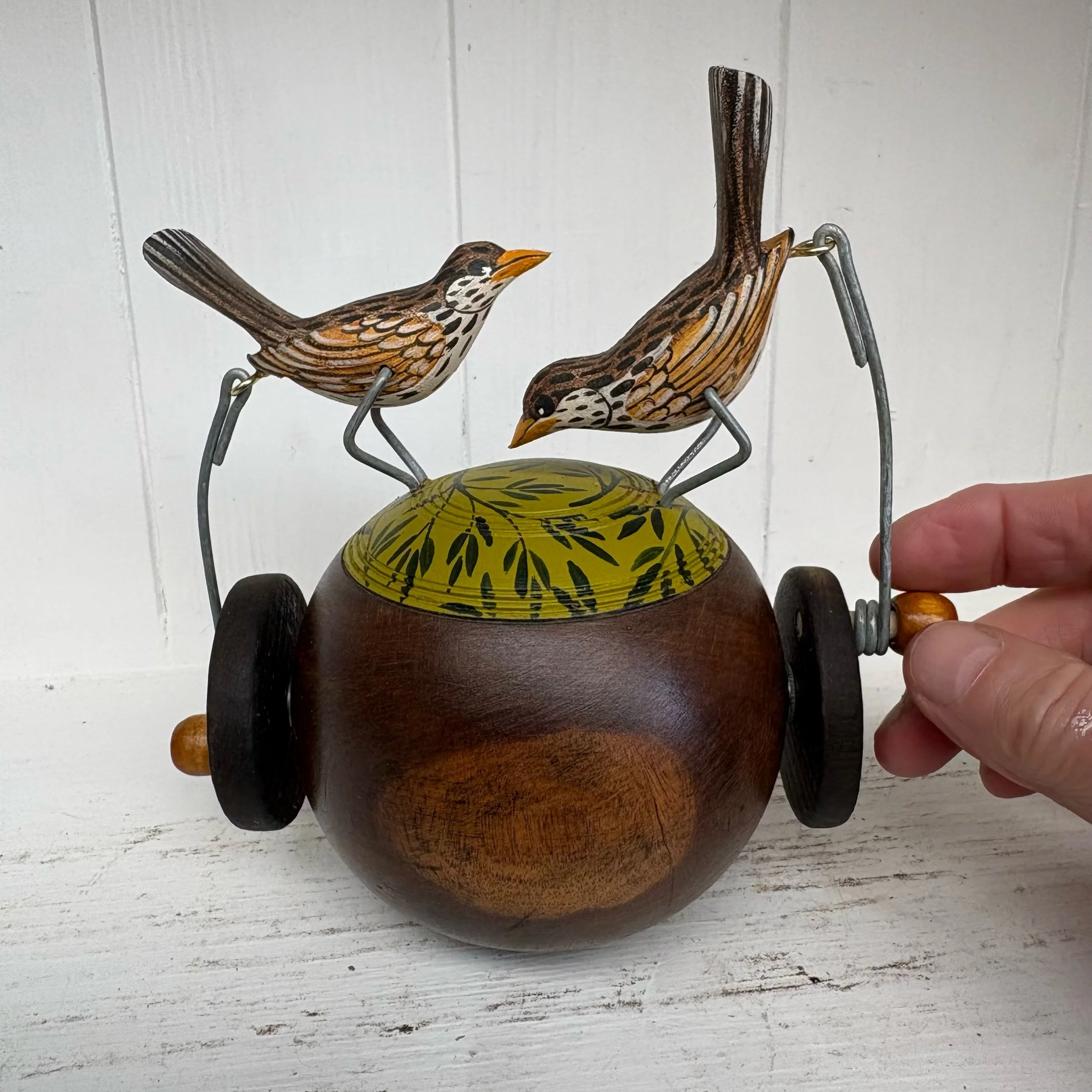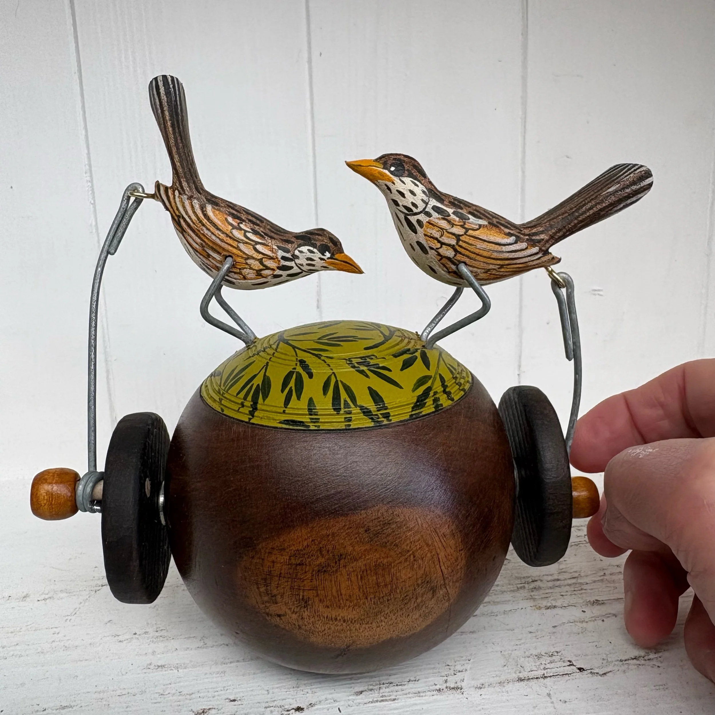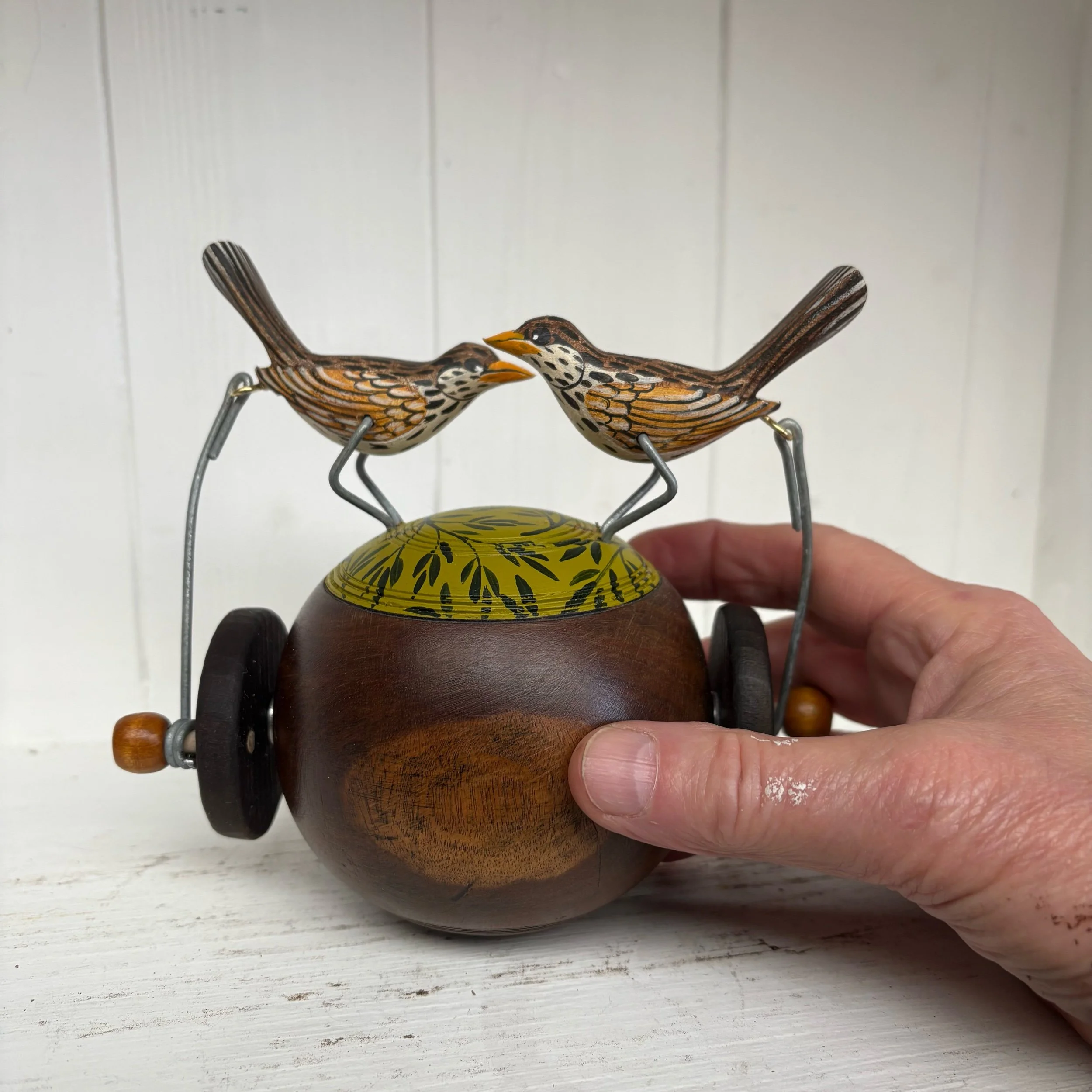 When the handle is turned the pair of painted wooden Thrushes peck on the small Bowling Ball jack. This is a bintage Lignum Vitae wooden Jack much smaller that the big Bowling Balls at only 9 cm dia. Overall height with birds is 13.5 cm Hand made by Jane and Ralph in far West Cornwall.