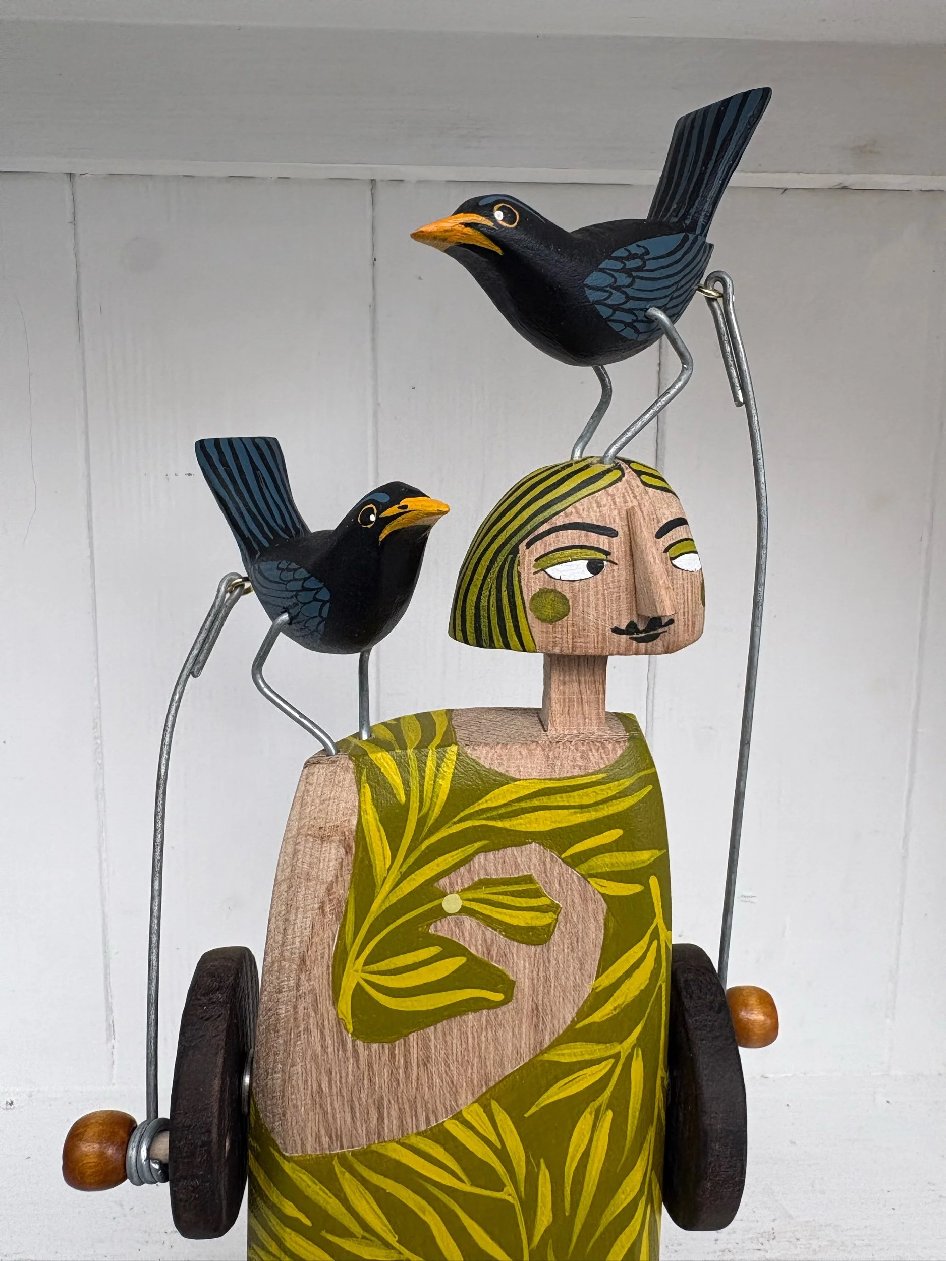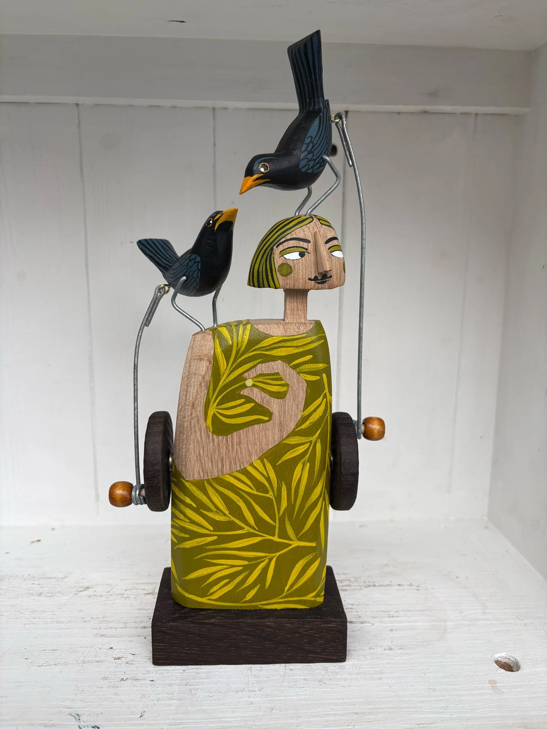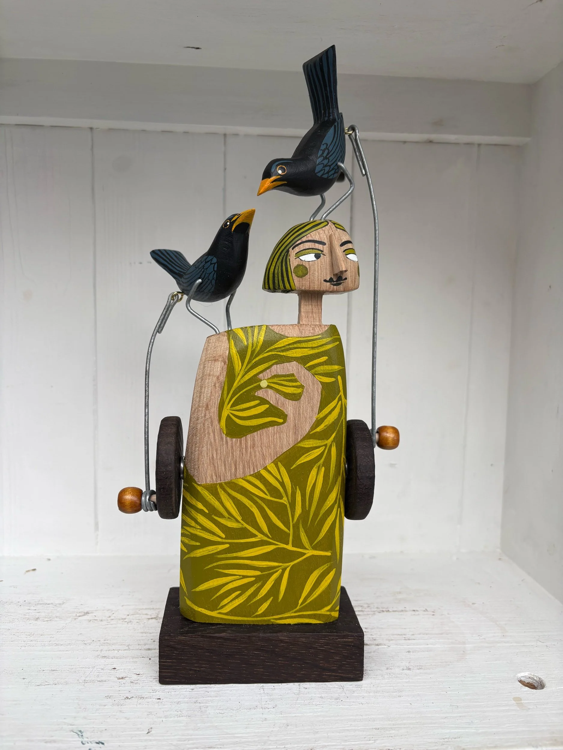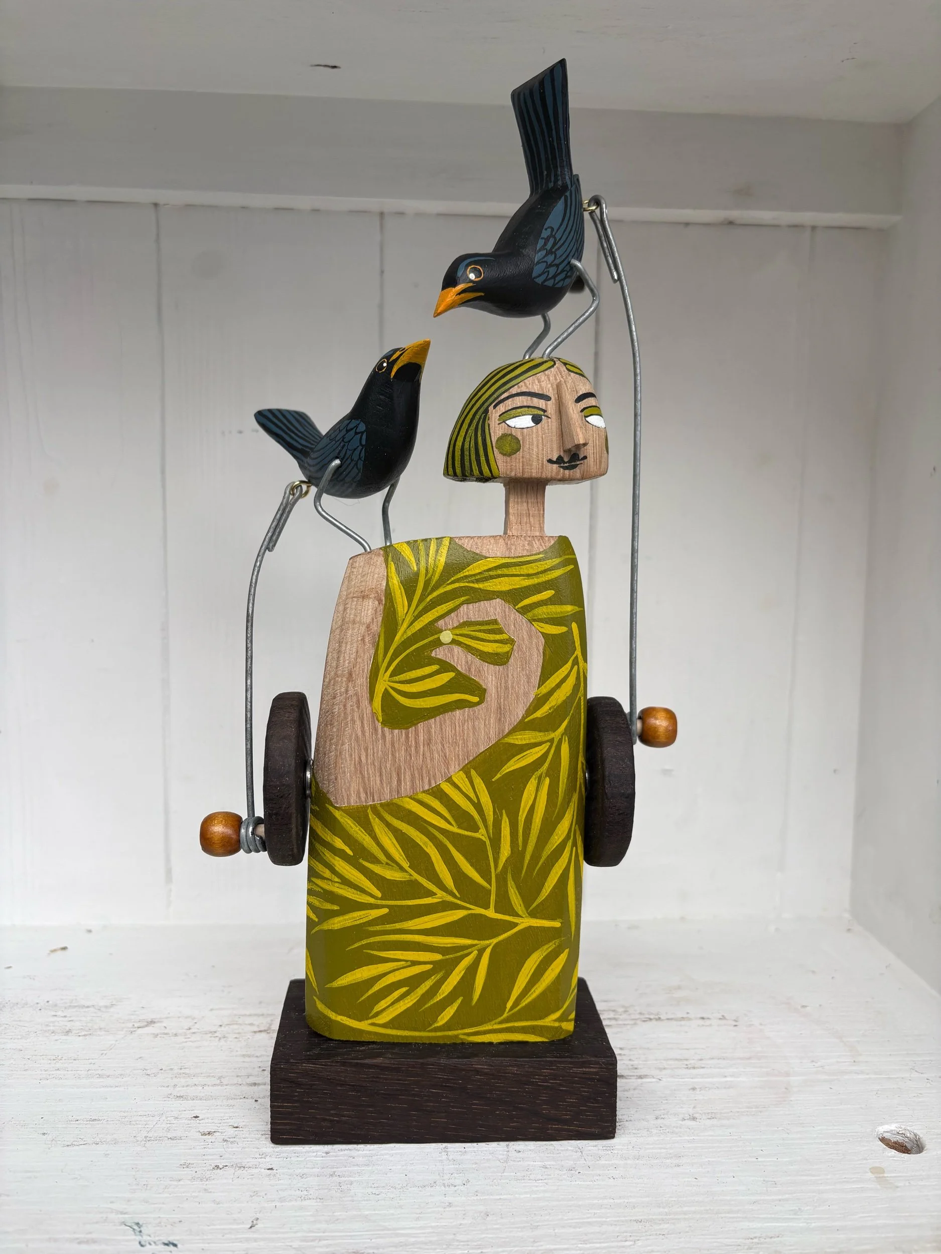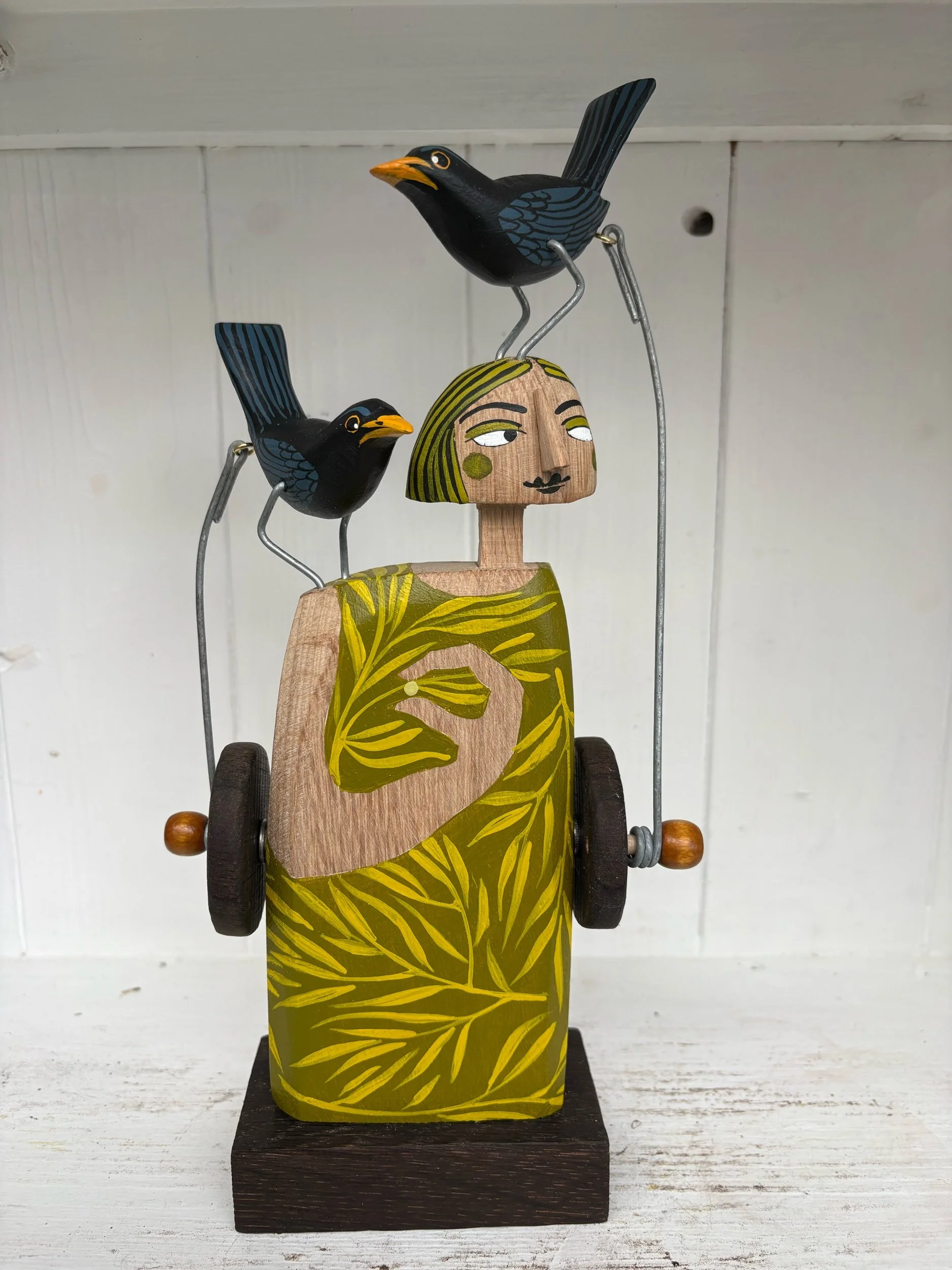 When the handle is turned the painted wooden Blackbirds on the head and shoulder of the painted figure make pecking movements. Hand made in Oak by Jane and Ralph in far West Cornwall. 26cm tall