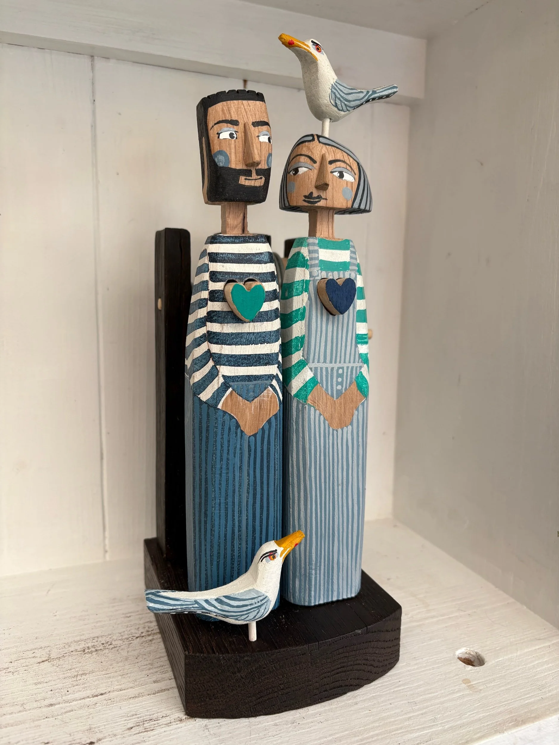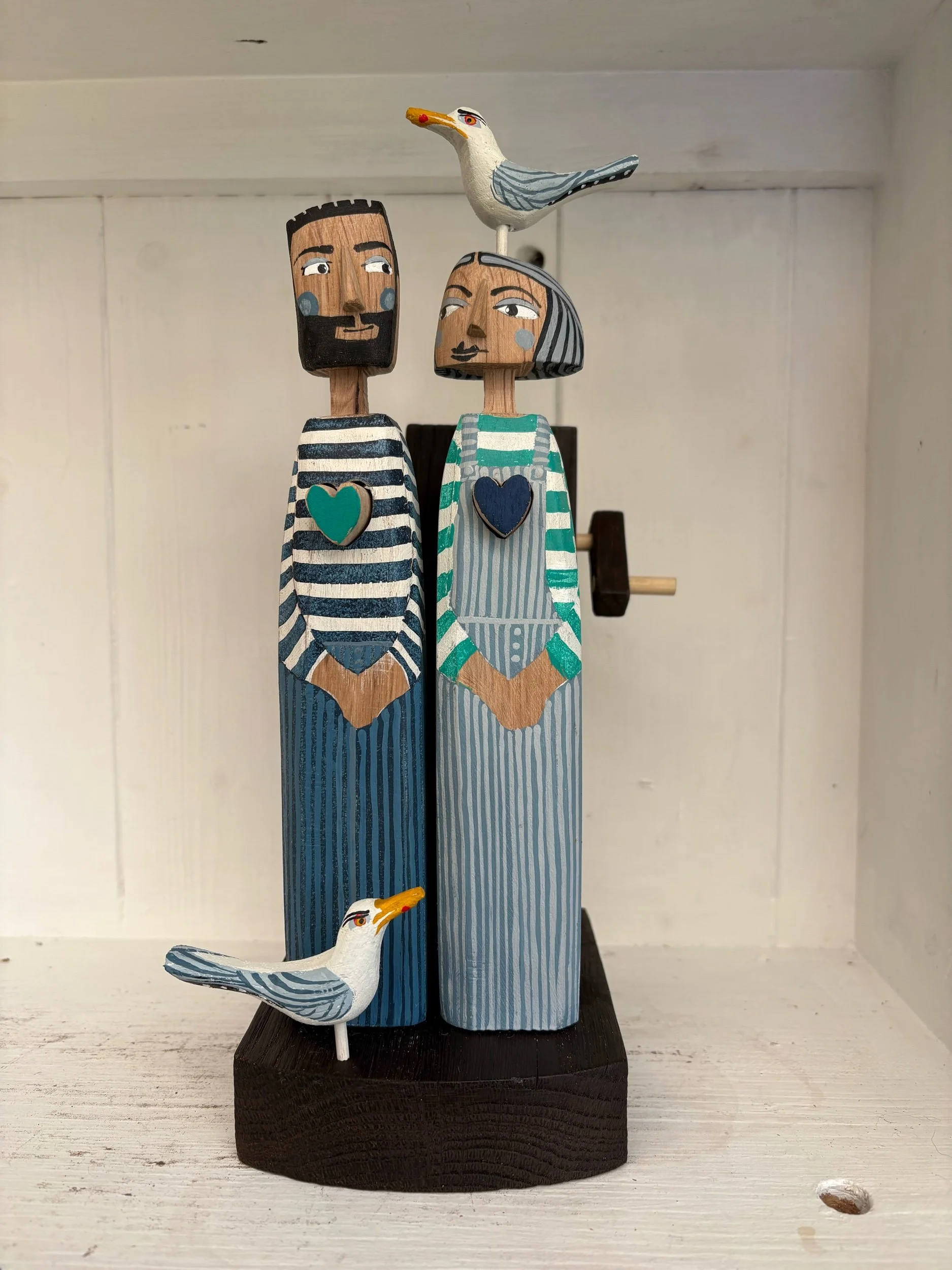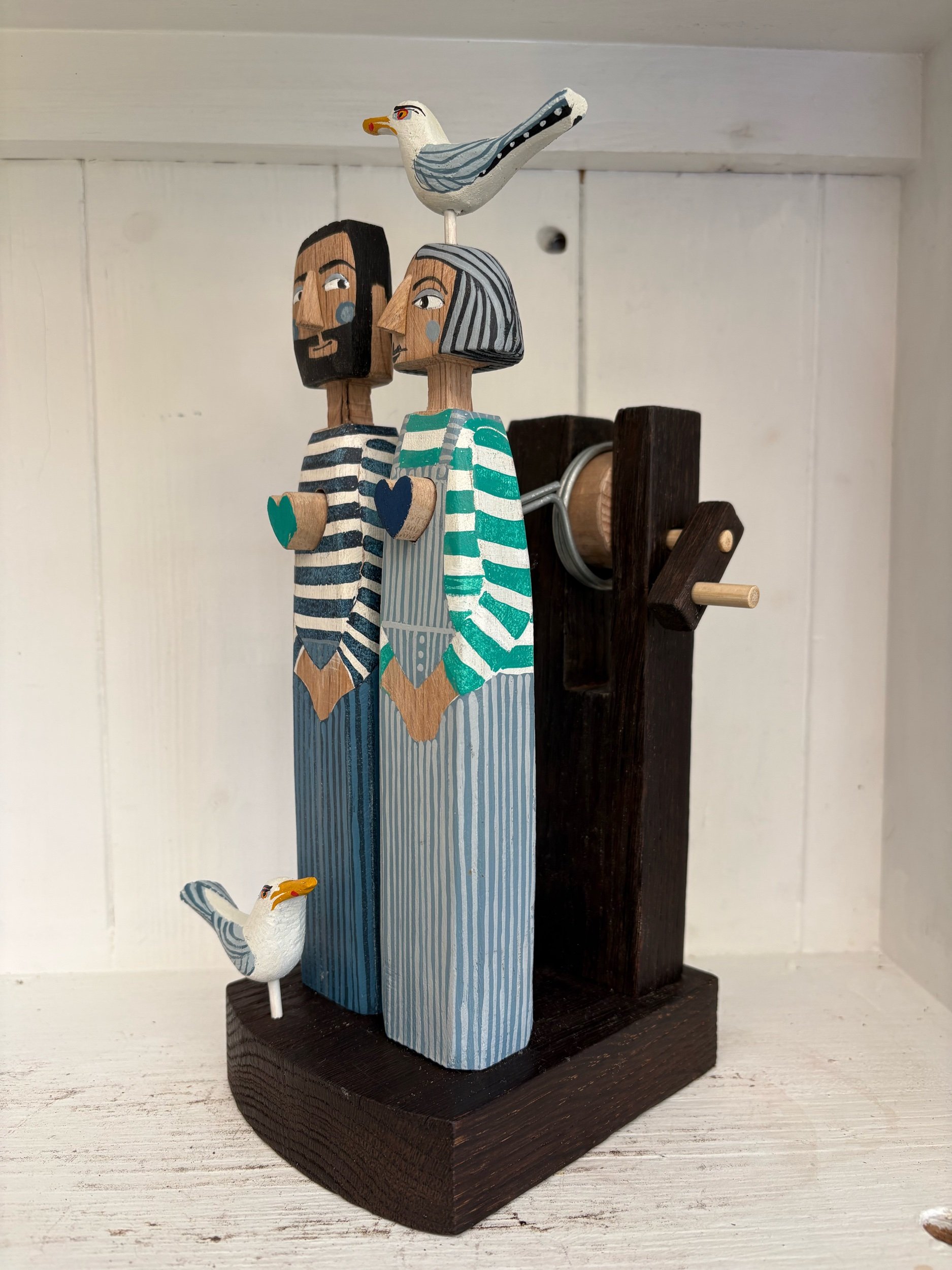 When the handle is turned the hearts innthe carved and painted figures beat in and out. Made in Oak by Jane and Ralph in far West Cornwall 27cm tall.