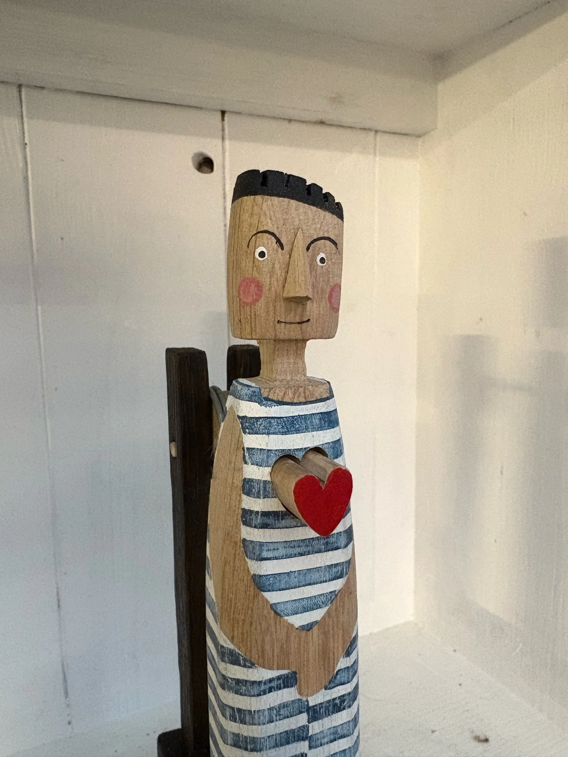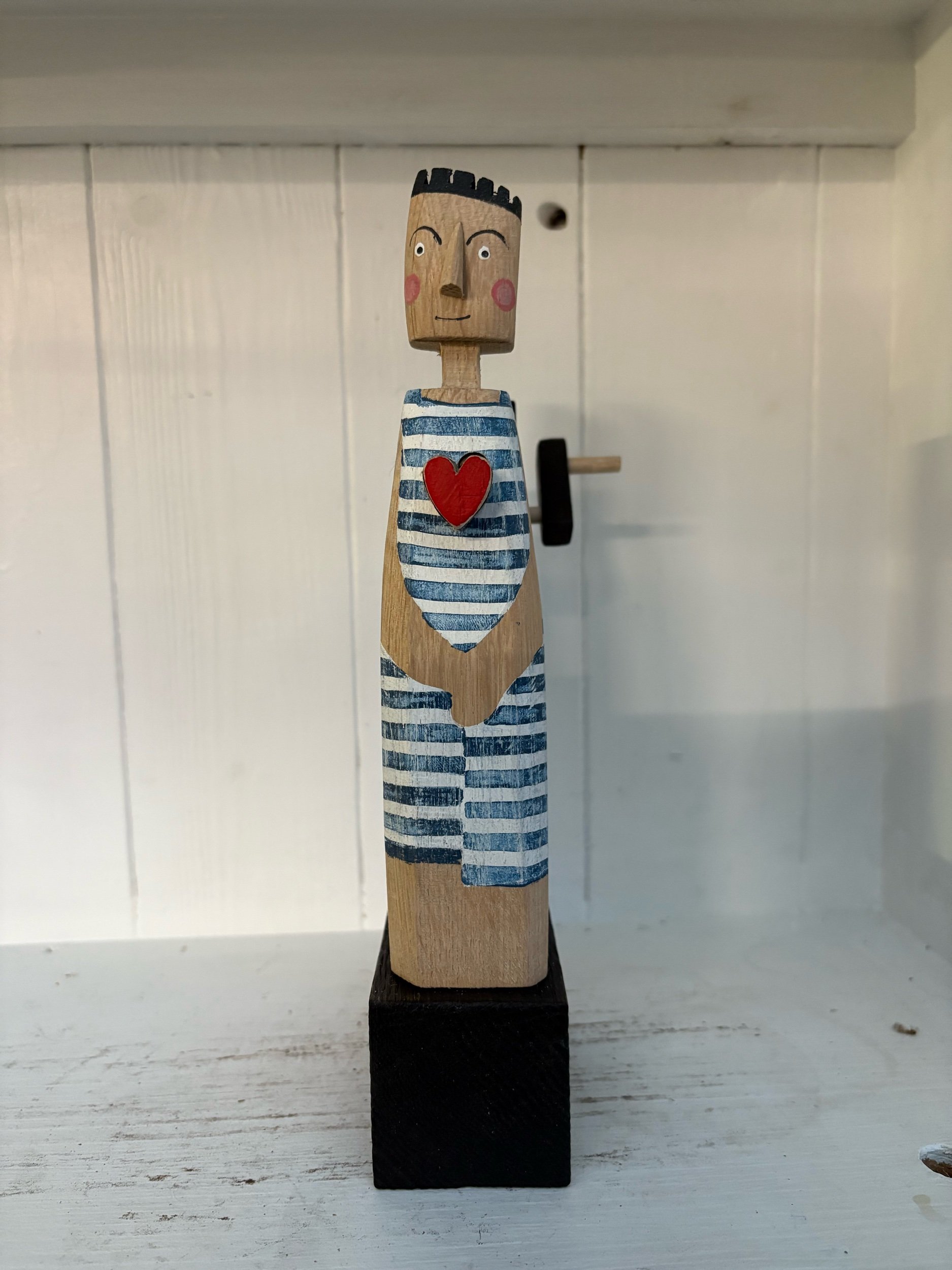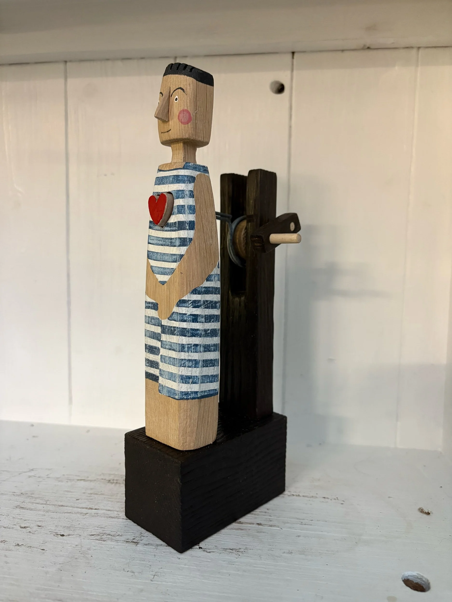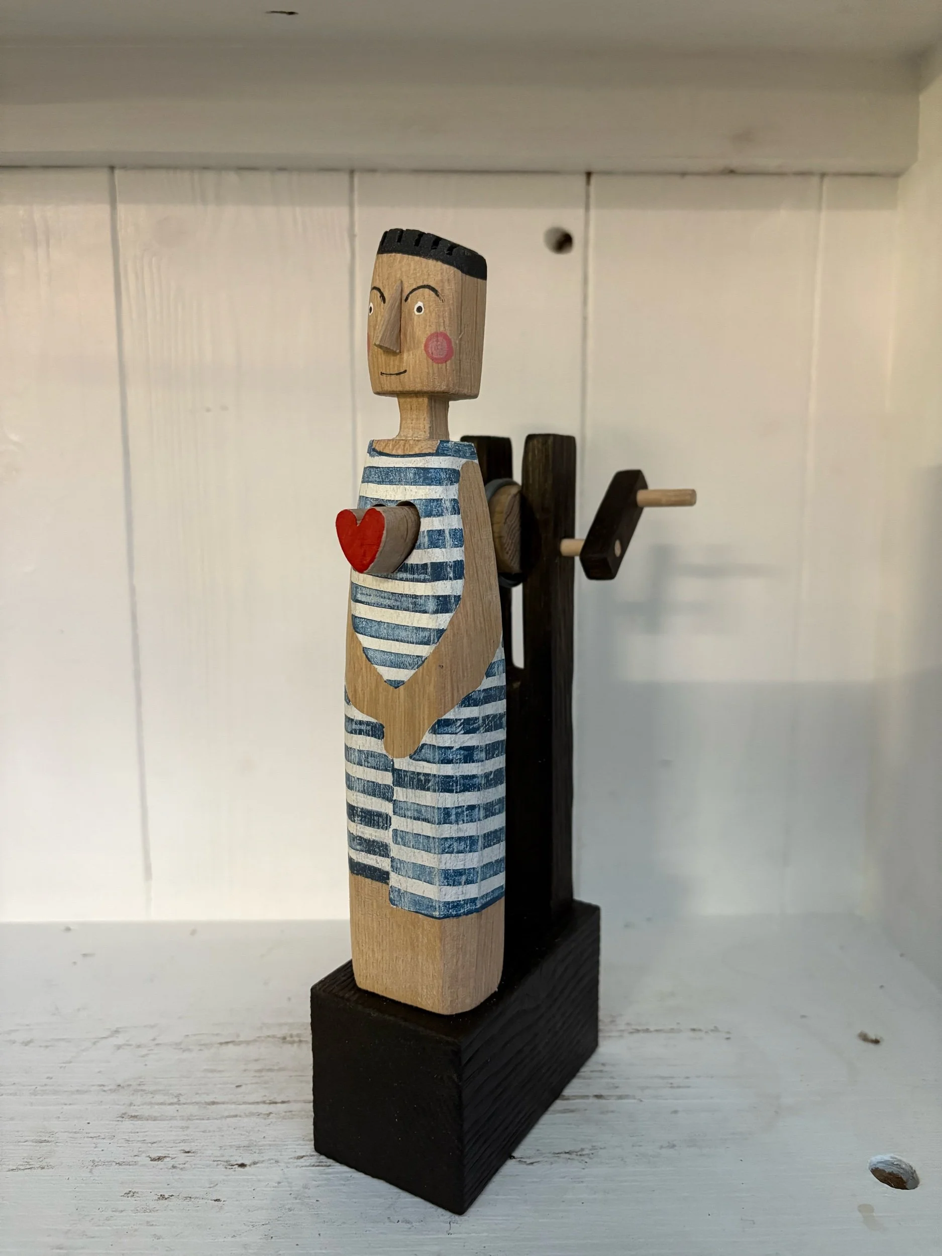 When the handle is turned the heart in the ainted figure beats in and out. Hand made in oak by Jane and Ralph in far West Cornwall. 24cm tall