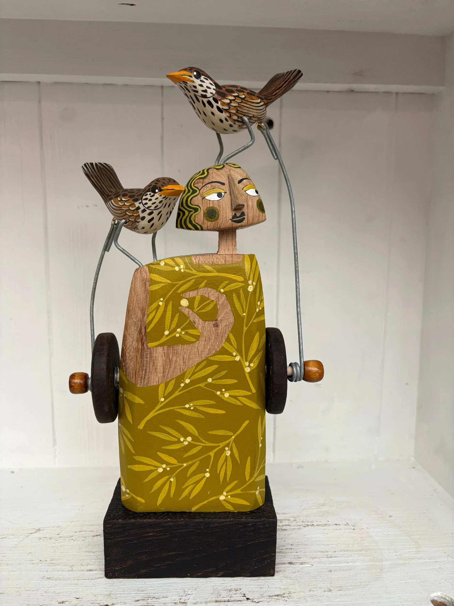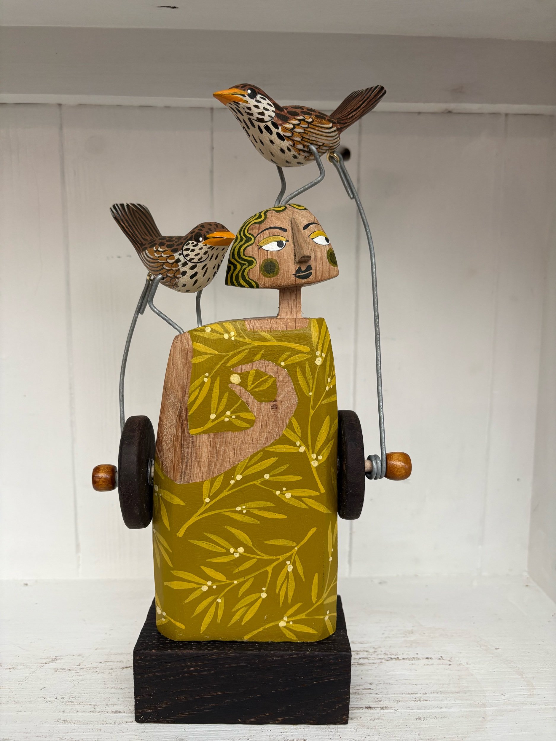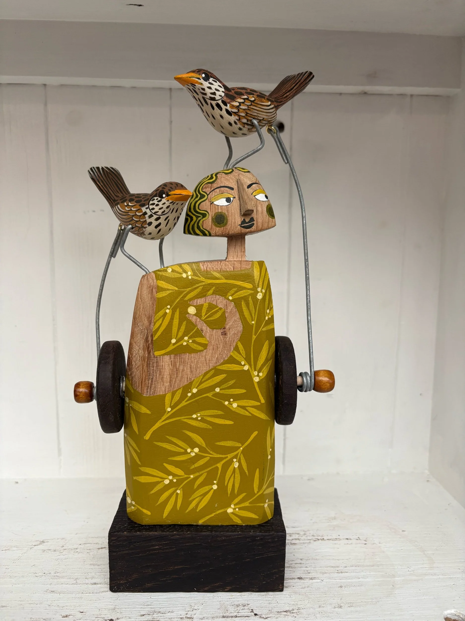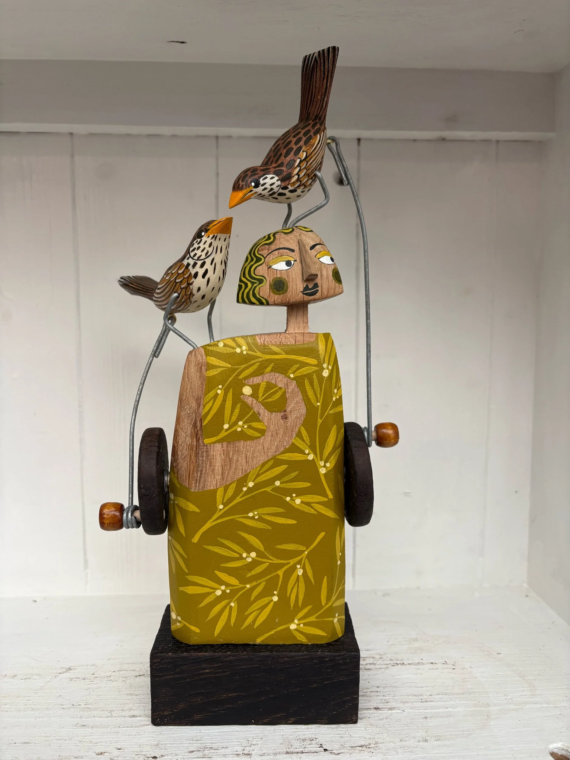 When the handle is turned the Painted wooden Thrushes on the figures head and shoulder make pecking movements. Hand made in Oak by Jane and Ralph in far West Cornwall. 28cm tall