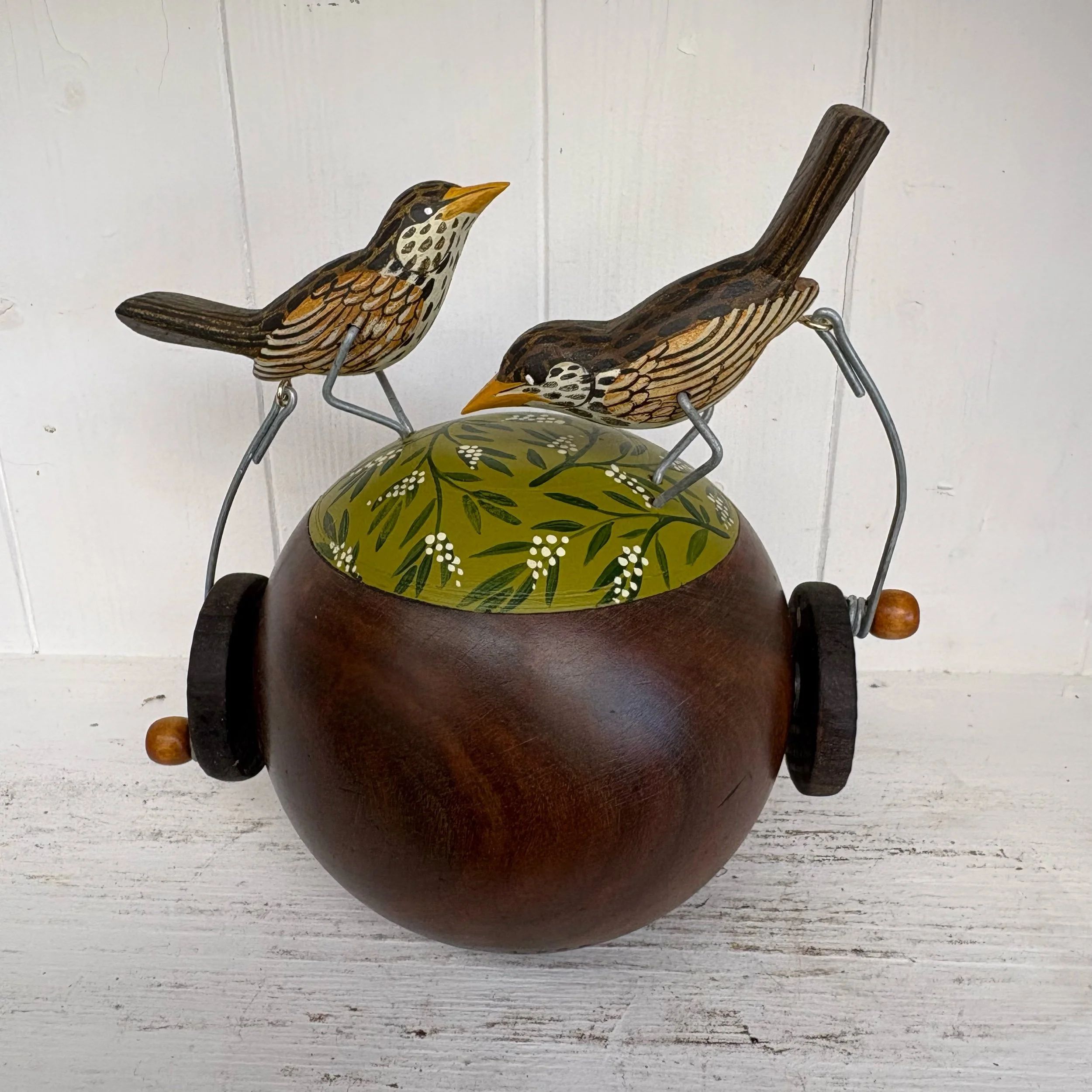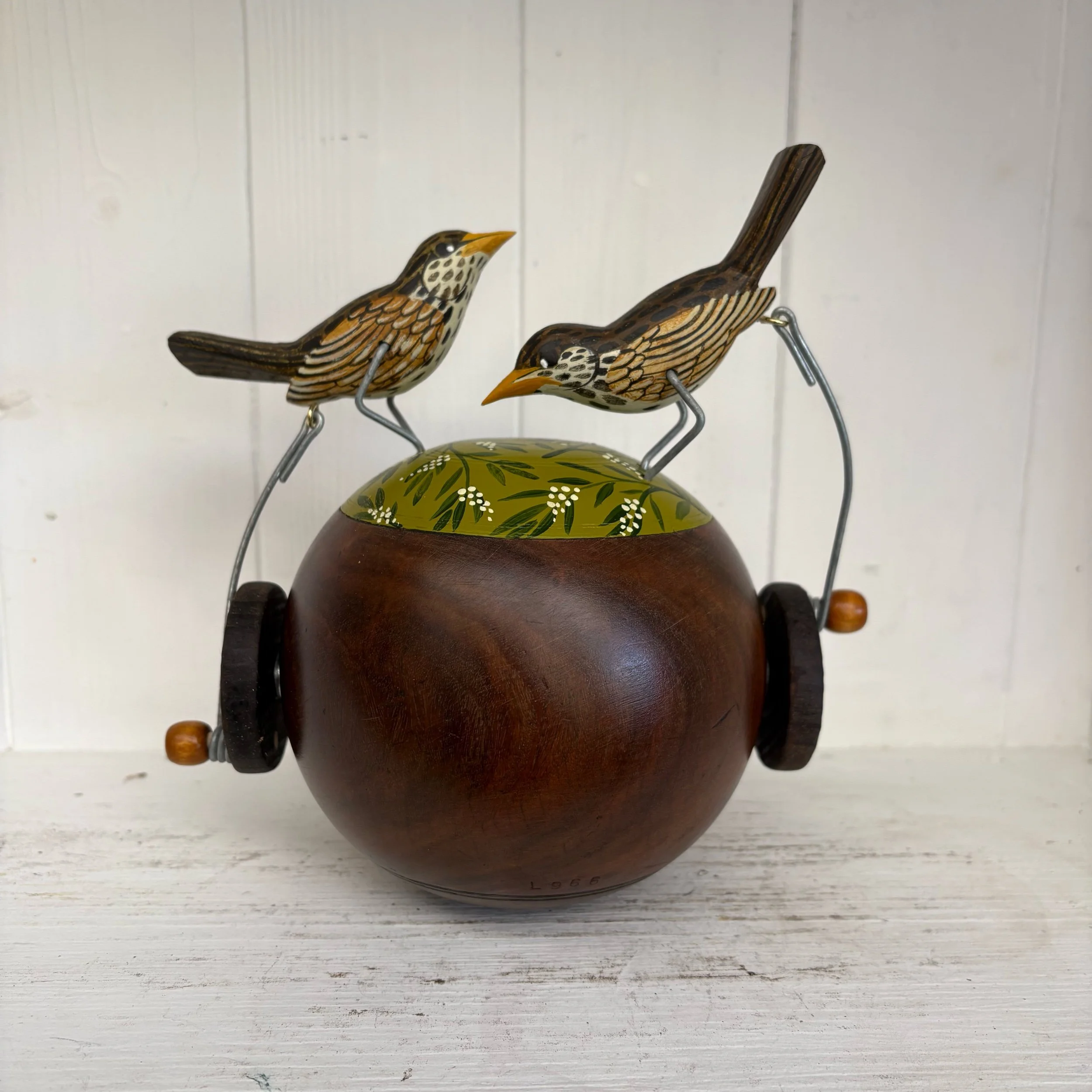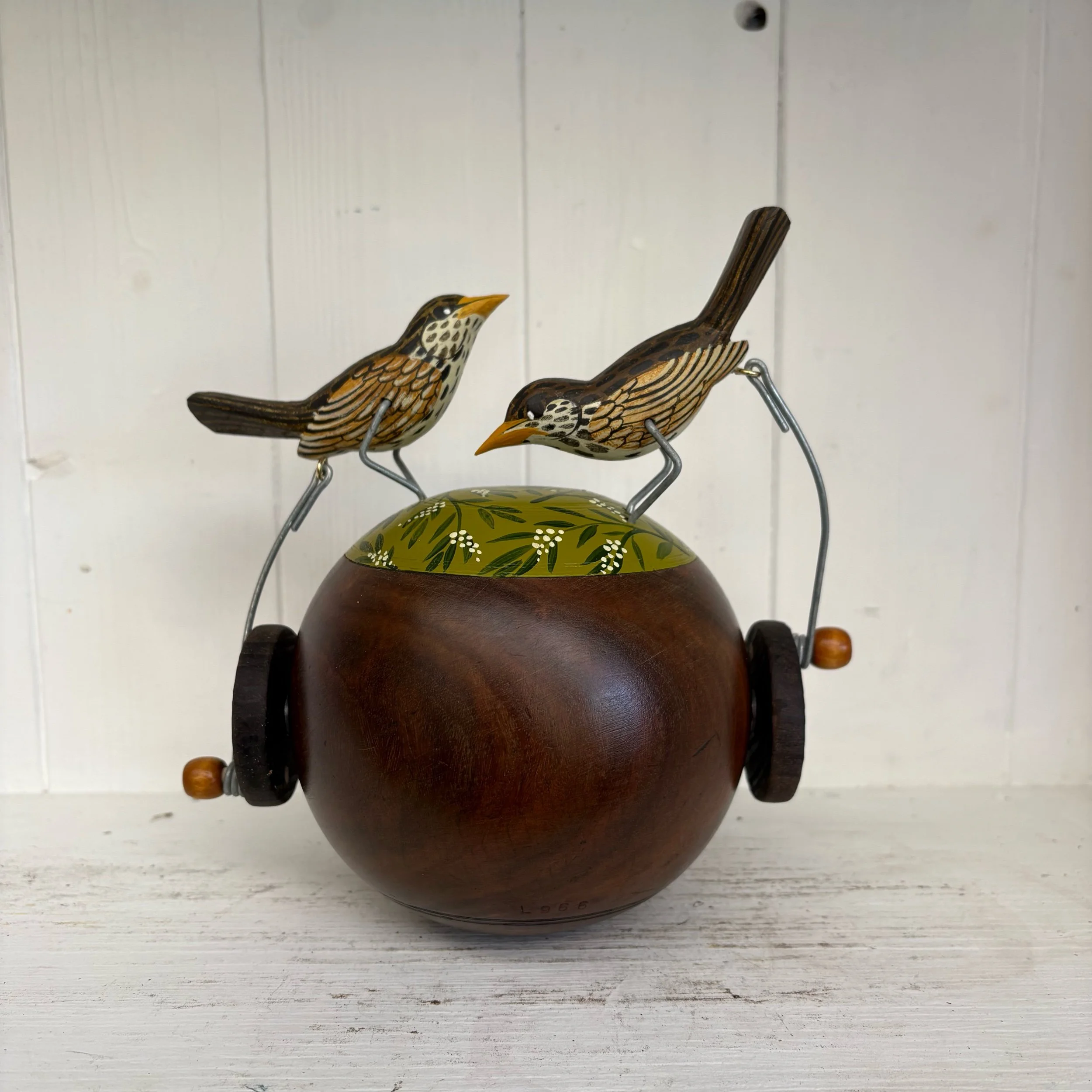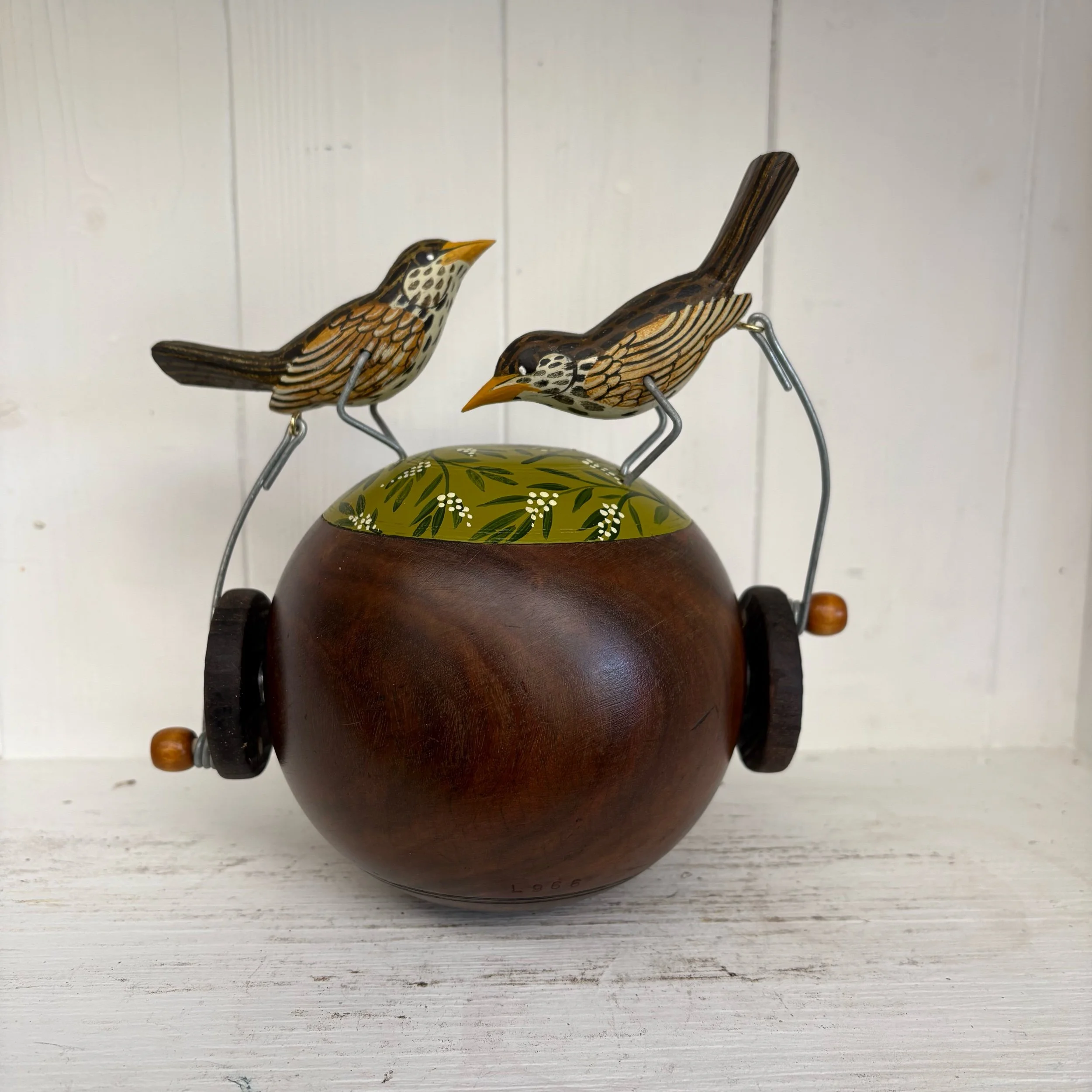 When the handle is turned the painted wooden thrushes make a pecking movement on the painted and polished vintage lignum bowling ball. Hand made by Jane and Ralph in far West Cornwall. 16cm tall and heavy.