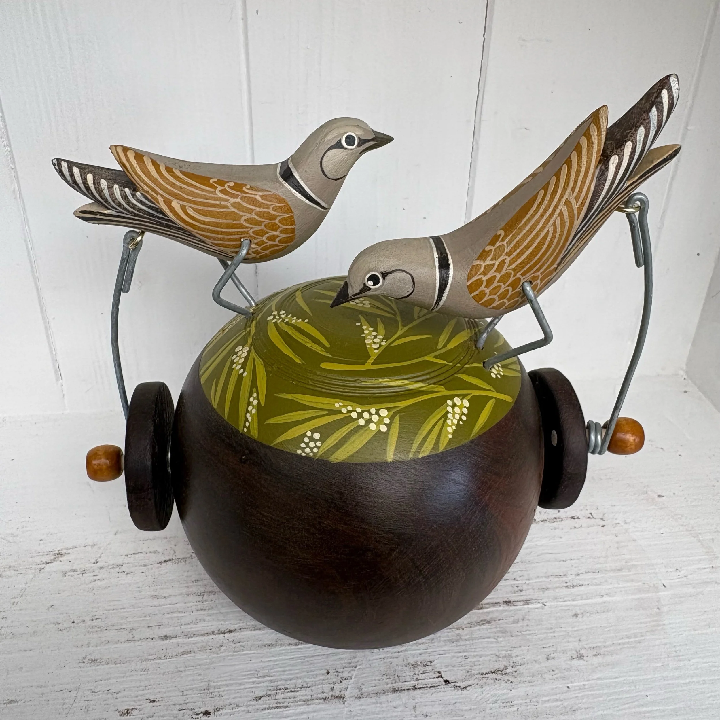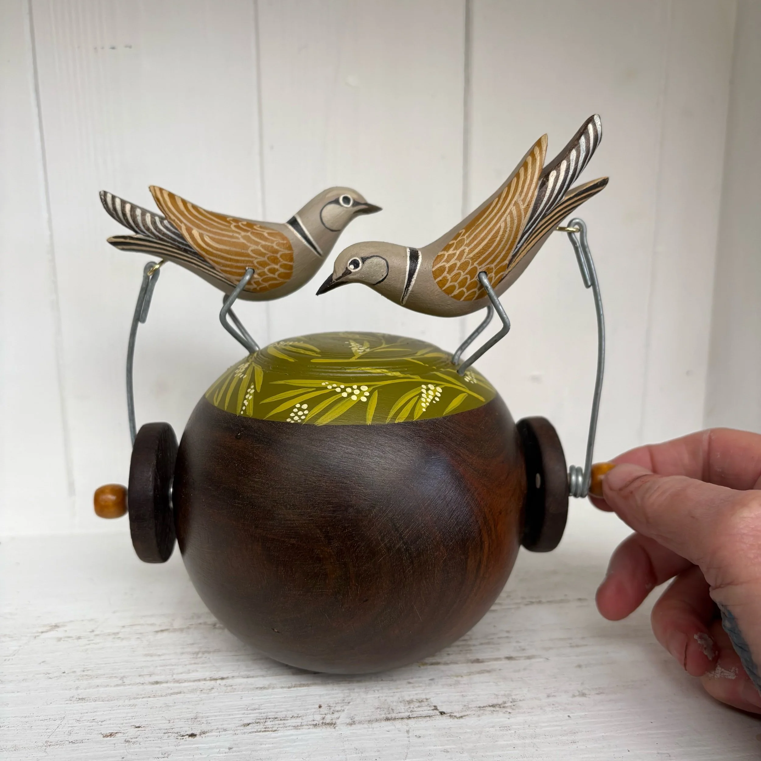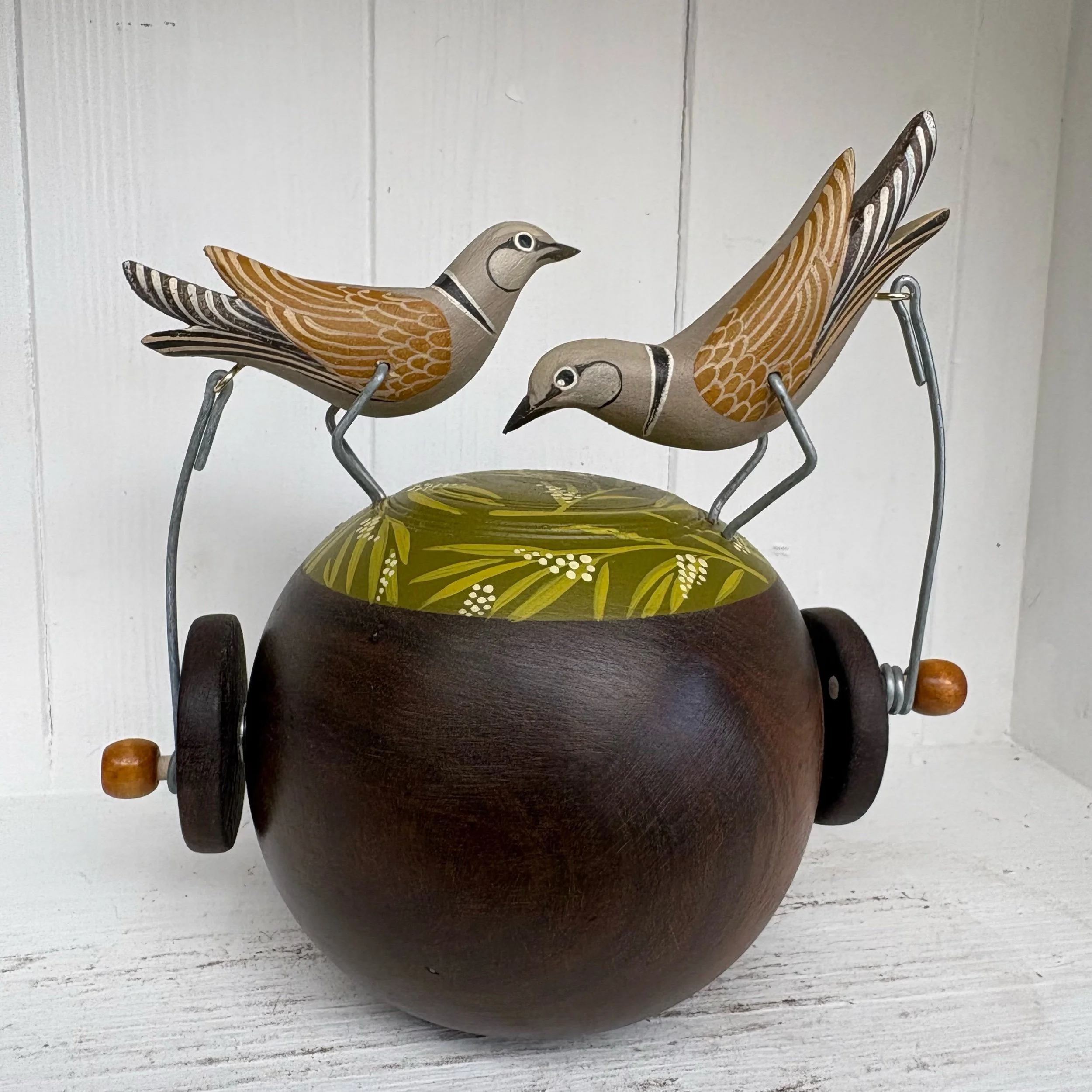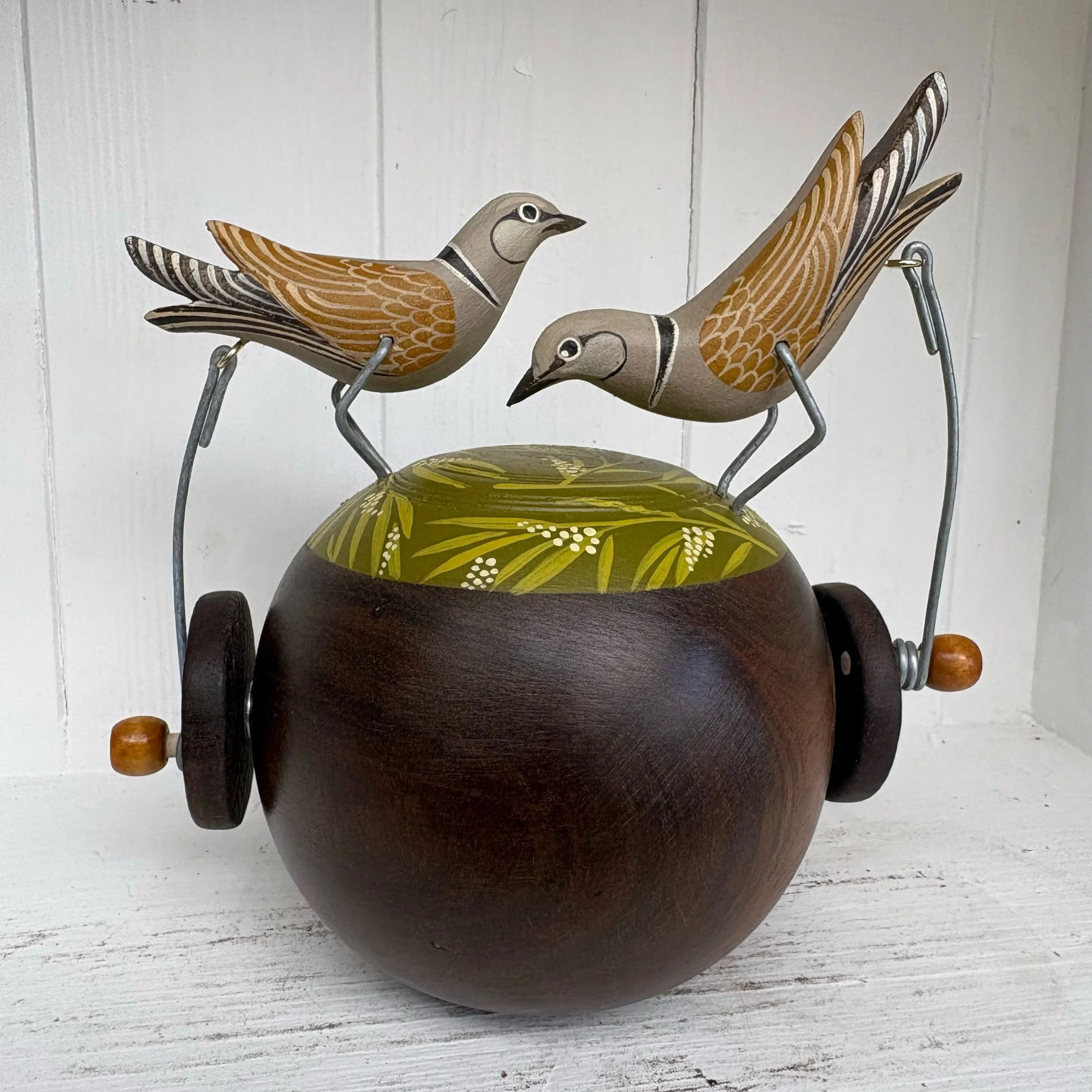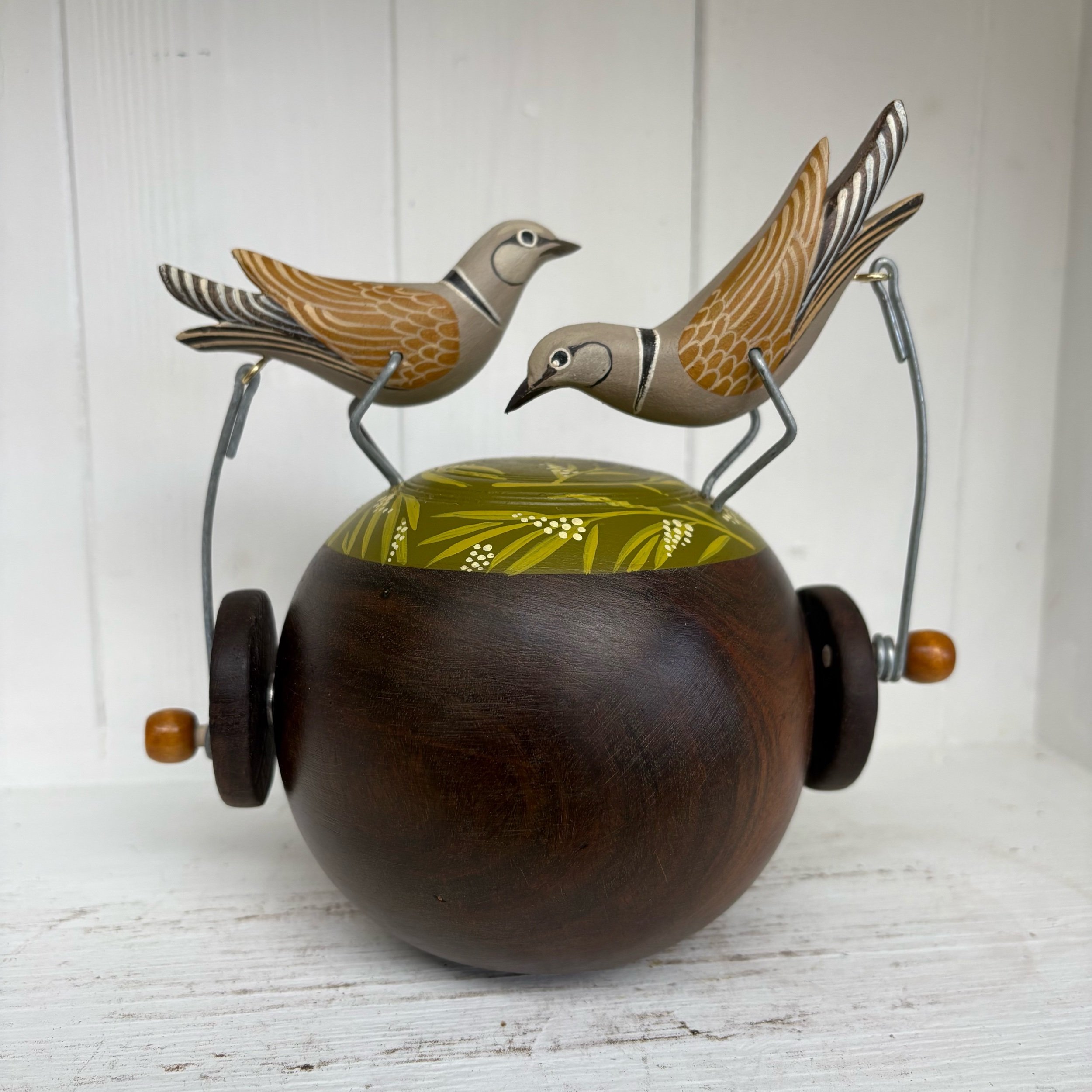 When the handle is turned the painted Doves on the vintage Lignum Bowling Ball make s peckkng movement. Hand made by Jane and Ralph in far west Cornwall. 17cm x 17cm